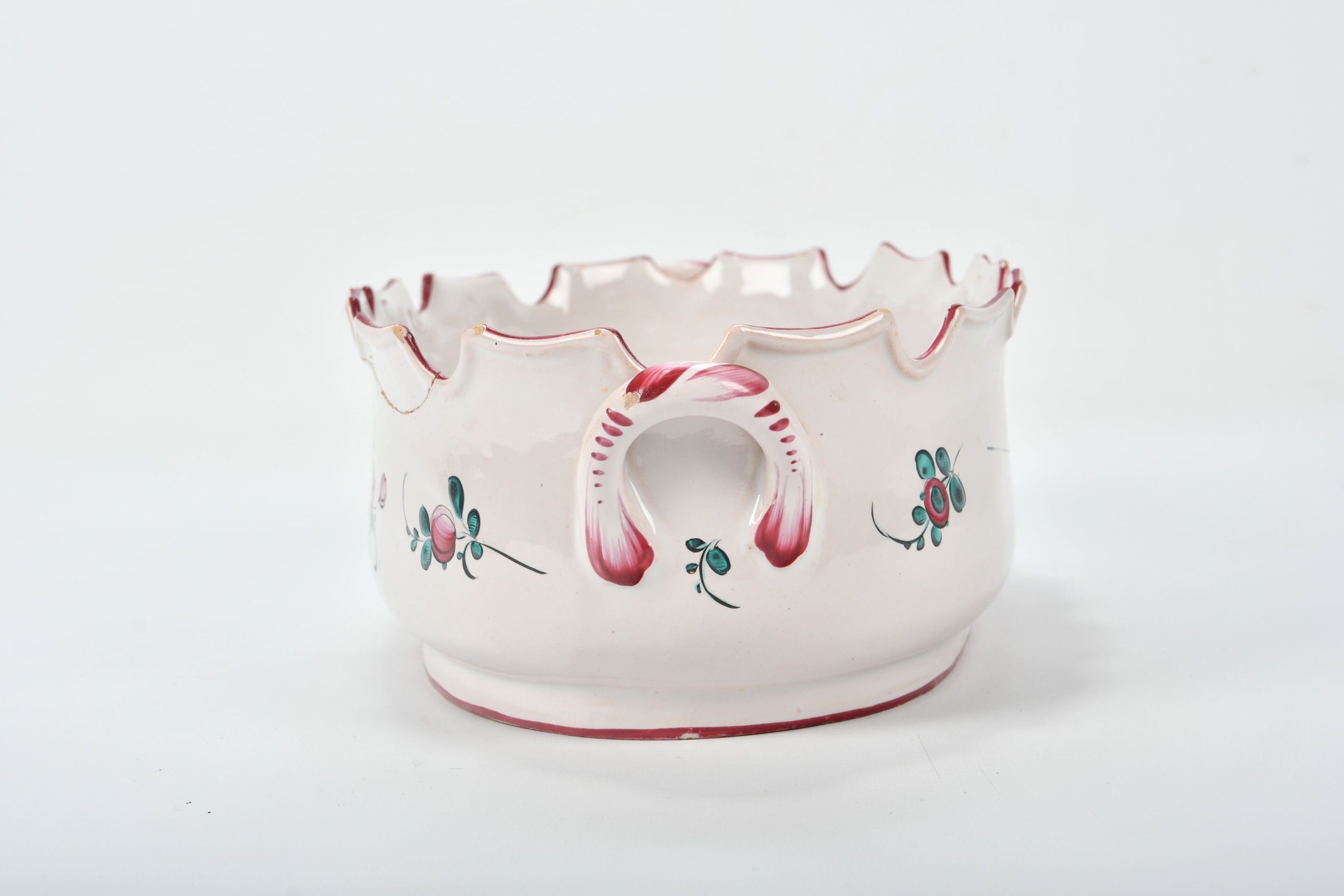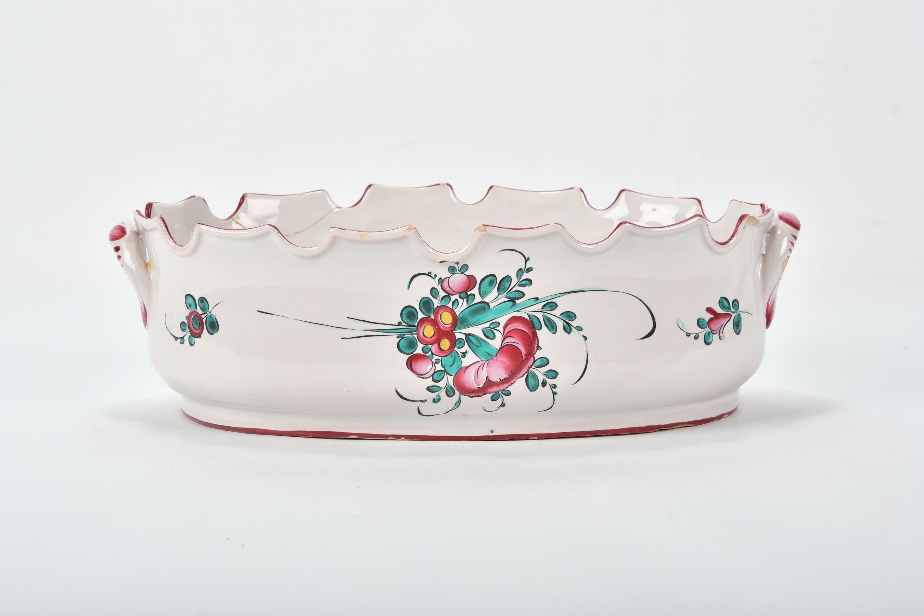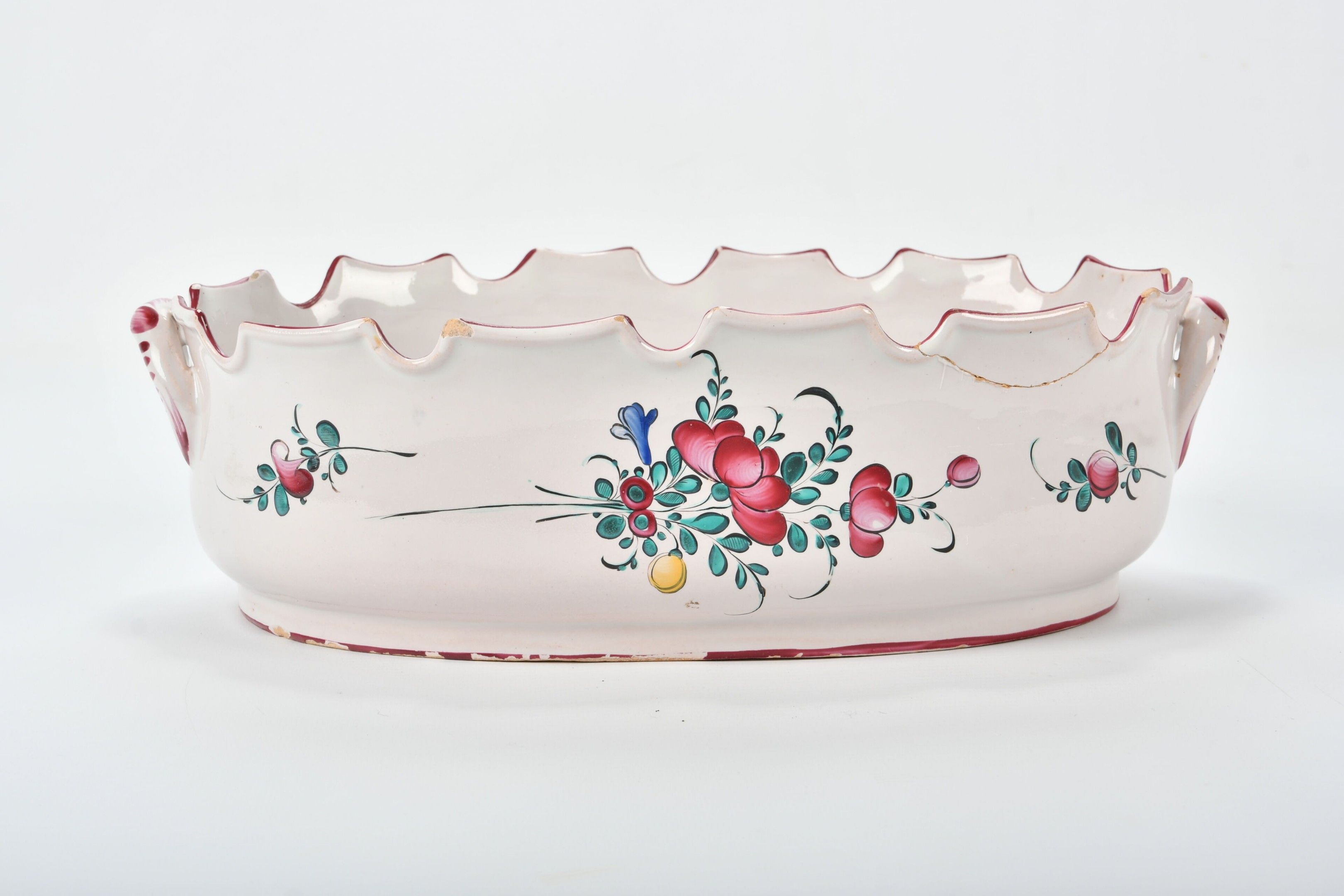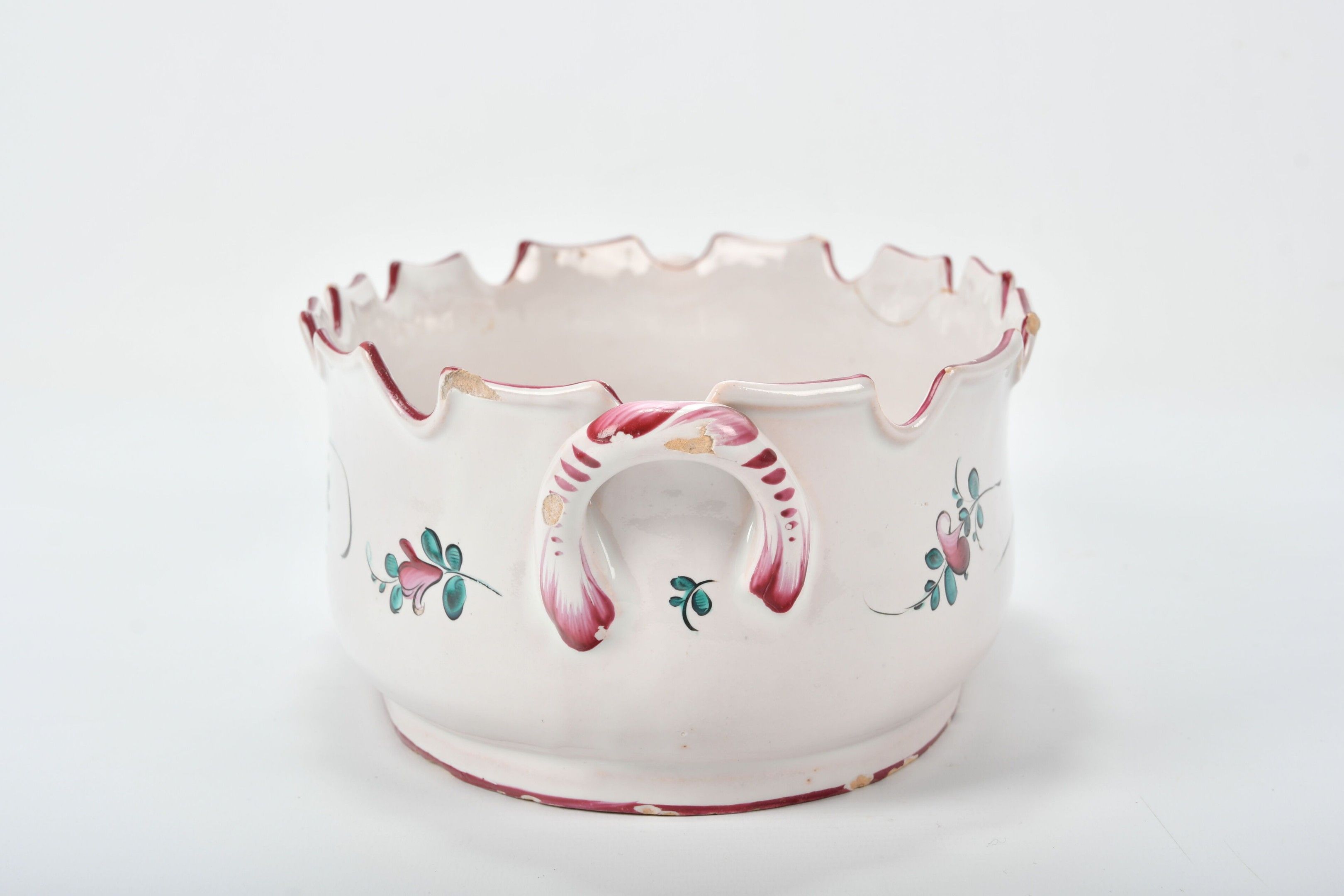 Eastern earthenware RAFRAICHISSOIR. Crenellated wing. Polychrome decoration of net and flowers. Applied handles. Late 18th century (damaged, glaze missing, small chips and part of the wing glued back). H. 11 - W. 34.5 - D. 19.5 cm