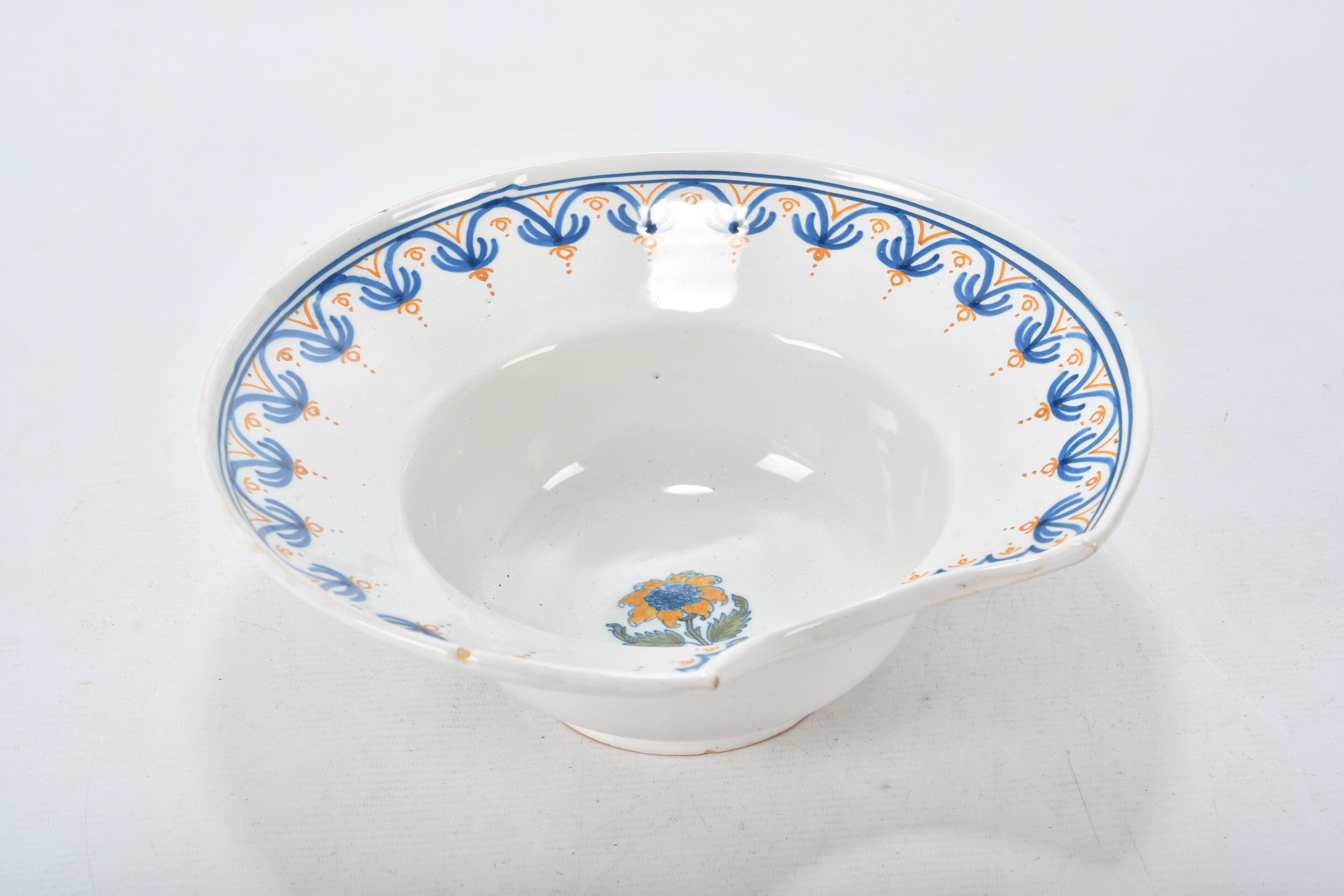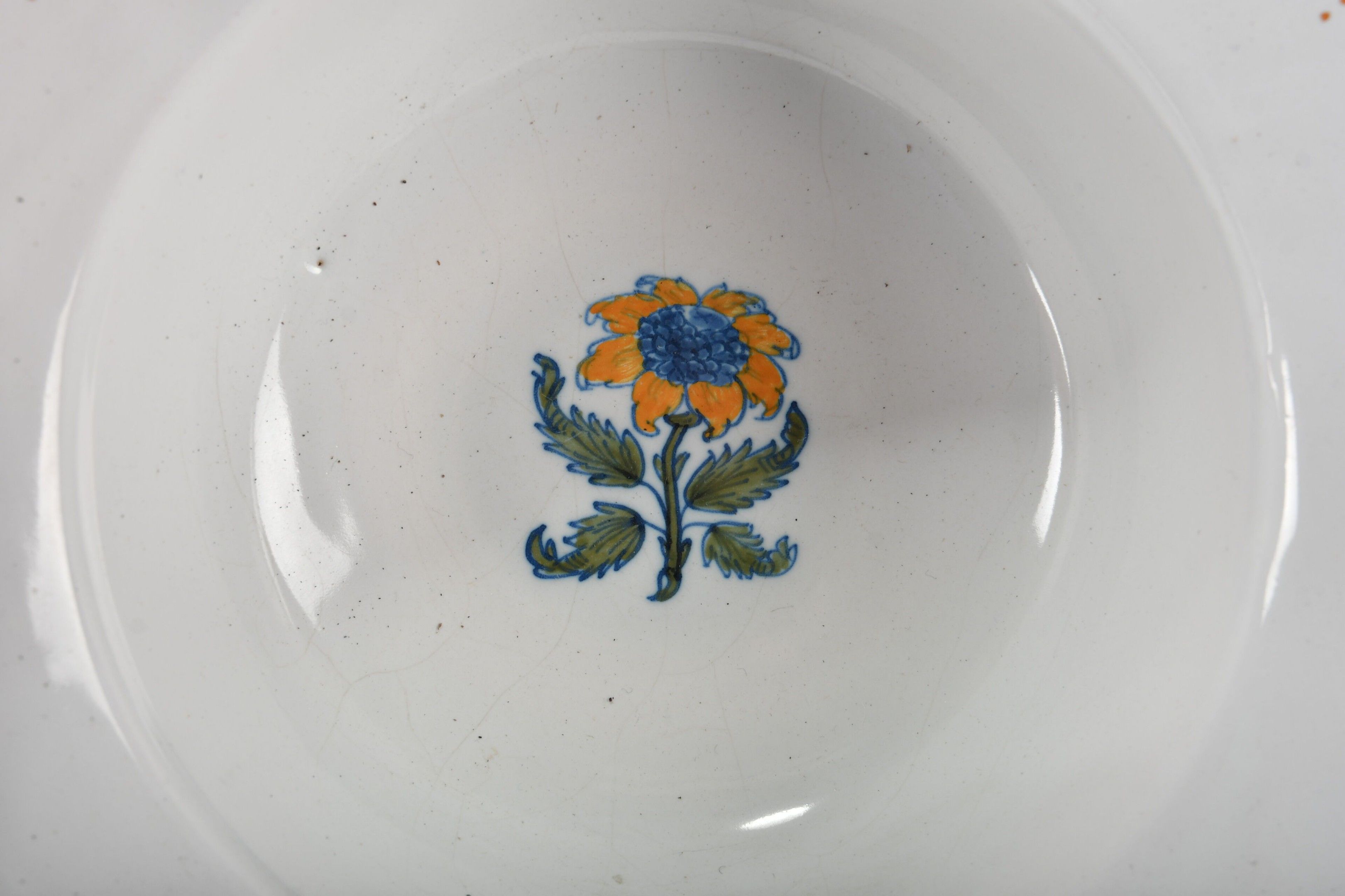 MOUSTIERS. An earthenware circular bearded dish with polychrome decoration of a solanea flower in the centre and a stylised frieze around the edge. 18th century period. H. 11 - Diam. 29 cm. Minor glaze chips