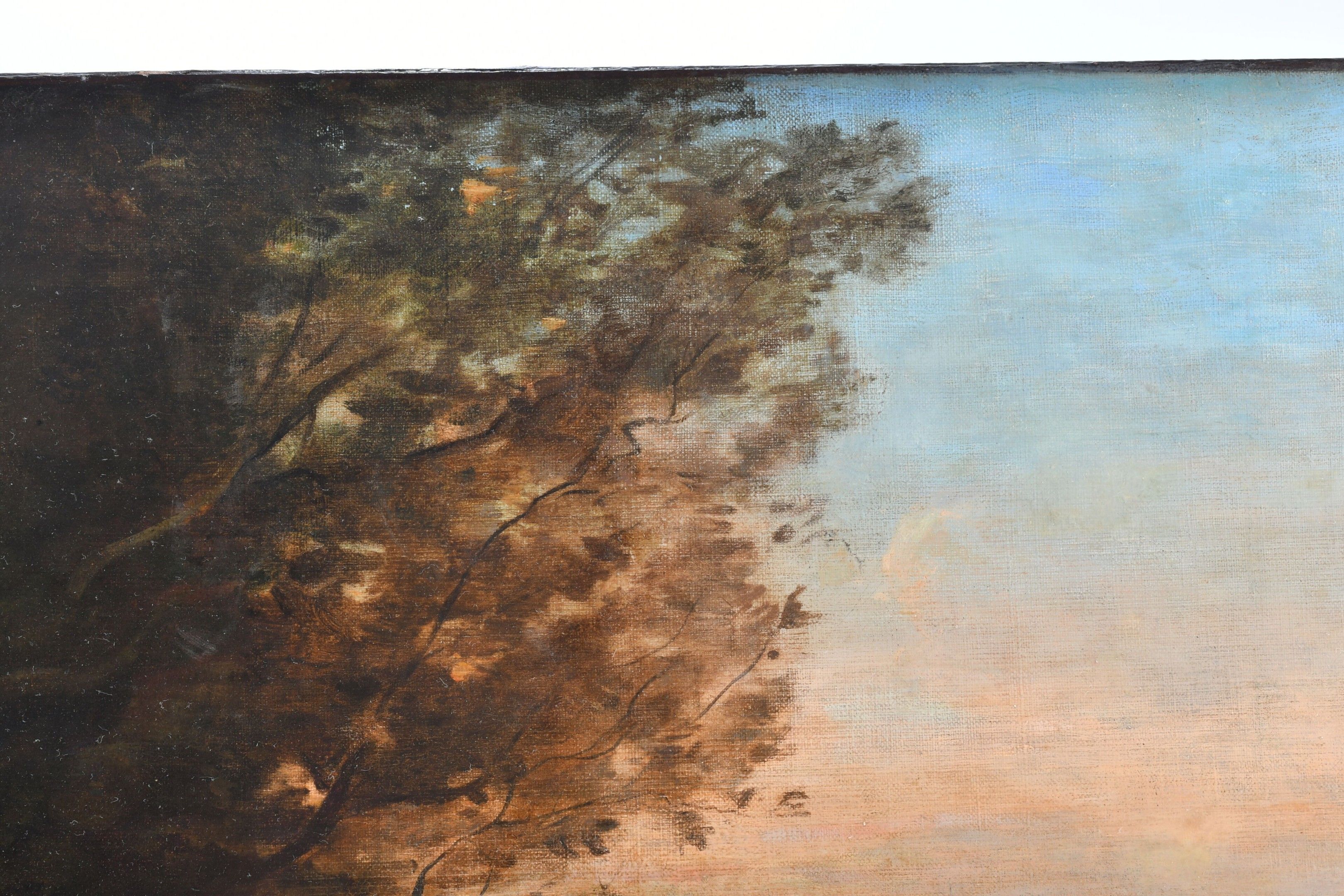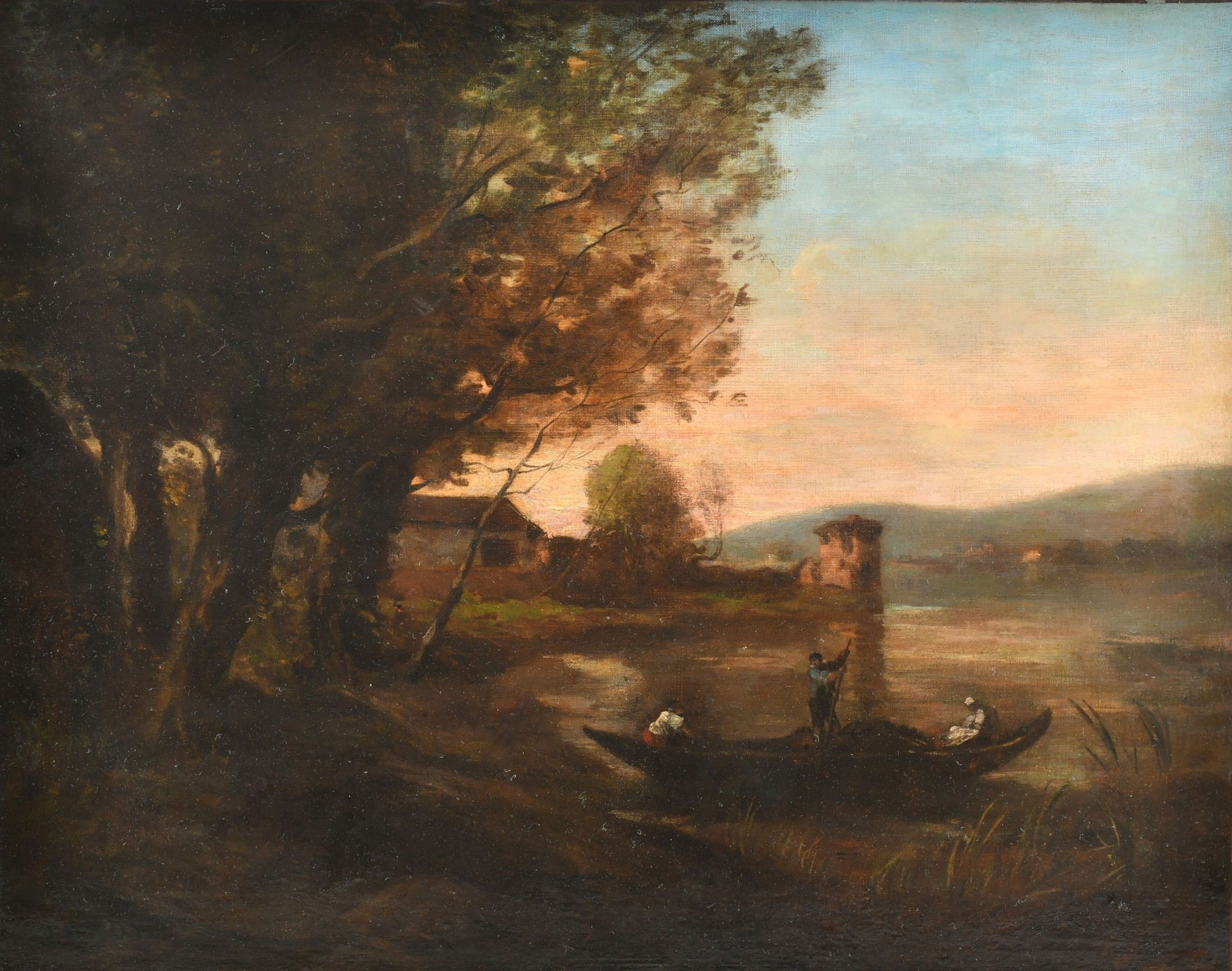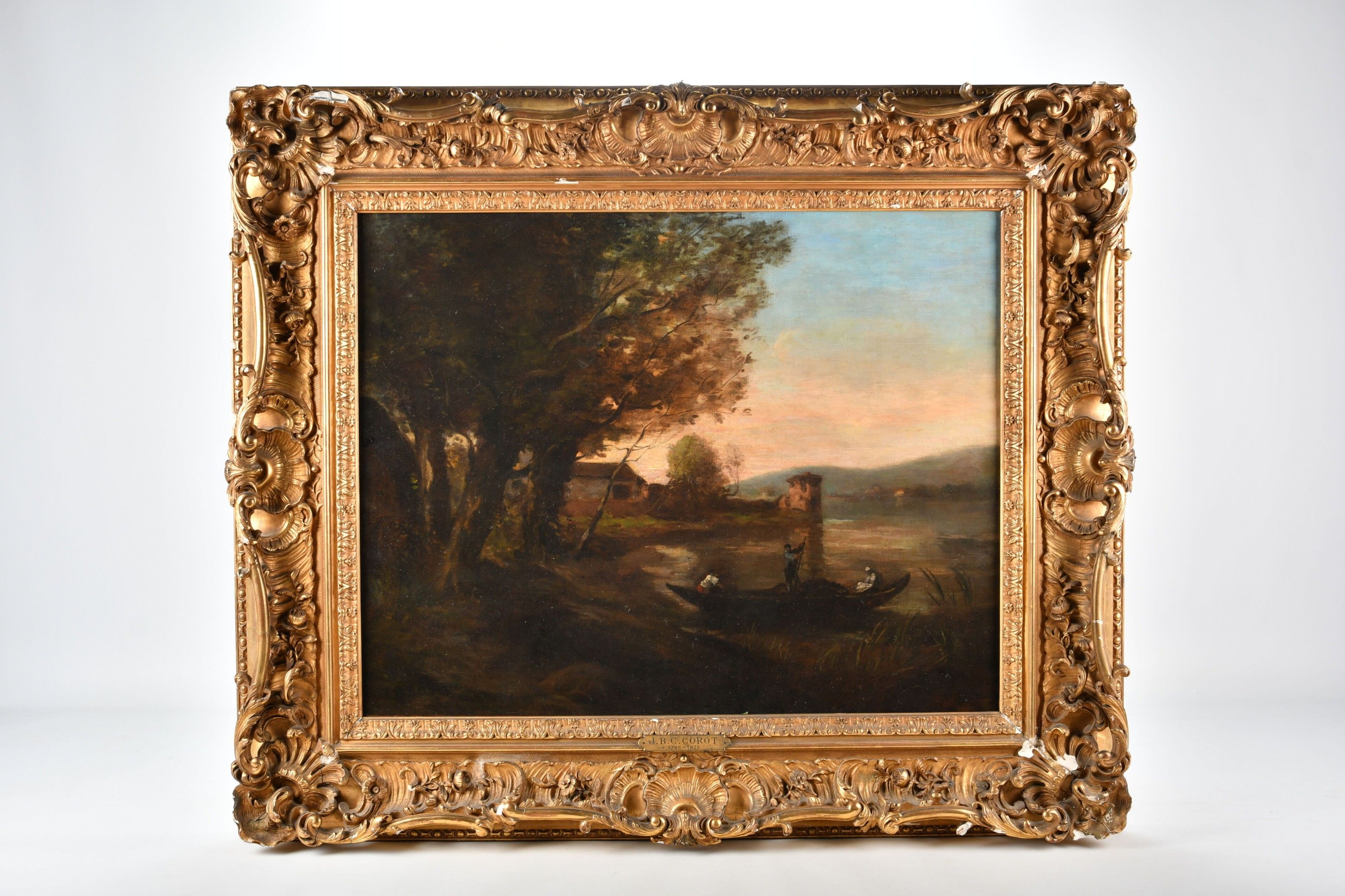 19th century FRENCH SCHOOL. Landscape with a boat. Oil on canvas, signed "Corot" lower left. Size 63 x 80 cm. Original wood frame and gilt composition.
