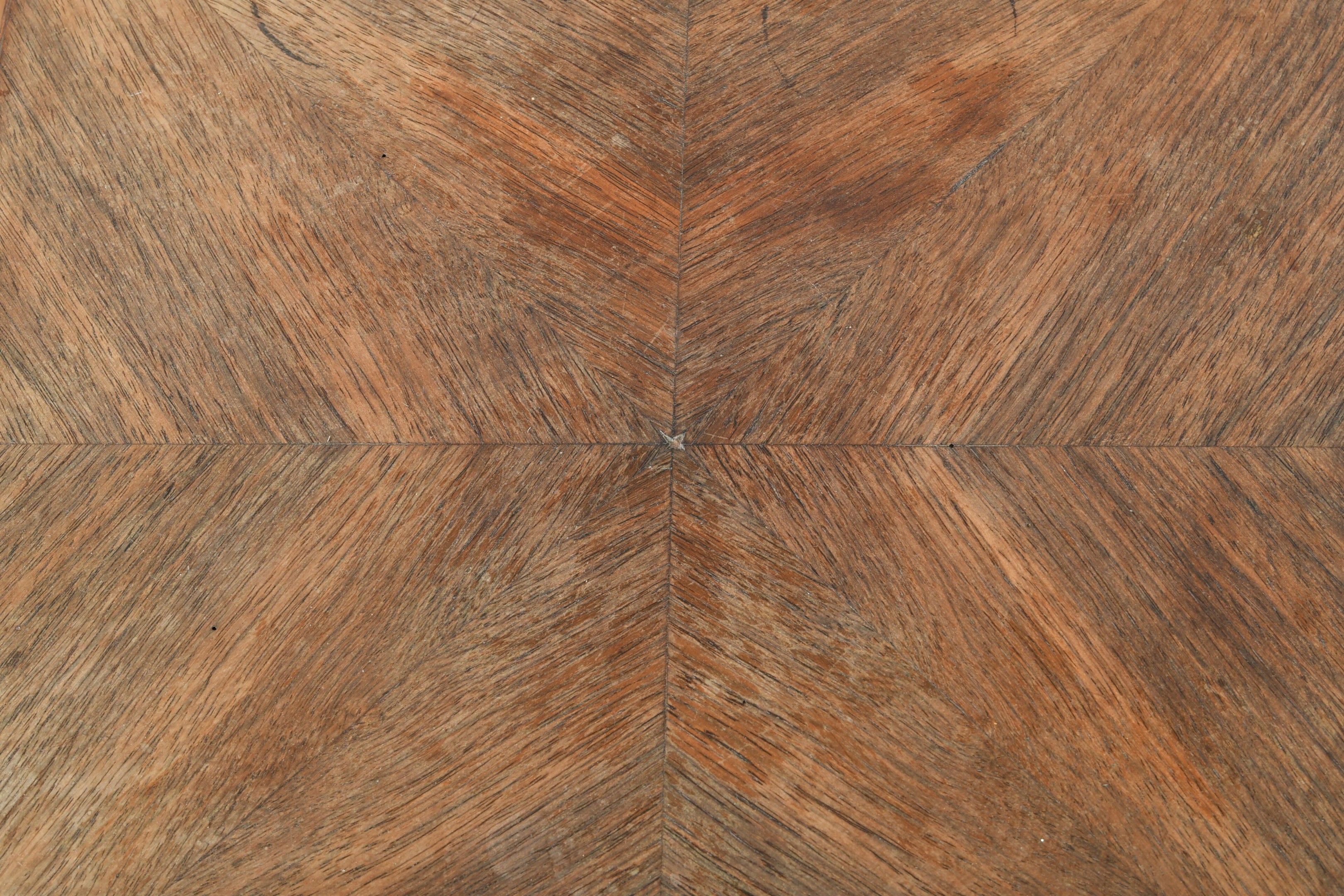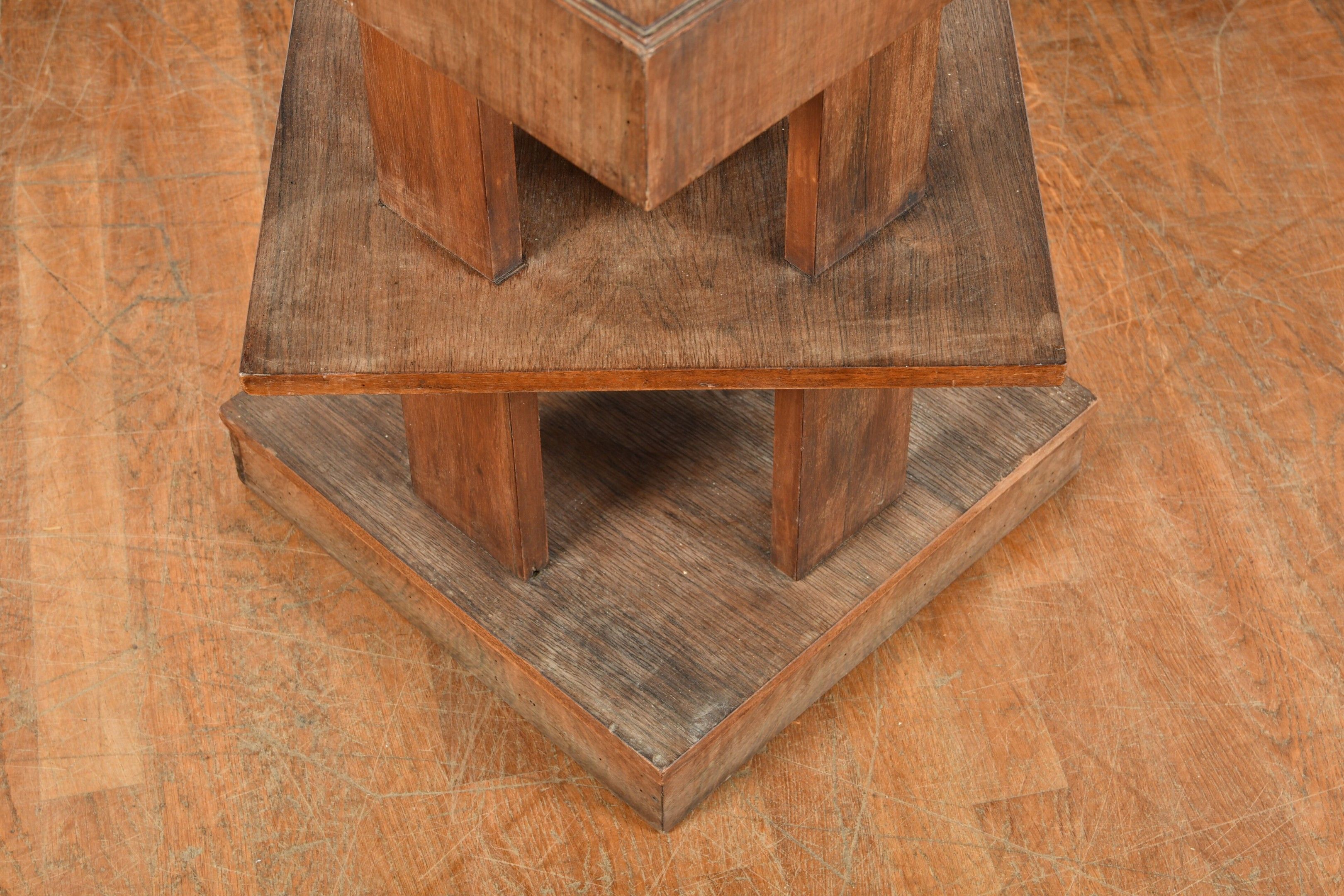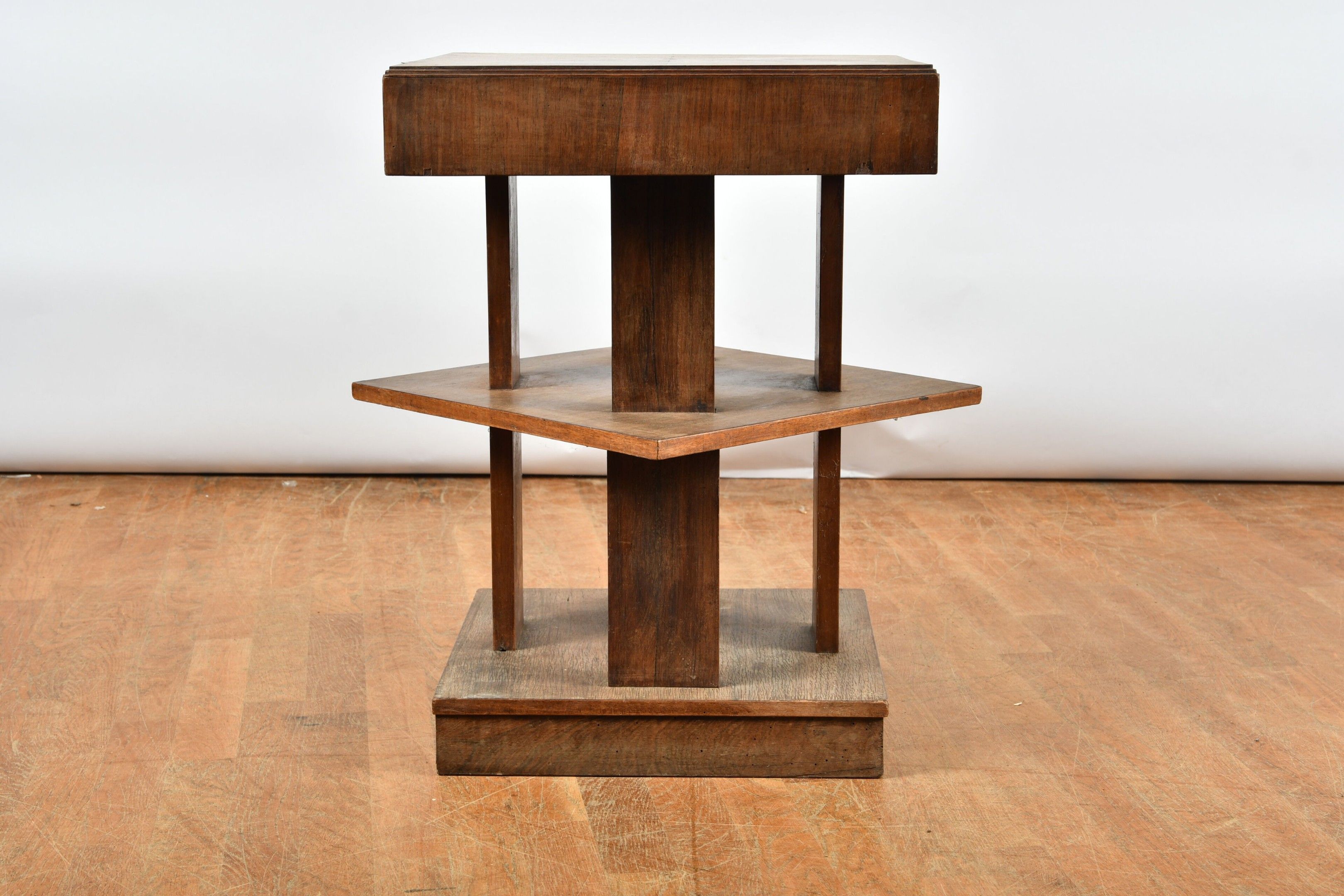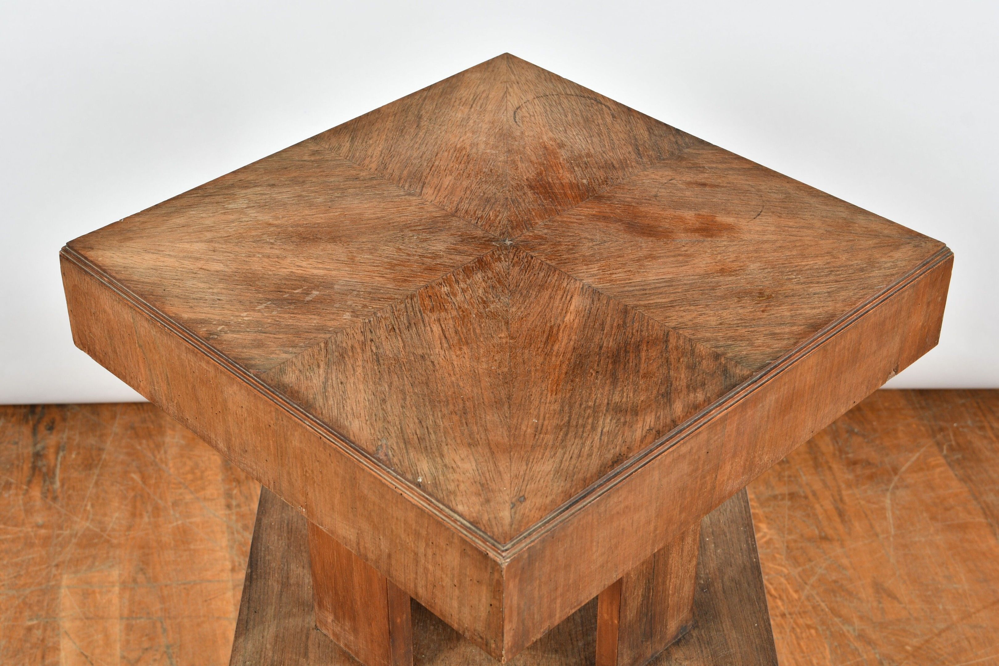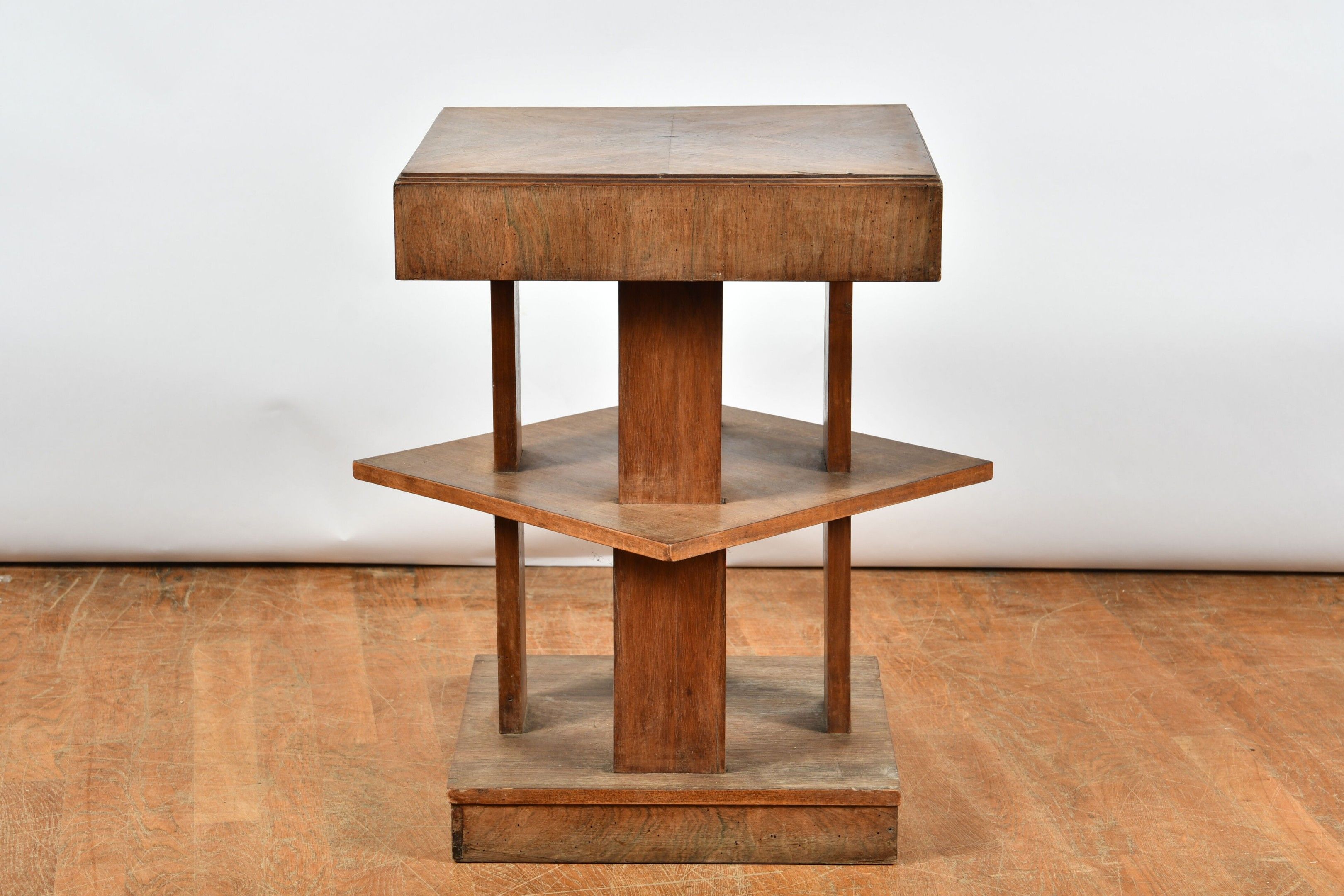 Square rosewood veneered pedestal table with offset central shelf. Art Deco period. H. 68 - W. 50 cm (Minor cracks in the veneer)