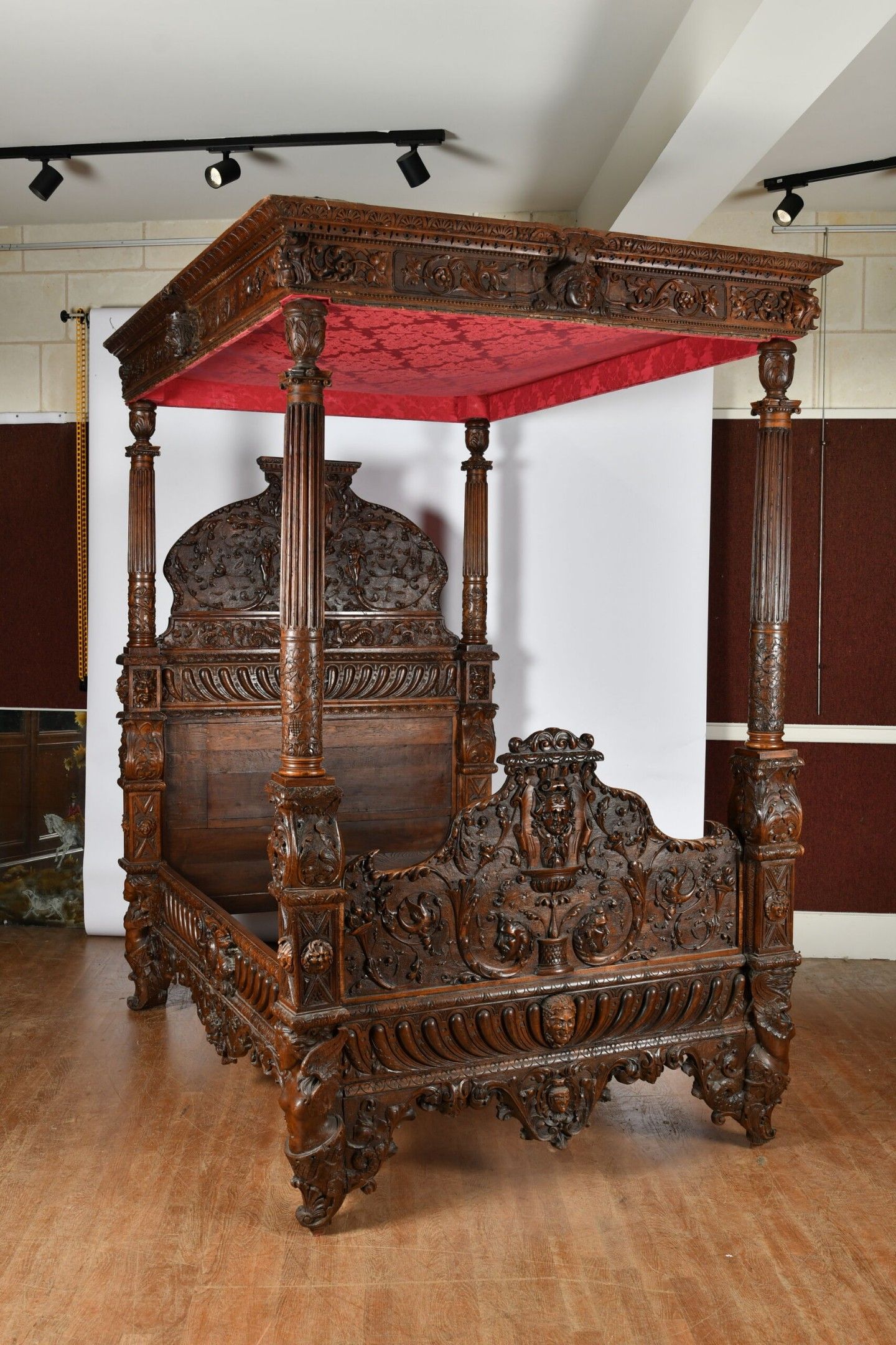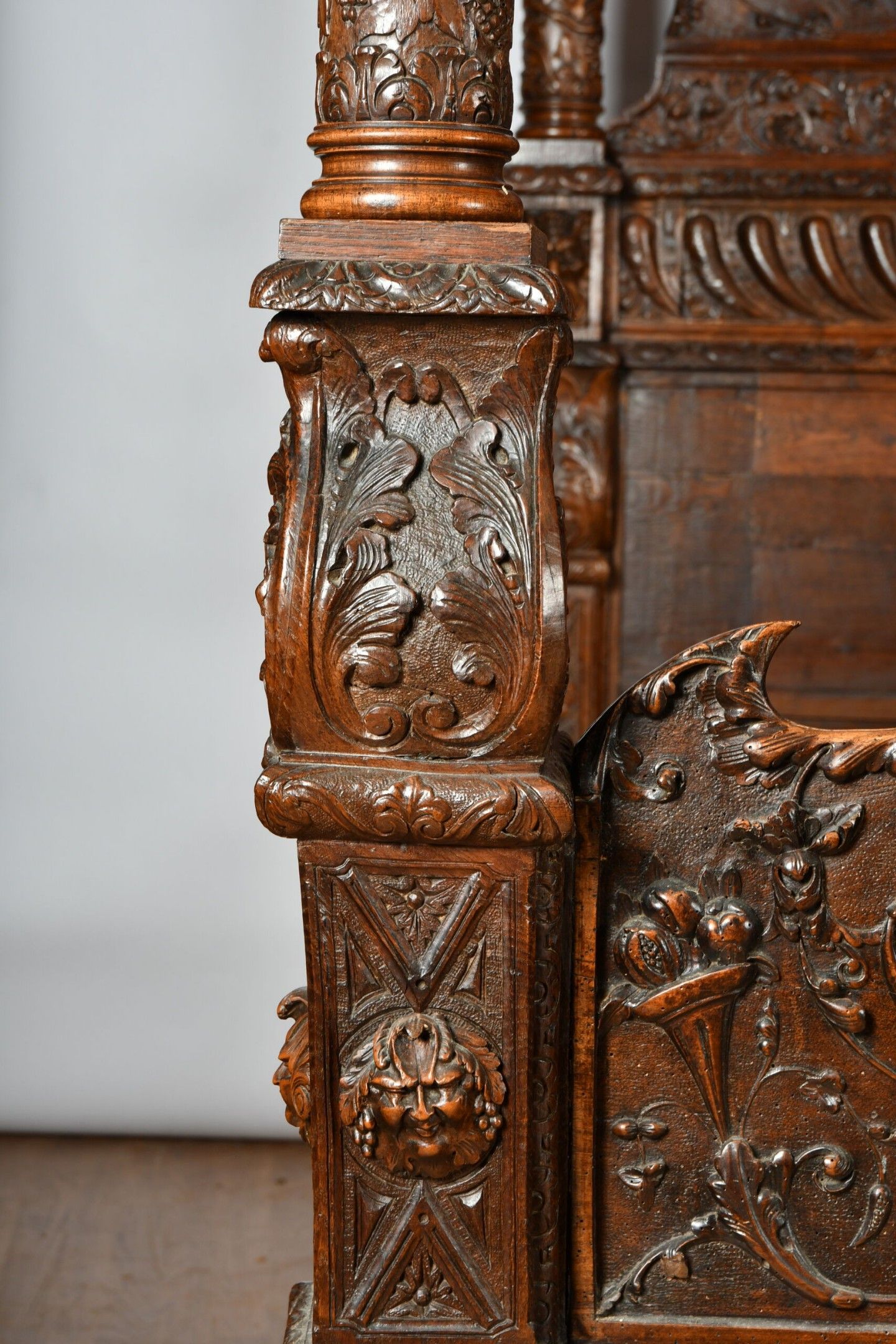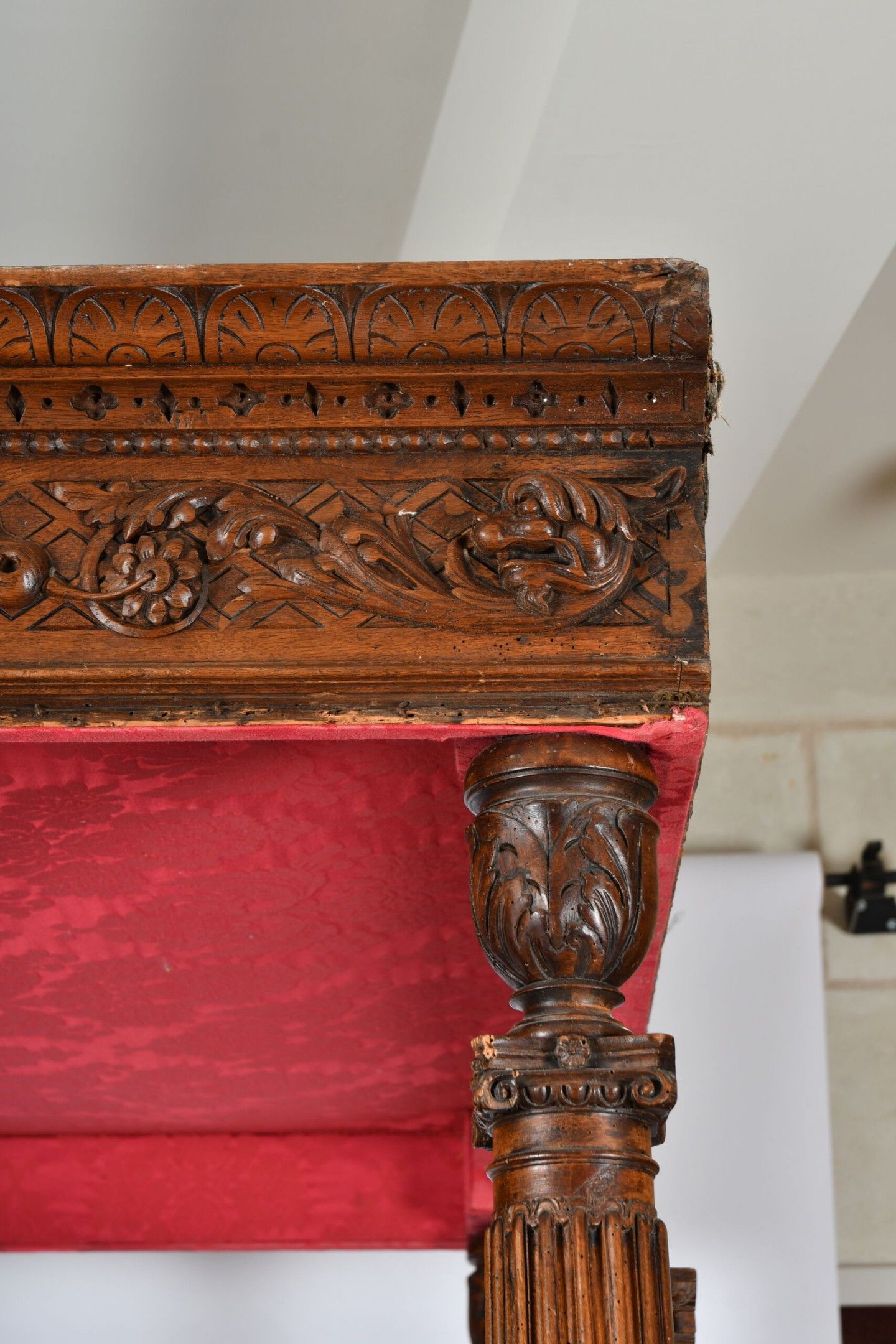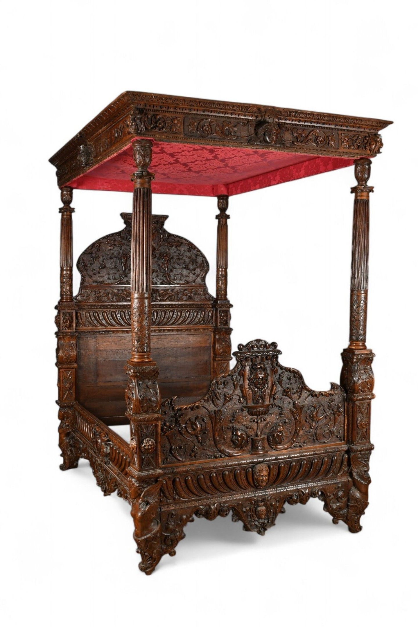 BALDAQUIN BED in walnut, straight uprights carved and topped with gadrooned columns with bases decorated with foliage in relief and topped with Ionic capitals. Straight moulded crosspieces carved with fondrons, chimeras and rocaille. Pediment adorned with a frieze of foliage alternating with a mascaron. Renaissance and 19th century elements. H. 250 - W. 152 - D. 215 cm. Minor chips and restorations