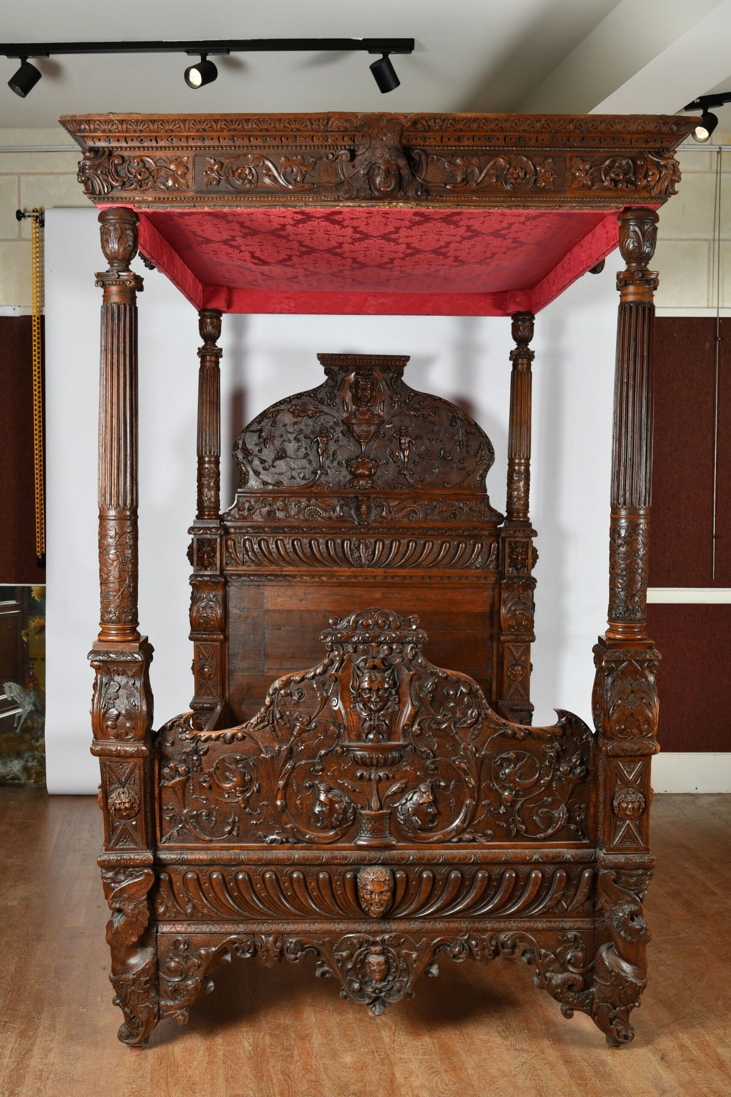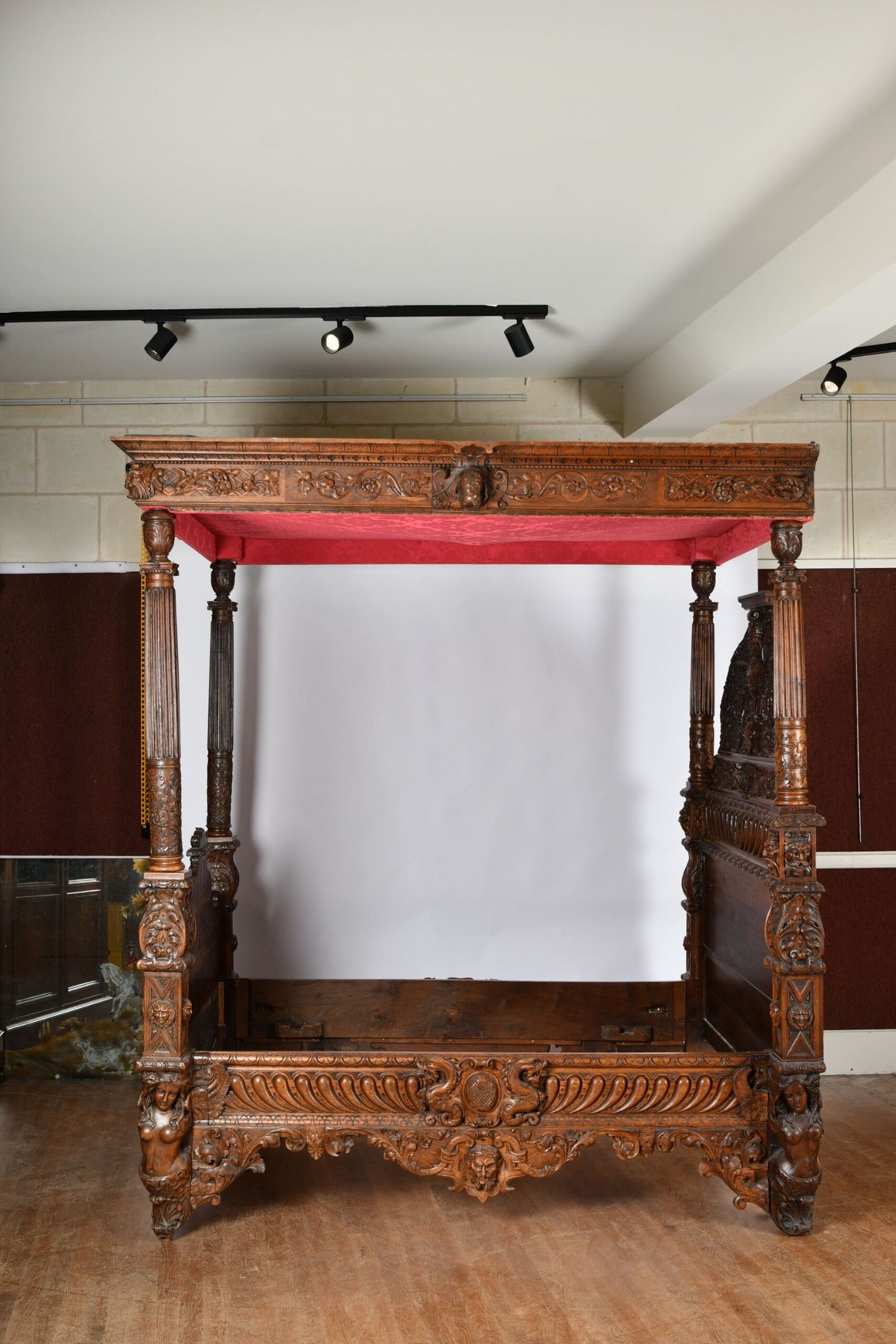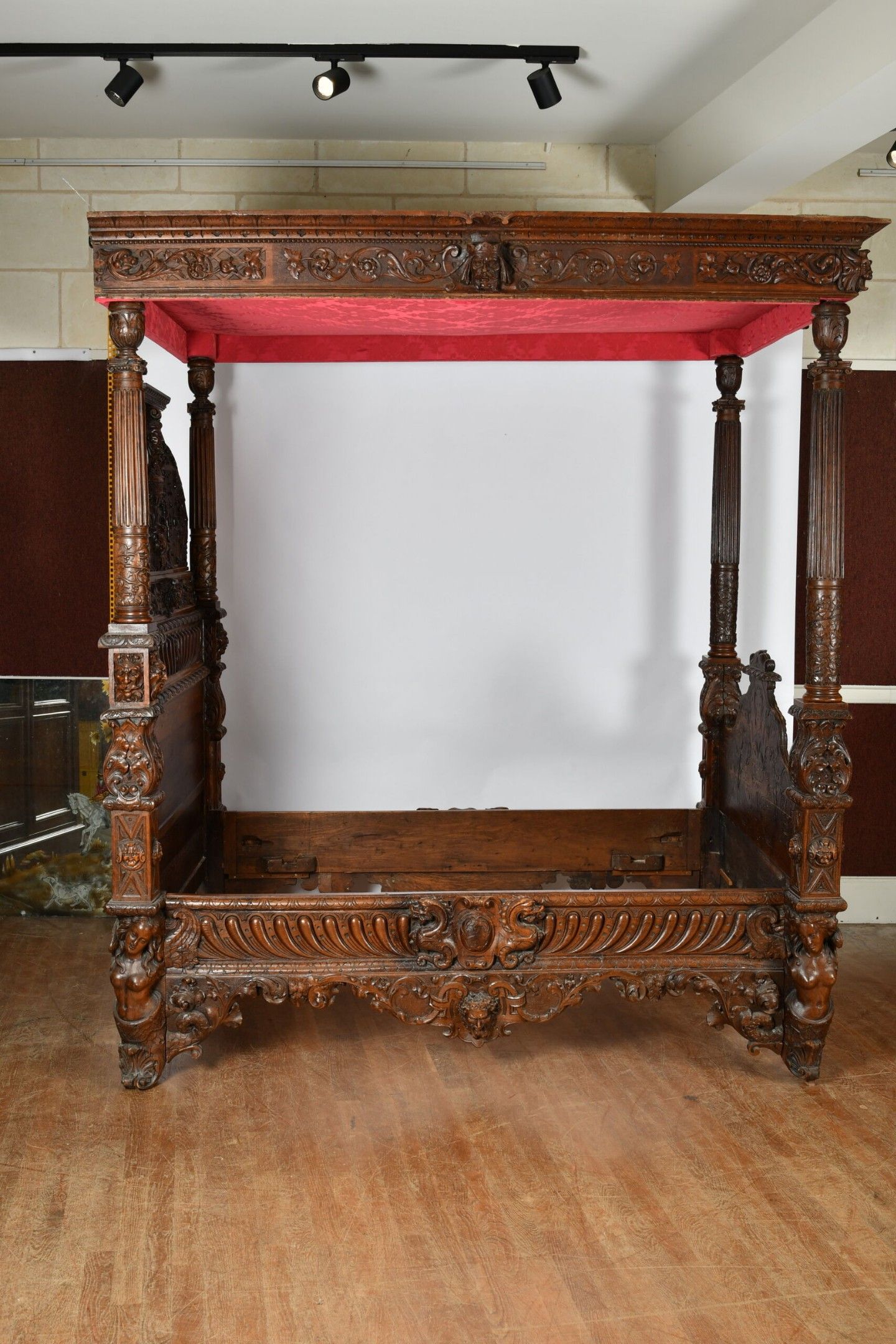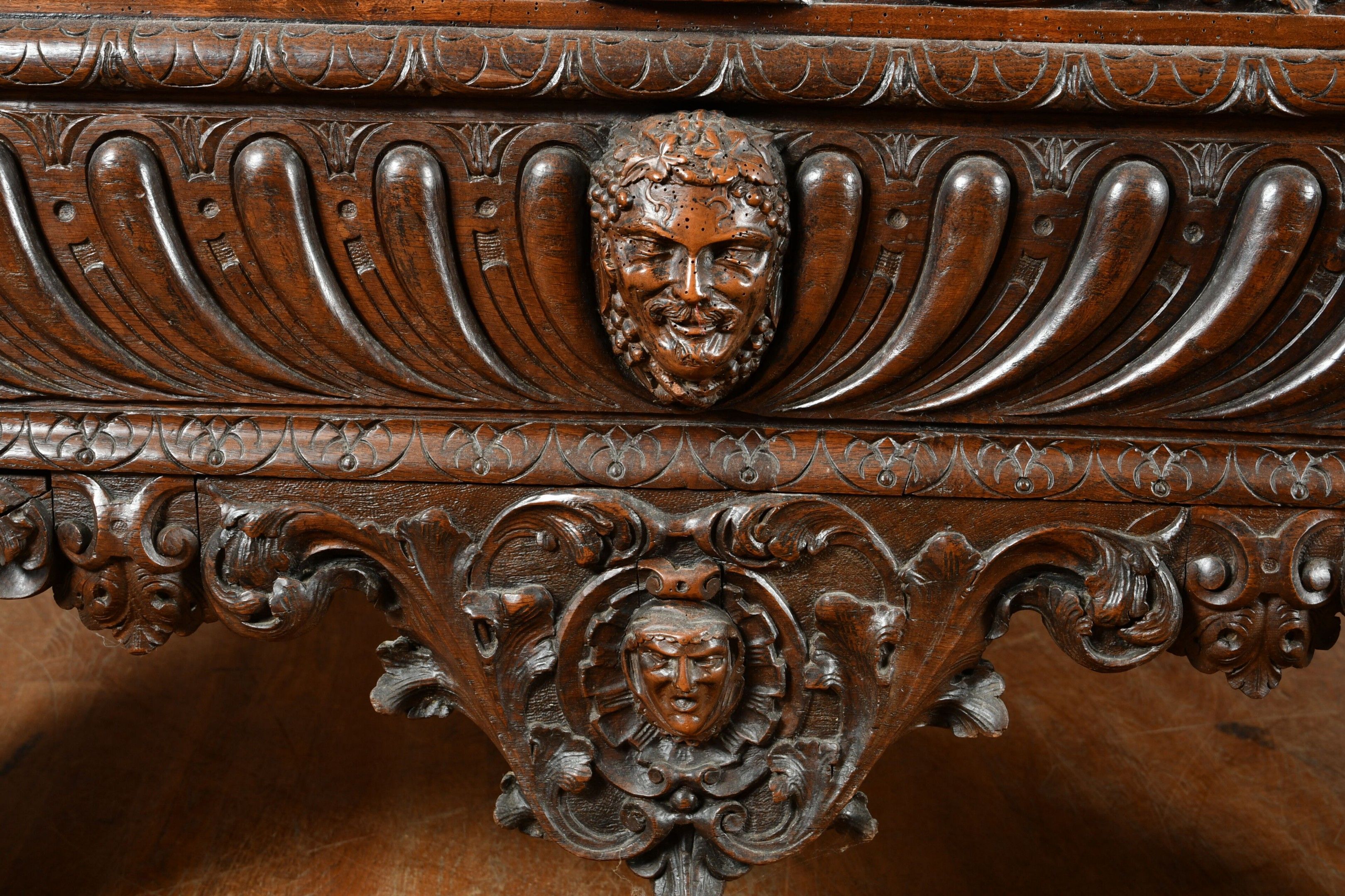 BALDAQUIN BED in walnut, straight uprights carved and topped with gadrooned columns with bases decorated with foliage in relief and topped with Ionic capitals. Straight moulded crosspieces carved with fondrons, chimeras and rocaille. Pediment adorned with a frieze of foliage alternating with a mascaron. Renaissance and 19th century elements. H. 250 - W. 152 - D. 215 cm. Minor chips and restorations