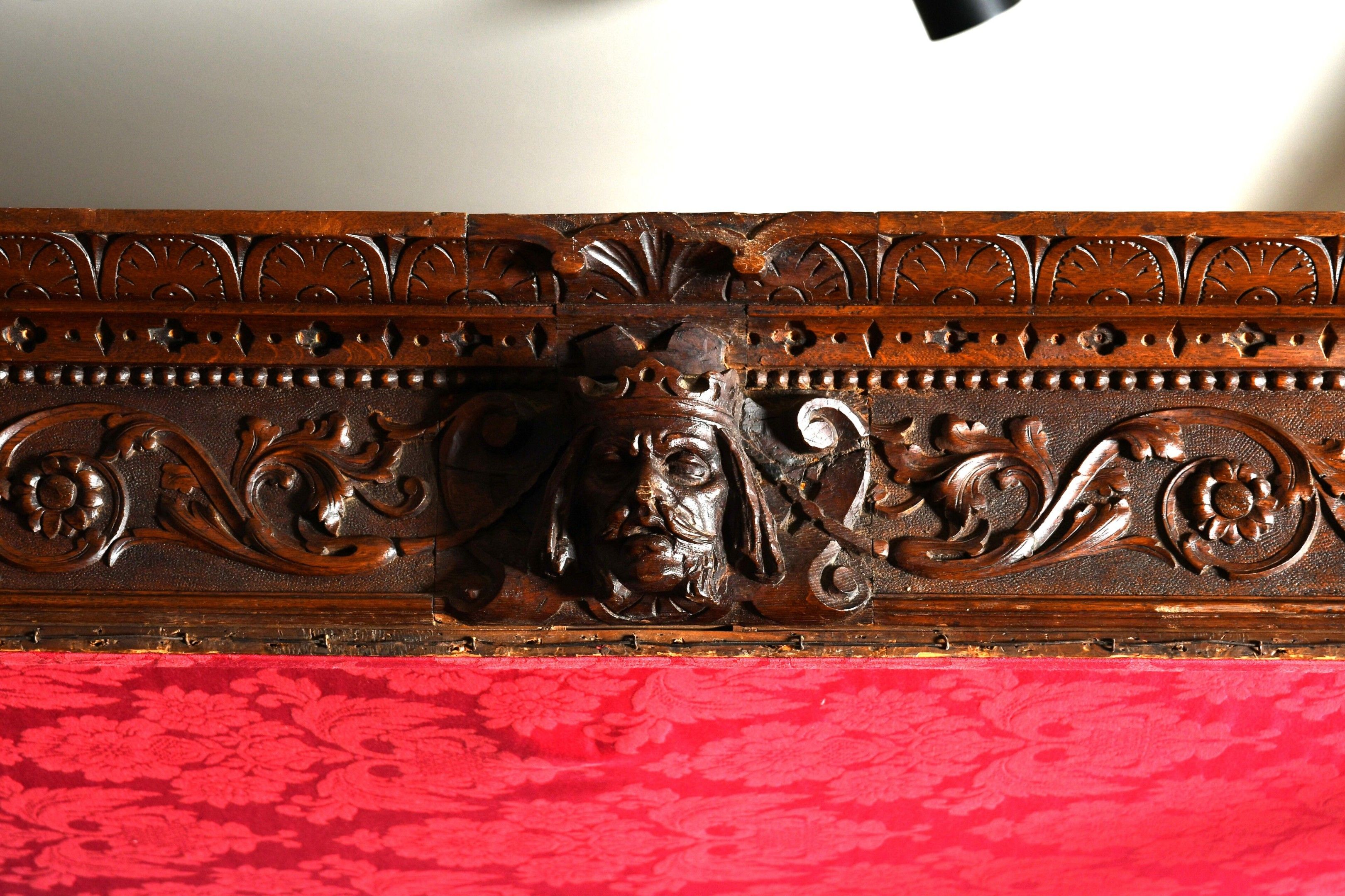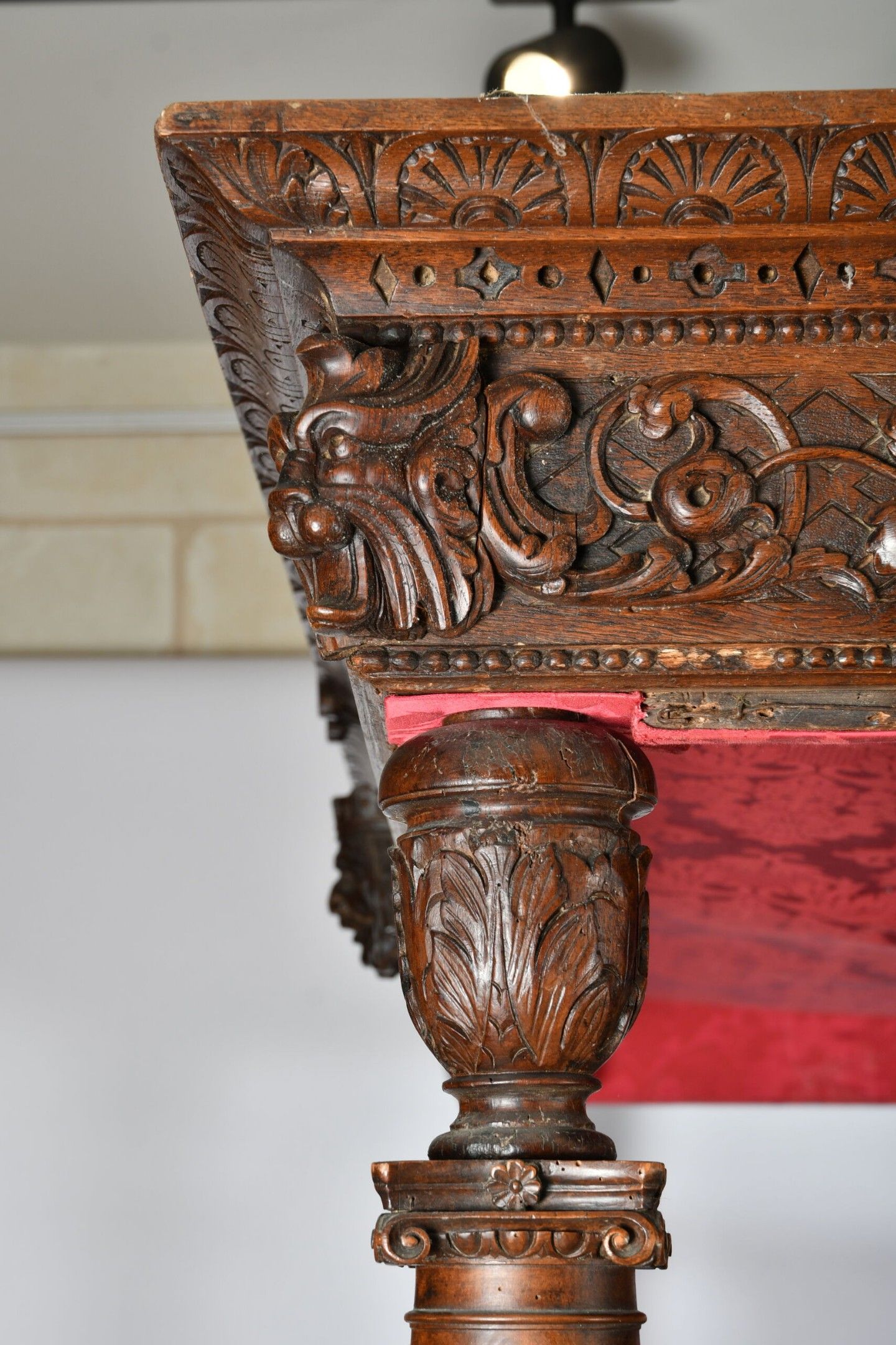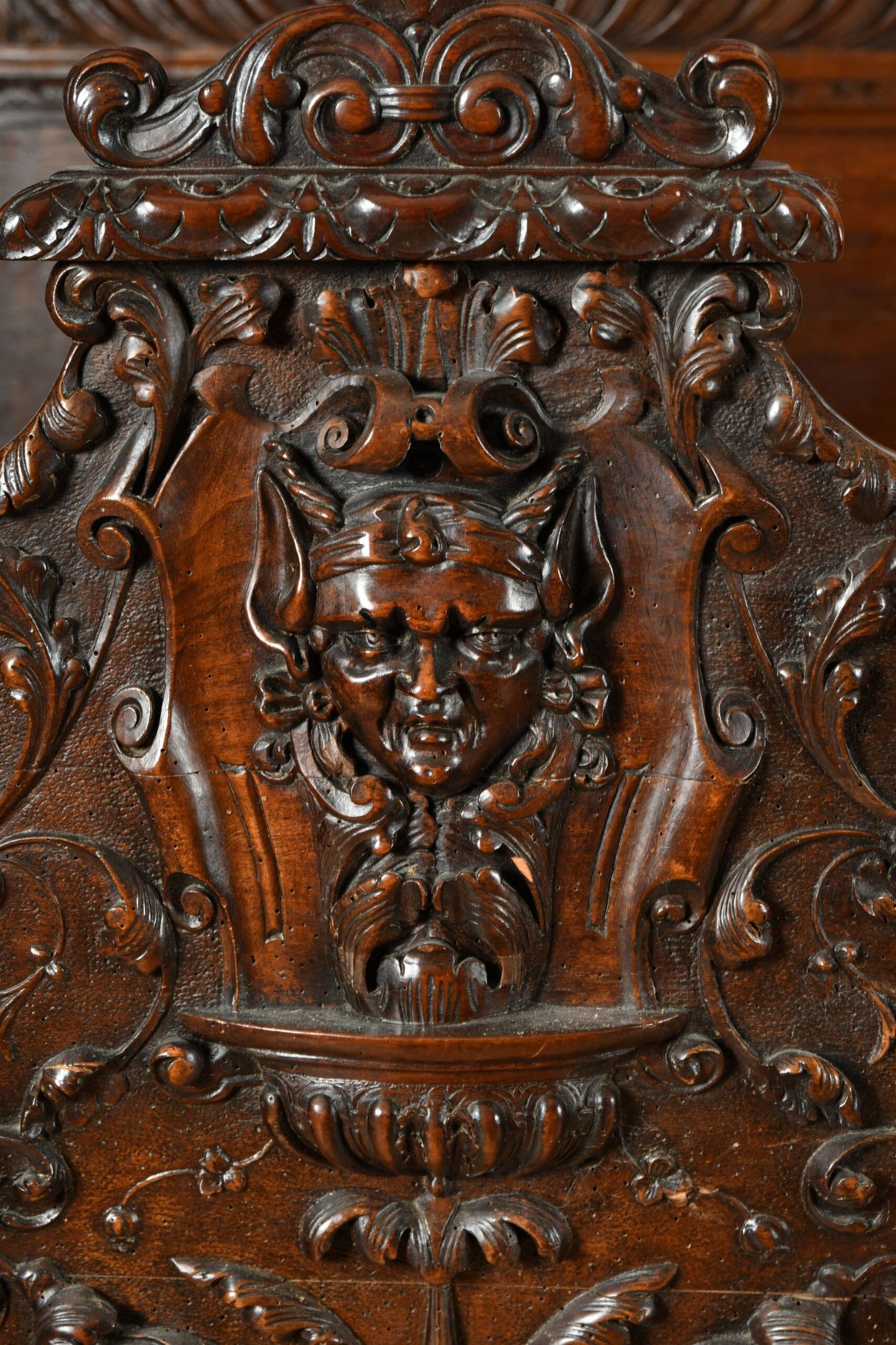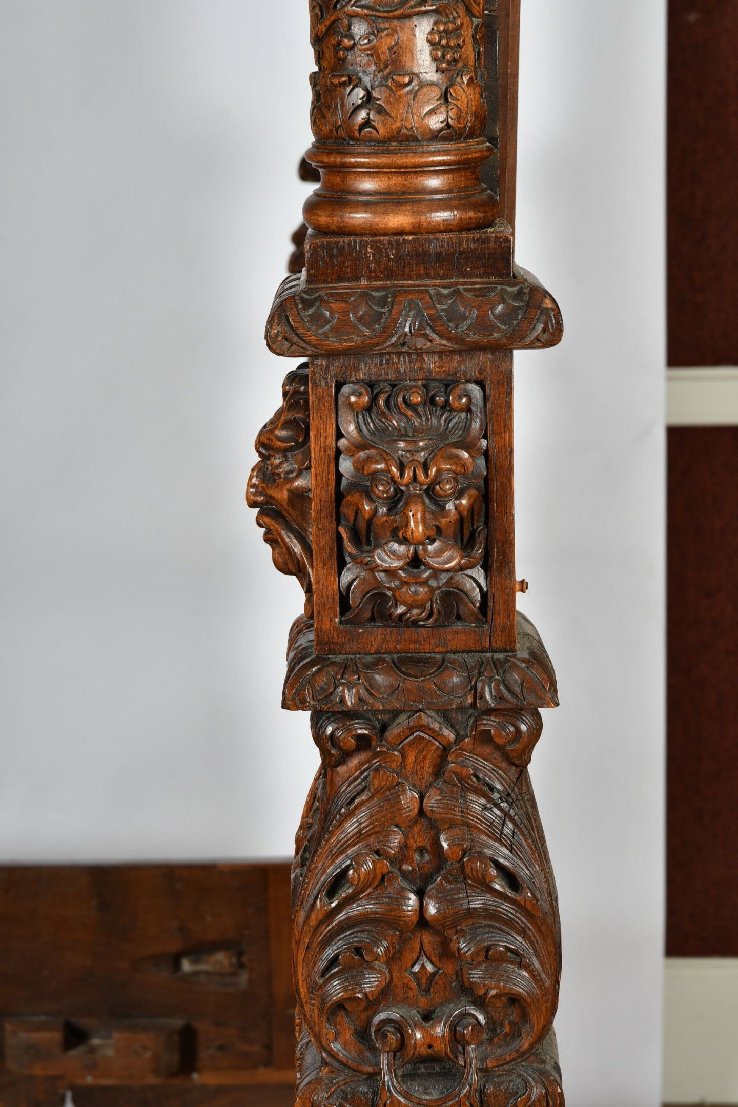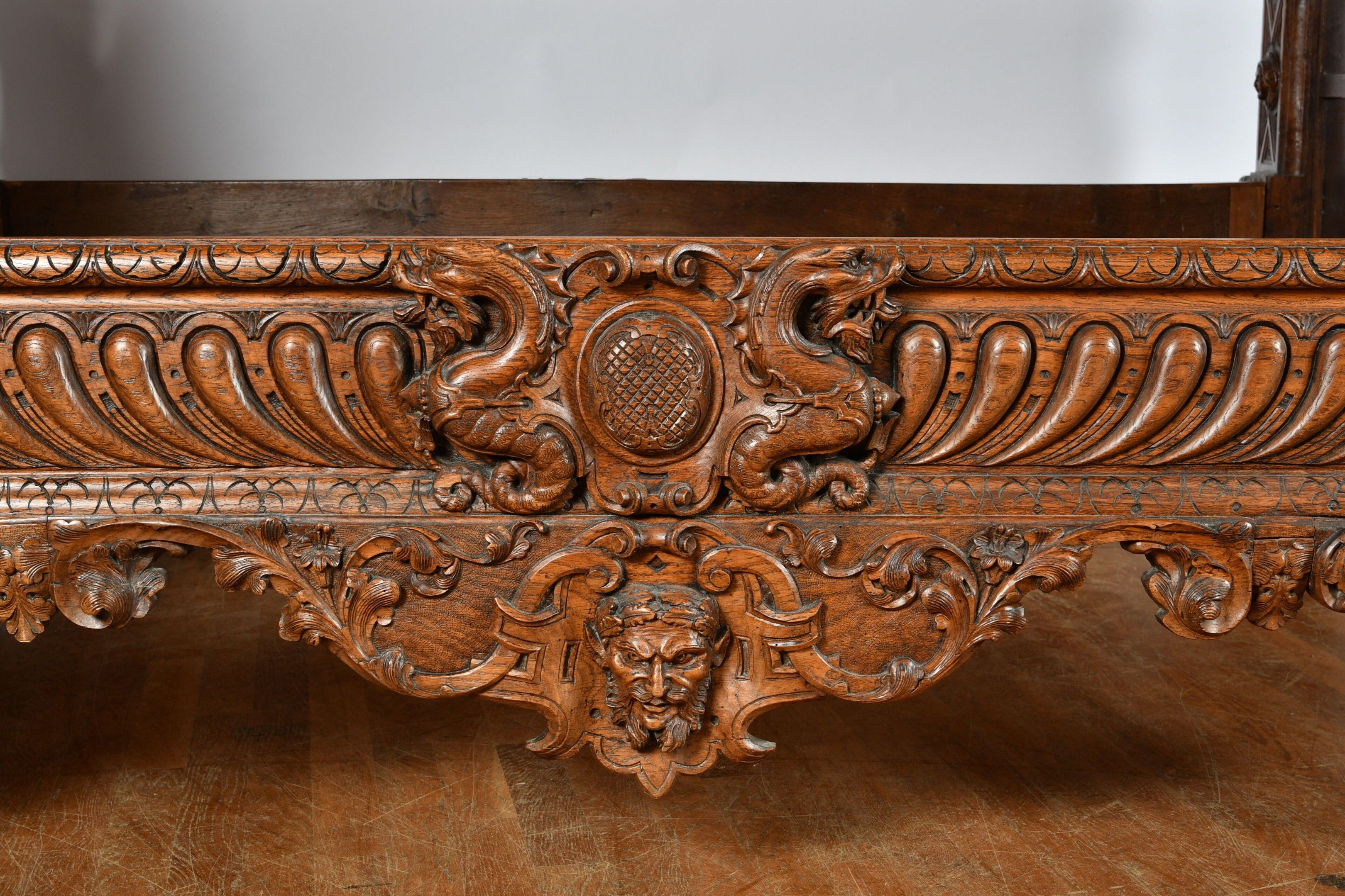 BALDAQUIN BED in walnut, straight uprights carved and topped with gadrooned columns with bases decorated with foliage in relief and topped with Ionic capitals. Straight moulded crosspieces carved with fondrons, chimeras and rocaille. Pediment adorned with a frieze of foliage alternating with a mascaron. Renaissance and 19th century elements. H. 250 - W. 152 - D. 215 cm. Minor chips and restorations