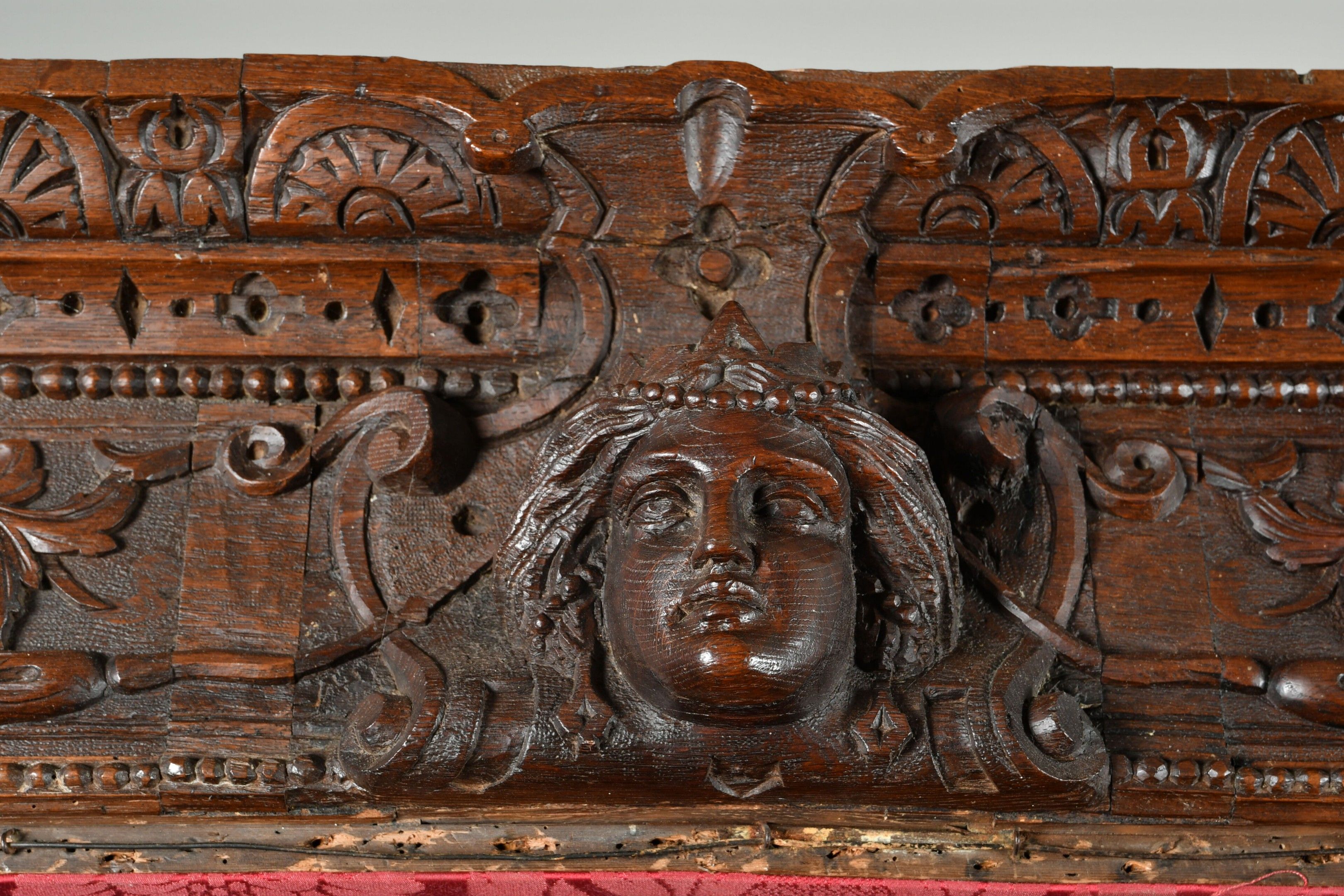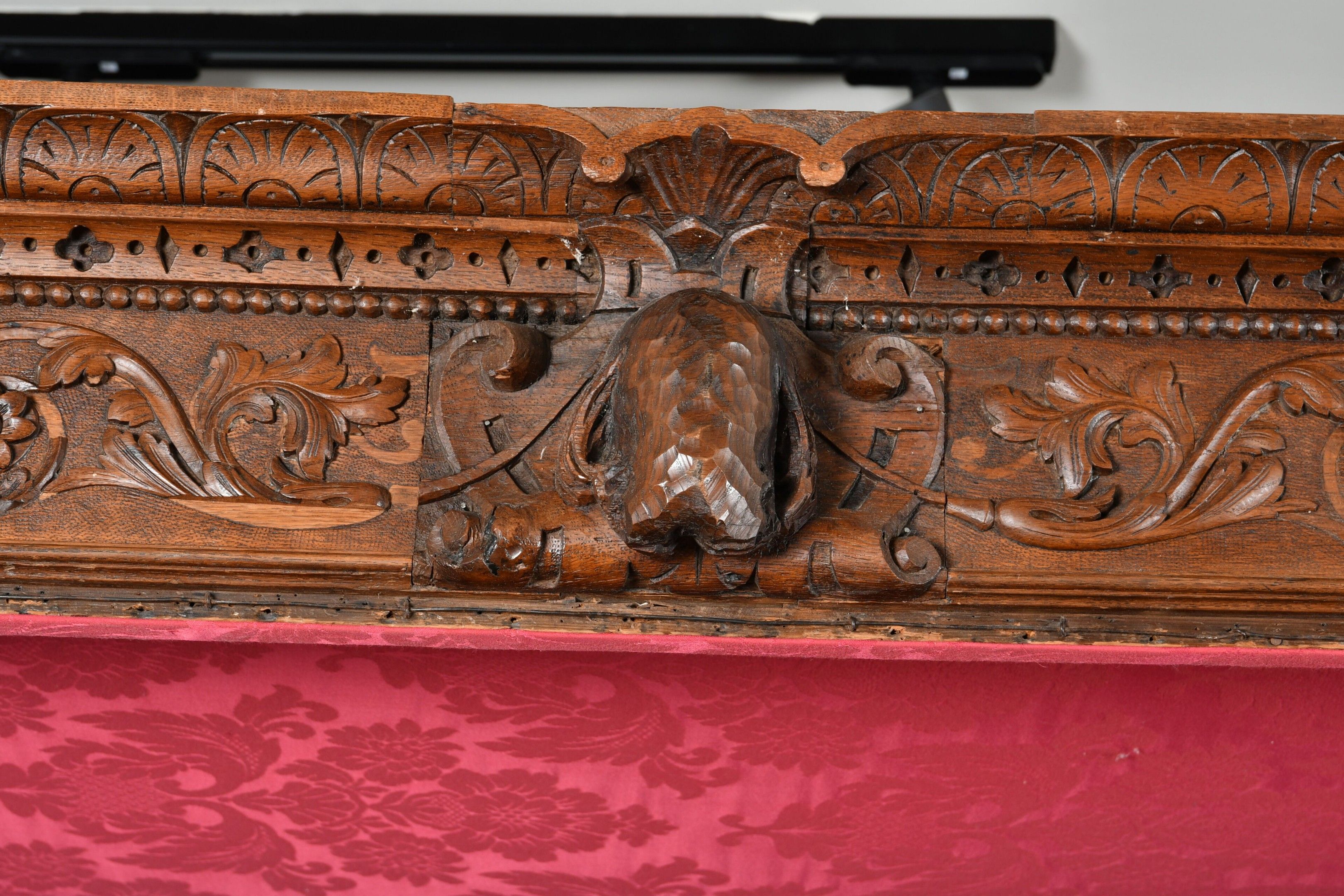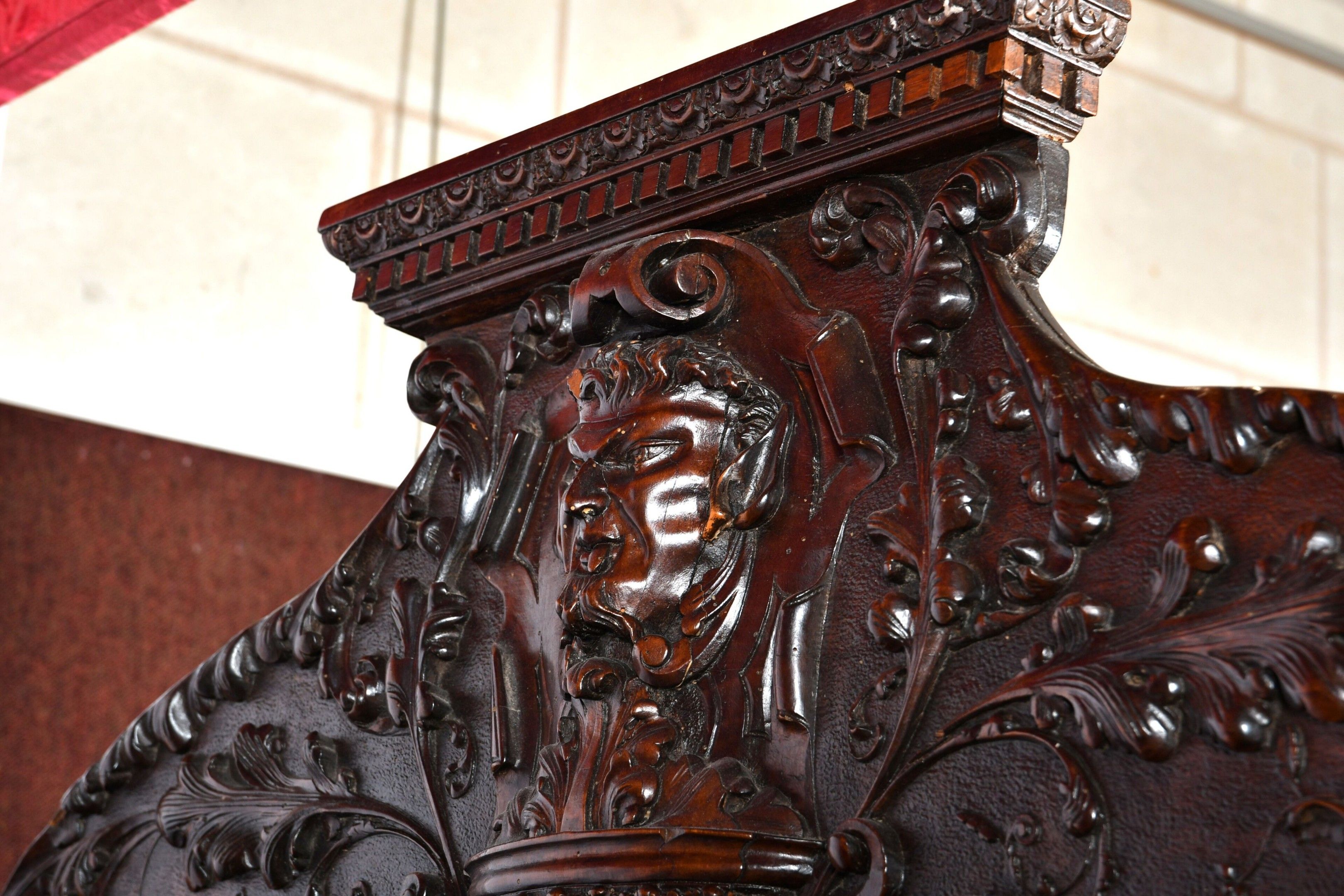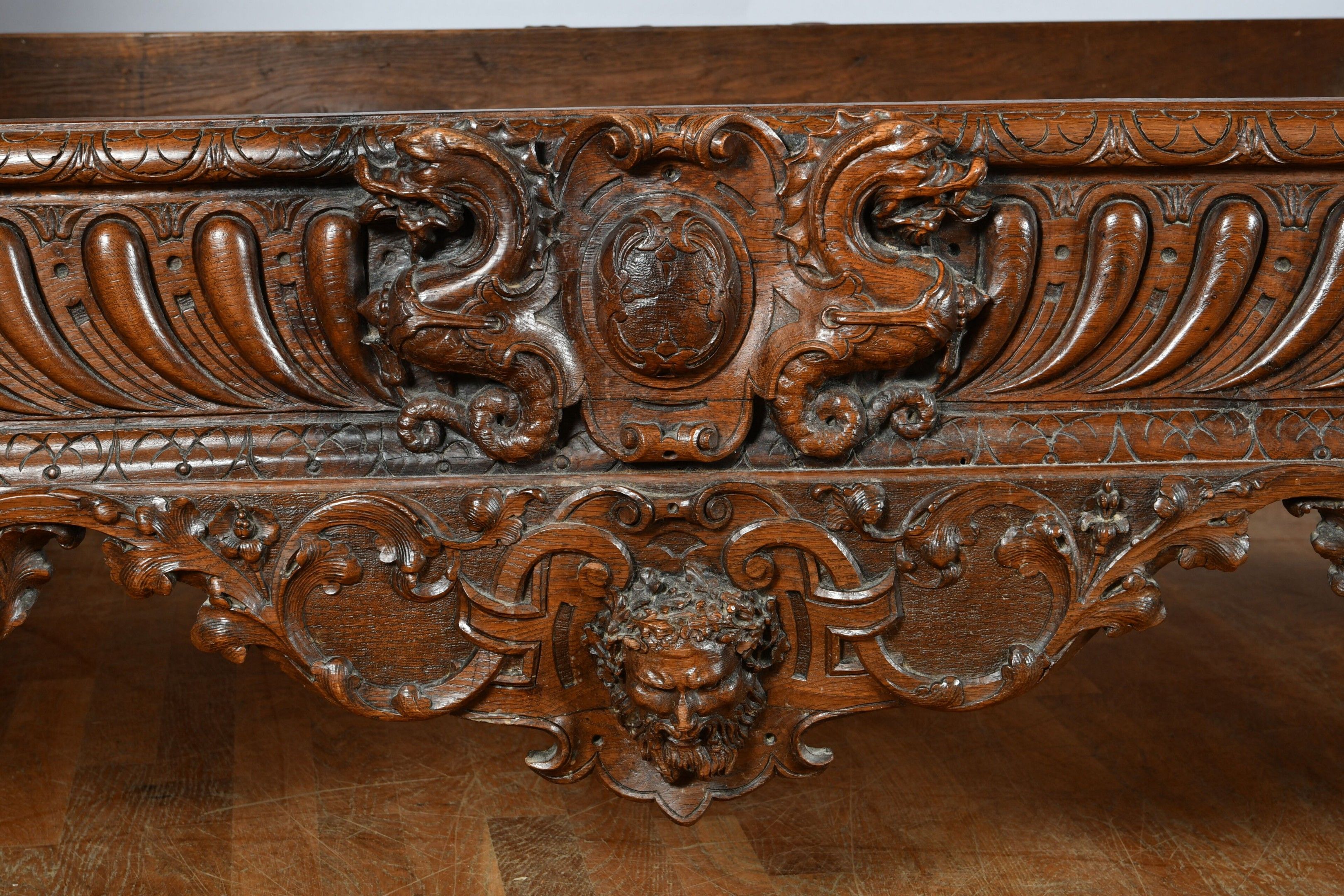 BALDAQUIN BED in walnut, straight uprights carved and topped with gadrooned columns with bases decorated with foliage in relief and topped with Ionic capitals. Straight moulded crosspieces carved with fondrons, chimeras and rocaille. Pediment adorned with a frieze of foliage alternating with a mascaron. Renaissance and 19th century elements. H. 250 - W. 152 - D. 215 cm. Minor chips and restorations