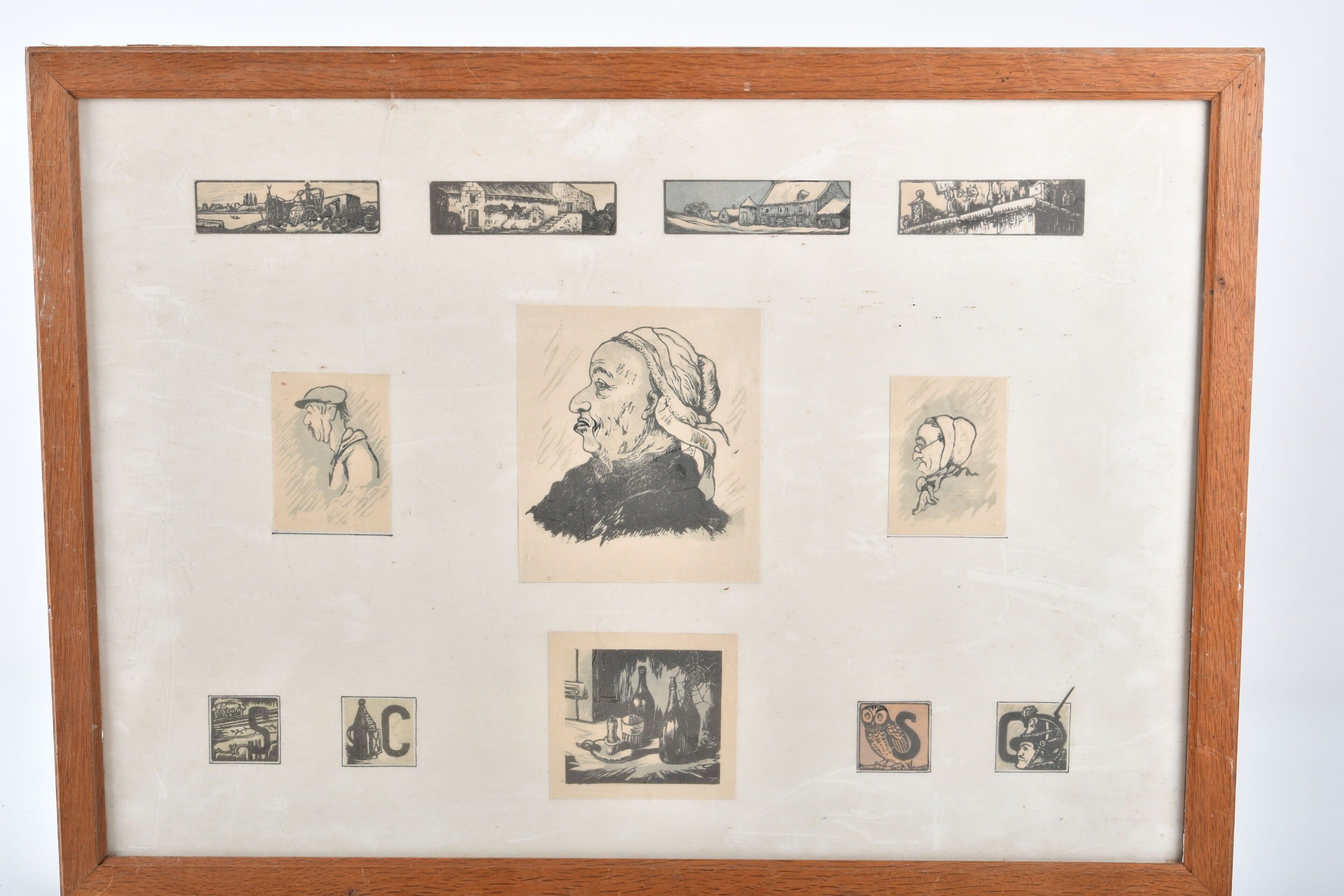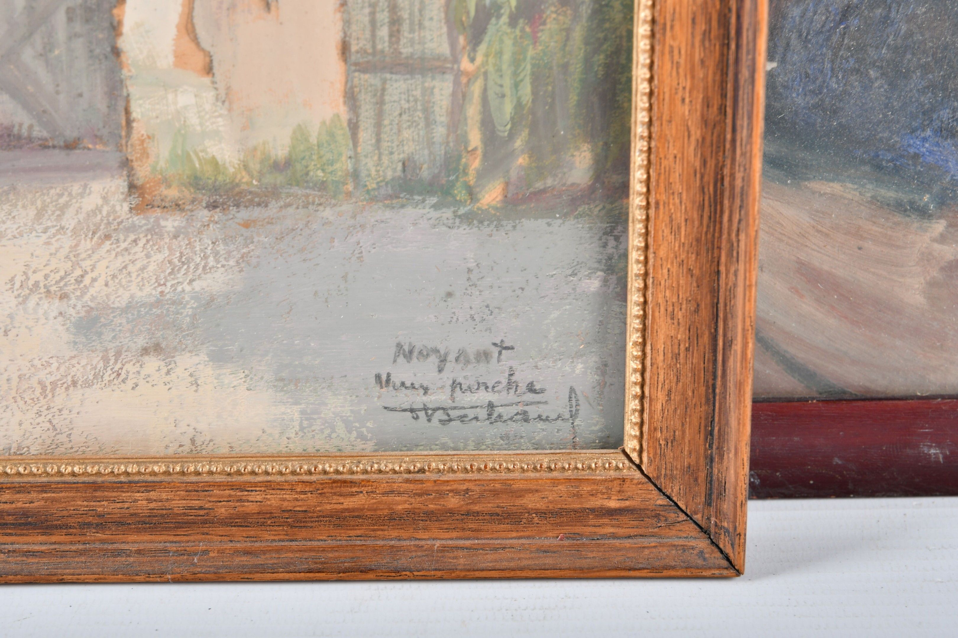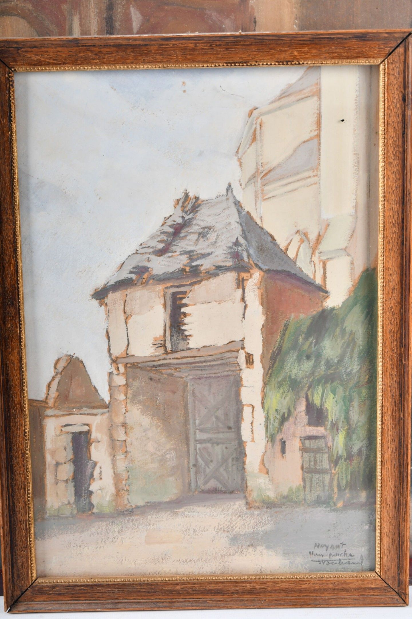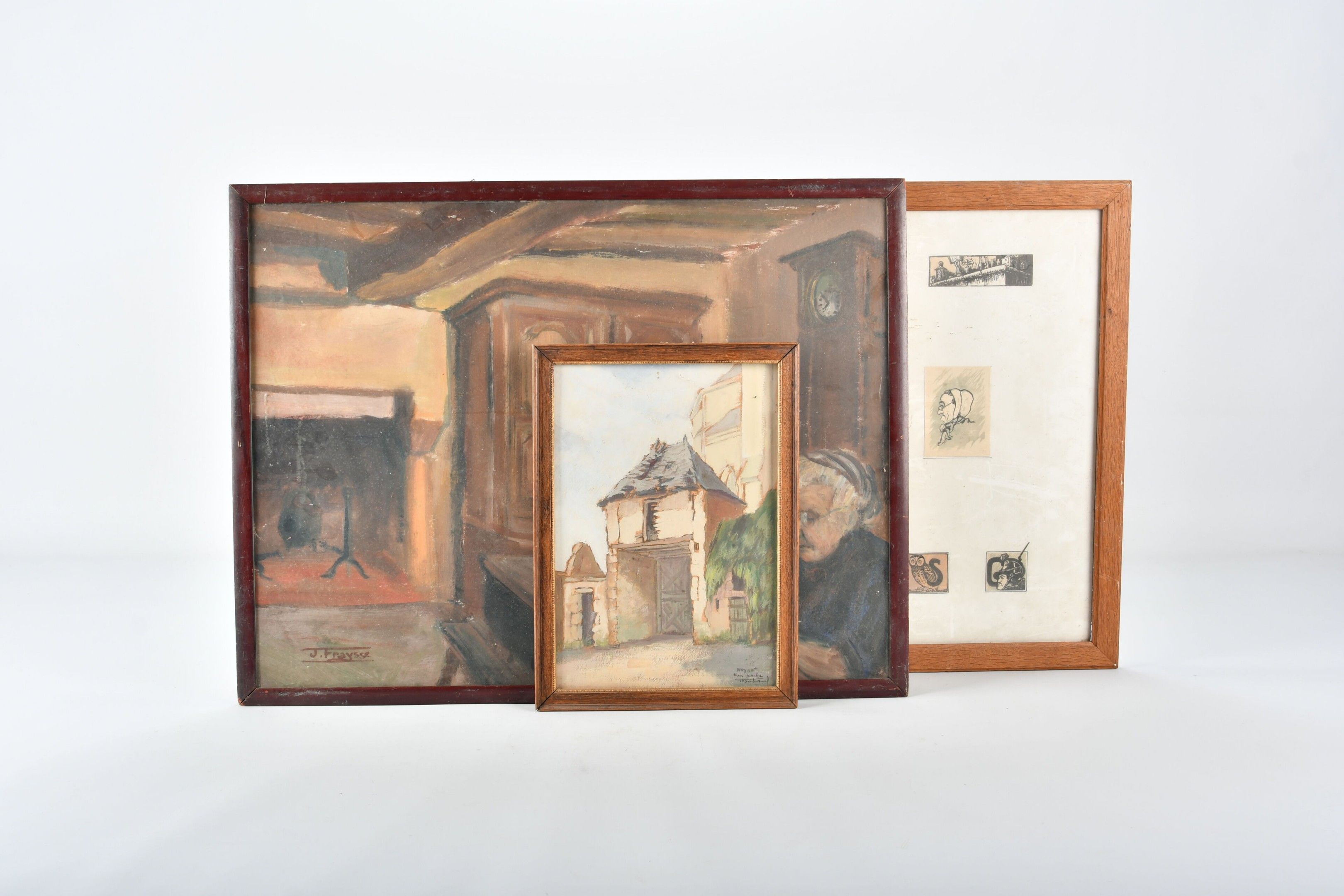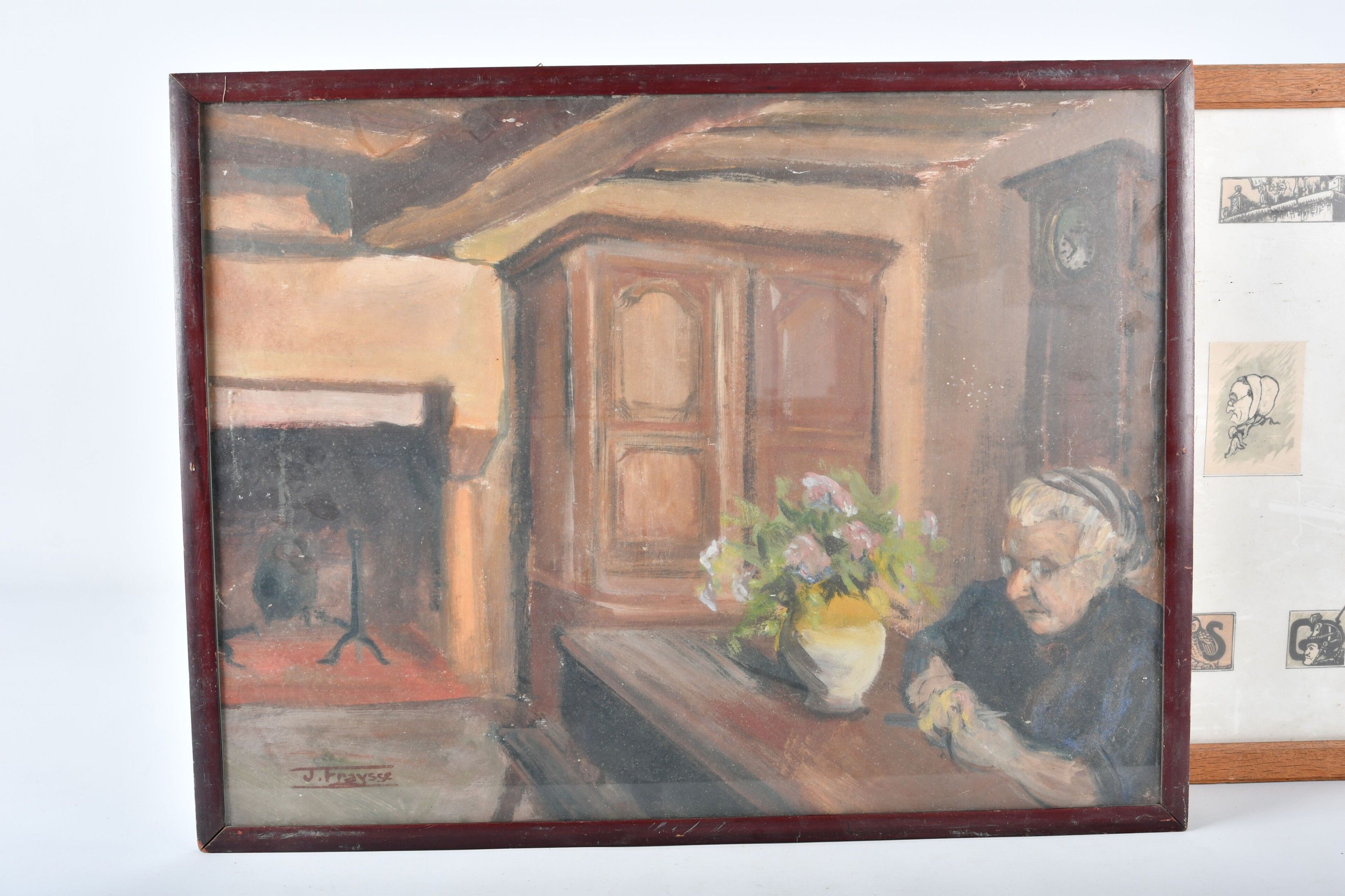 J. FRAYSSE (XXth). Interior view of an old lady knitting. gouache signed lower right. 48 x 62 cm. Attached is a plate of stencils including profiles of people and still lifes. And ATTACHED a view of a porch in Noyant (Maine et Loire) by another artist.