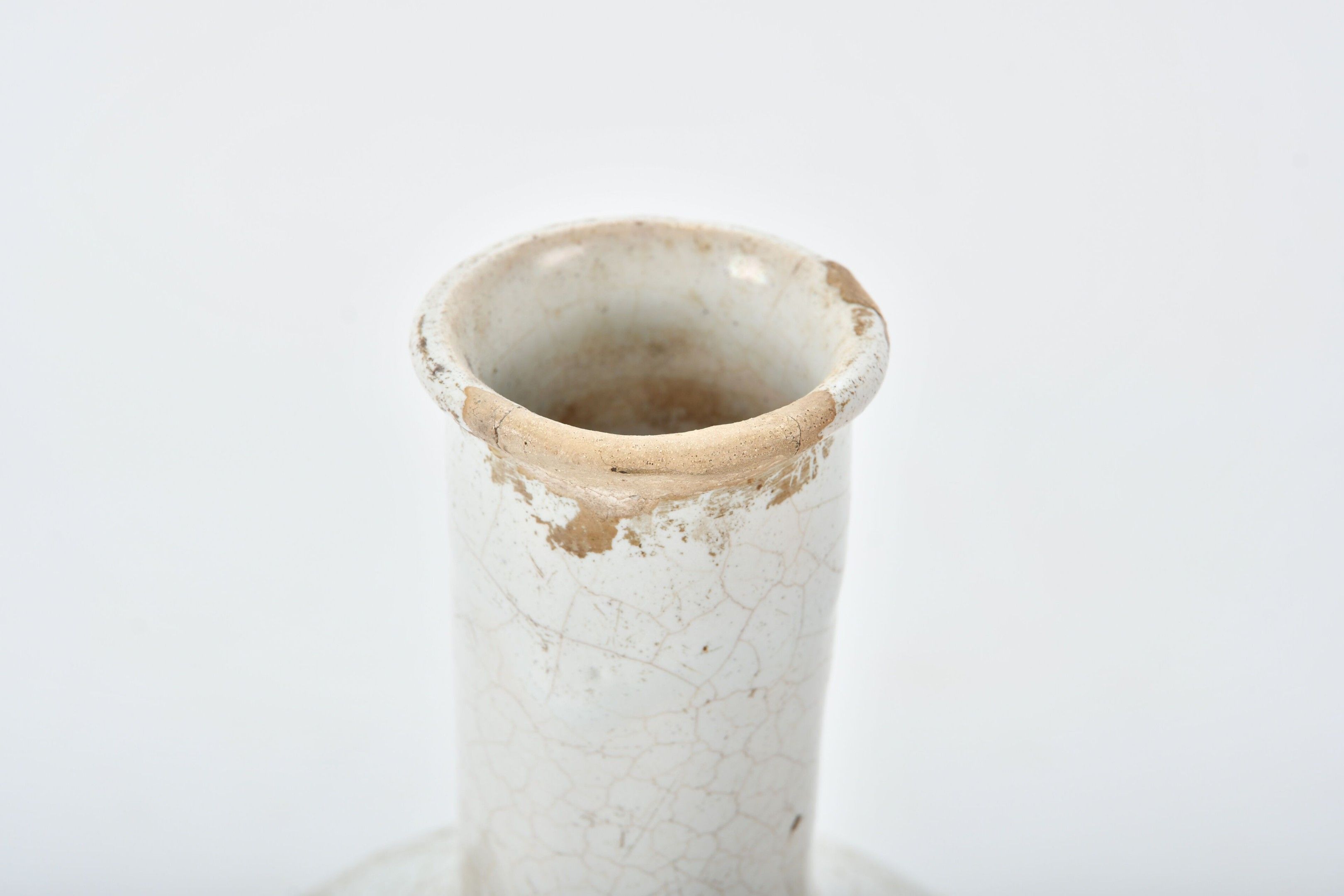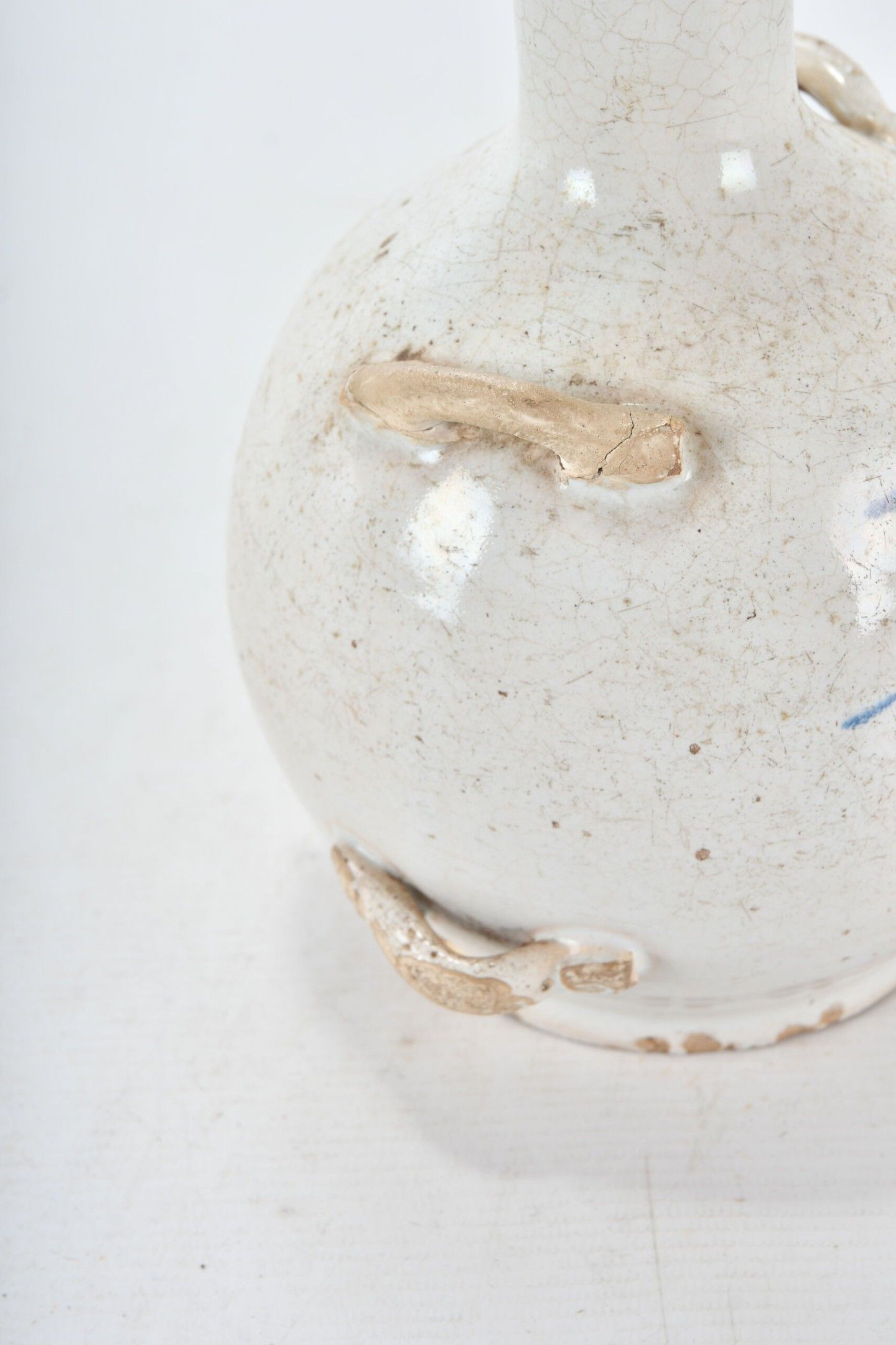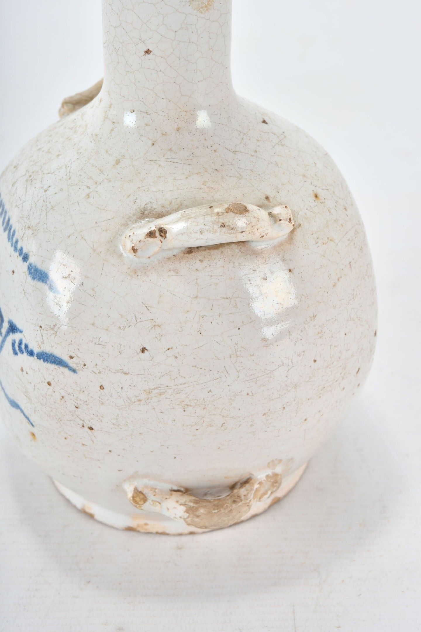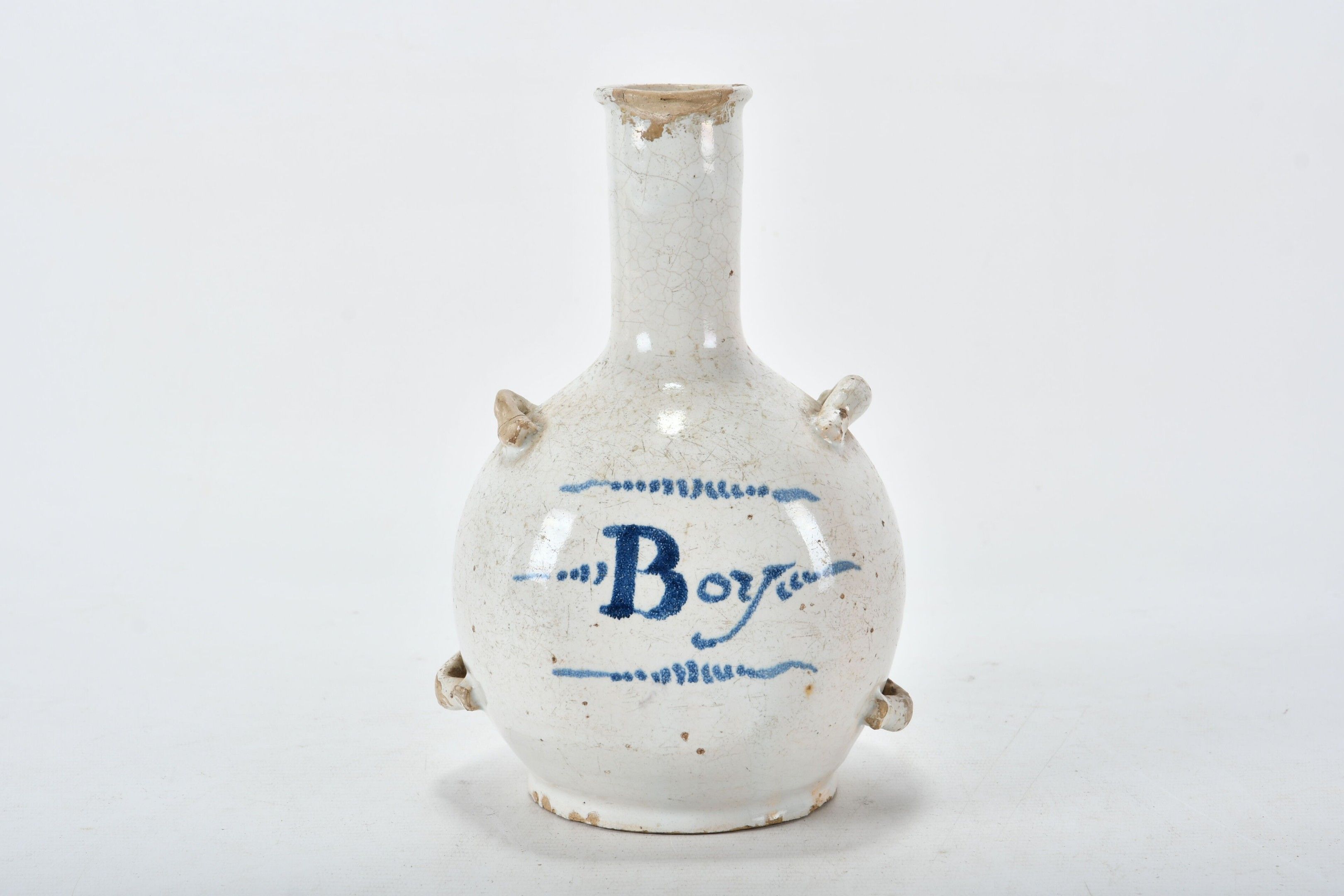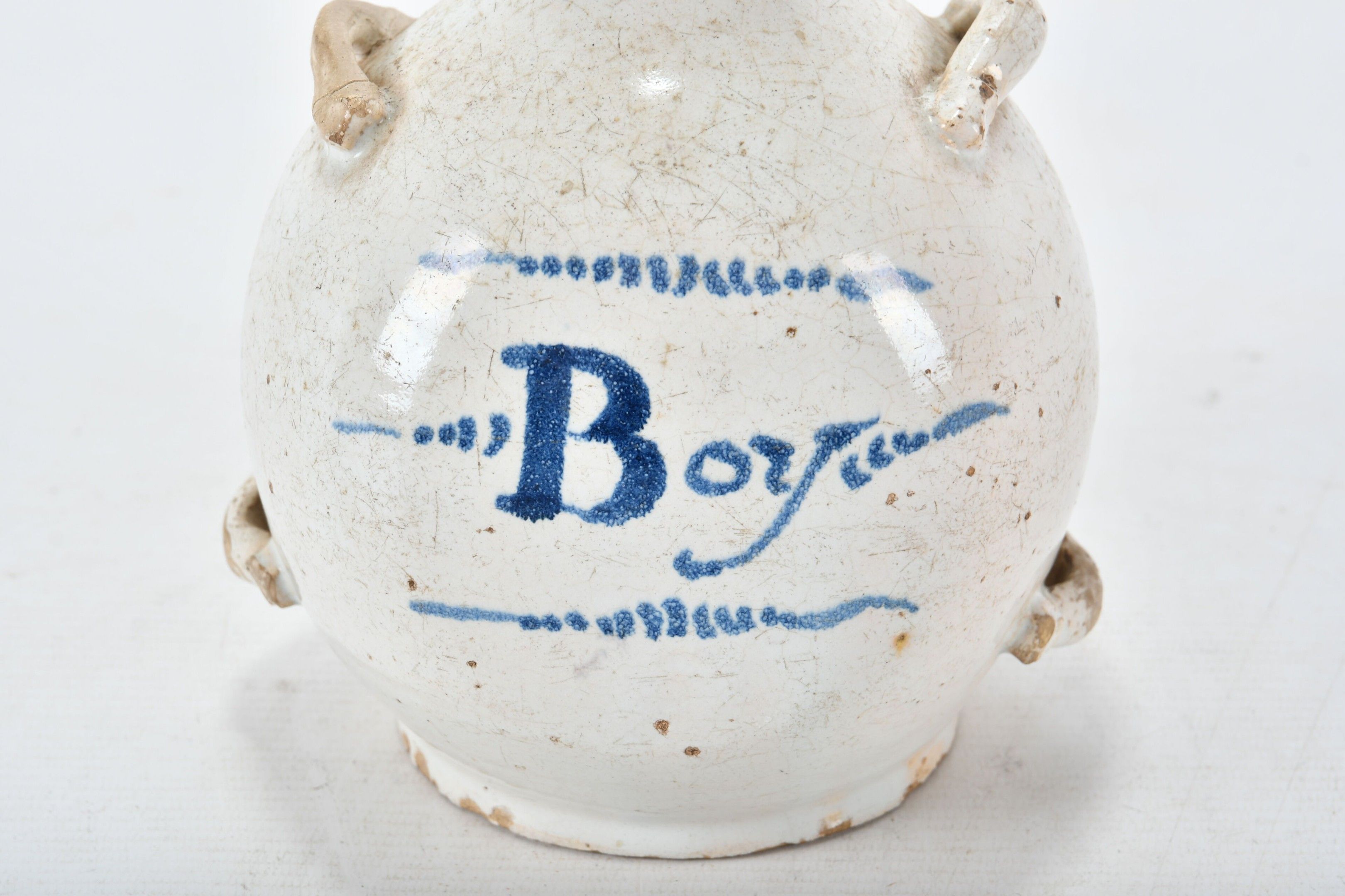 Ovoid goblet with high neck and four handles in glazed earthenware. Titled "BOY" in blue on the body. 17th century period. Height 23.5 cm. Old restorations to the neck, one handle, glaze chips.