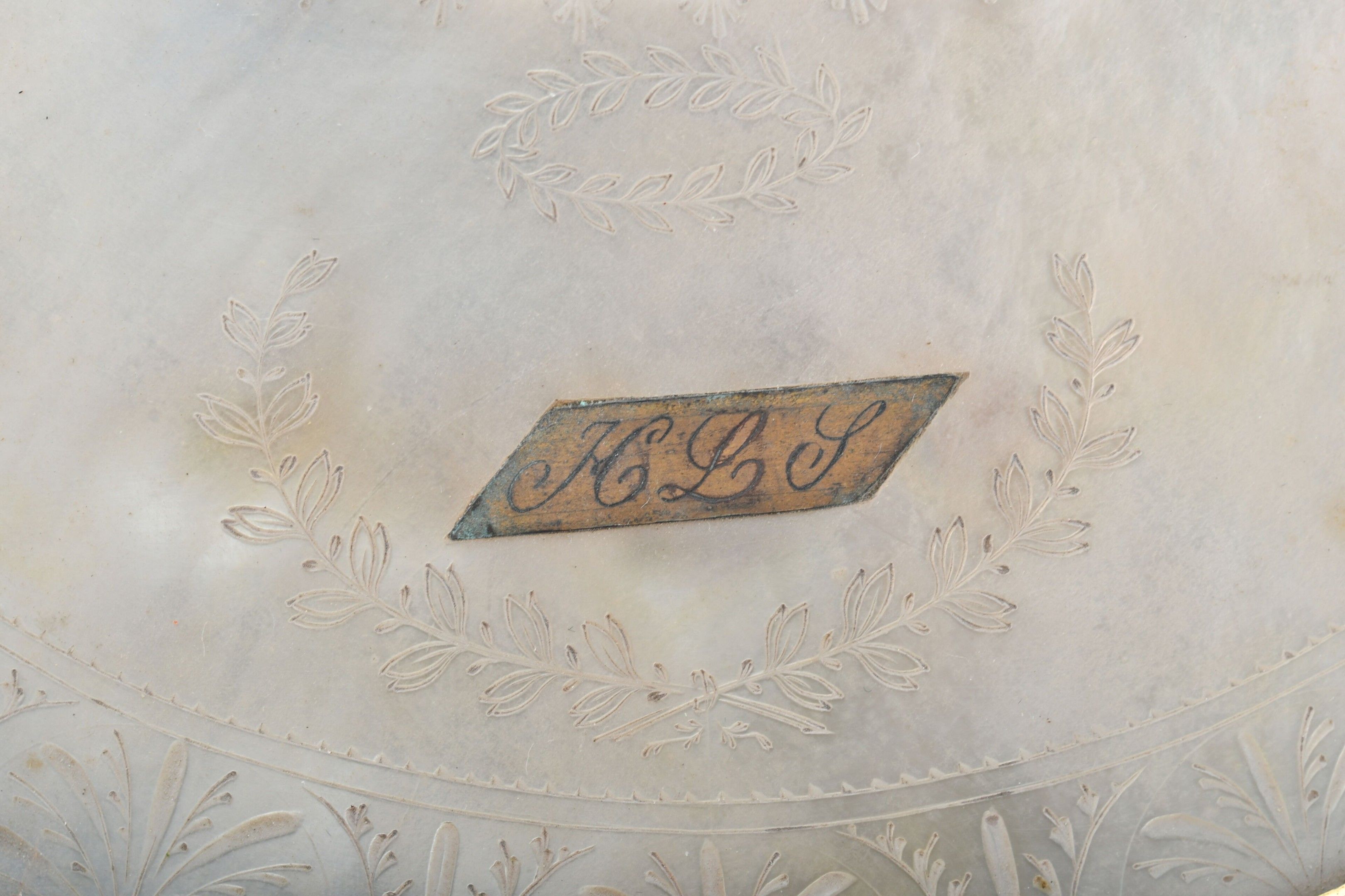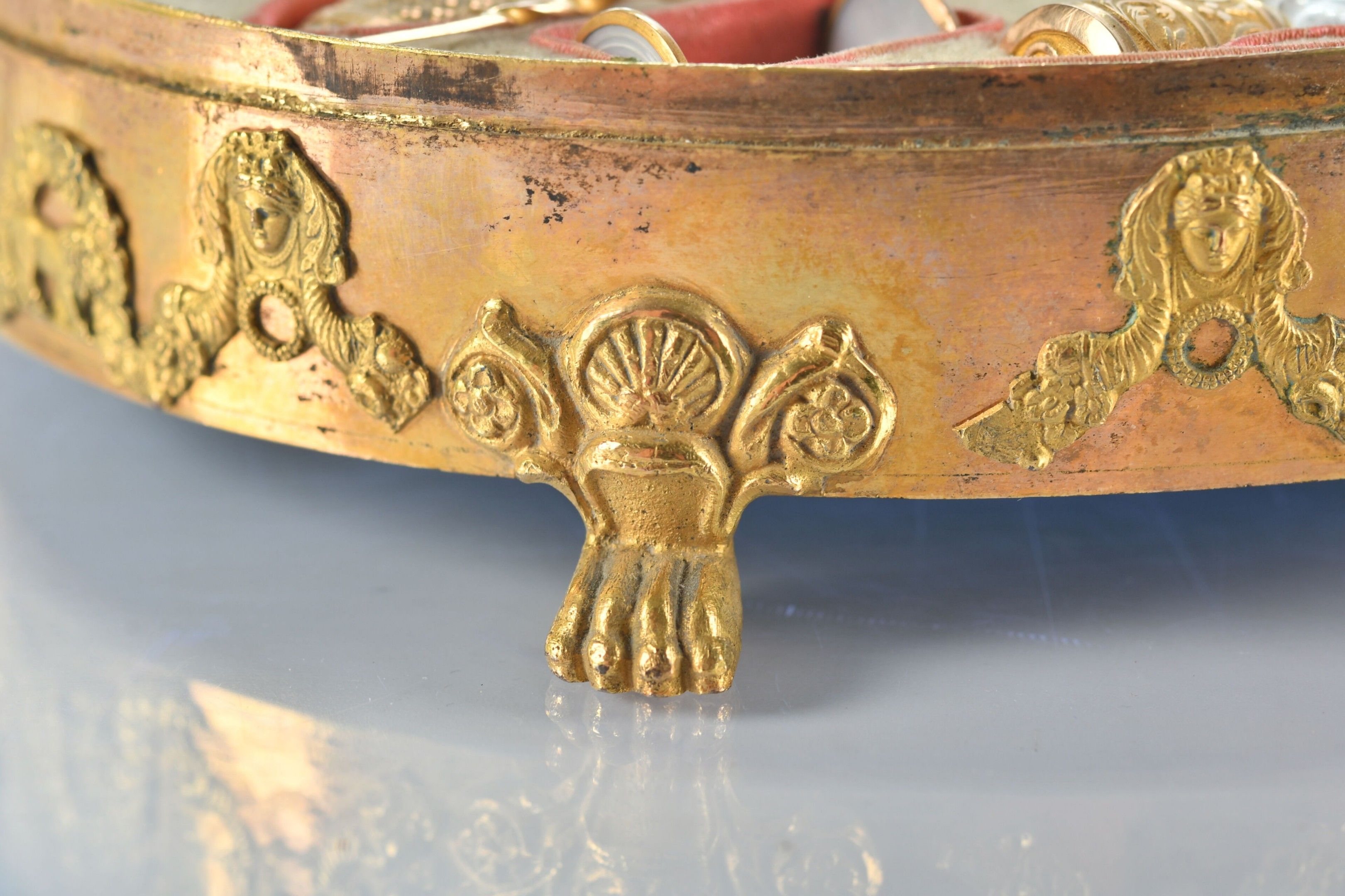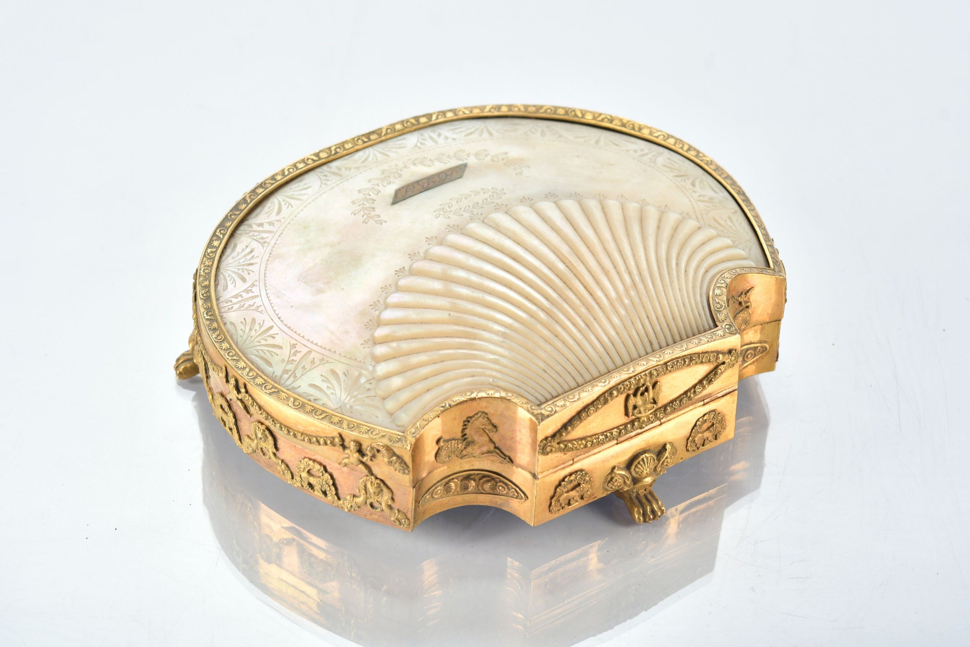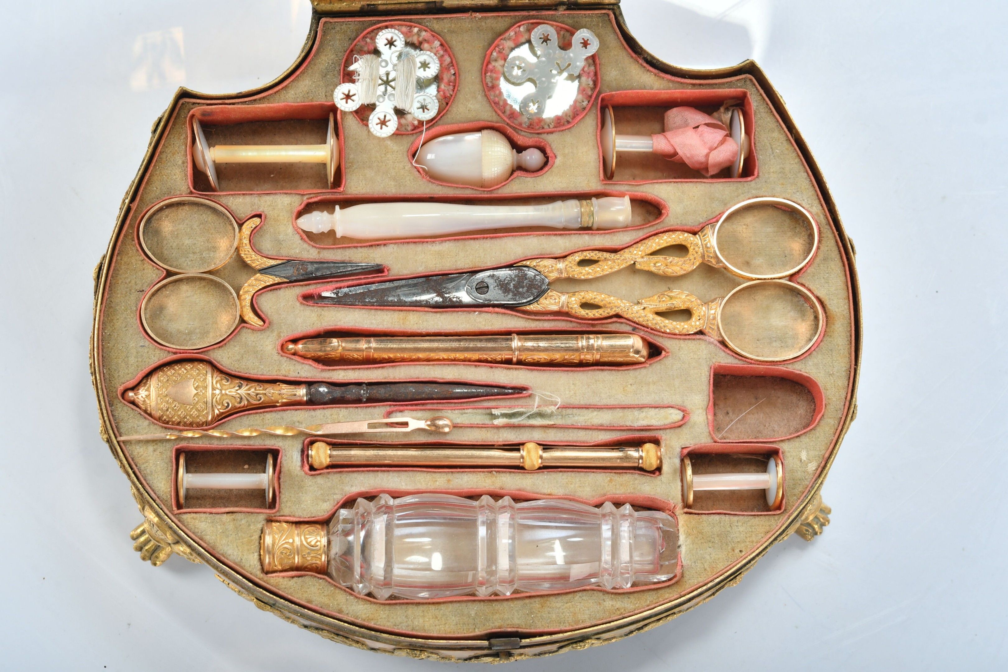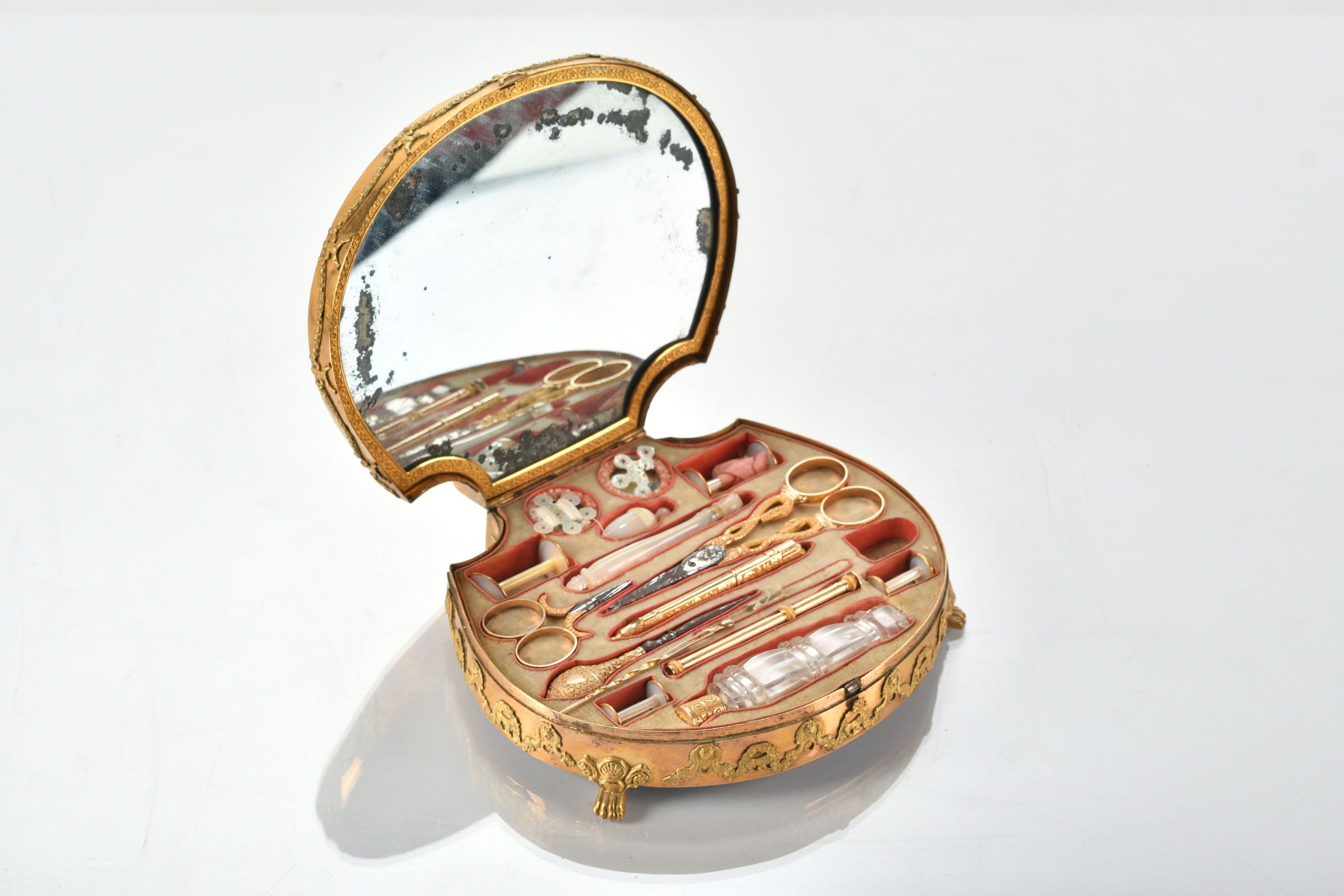 COUTURE NECESSARY presented in a finely chased and gilt bronze case decorated with garlands, mascarons and putti, standing on three claw feet, the lid formed by a mother-of-pearl shell engraved with palmettes and monogrammed. The interior reveals a mirror and utensils in 750 thousandths yellow gold, crystal and mother-of-pearl. Small guarantee hallmarks for Paris 1809-1819 for five pieces and "bear" hallmark for the large pair of scissors. Empire period. W. 17.5 - D. 14.5 cm - Weight of gold components: 12.5 g - Gross weight of gold mounted pieces (2 pairs of scissors and one hallmark): 25.4 g. (Oxidation, missing chisel, broken chisel tip and mirror to be refixed).
