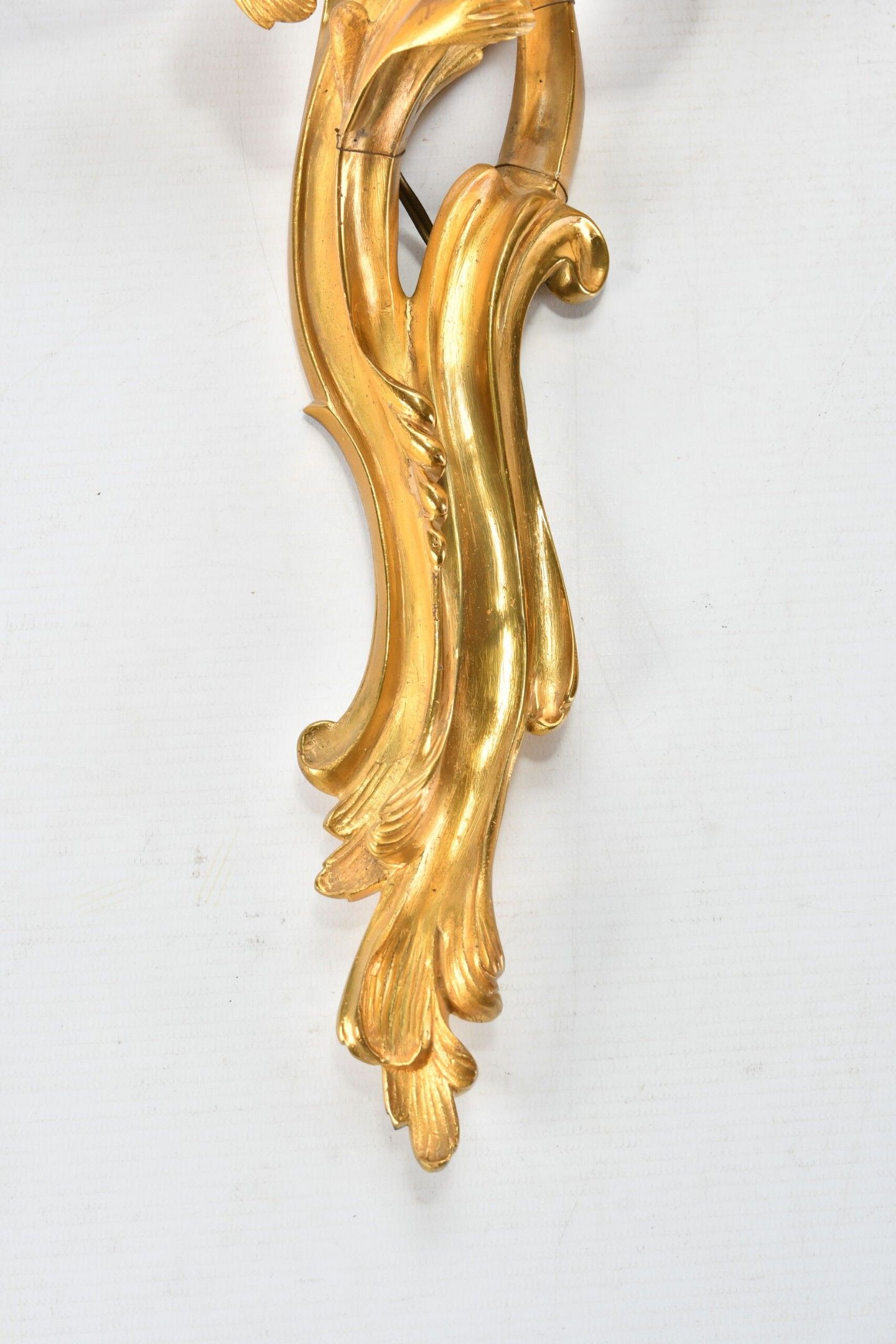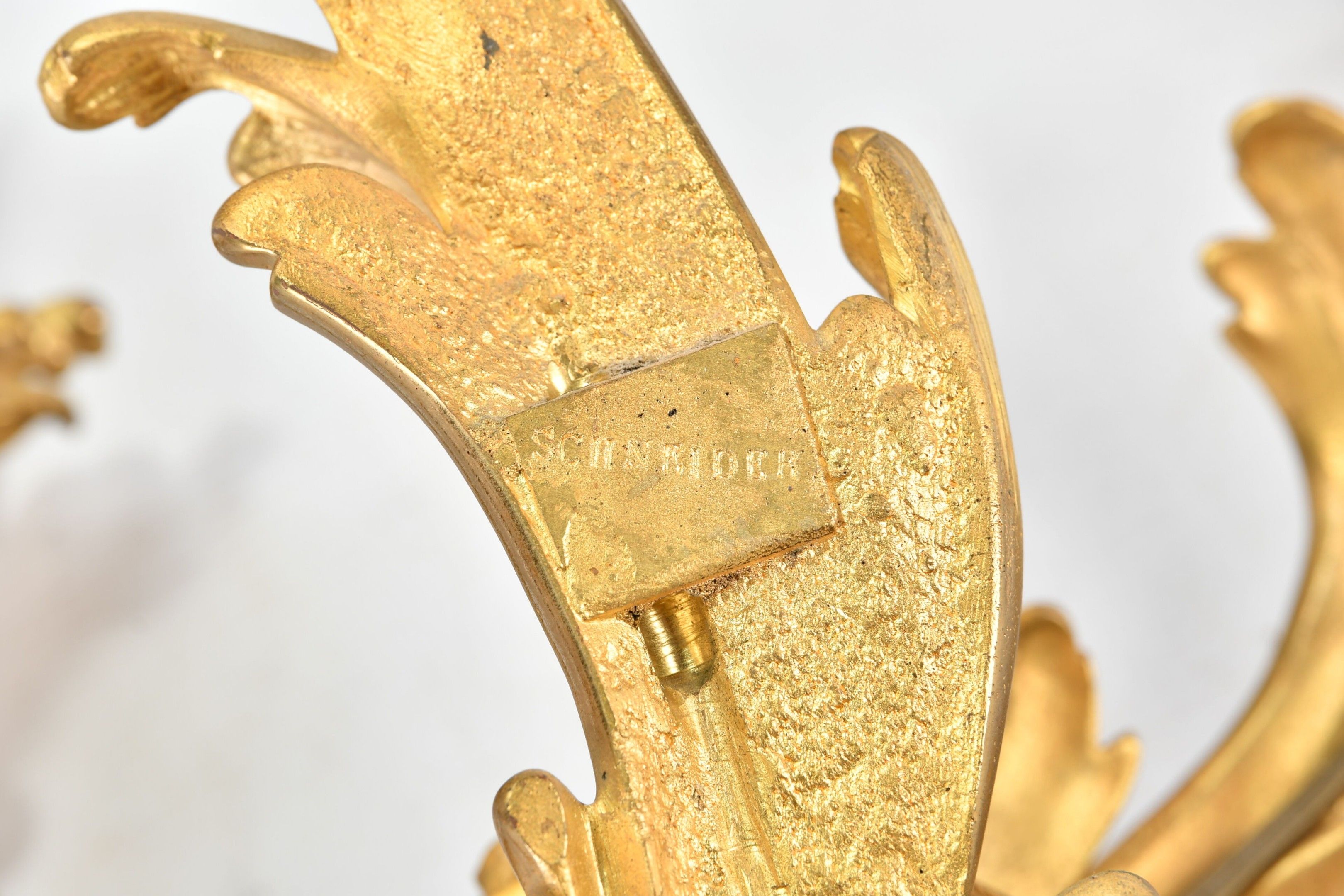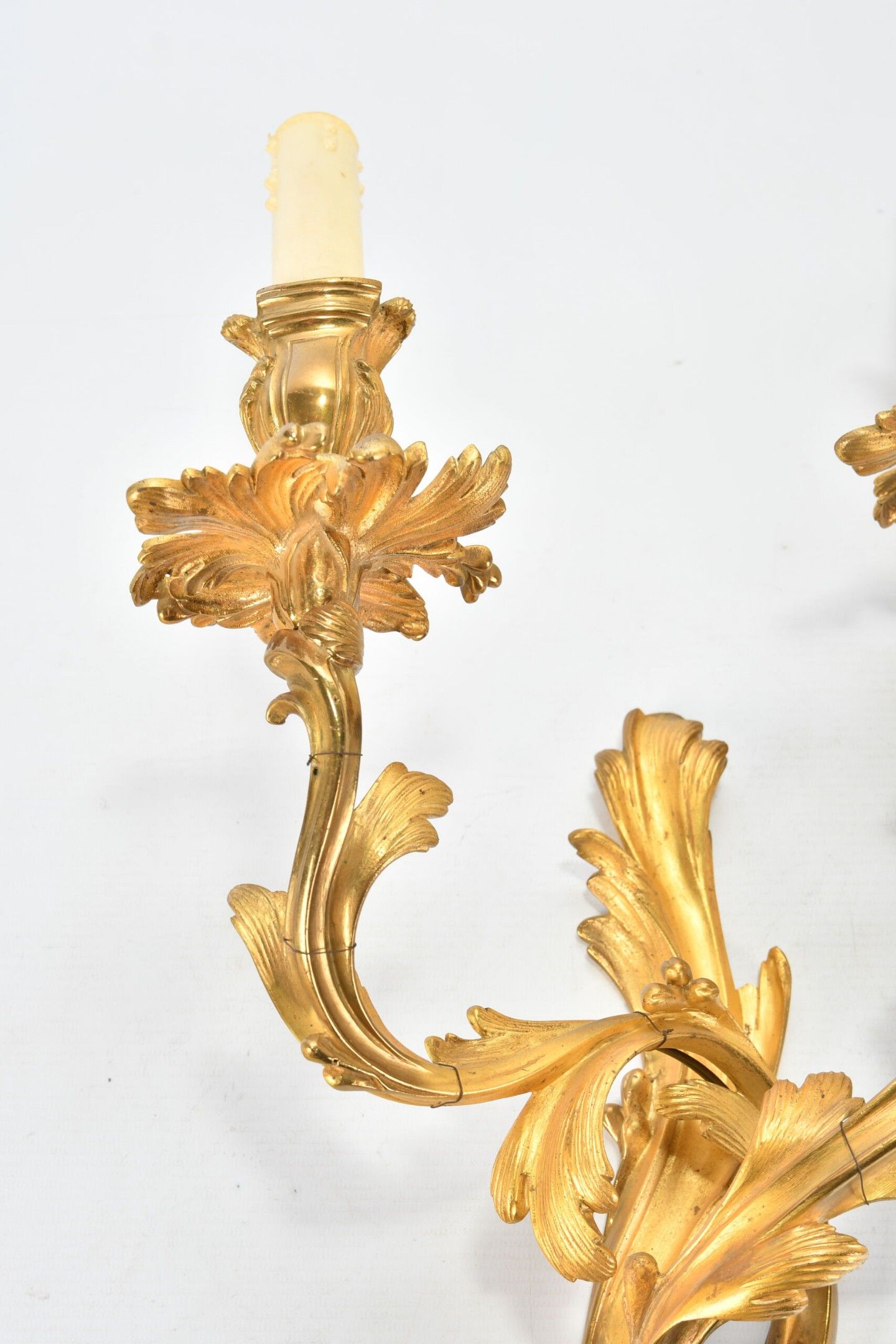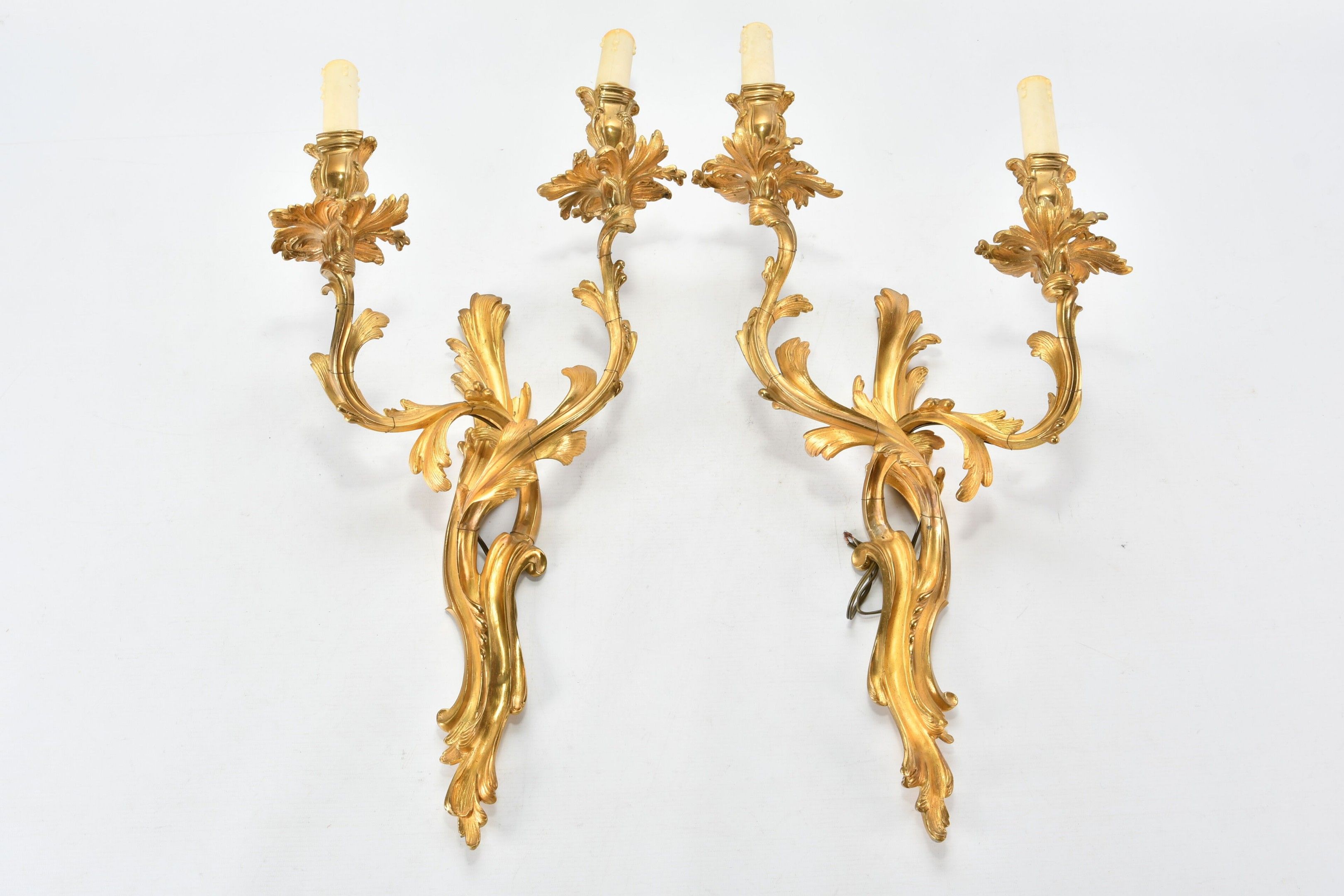 A pair of large ormolu sconces with two lights. Rocaille decoration of foliage. Louis XV style. Signed on the reverse by Schneider. Height 58 cm
