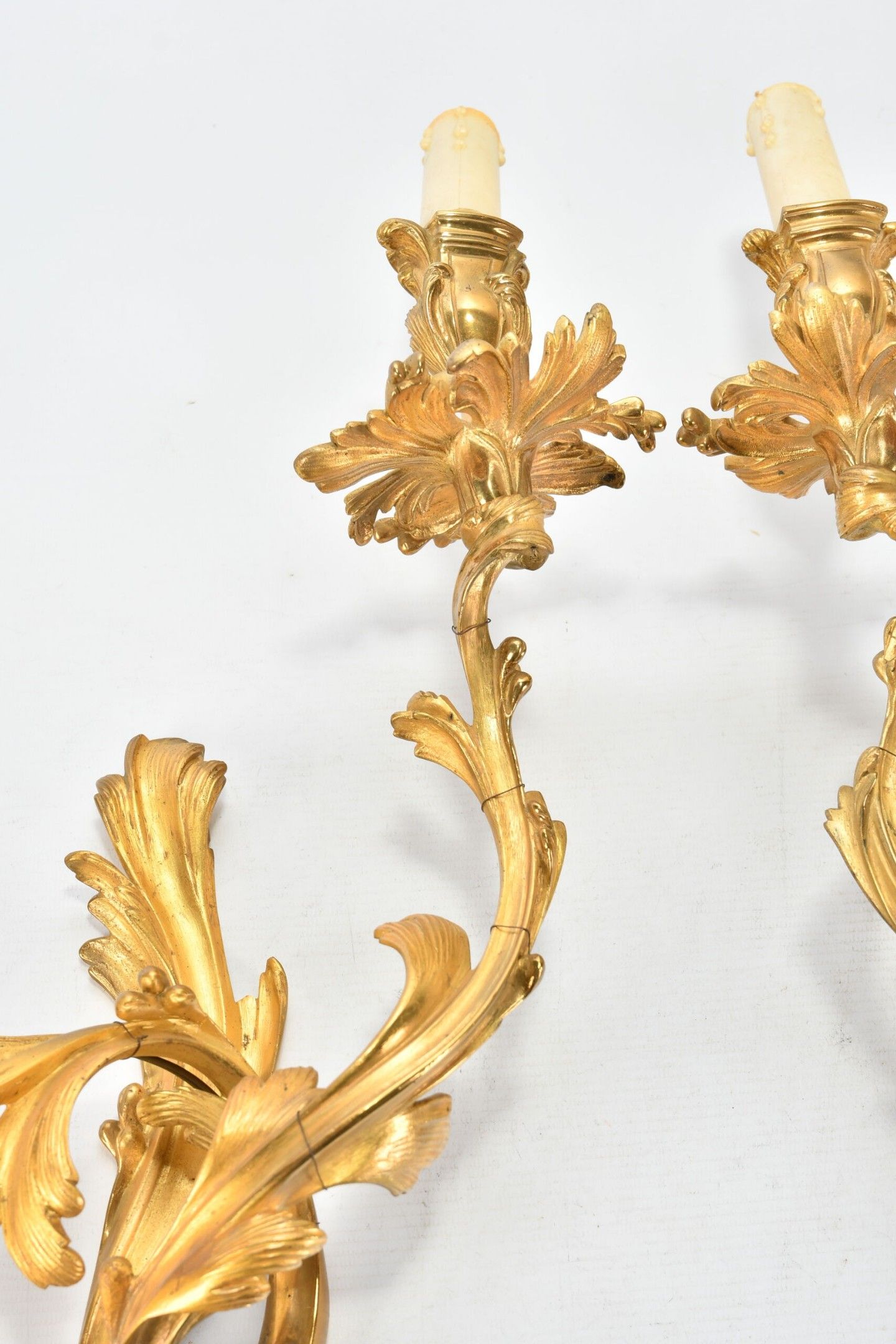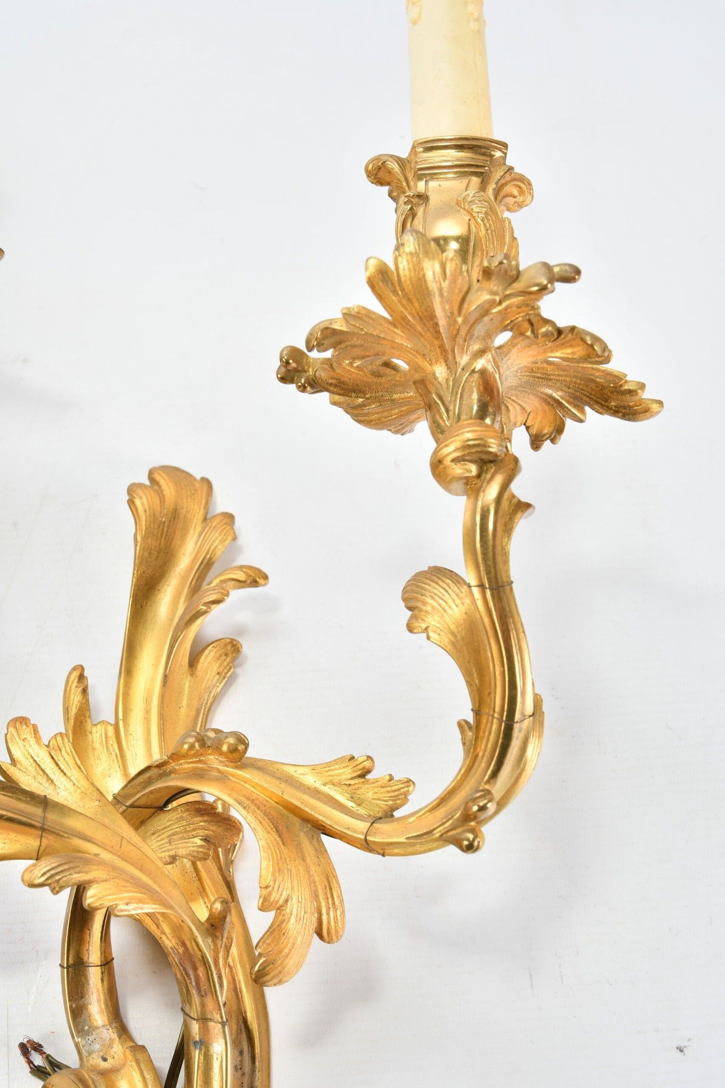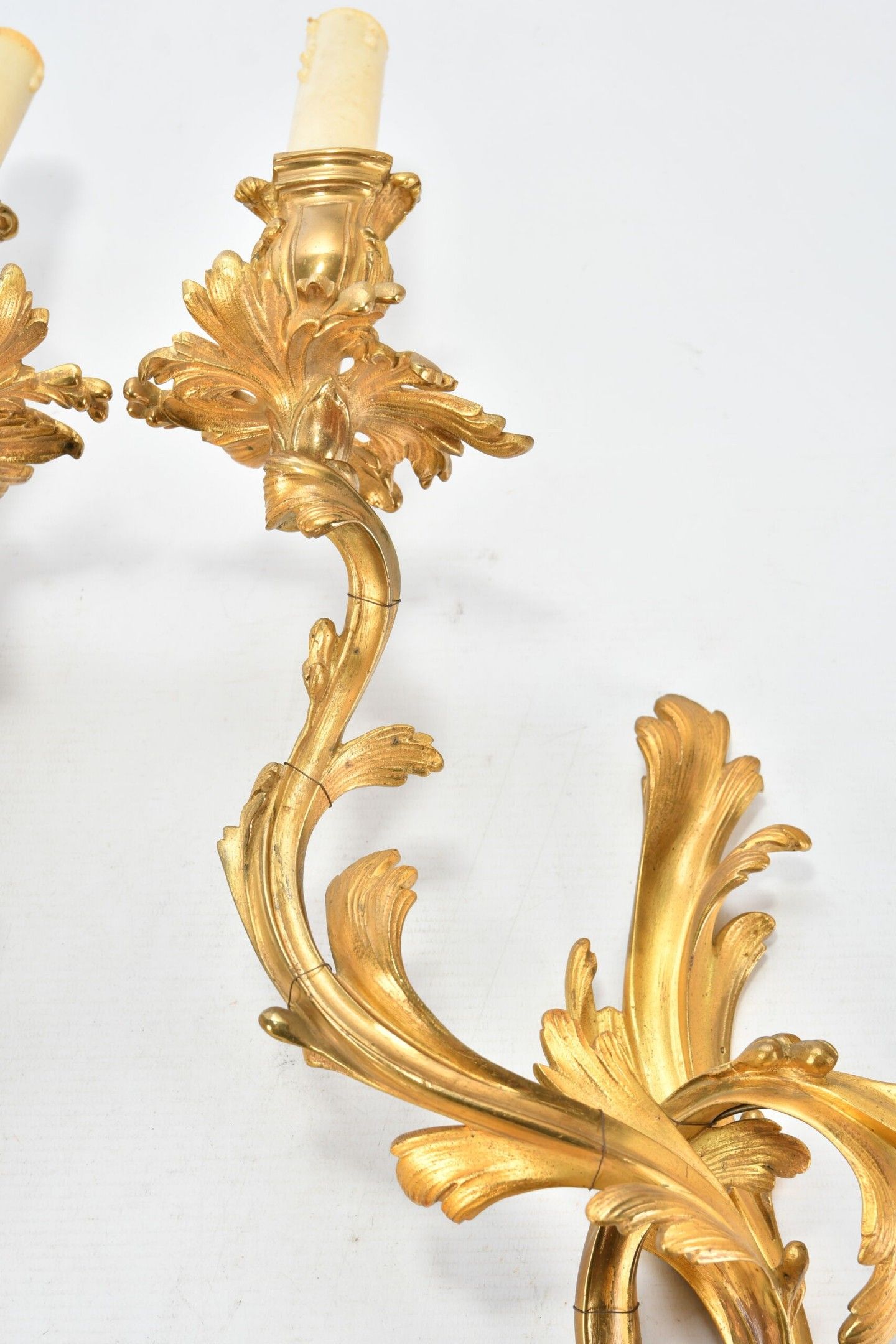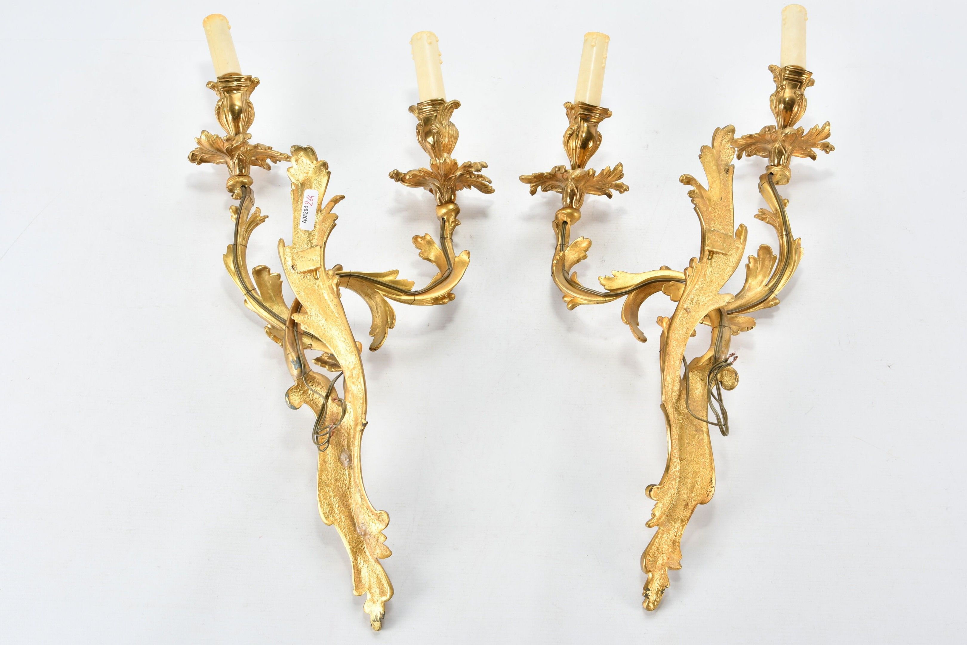 A pair of large ormolu sconces with two lights. Rocaille decoration of foliage. Louis XV style. Signed on the reverse by Schneider. Height 58 cm