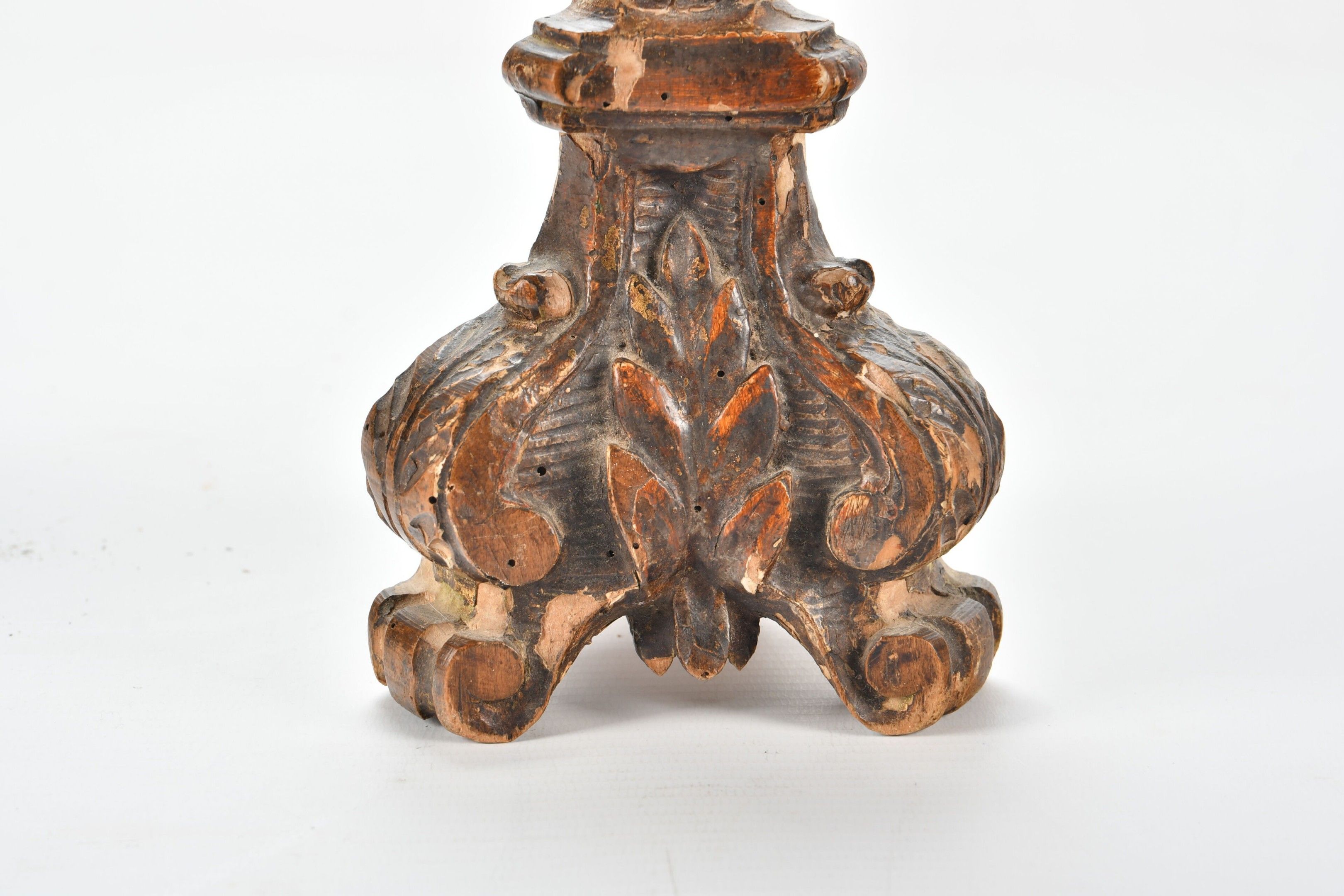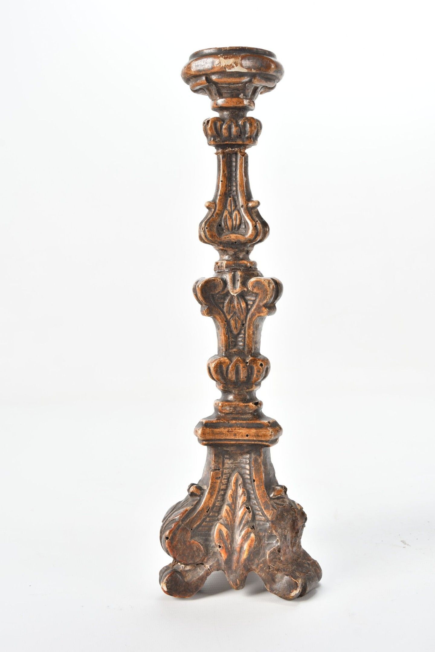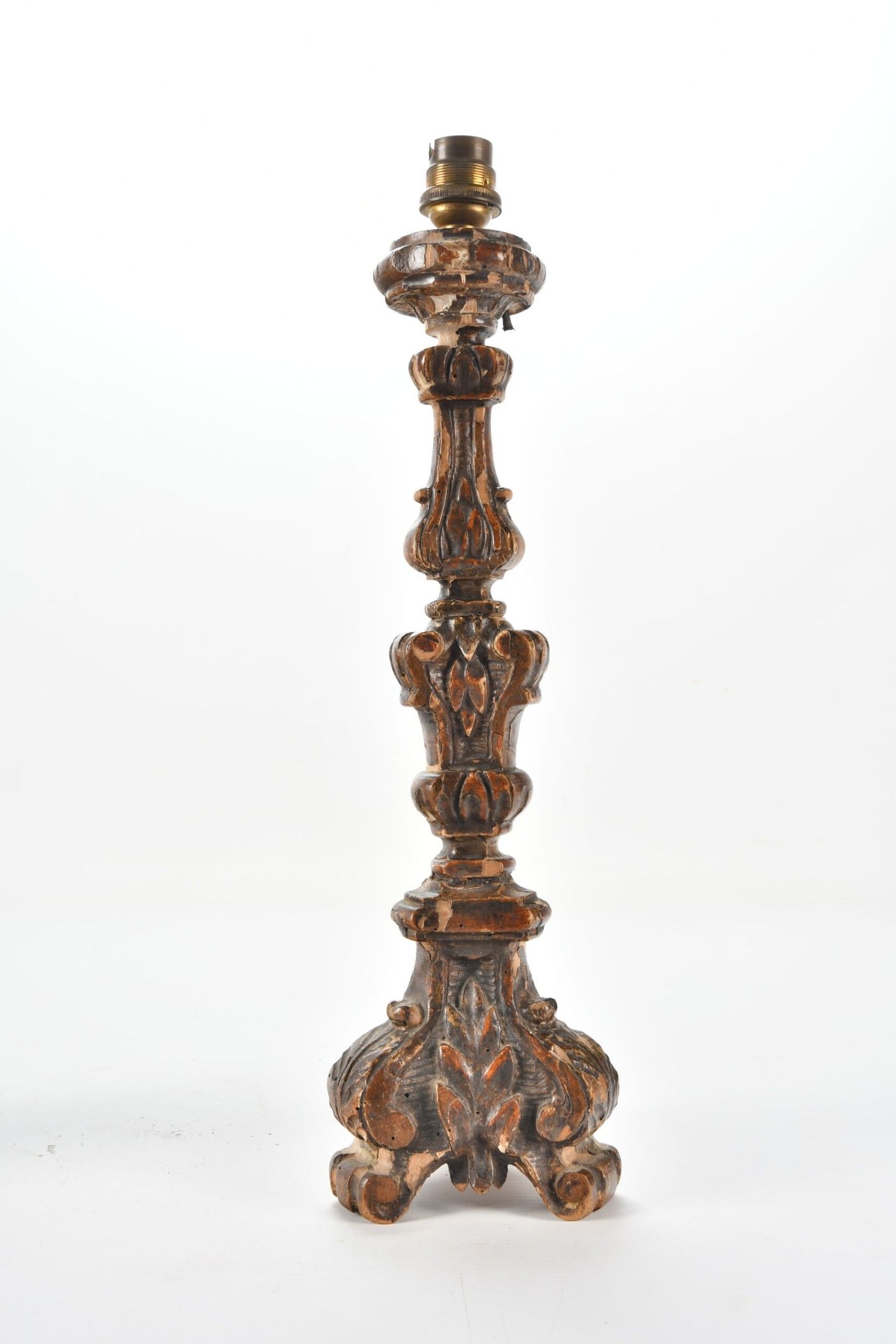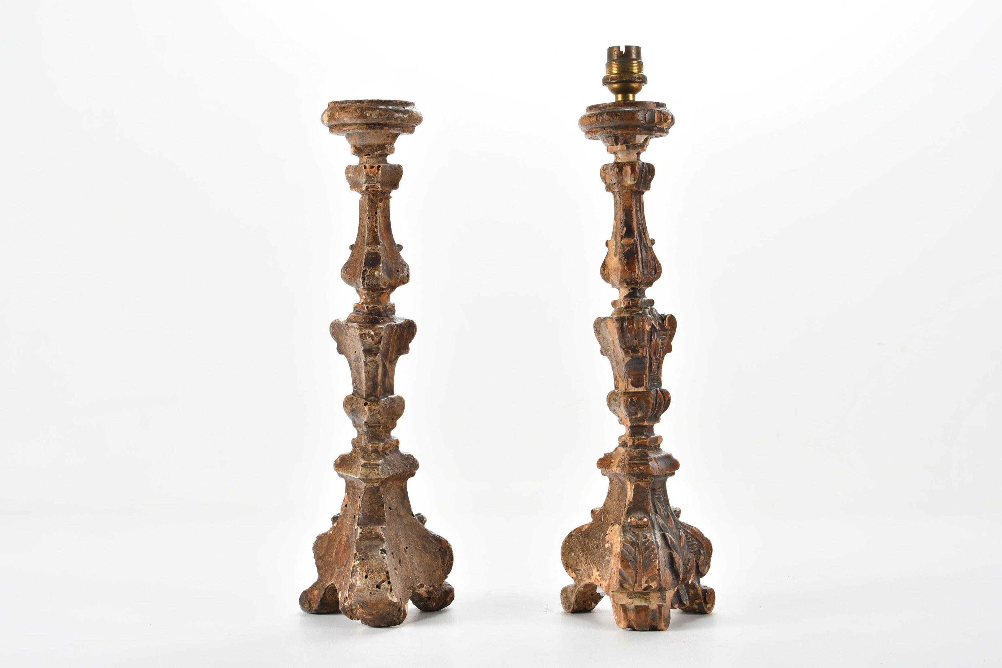 A pair of small carved and gilded wooden candlesticks decorated with scrolls and foliage; the baluster resting on a tripod base with scrolled feet. 17th century. H. 35 cm. one pierced for electrification. Worn and missing gilding