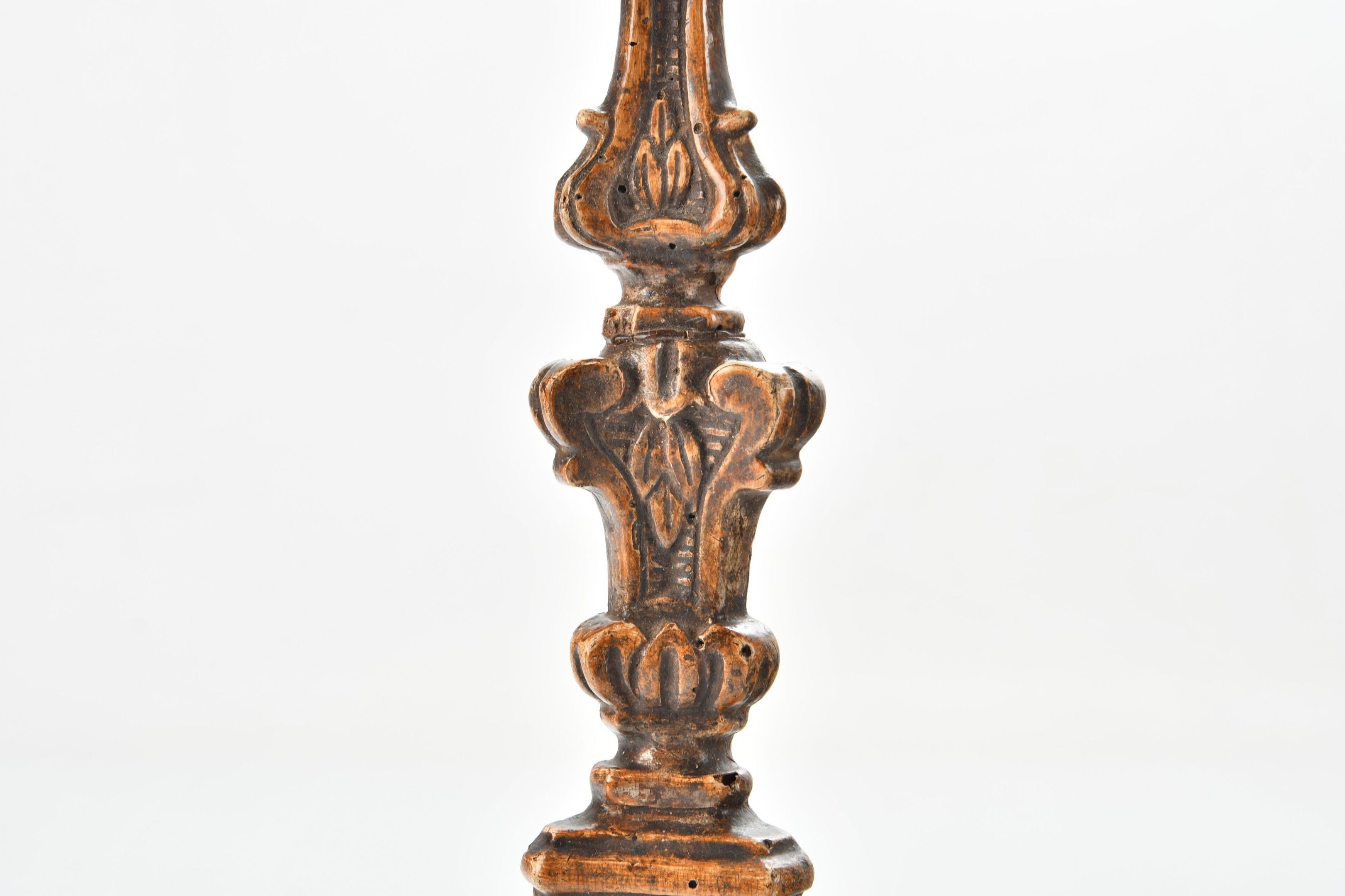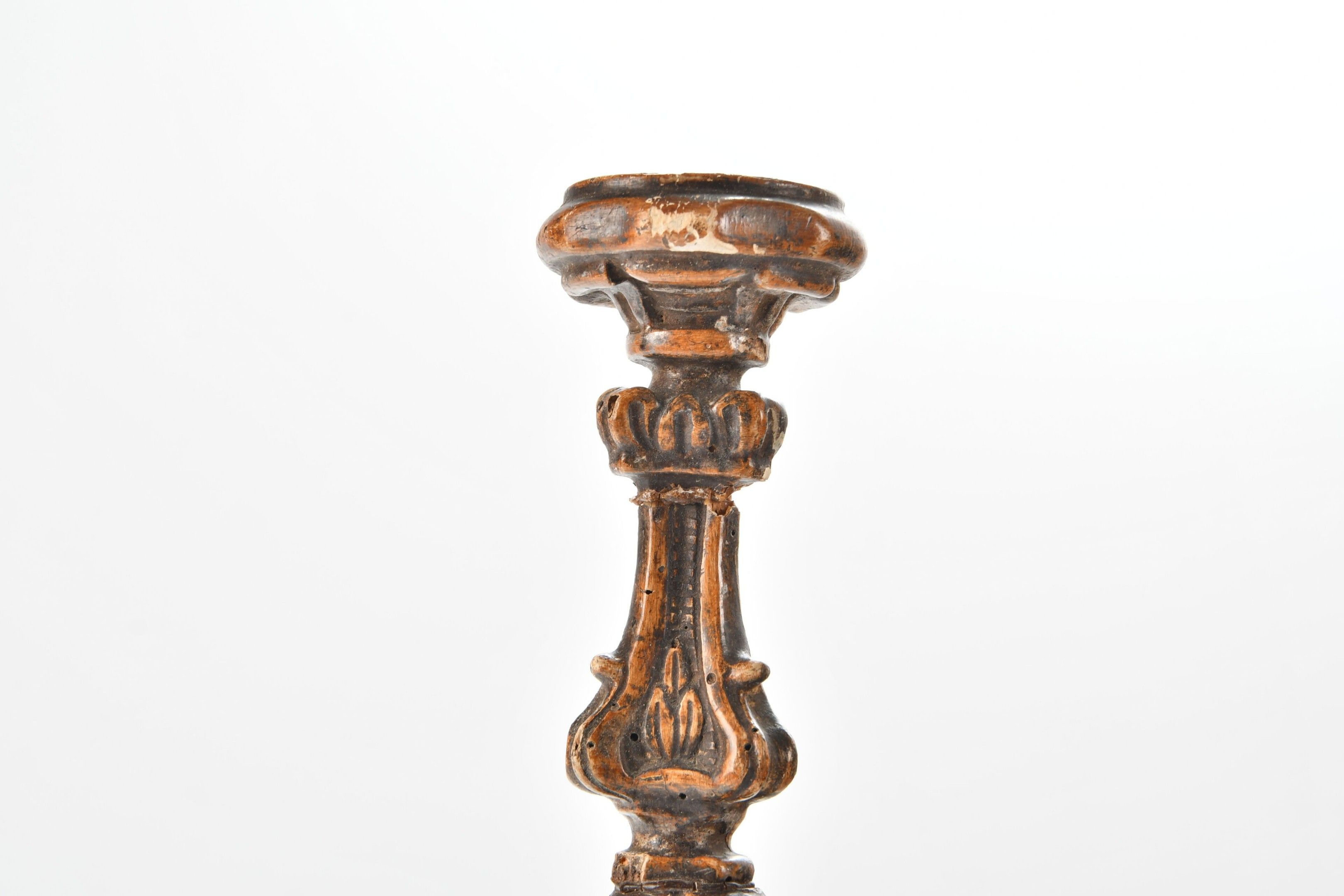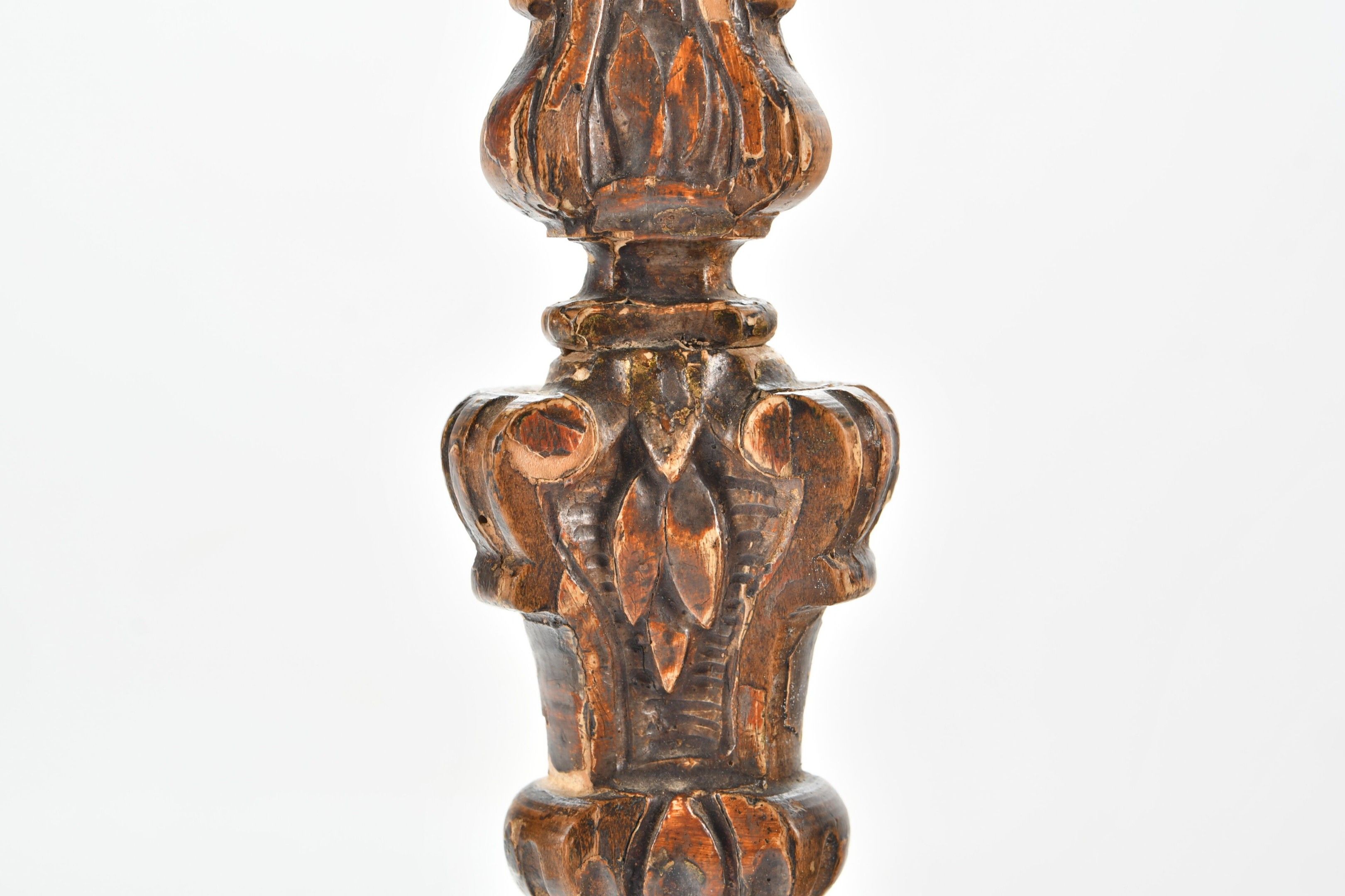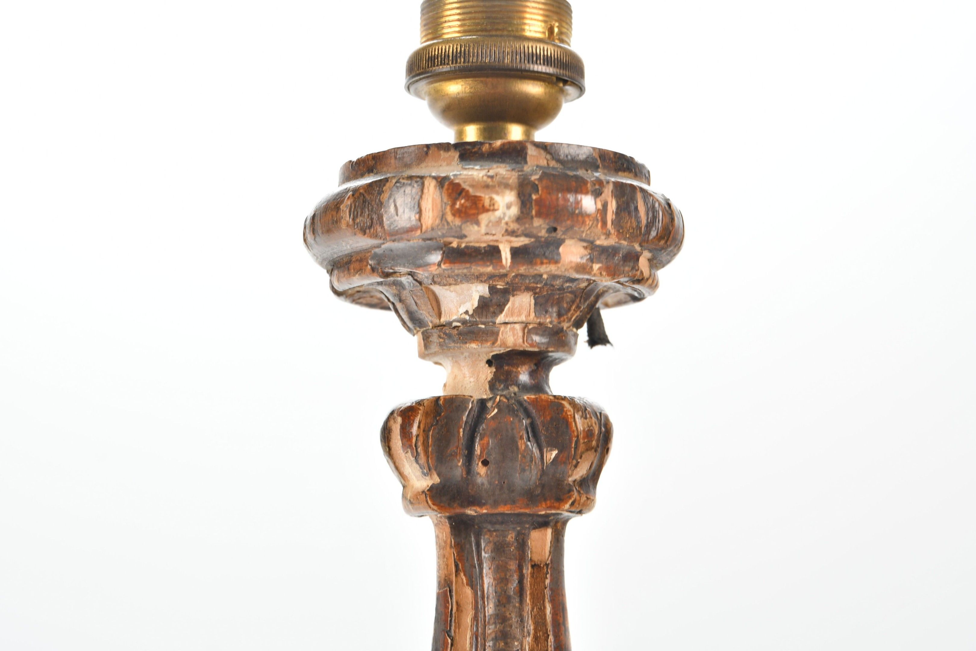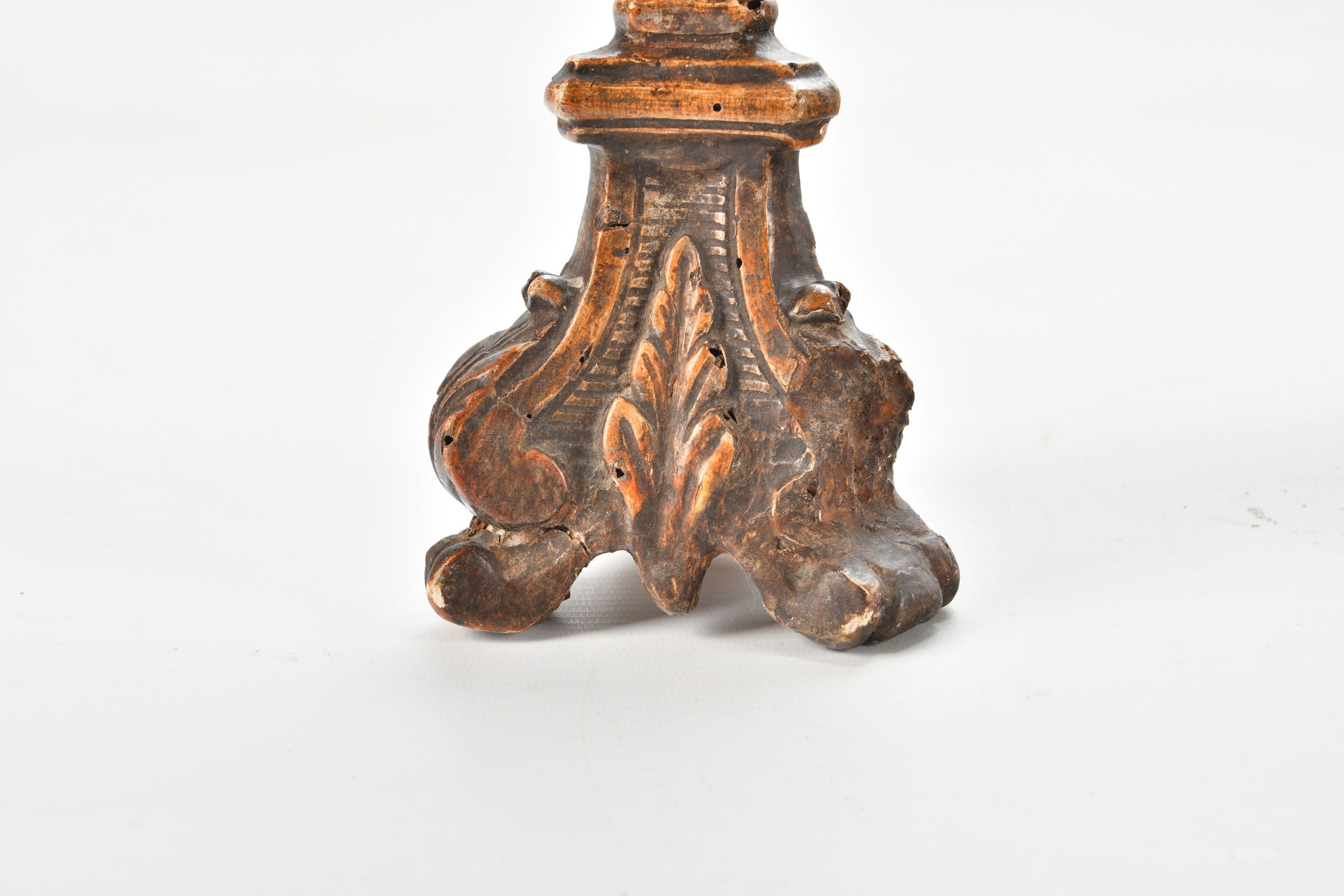 A pair of small carved and gilded wooden candlesticks decorated with scrolls and foliage; the baluster resting on a tripod base with scrolled feet. 17th century. H. 35 cm. one pierced for electrification. Worn and missing gilding