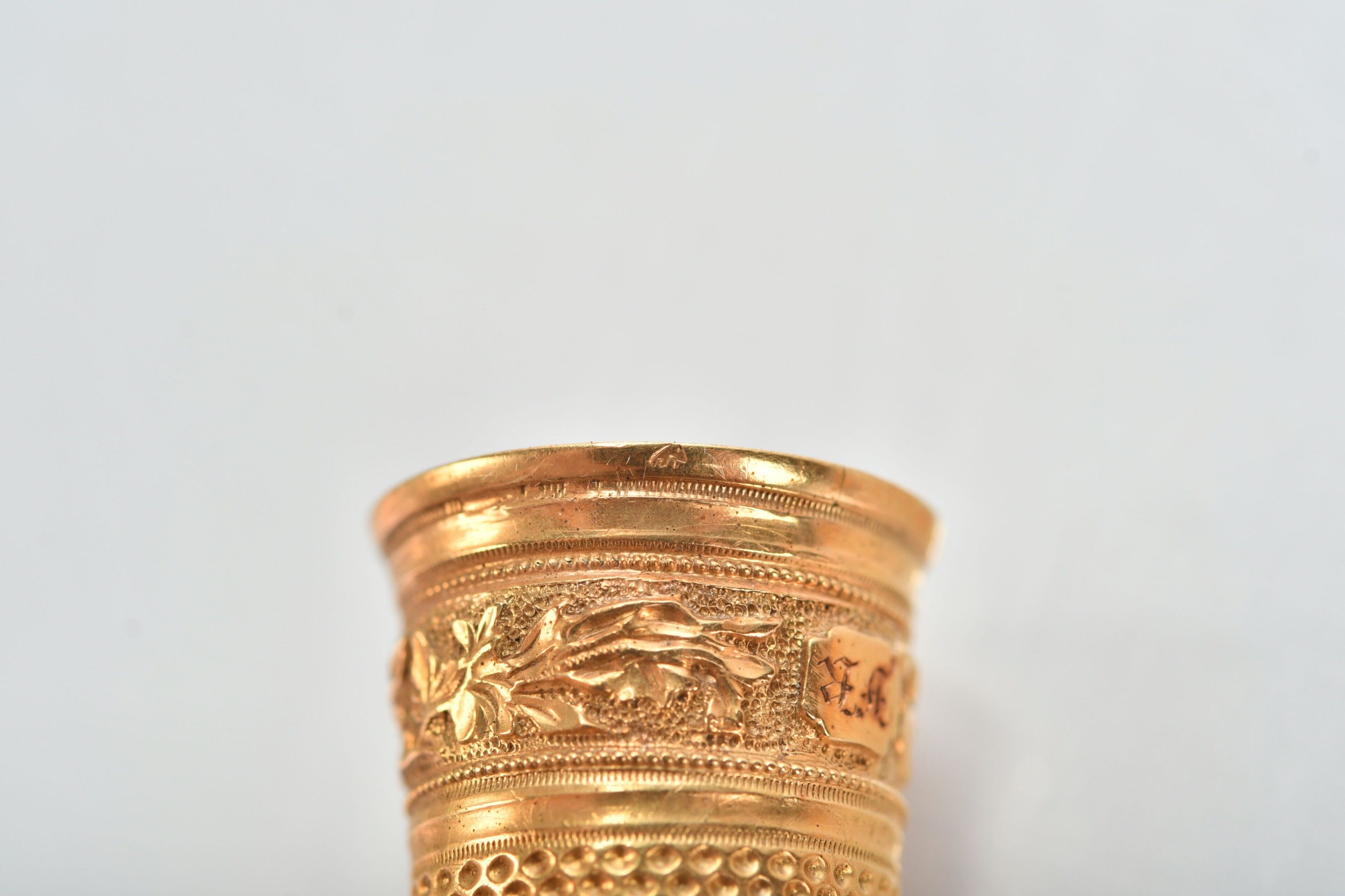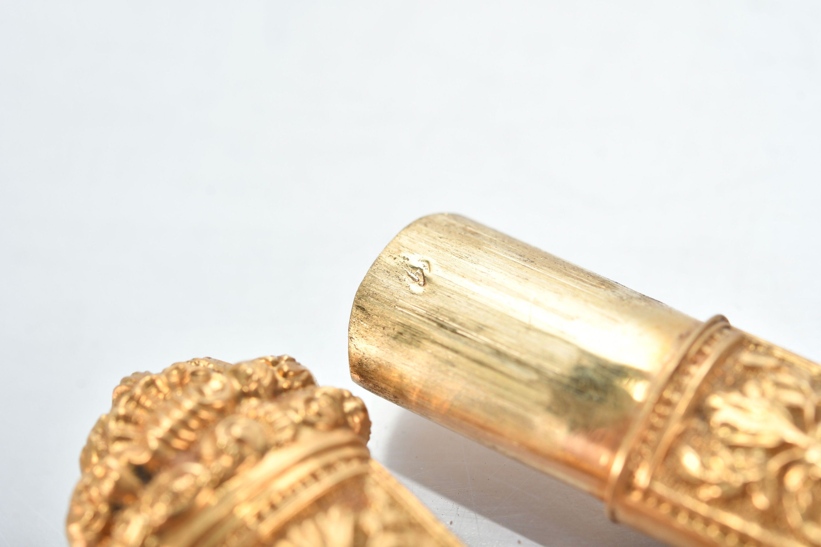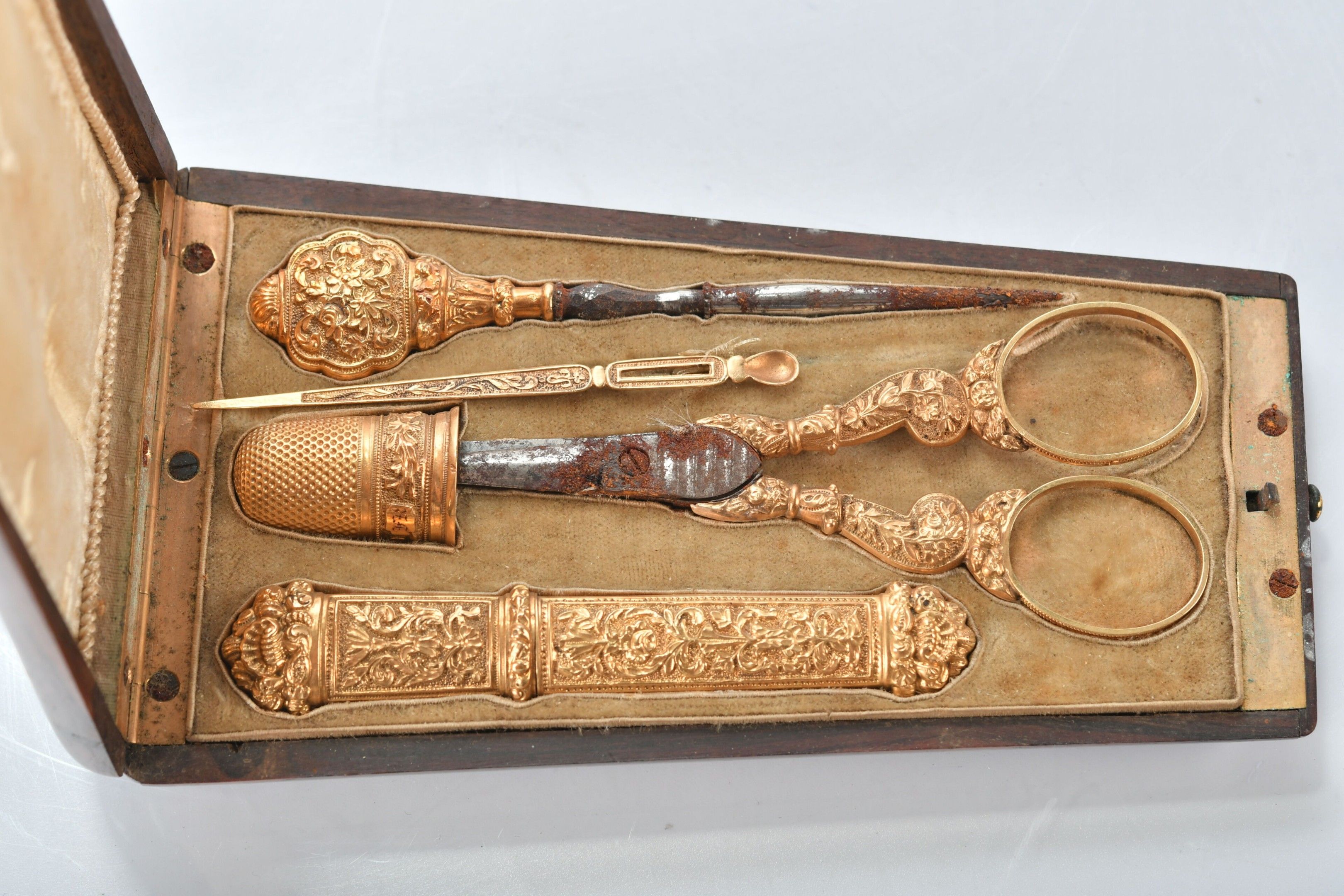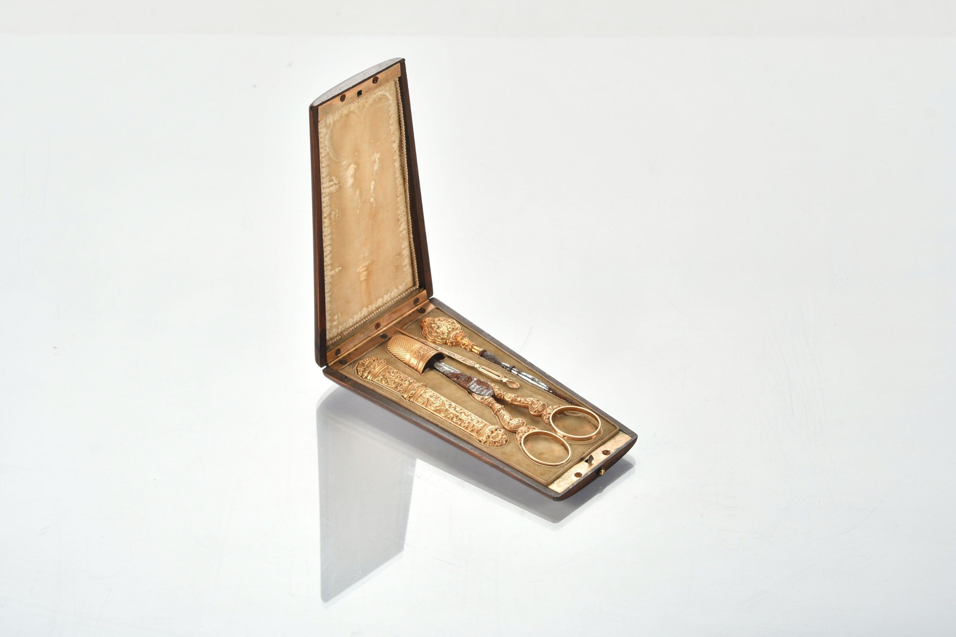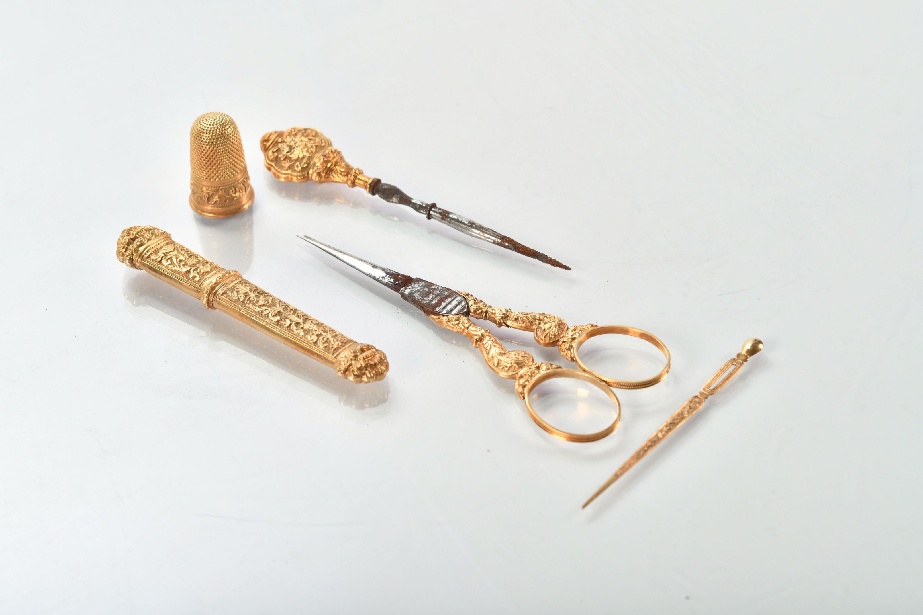 750 thousandth yellow gold SEWING SET in a veneered wooden case comprising: needle case; thimble; pair of scissors; punch and thread-pass. Small guarantee hallmark for Paris 1809-1819. Weight of the gold pieces: 12.1 g - Gross weight of the pair of scissors and punch: 17.6 g. (Oxidation)