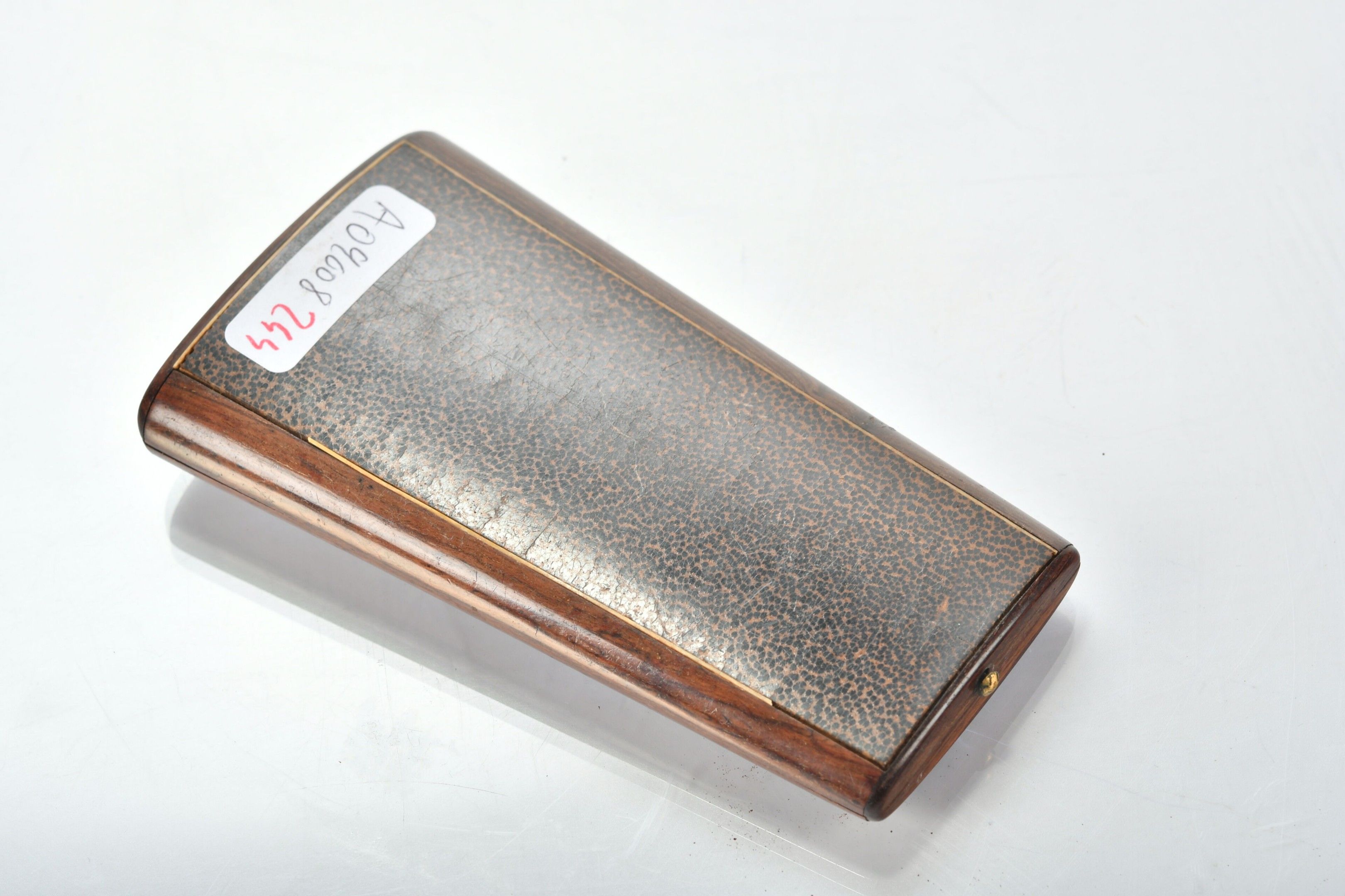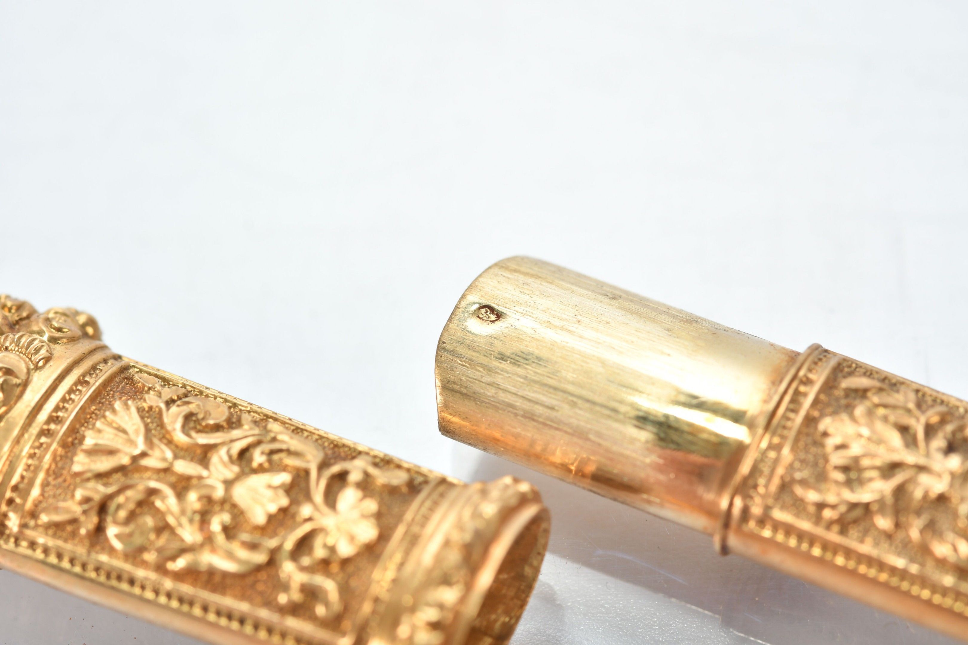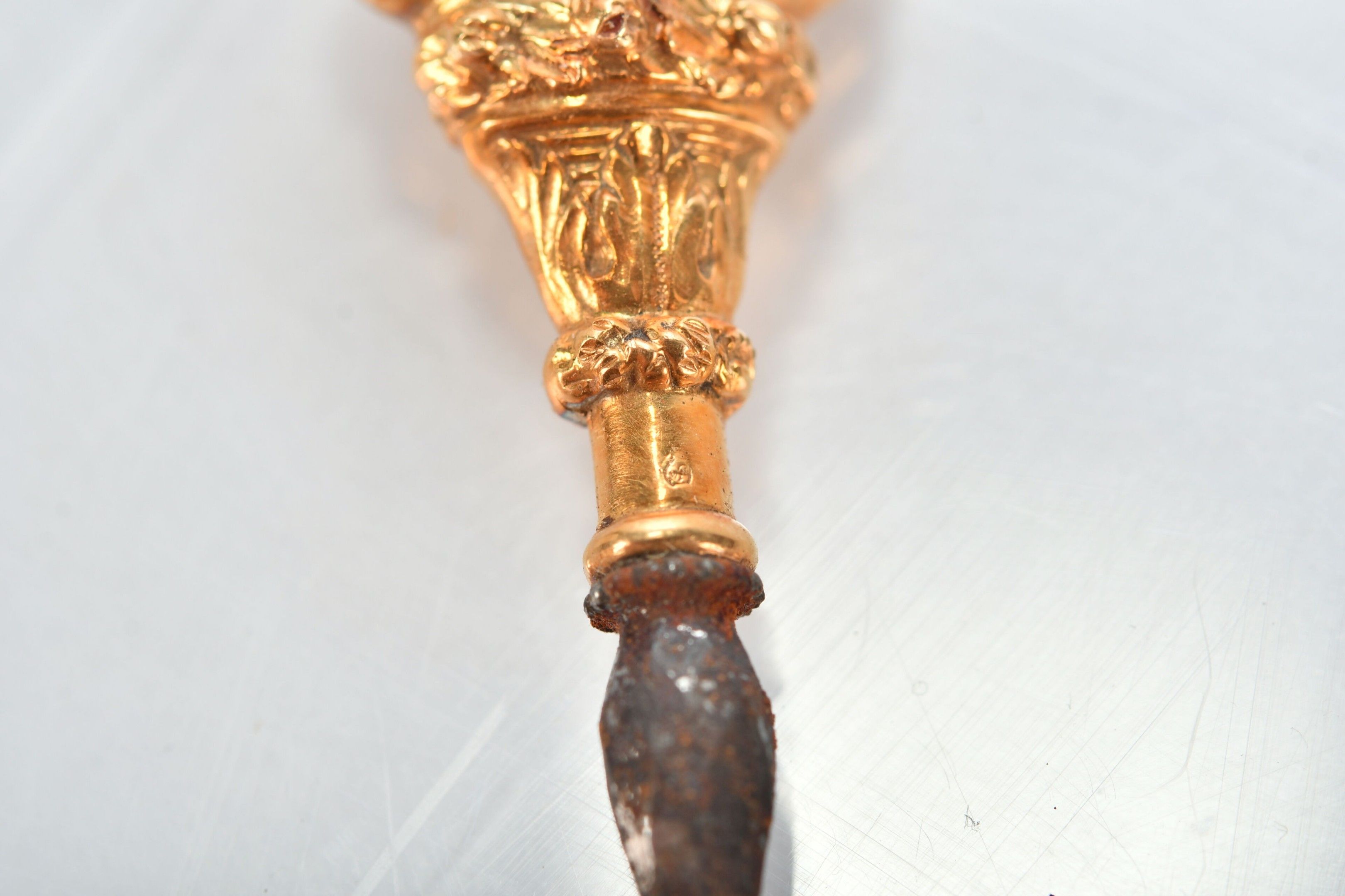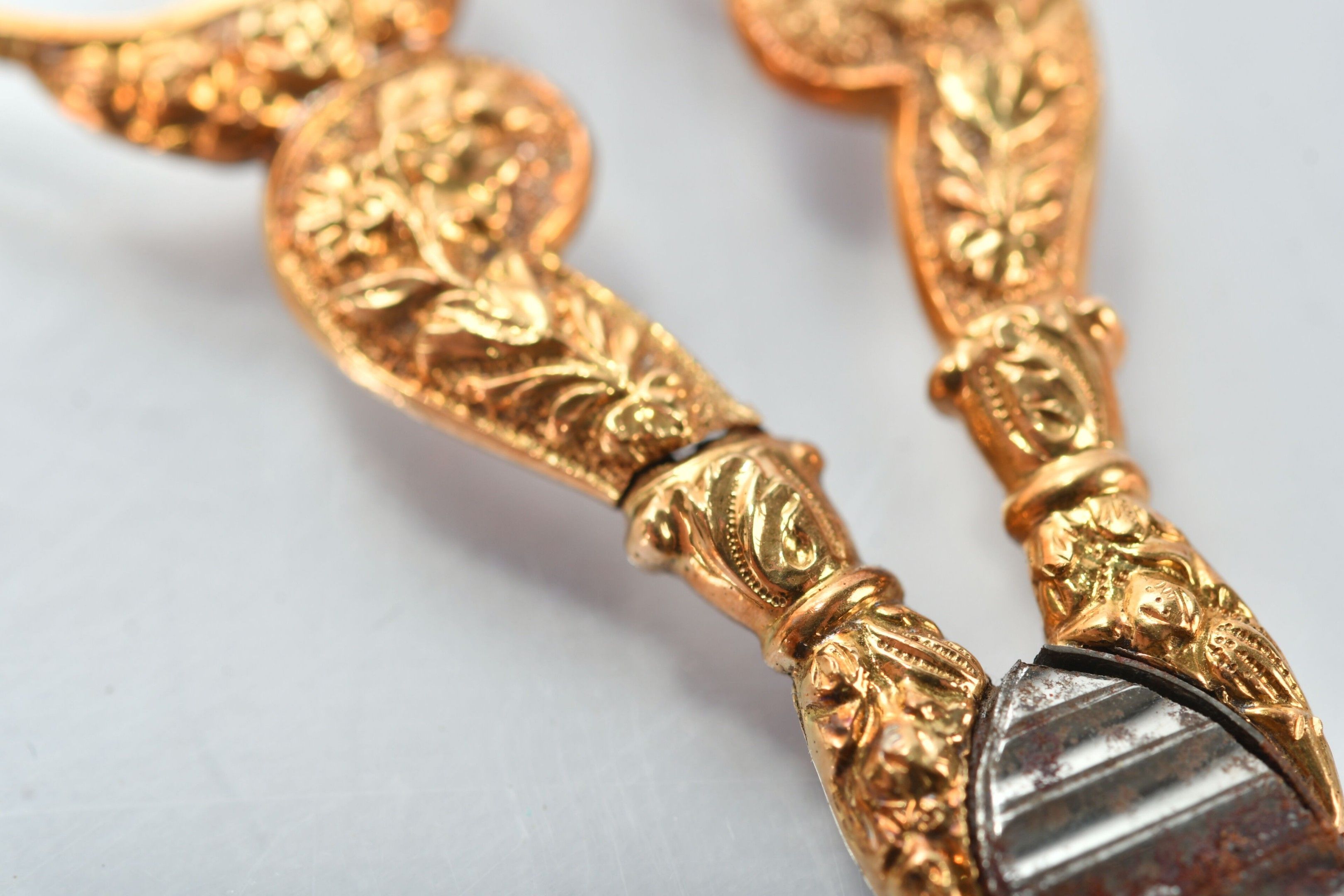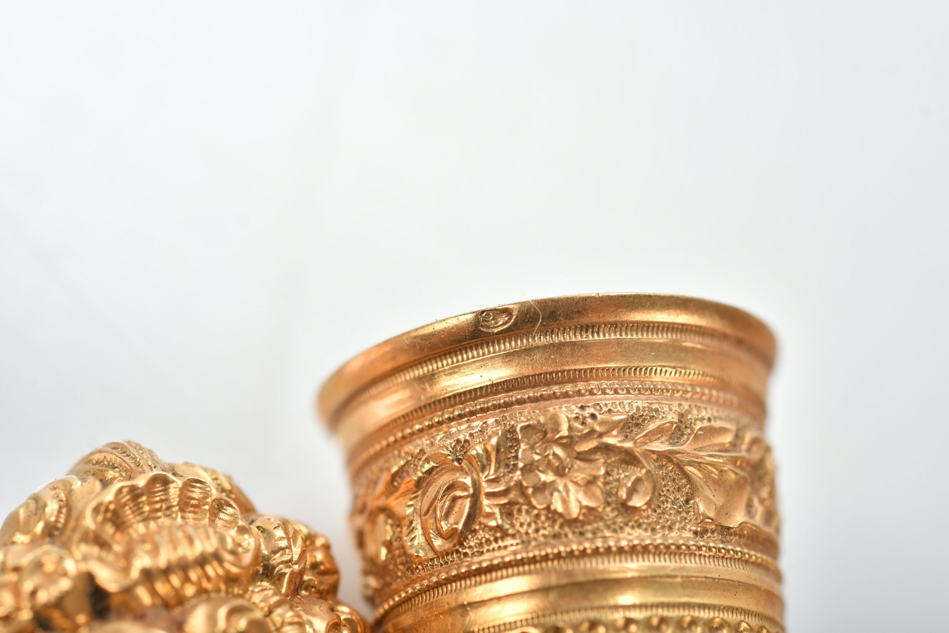 750 thousandth yellow gold SEWING SET in a veneered wooden case comprising: needle case; thimble; pair of scissors; punch and thread-pass. Small guarantee hallmark for Paris 1809-1819. Weight of the gold pieces: 12.1 g - Gross weight of the pair of scissors and punch: 17.6 g. (Oxidation)