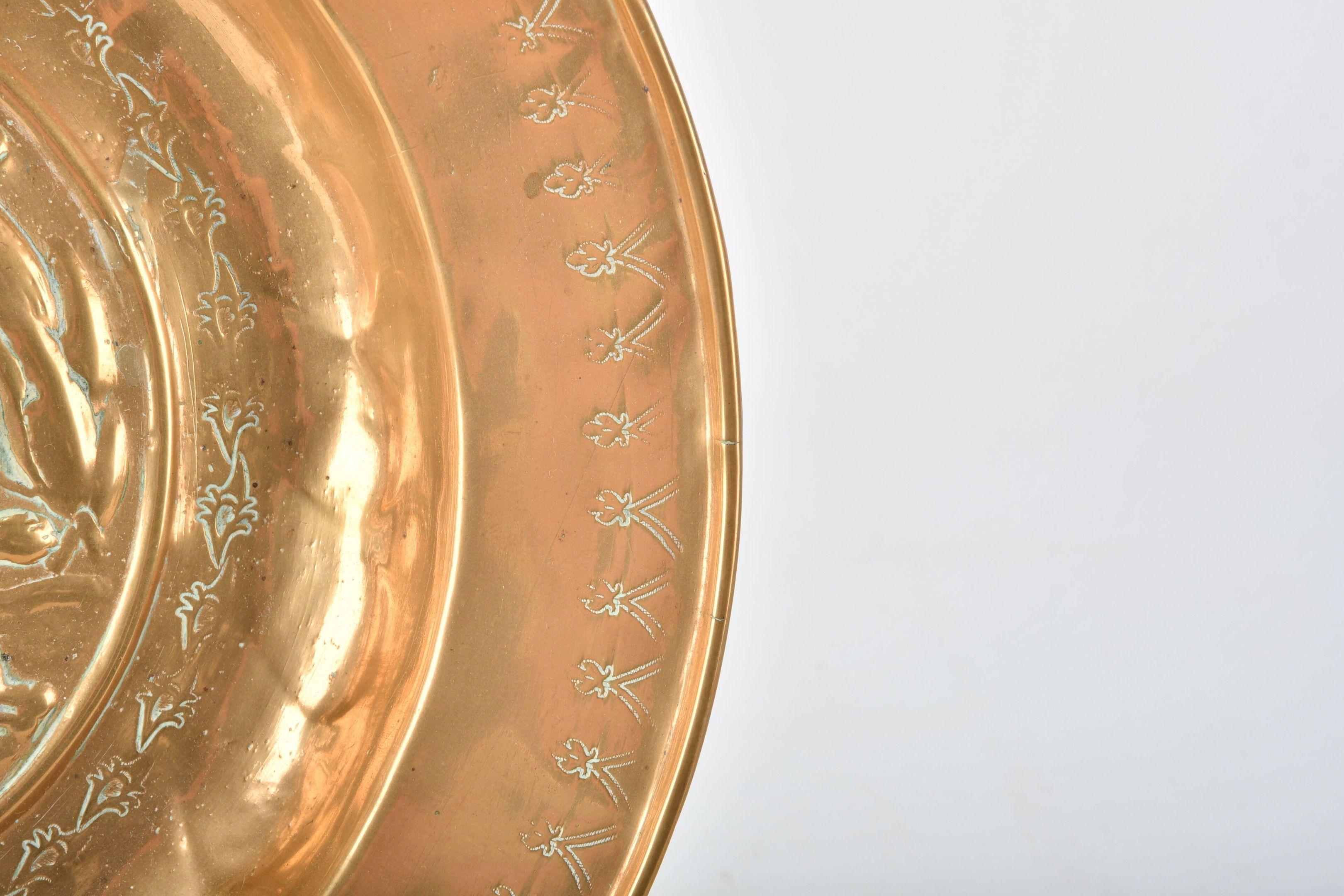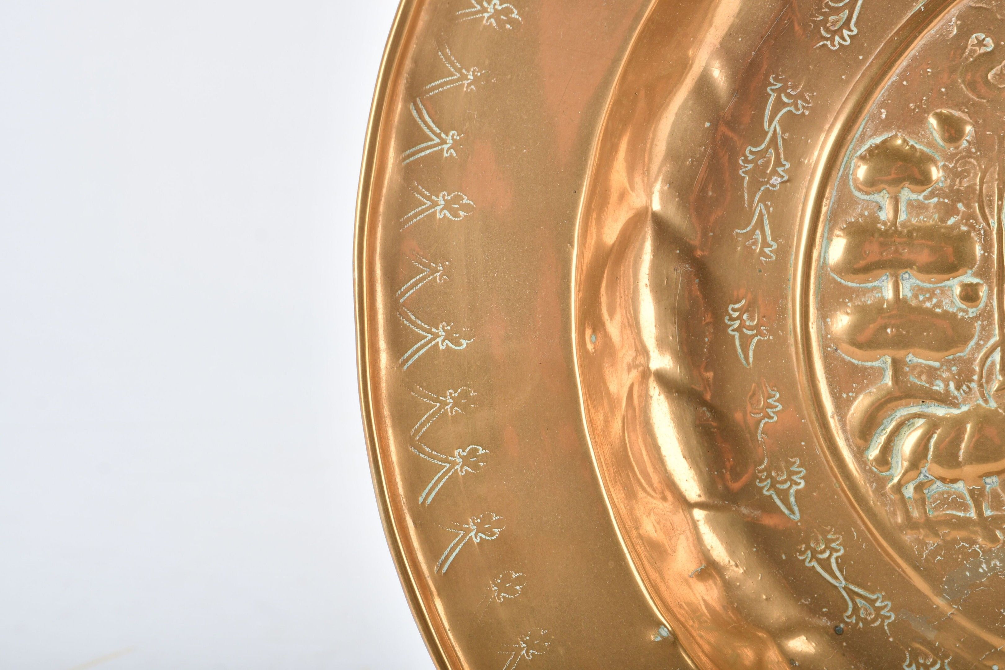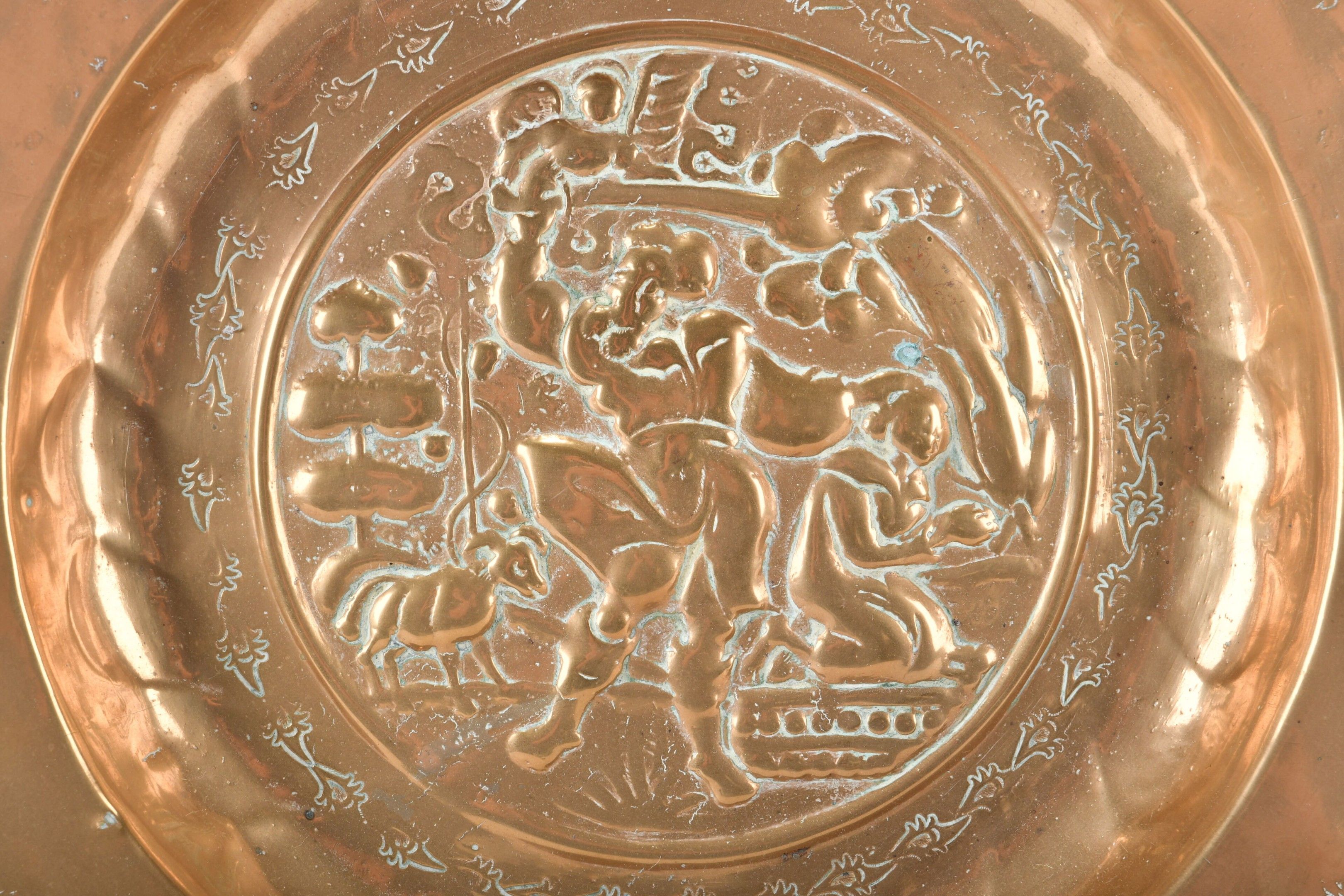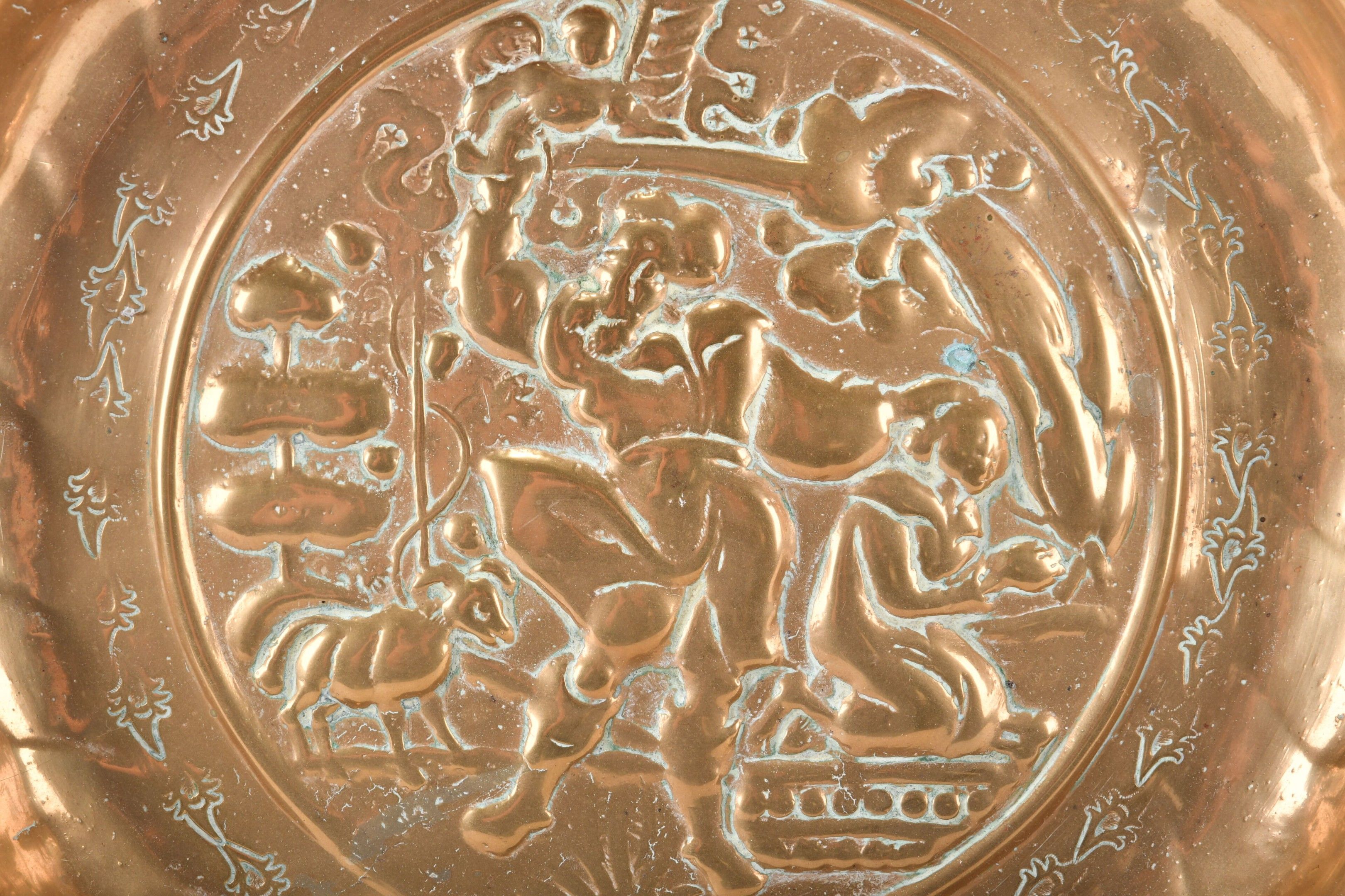 A circular copper offering dish with repoussé decoration of the sacrifice of Isaac in a medallion in the centre and stamped ornamentation in reserve and on the edge of the wing. 17th century. Diameter 39 cm. A few knocks