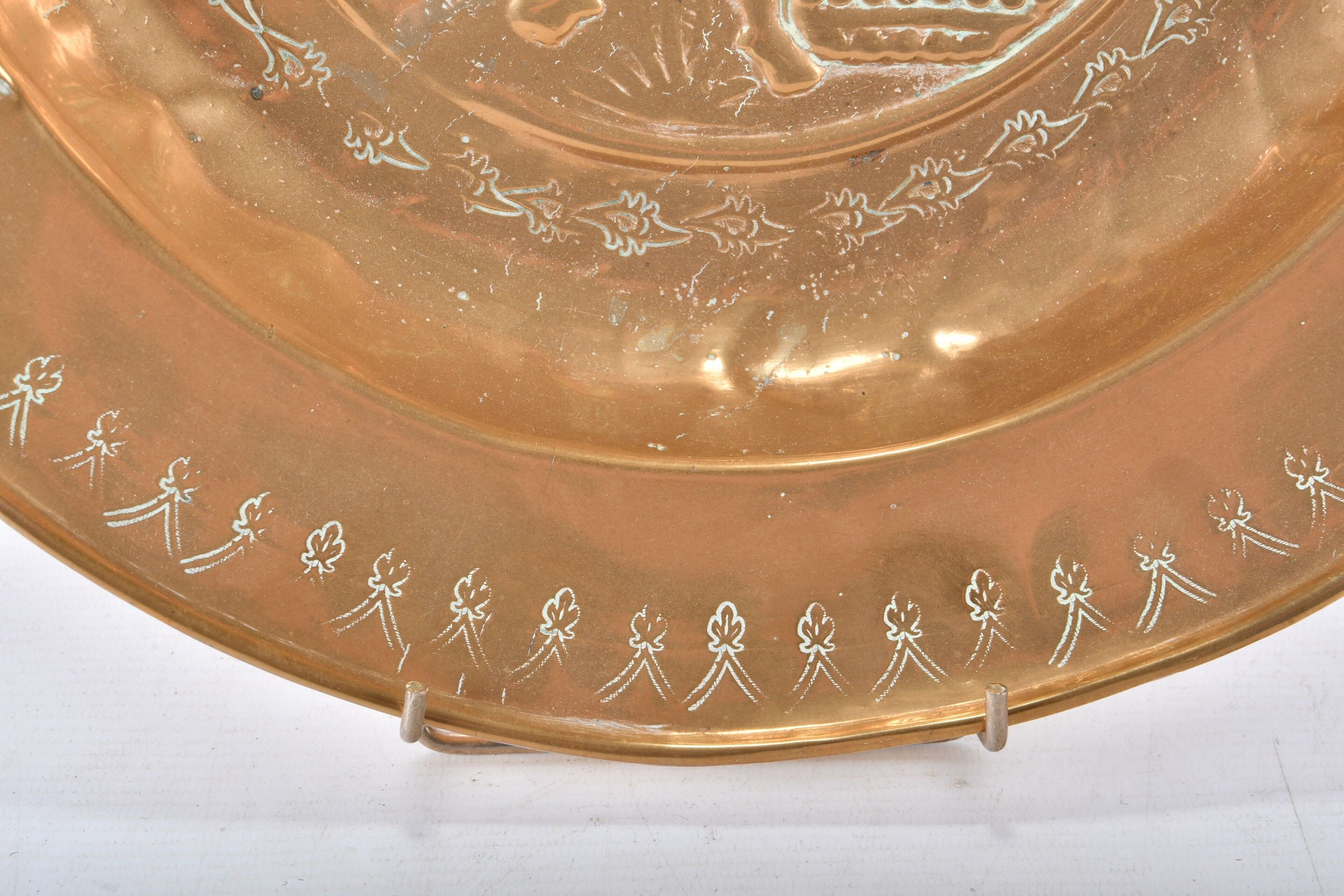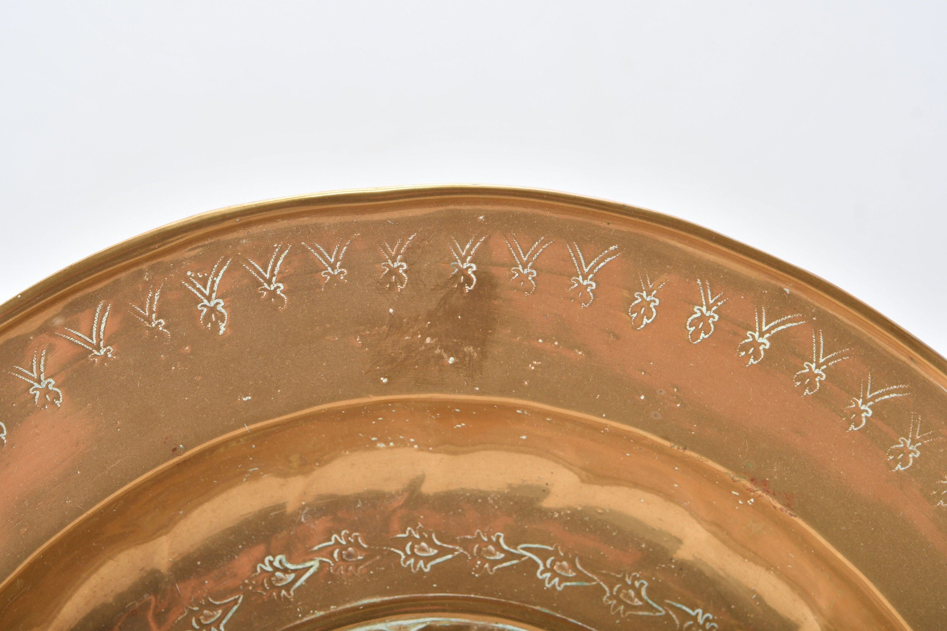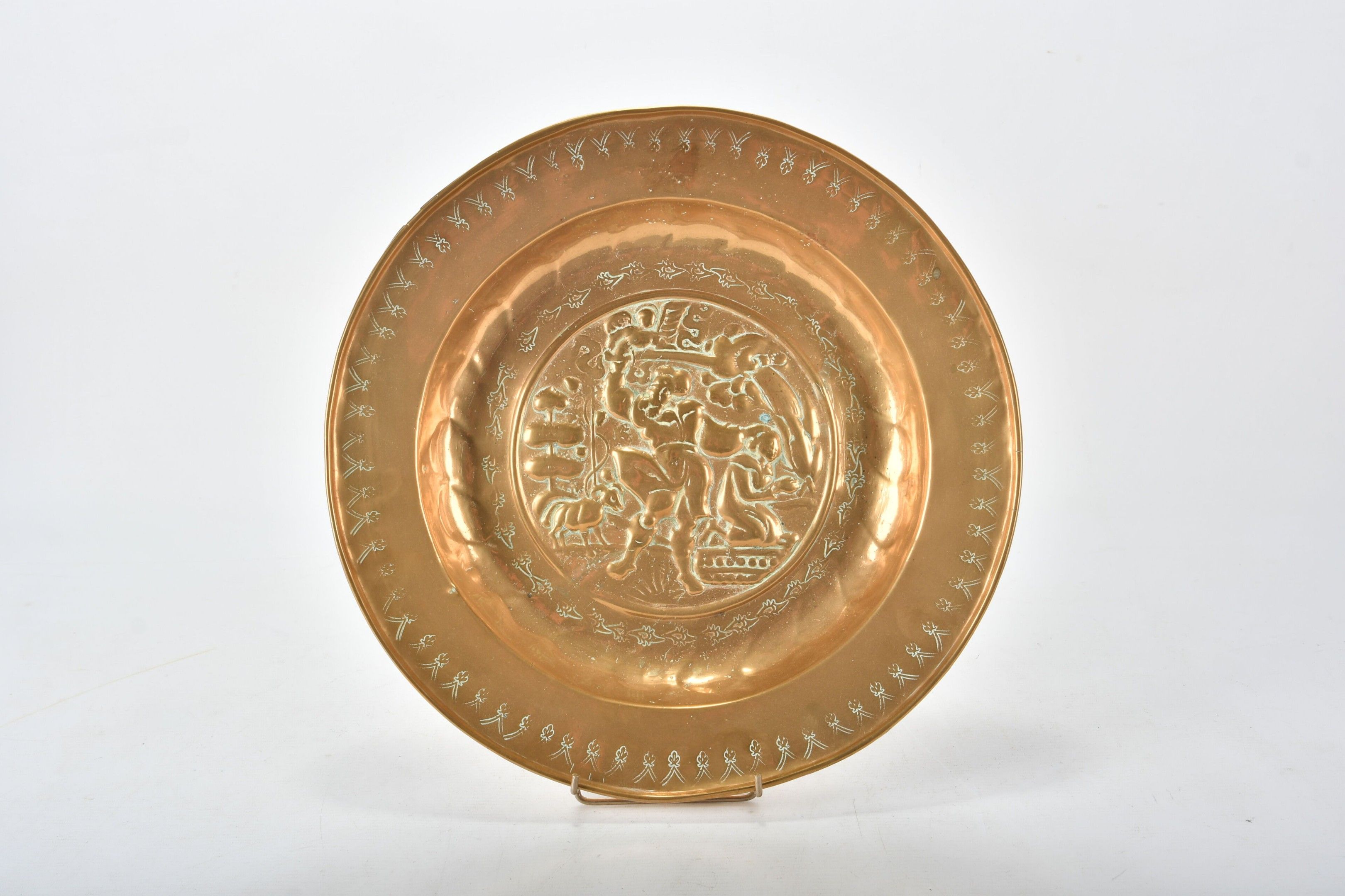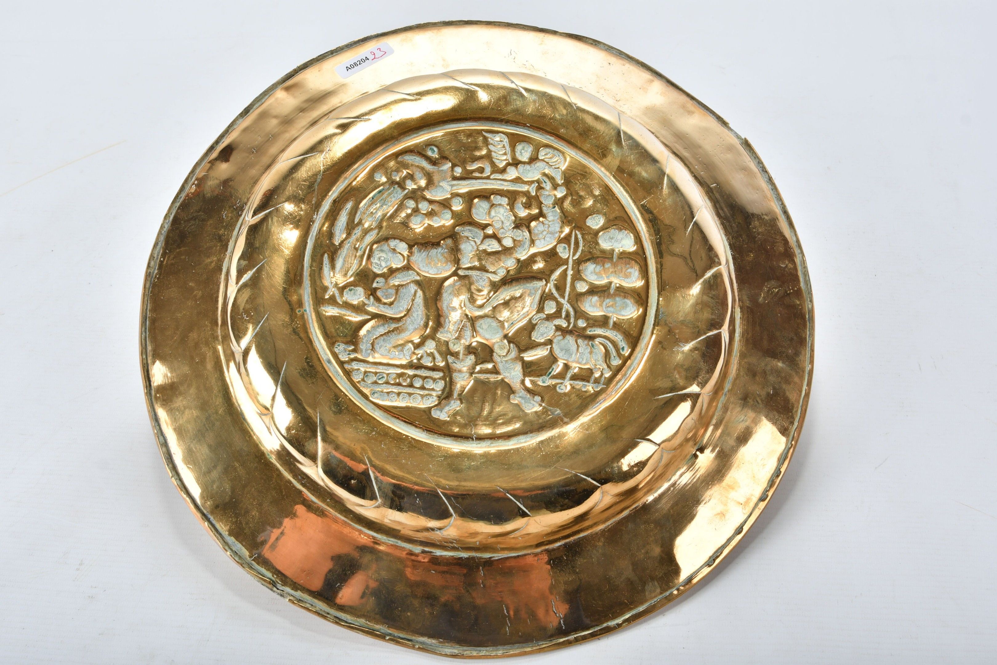 A circular copper offering dish with repoussé decoration of the sacrifice of Isaac in a medallion in the centre and stamped ornamentation in reserve and on the edge of the wing. 17th century. Diameter 39 cm. A few knocks