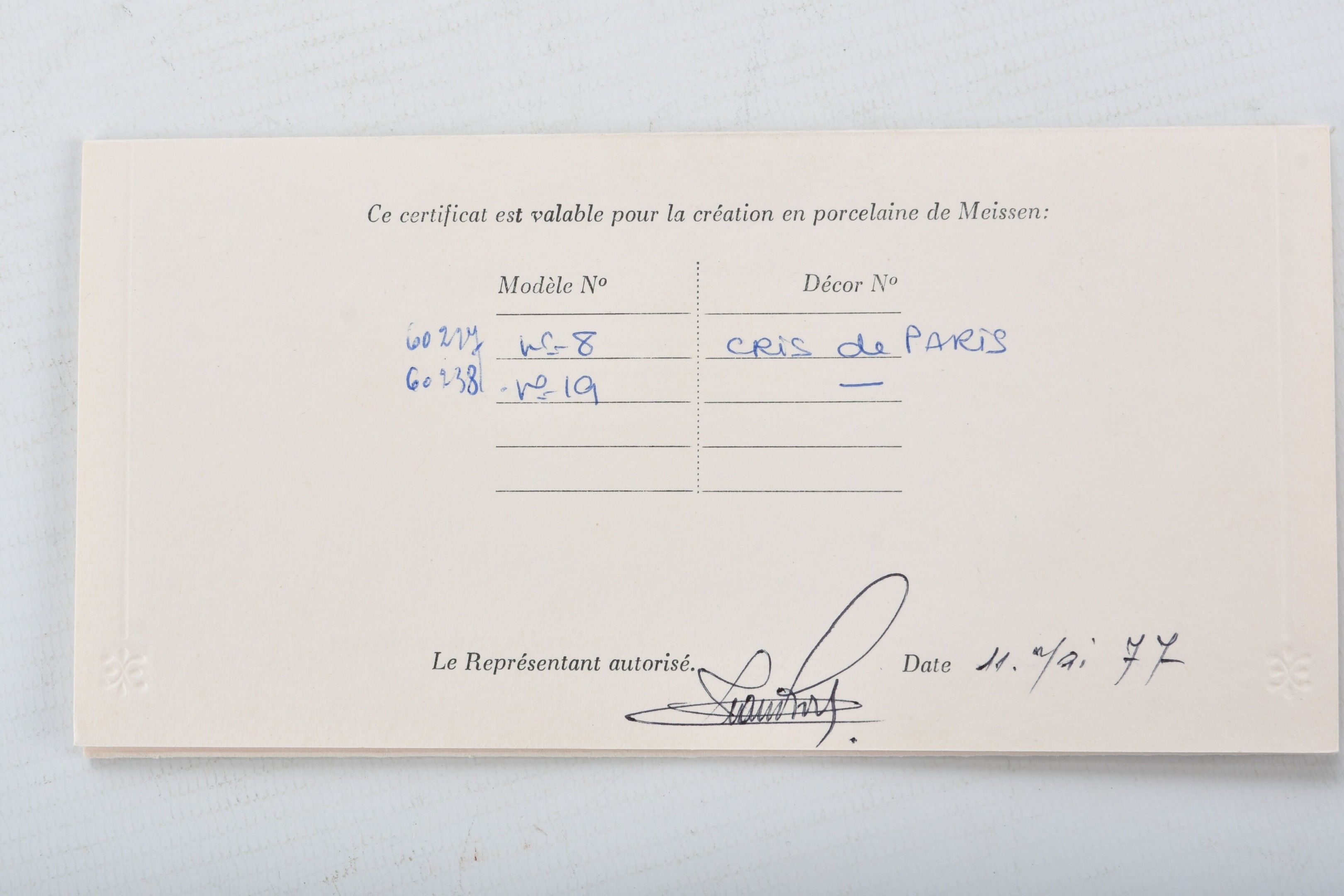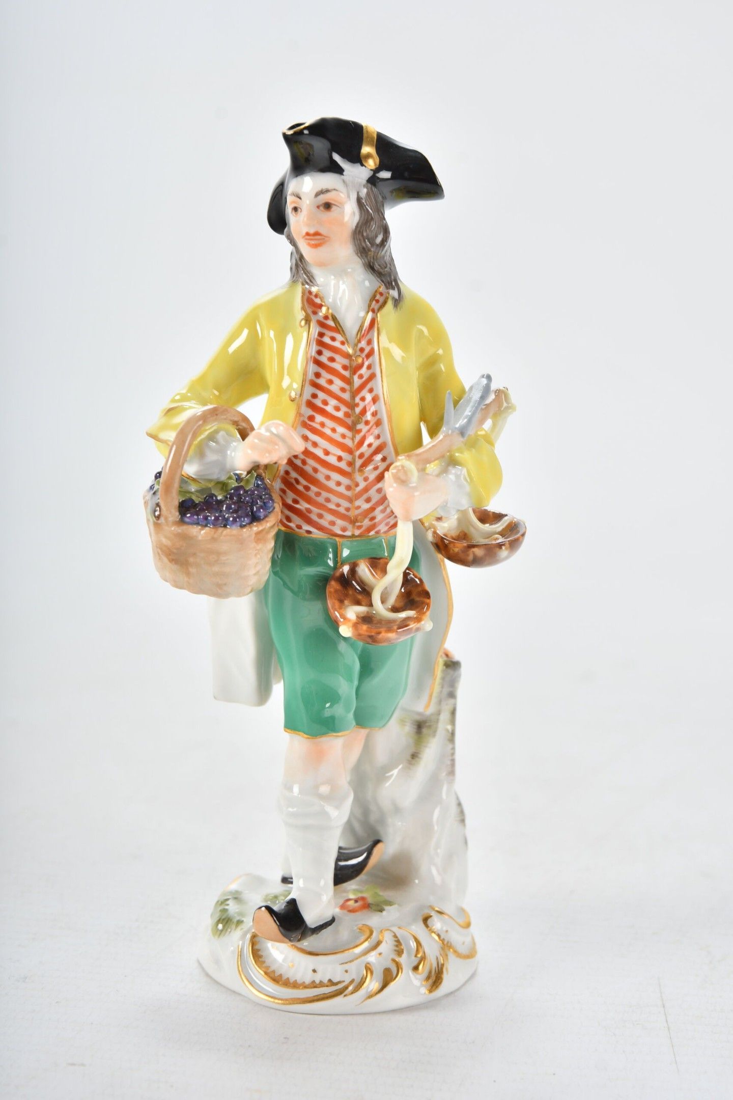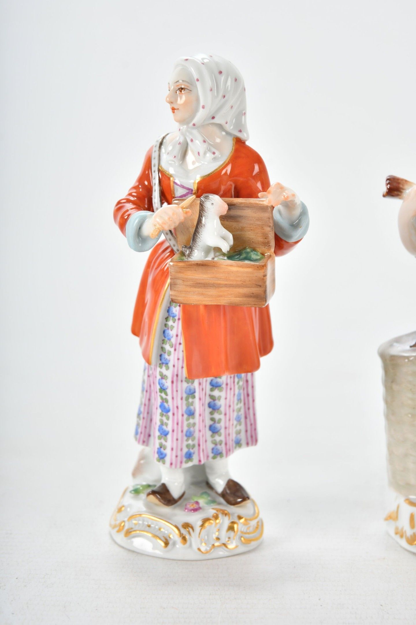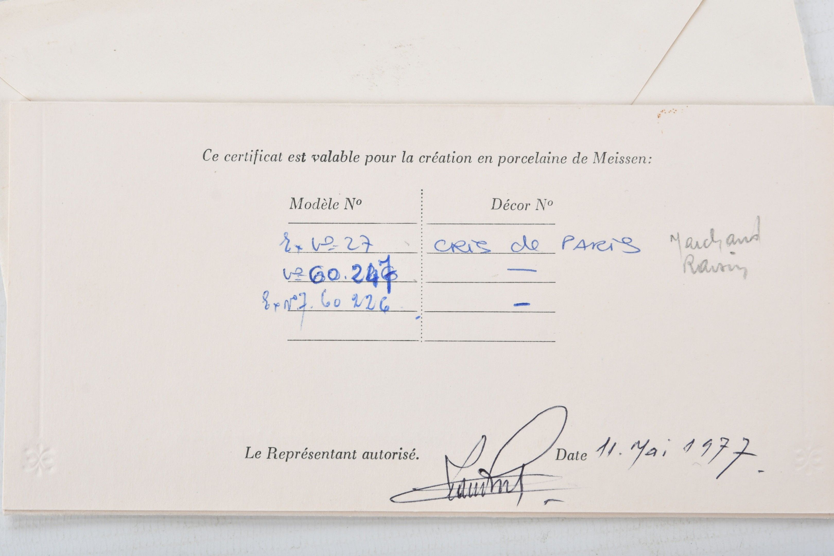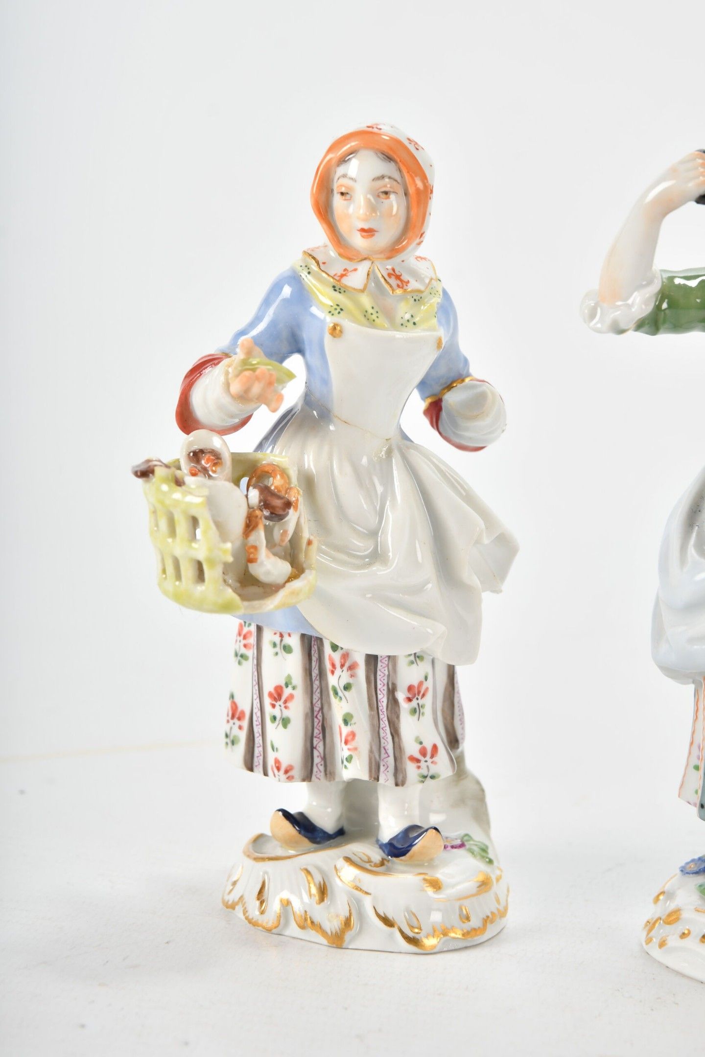MEISSEN. Suite of eight porcelain subjects with polychrome enamel of the collection "Les cris de Paris", according to a model created by Peter REINICKE about 1753. Including the lamplighter; the linen maid; reason merchant; etc... mark with crossed swords in blue and serial numbers. Six with their certificate of origin in their envelope. Accident to a subject depicting a woman with a basket (the parts to be reattached are in a bag).