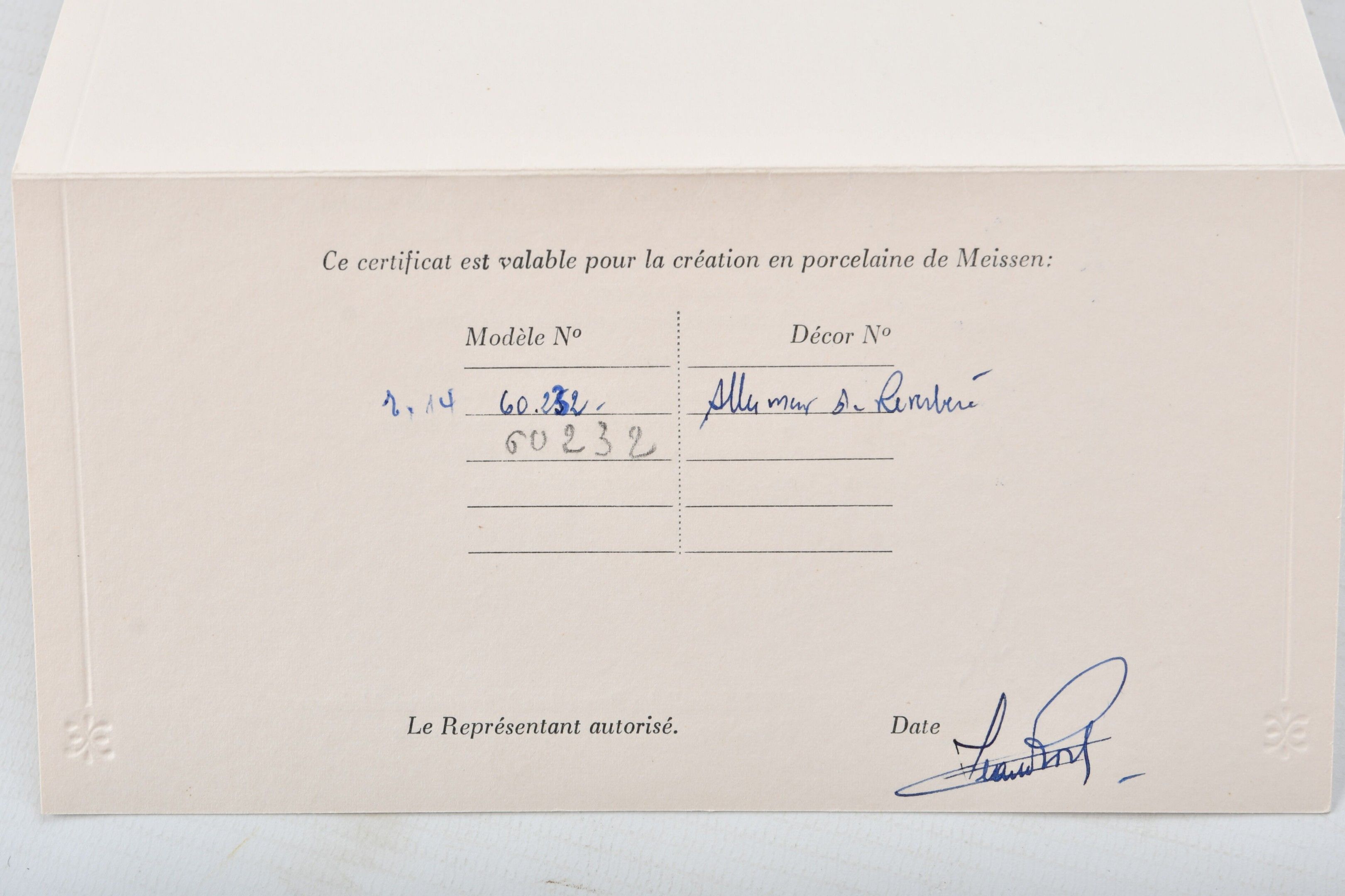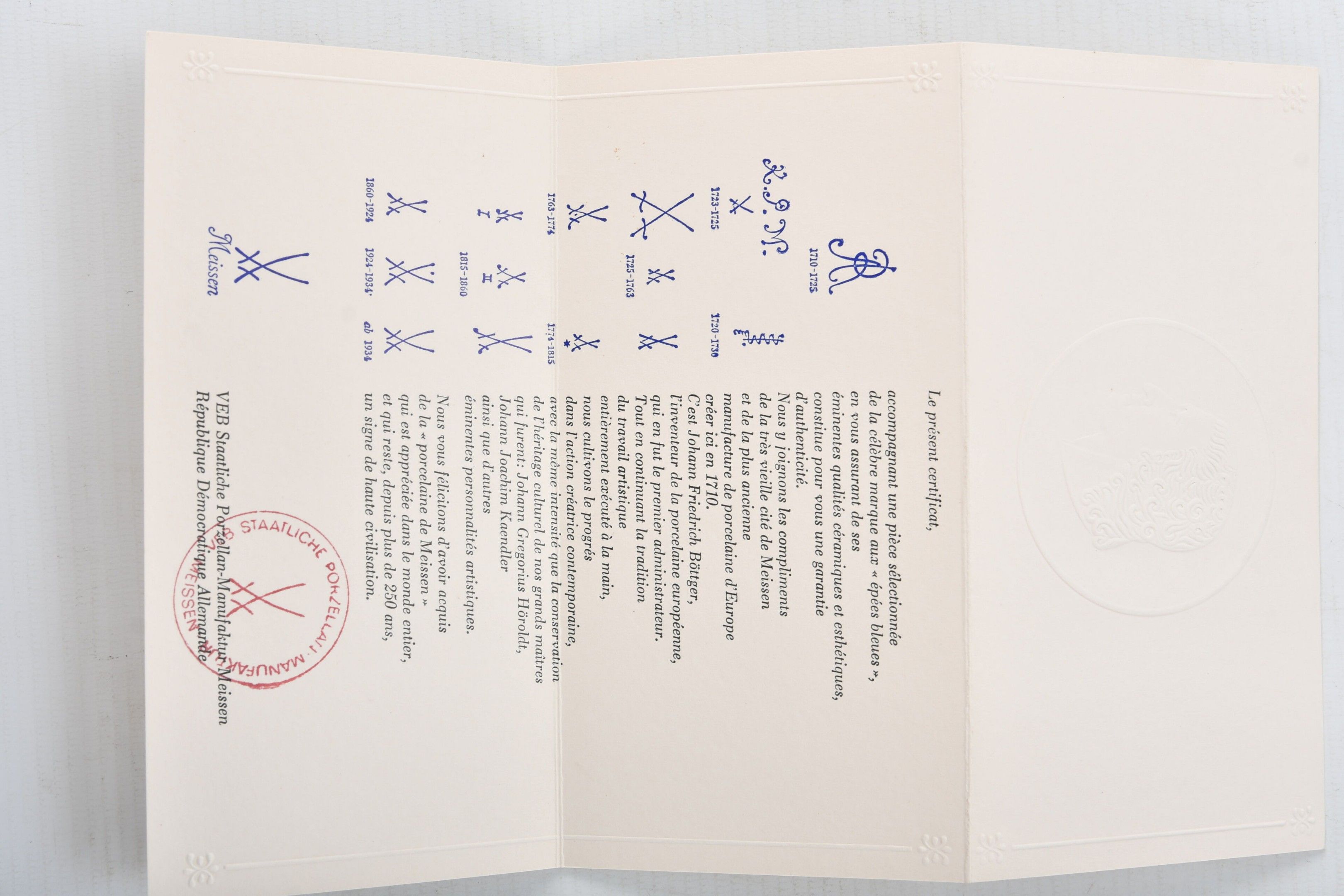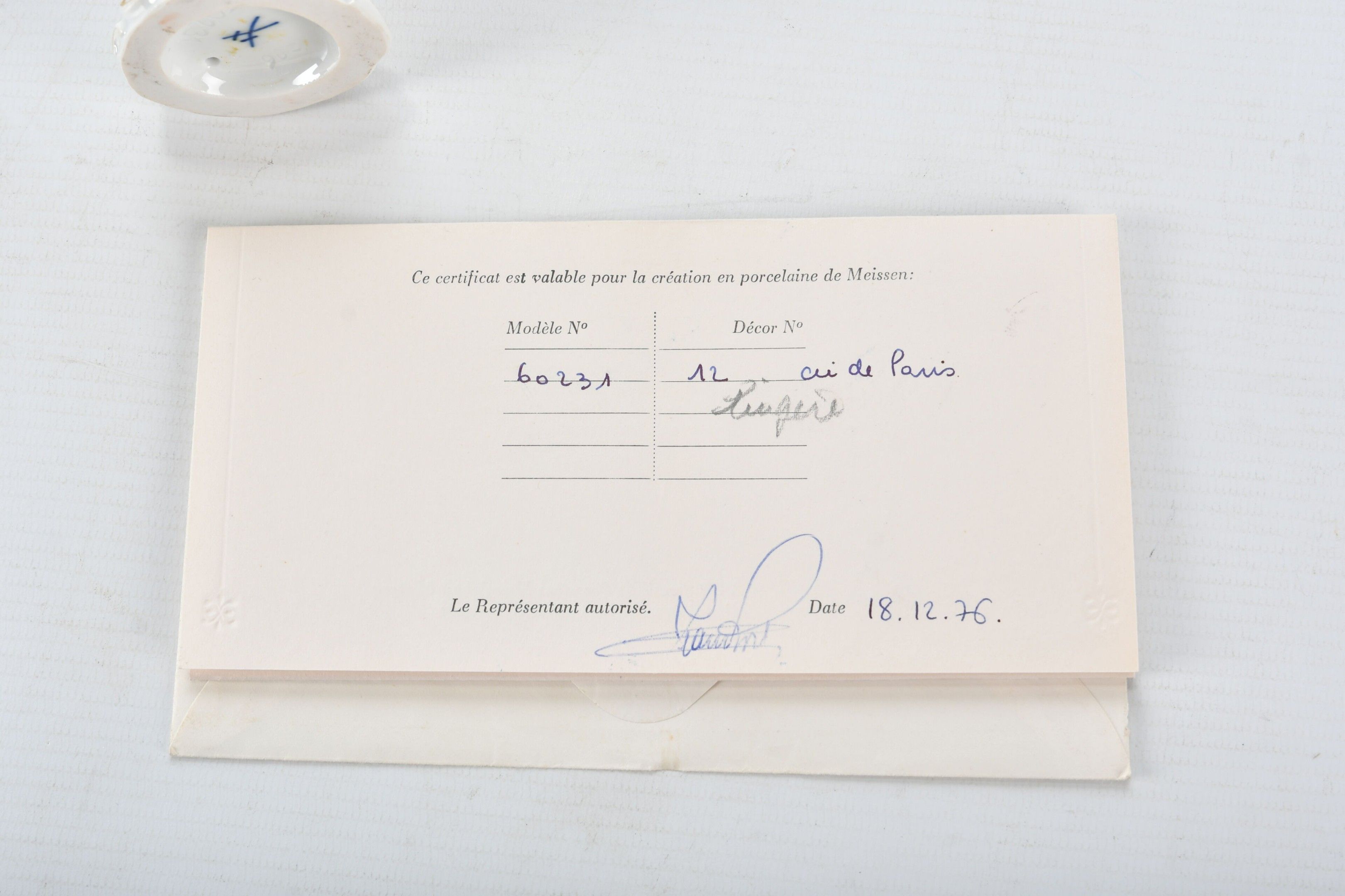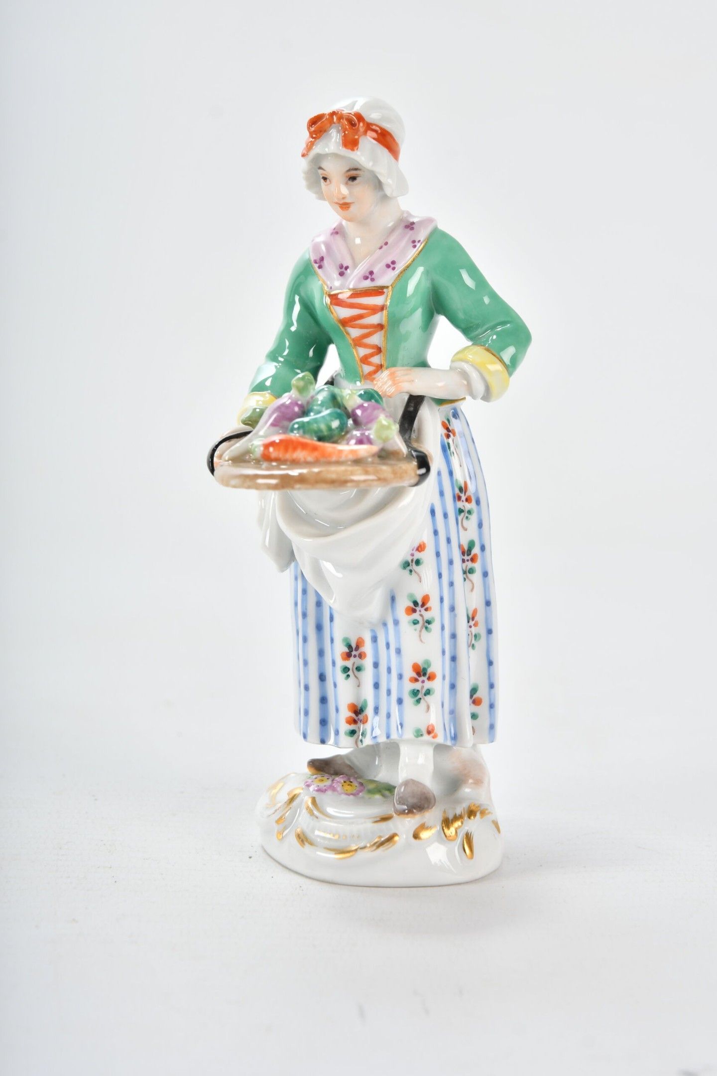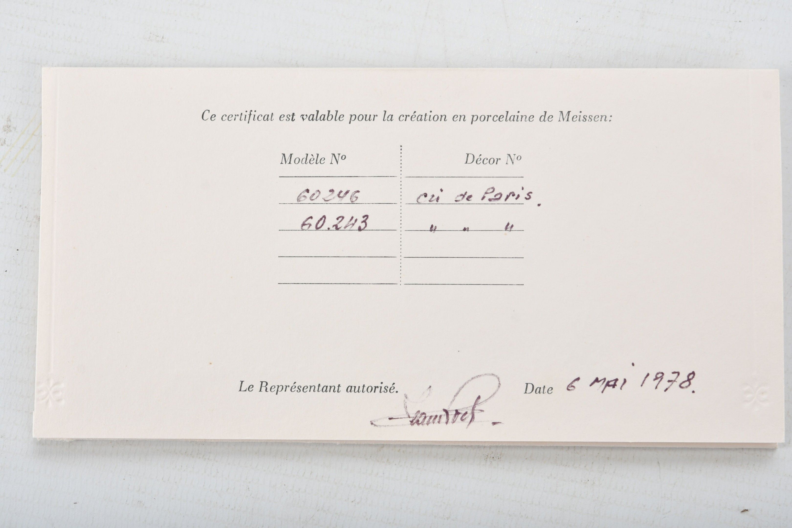 MEISSEN. Suite of eight porcelain subjects with polychrome enamel of the collection "Les cris de Paris", according to a model created by Peter REINICKE about 1753. Including the lamplighter; the linen maid; reason merchant; etc... mark with crossed swords in blue and serial numbers. Six with their certificate of origin in their envelope. Accident to a subject depicting a woman with a basket (the parts to be reattached are in a bag).