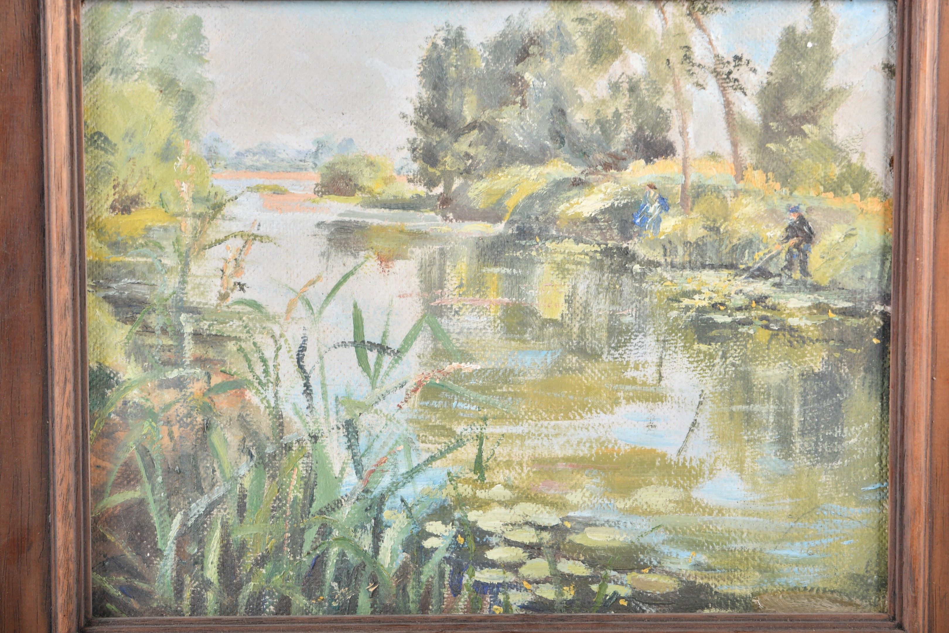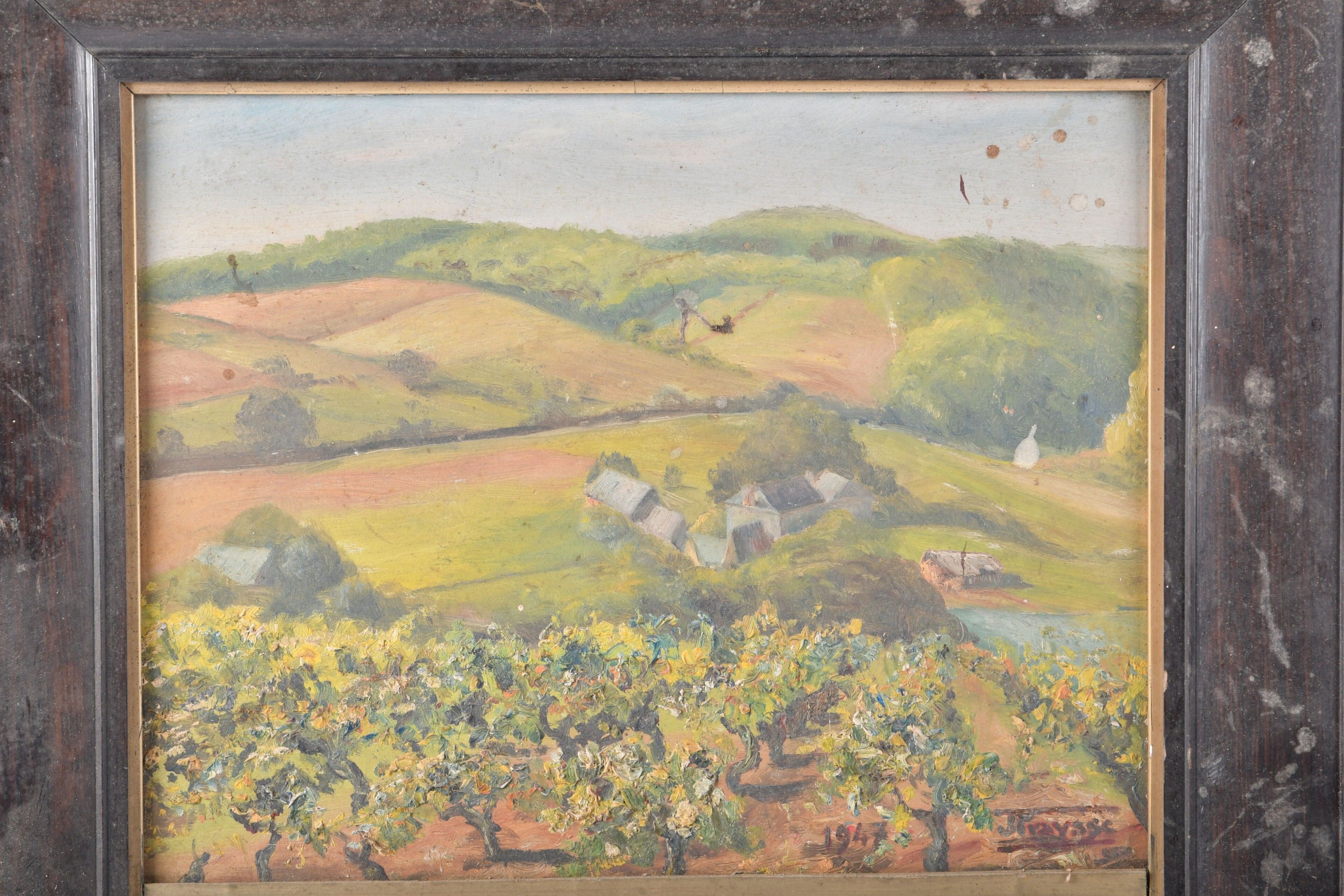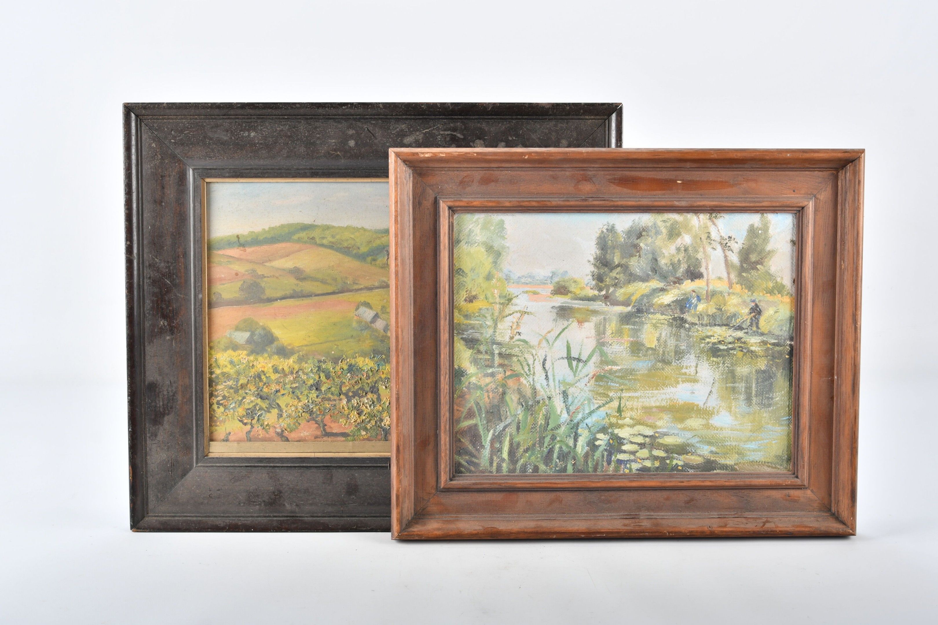 J. FRAYSSE (XXth). Suite of two oil paintings on isorel, one of fishermen on a stream and the other of a landscape of rolling countryside. 26 x 34 each. Only the landscape is signed.