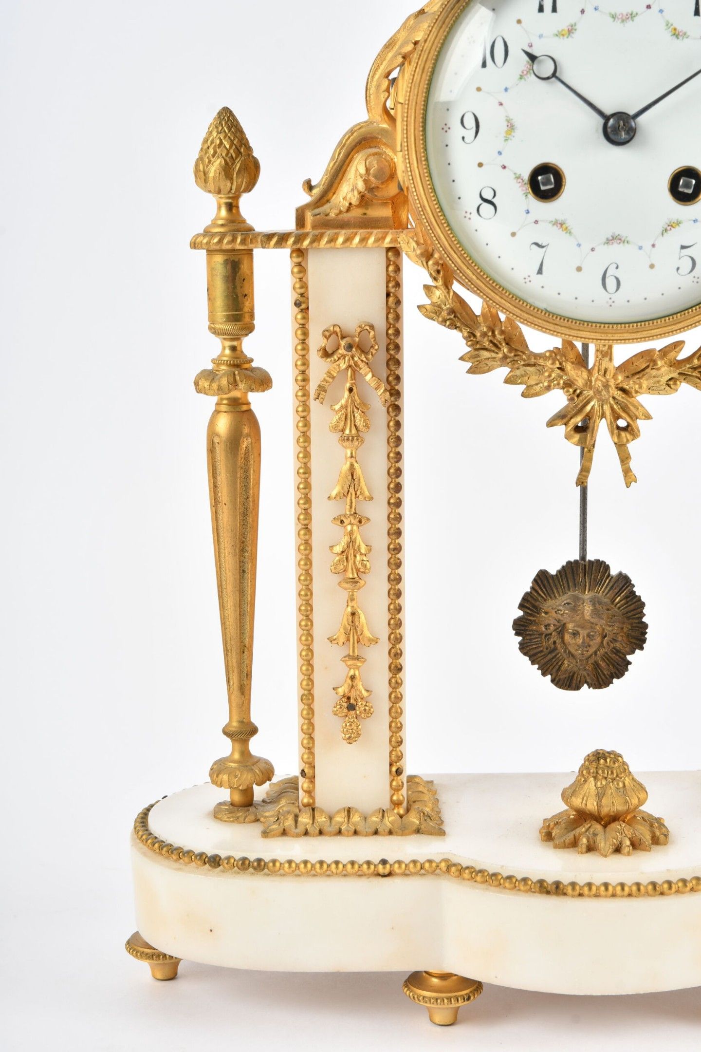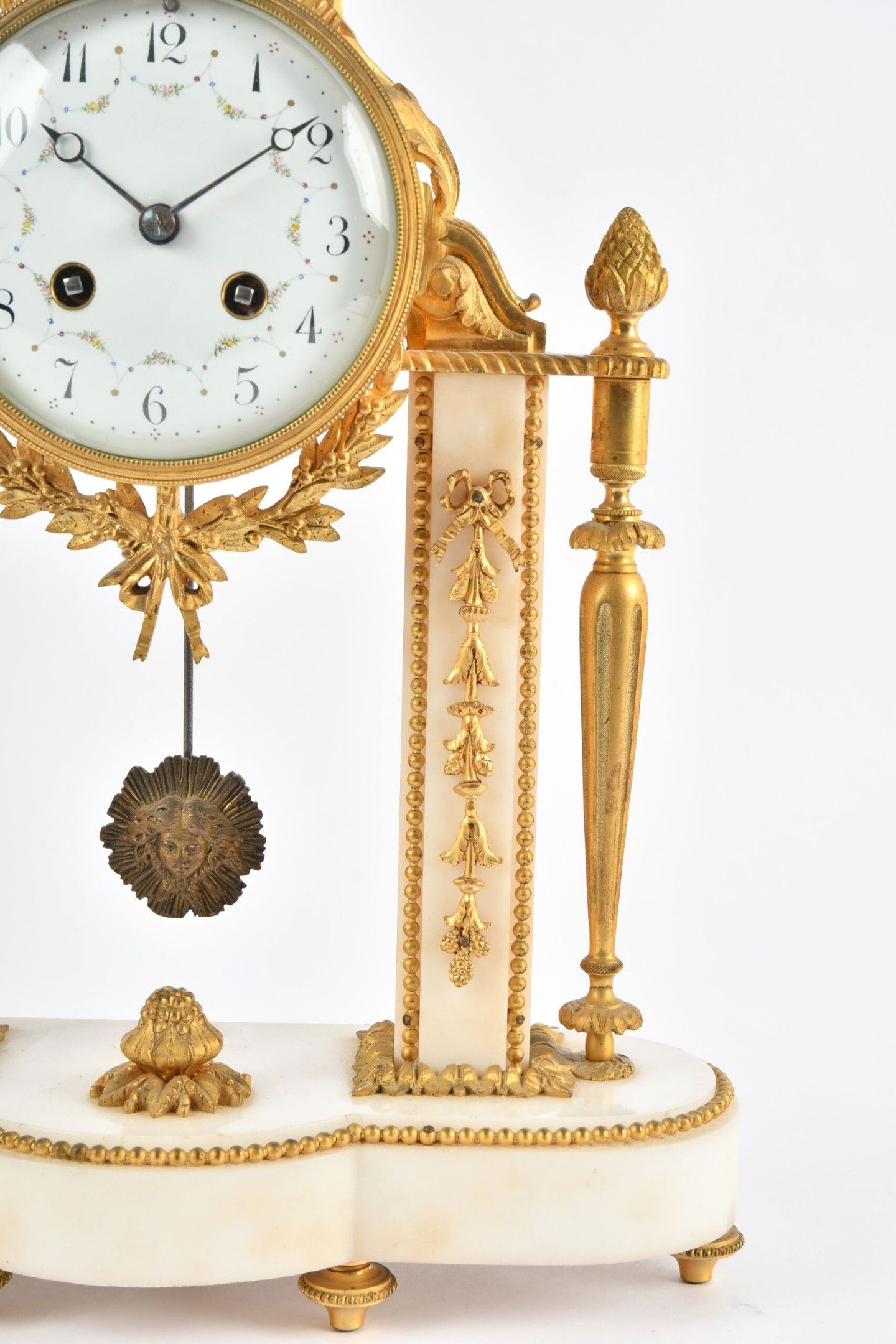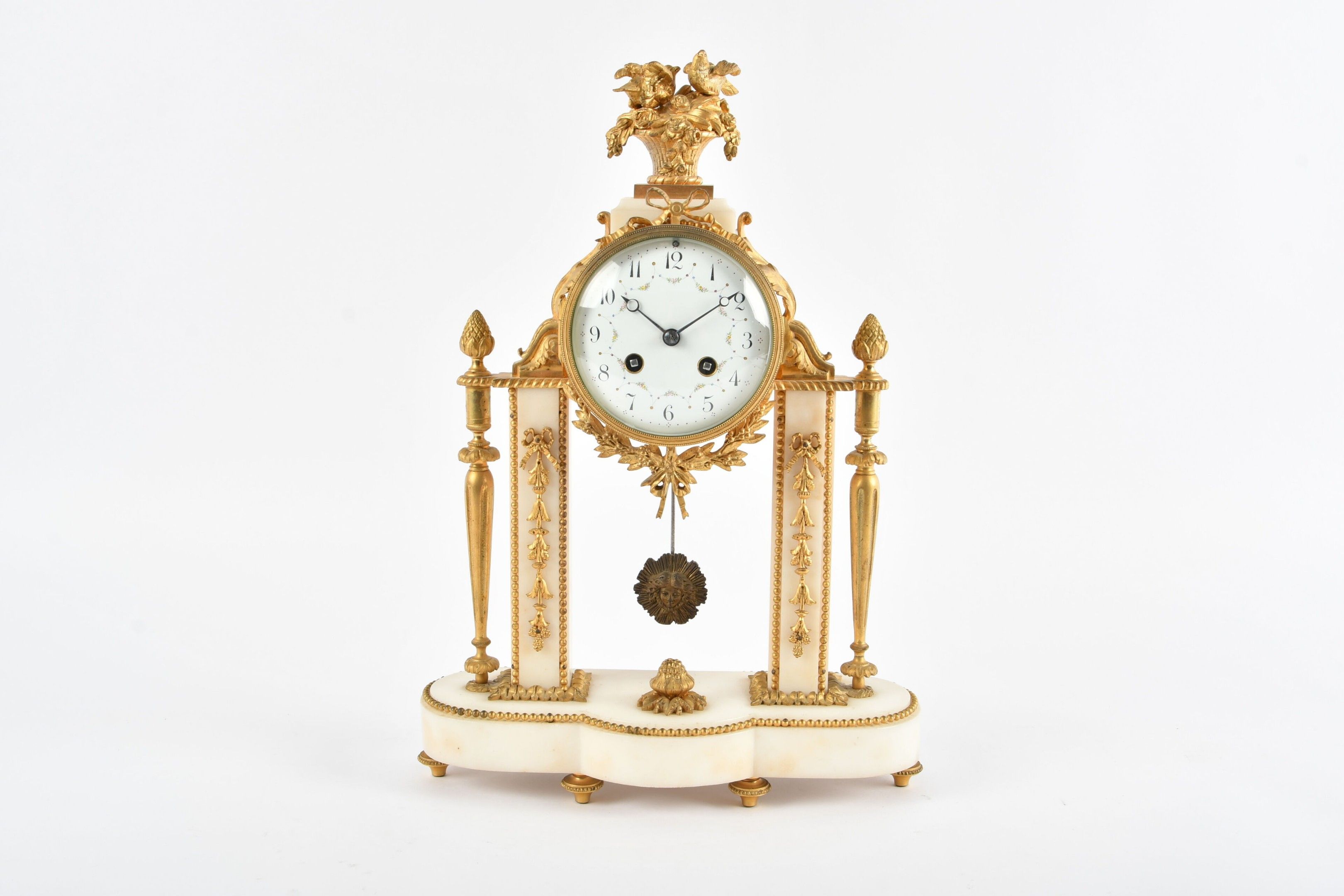 White marble and gilt bronze portico HANGER. Decorated with friezes of pearls, foliage, ribbons and flowers. The whole surmounted by a basket on which rests a pair of birds. Blade movement signed Marti. Louis XVI style, 19th century. Height 42 cm.
