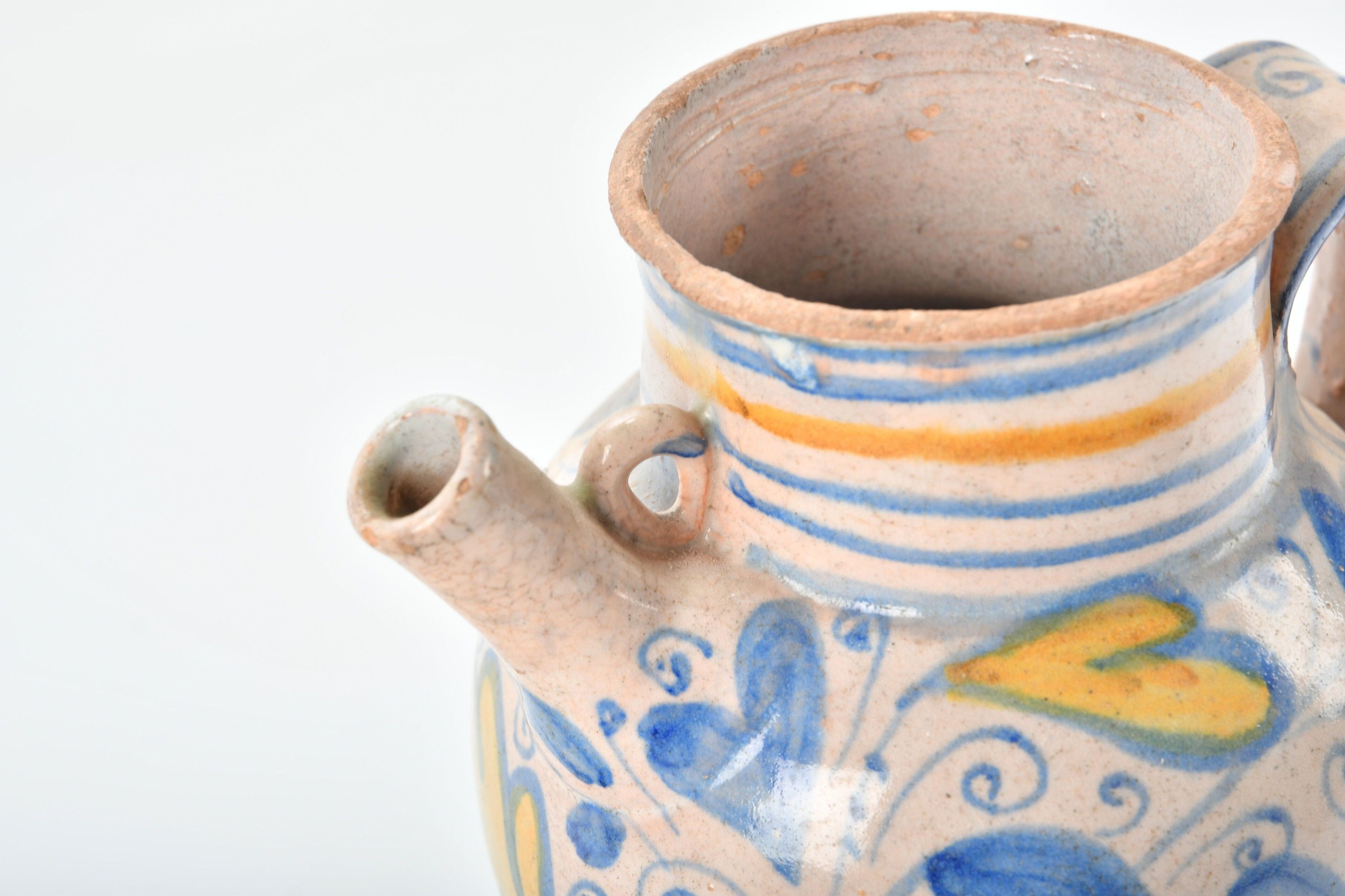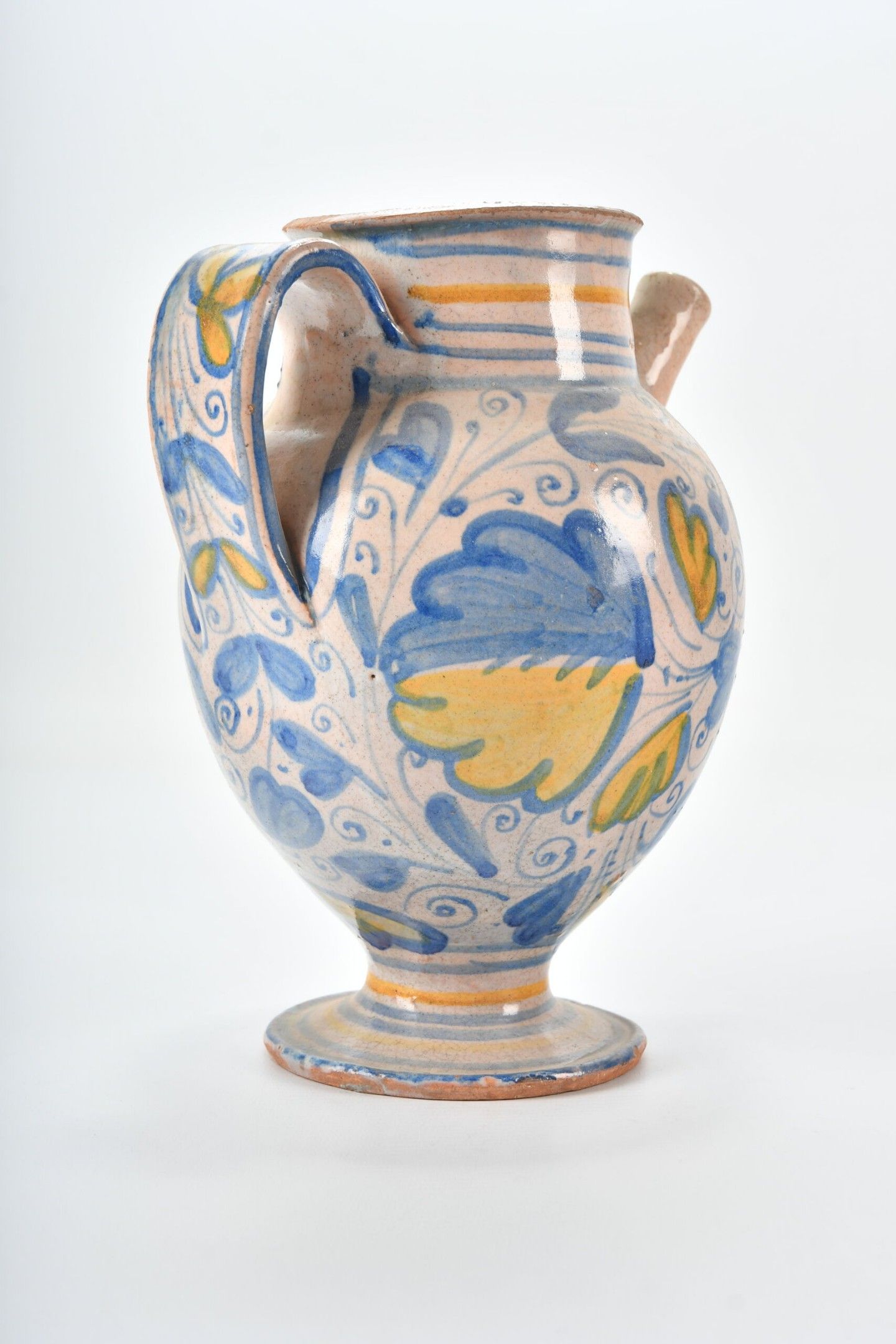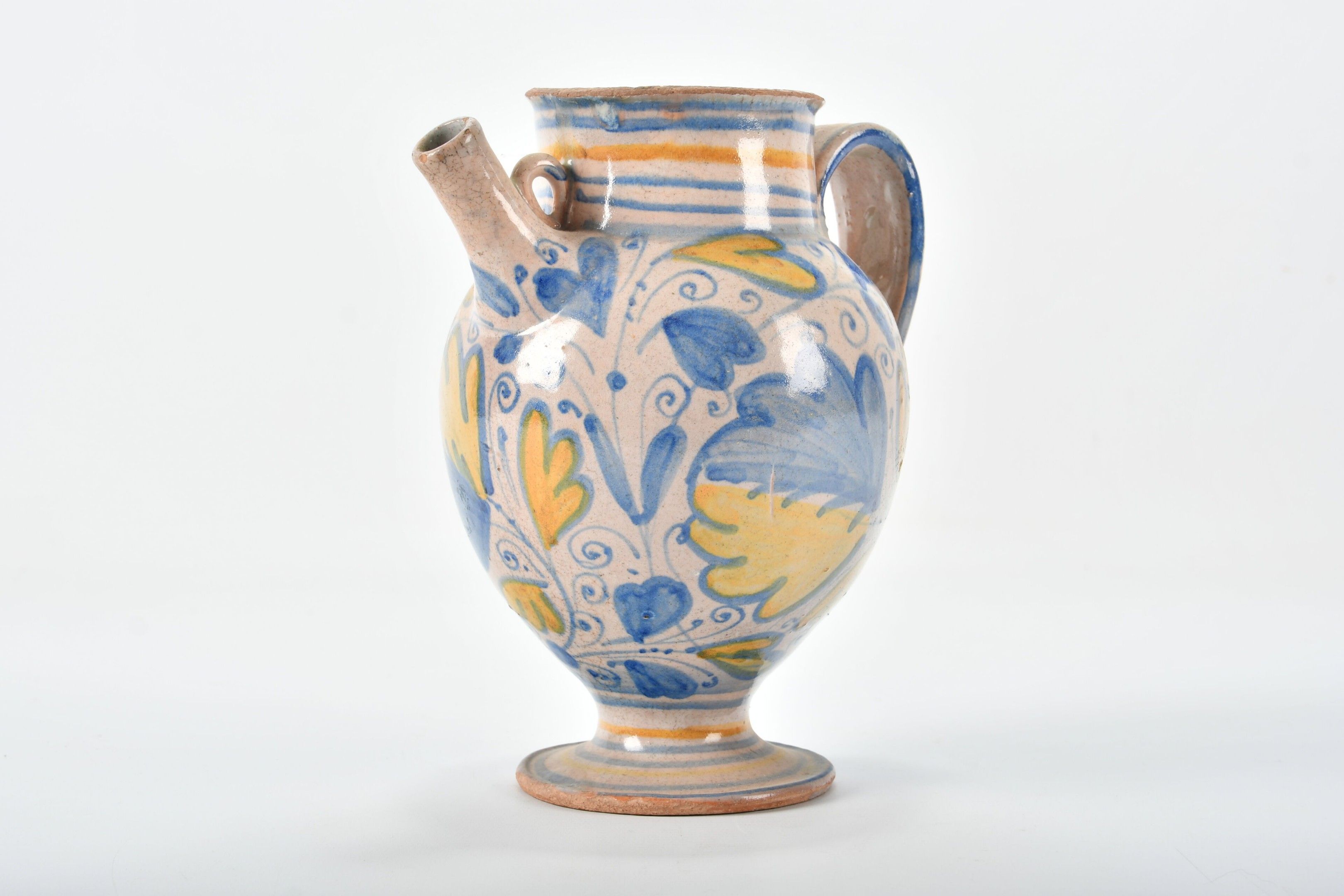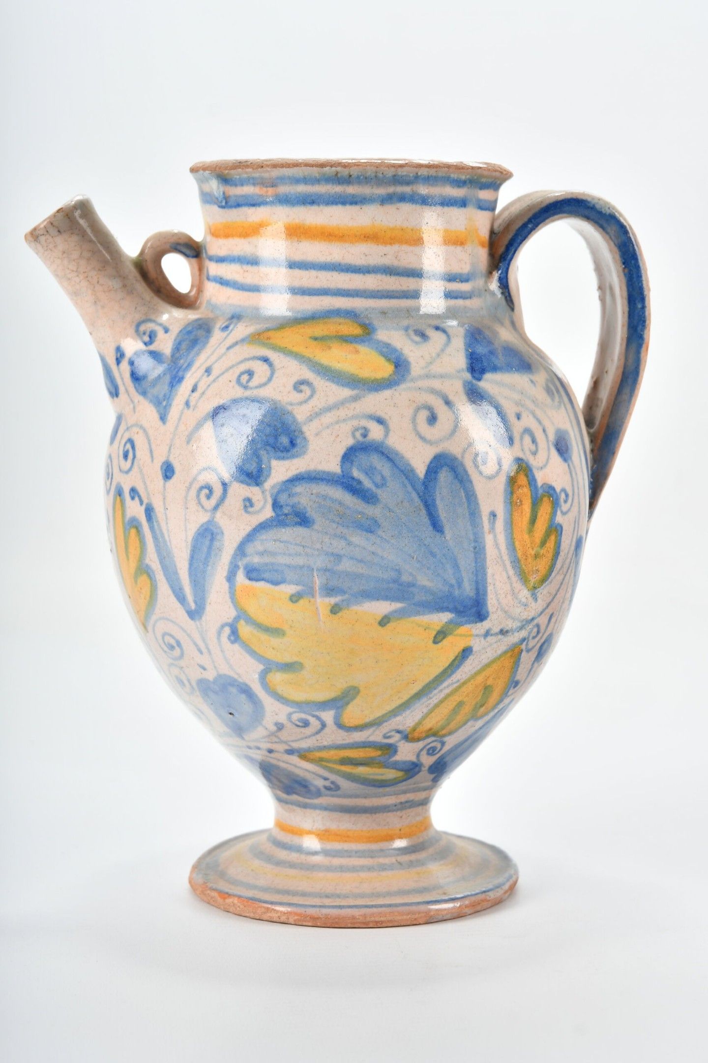 LYON. Earthenware dish with blue and ochre enamelled decoration of stylised vine leaves on a foliate background. The wide handle and circular base are decorated with two-tone fillets, also found on the neck. Height 22 cm