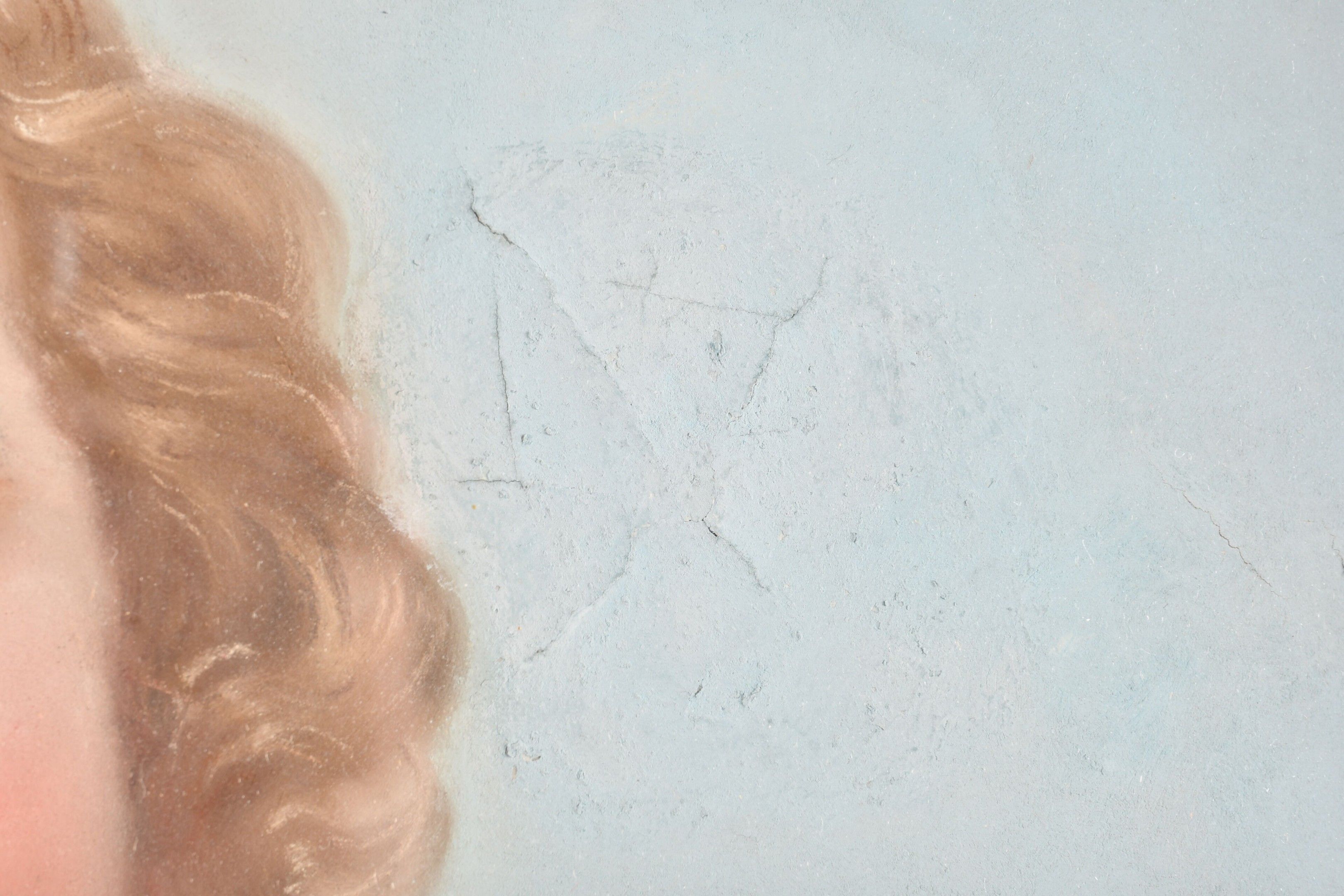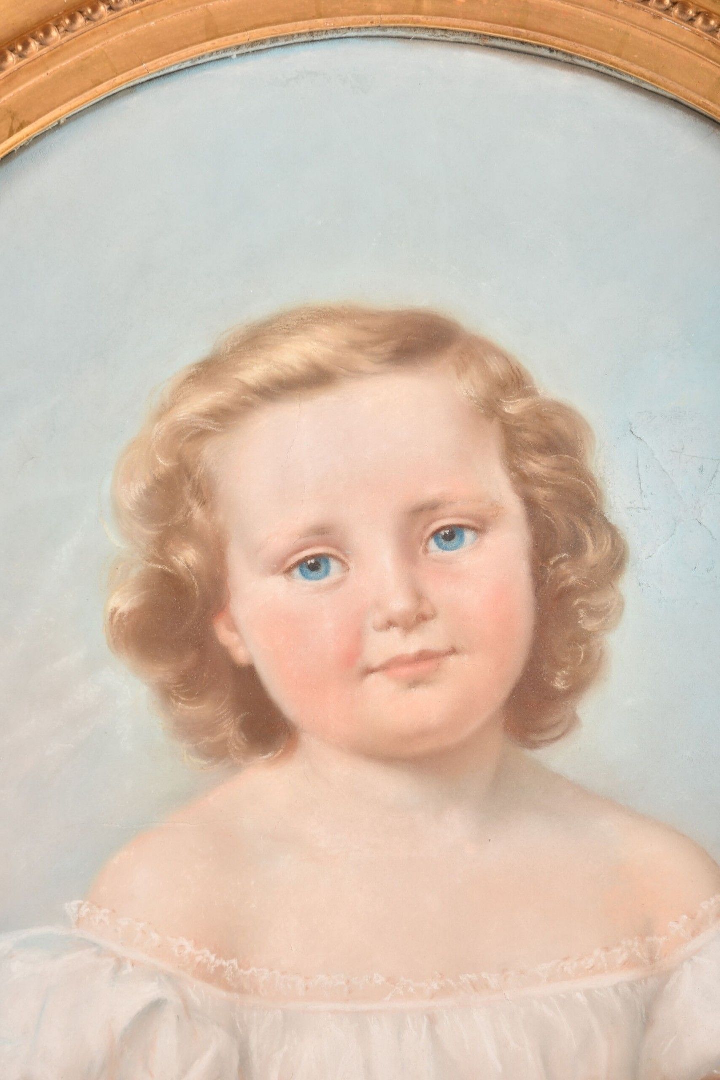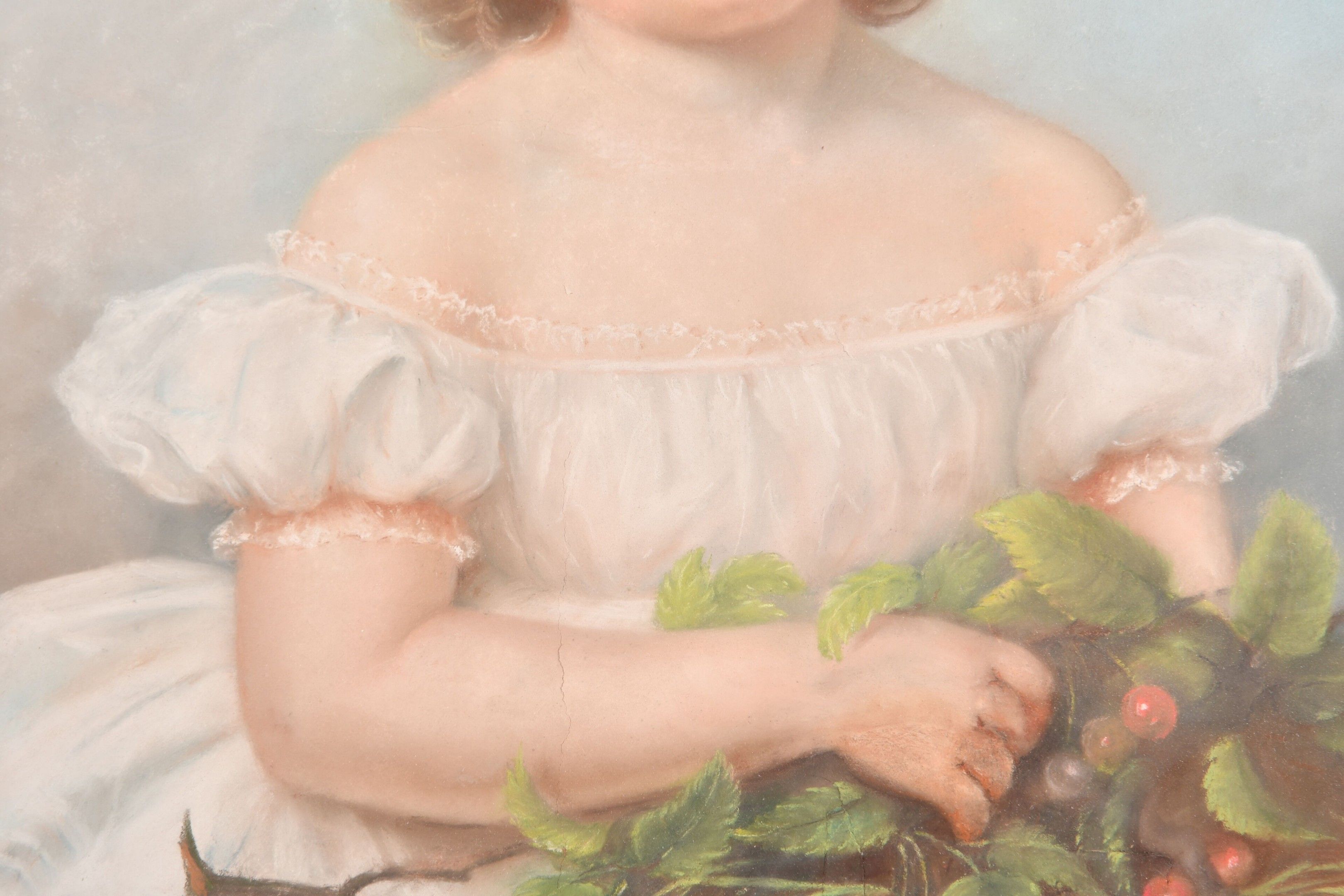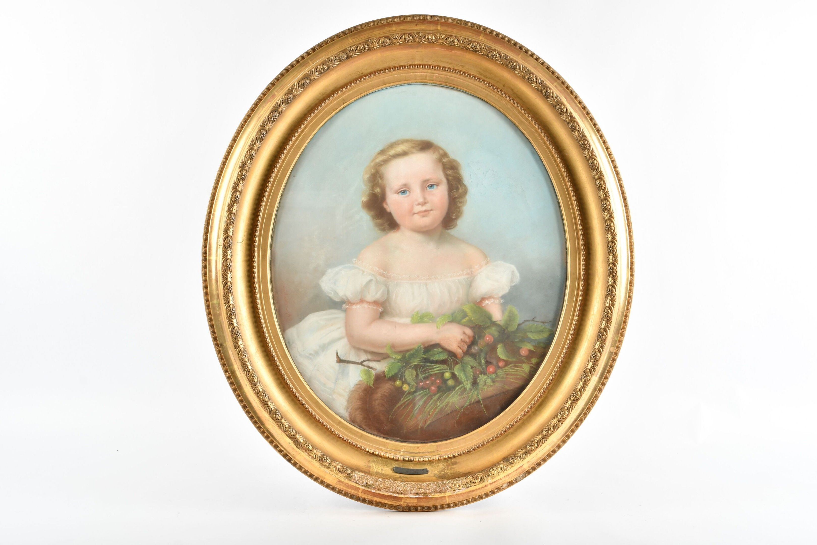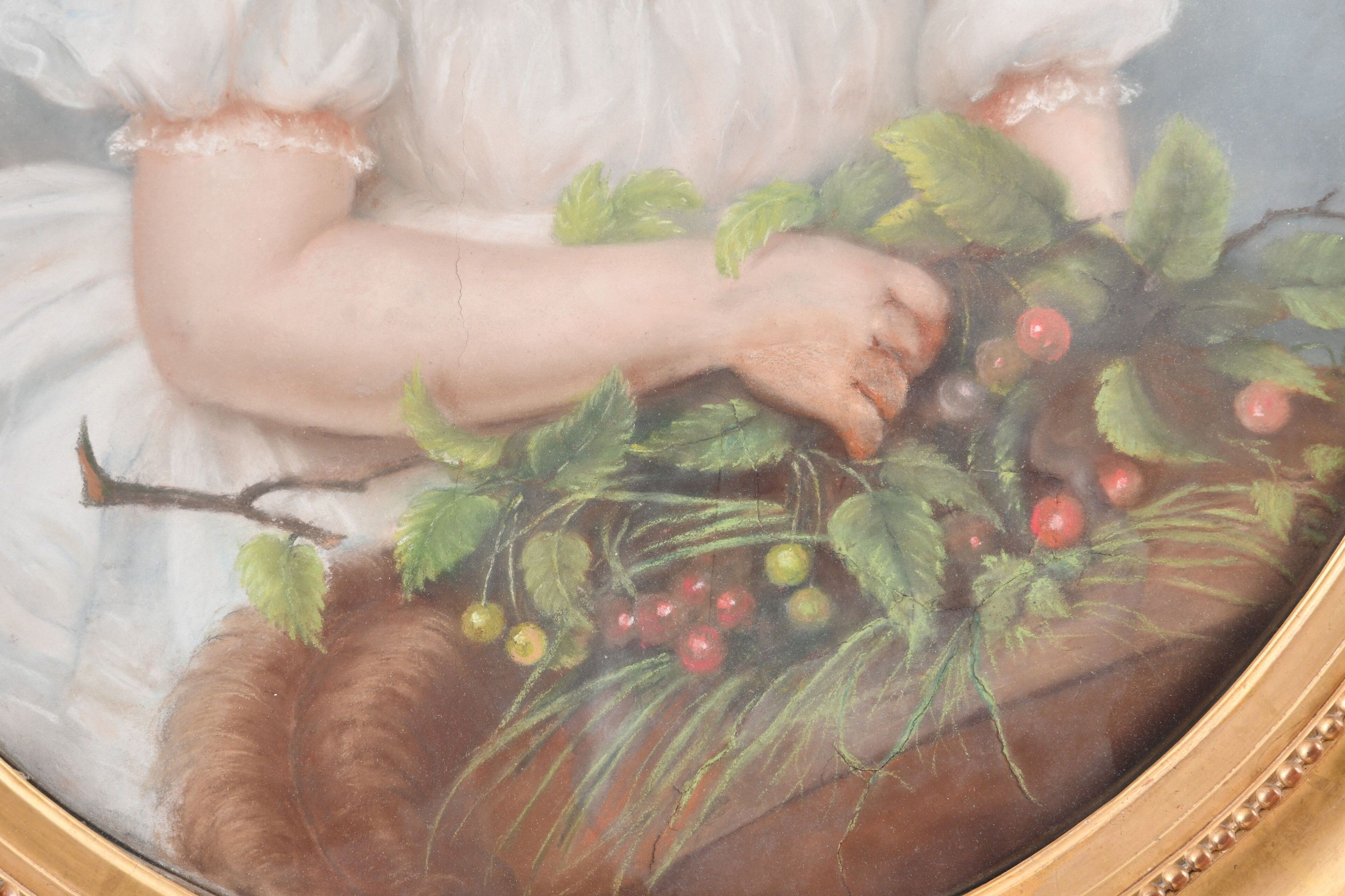 VALLIER, Lina (1811-1878). Portrait of Henriette Vallier (1854-1874) as a little girl with a cherry branch. Pastel on paper signed middle left and dated (18)58. 65 x 53 cm. In an oval 19th century gilt wood and composition frame bearing a cartouche designating (probably the artist's daughter). A tear in the sky to the right of the face.