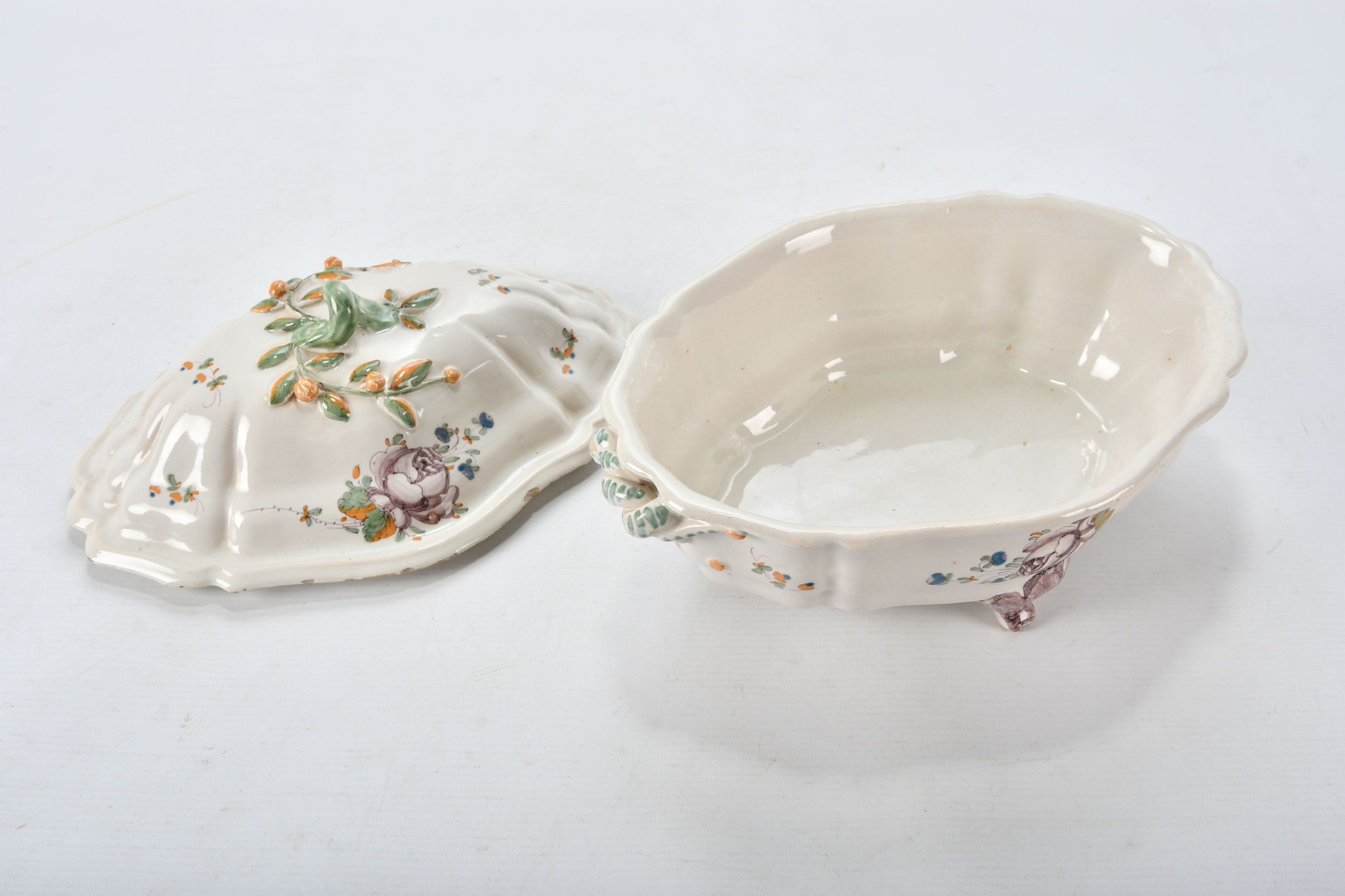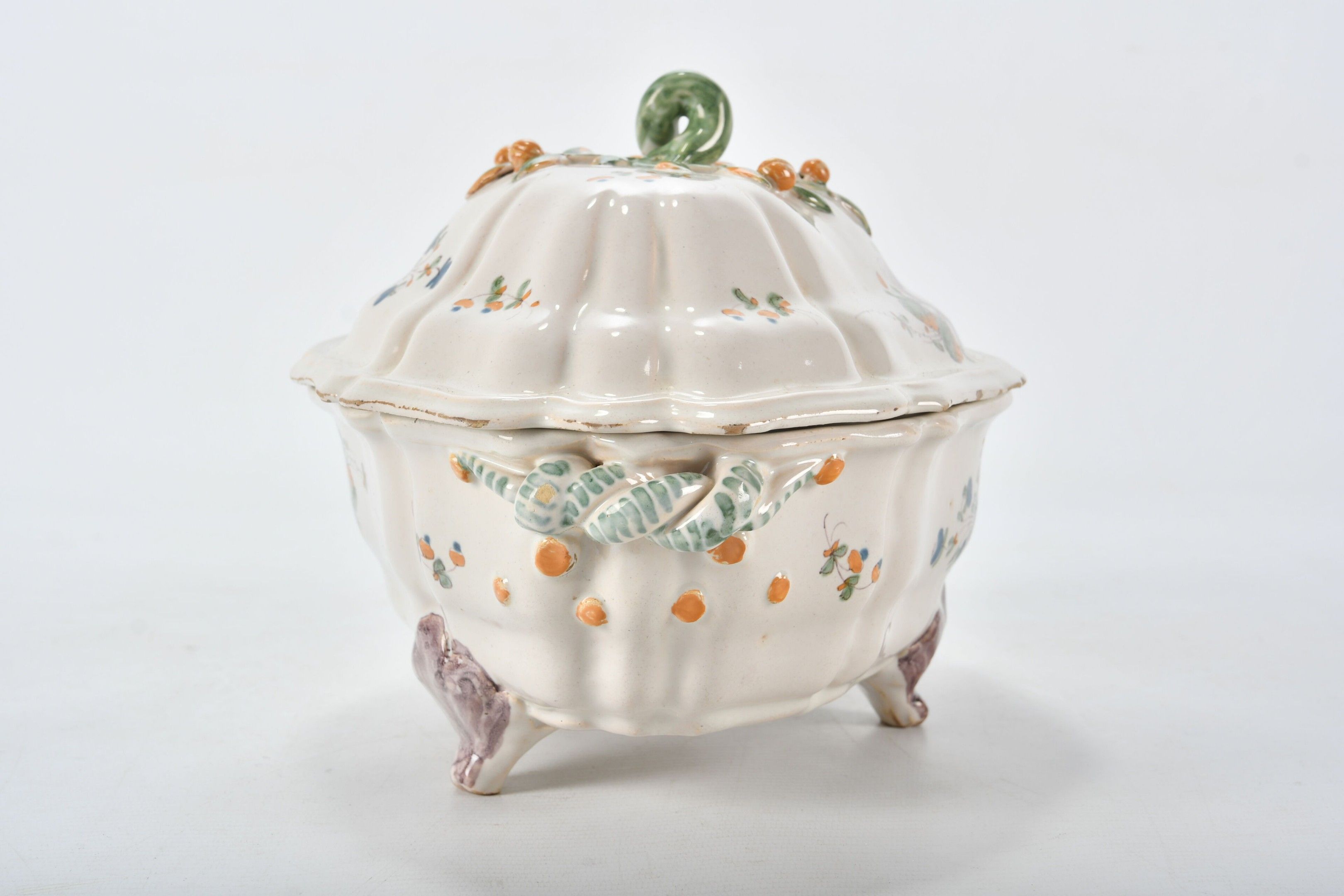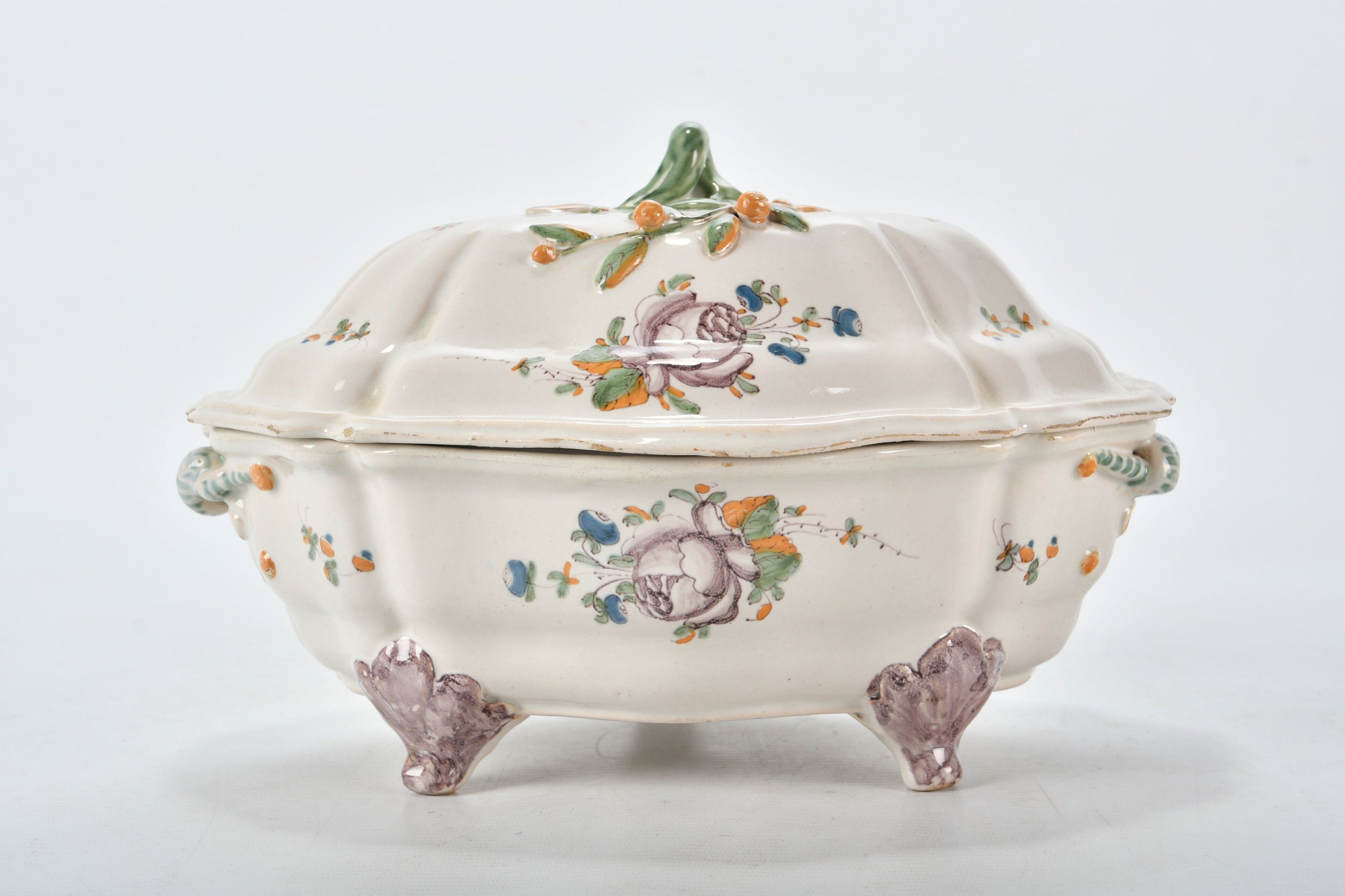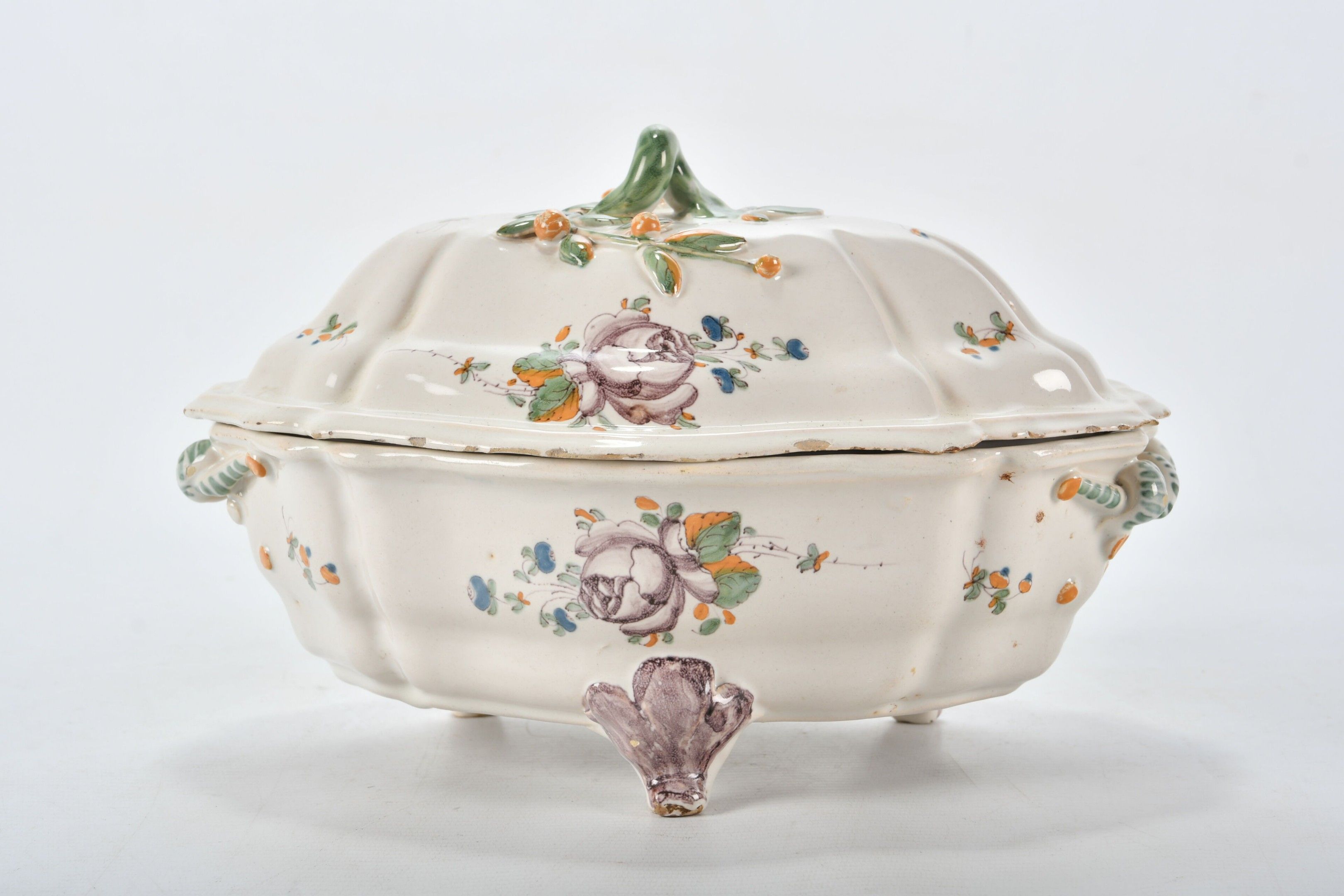 MONTPELLIER. Covered LEGUMIER with contoured and ribbed rim, standing on three feet and olive branch handholds. Earthenware and polychrome decoration of flowers. 18th century period. H. 20 - W. 29 - D. 21 cm