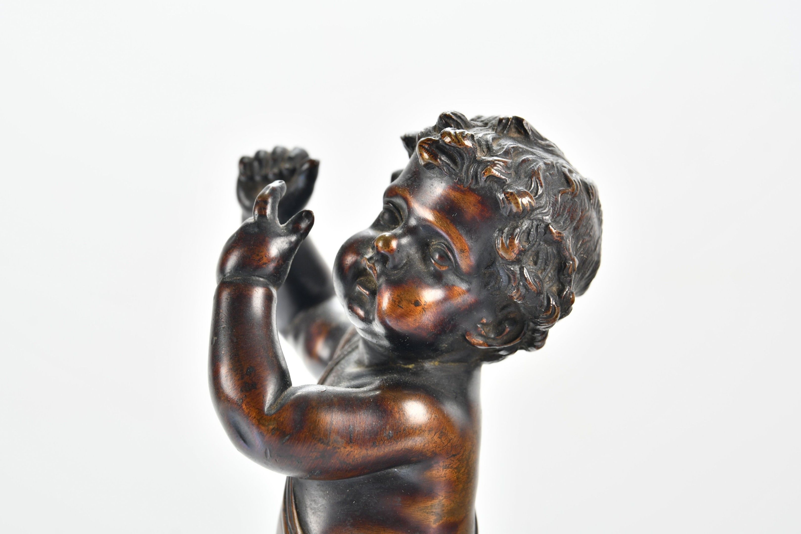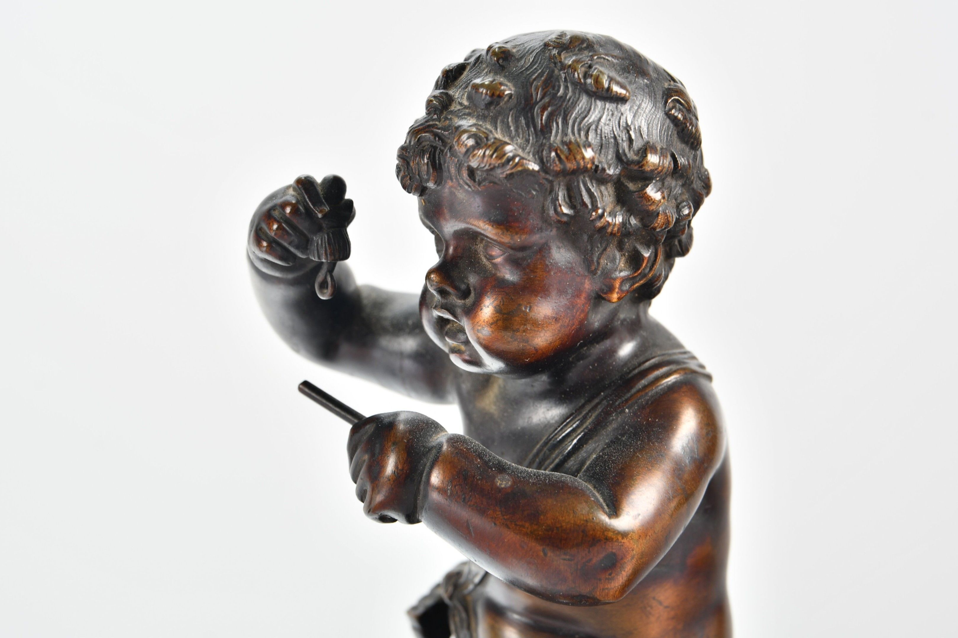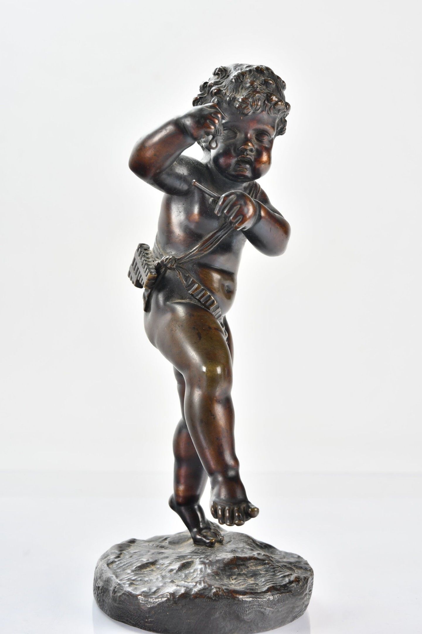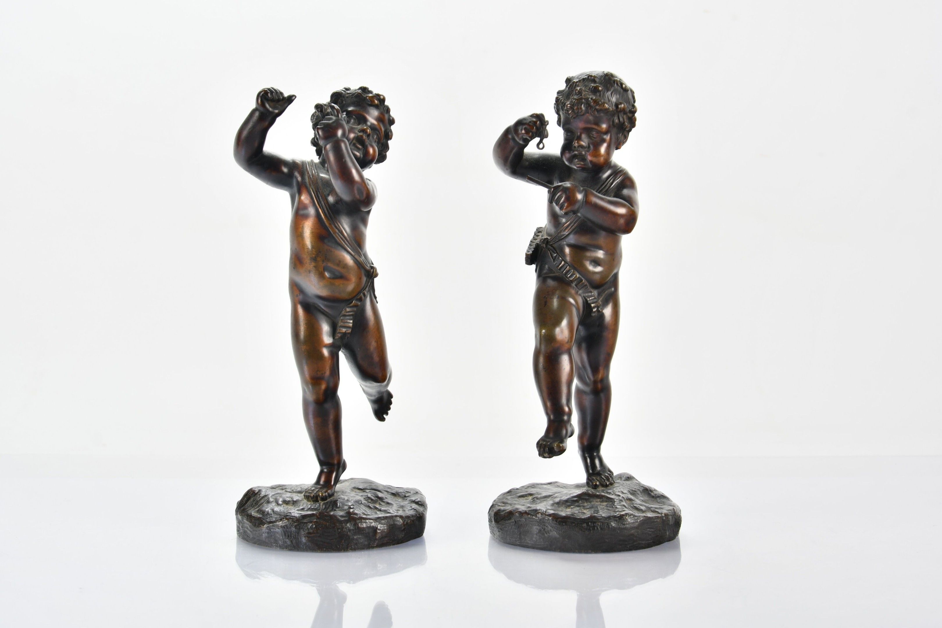 CLODION (in the taste of), 19th century. A pair of brown patina bronze statuettes of putti musicians. H. 22 cm (the instruments are missing)