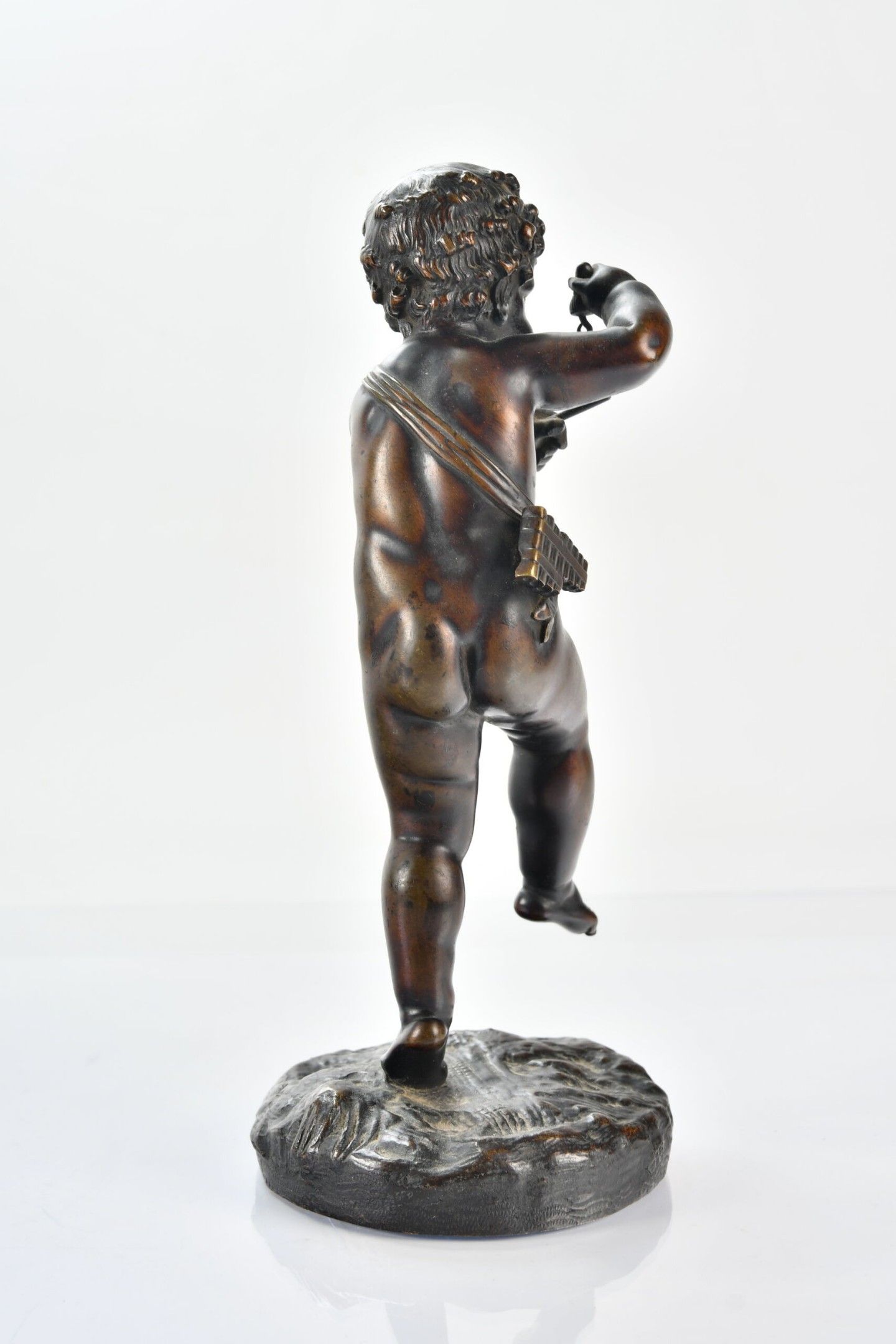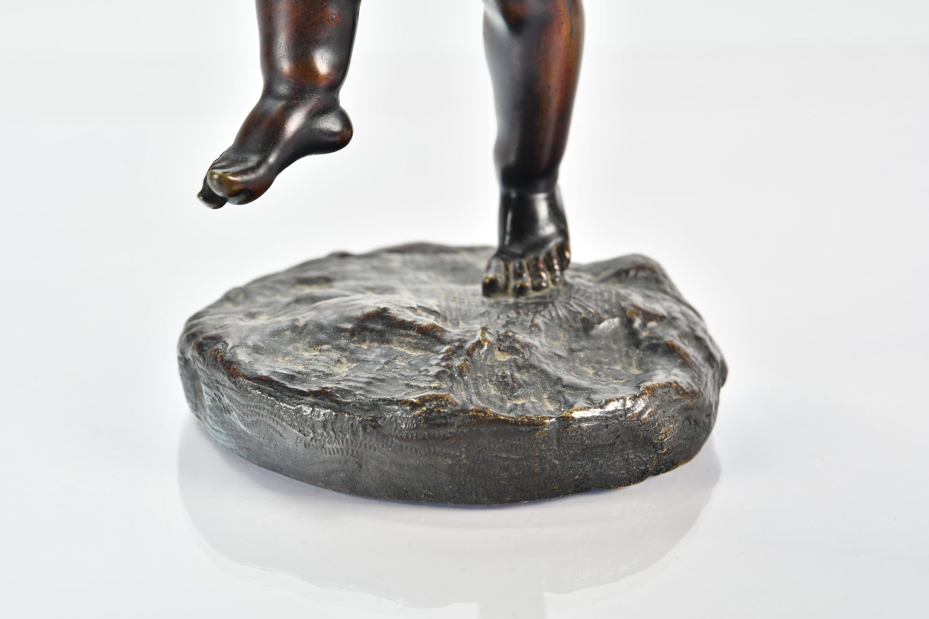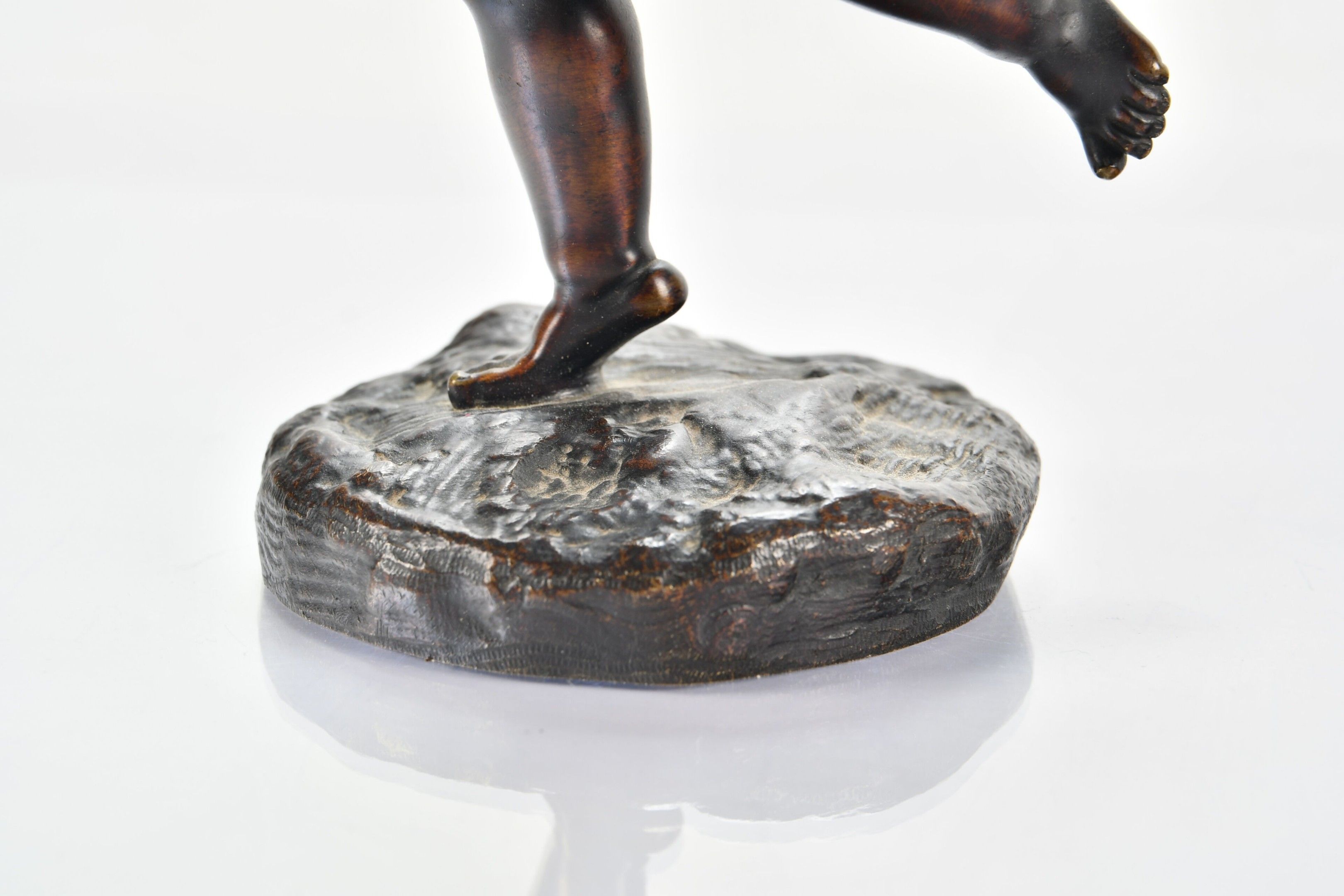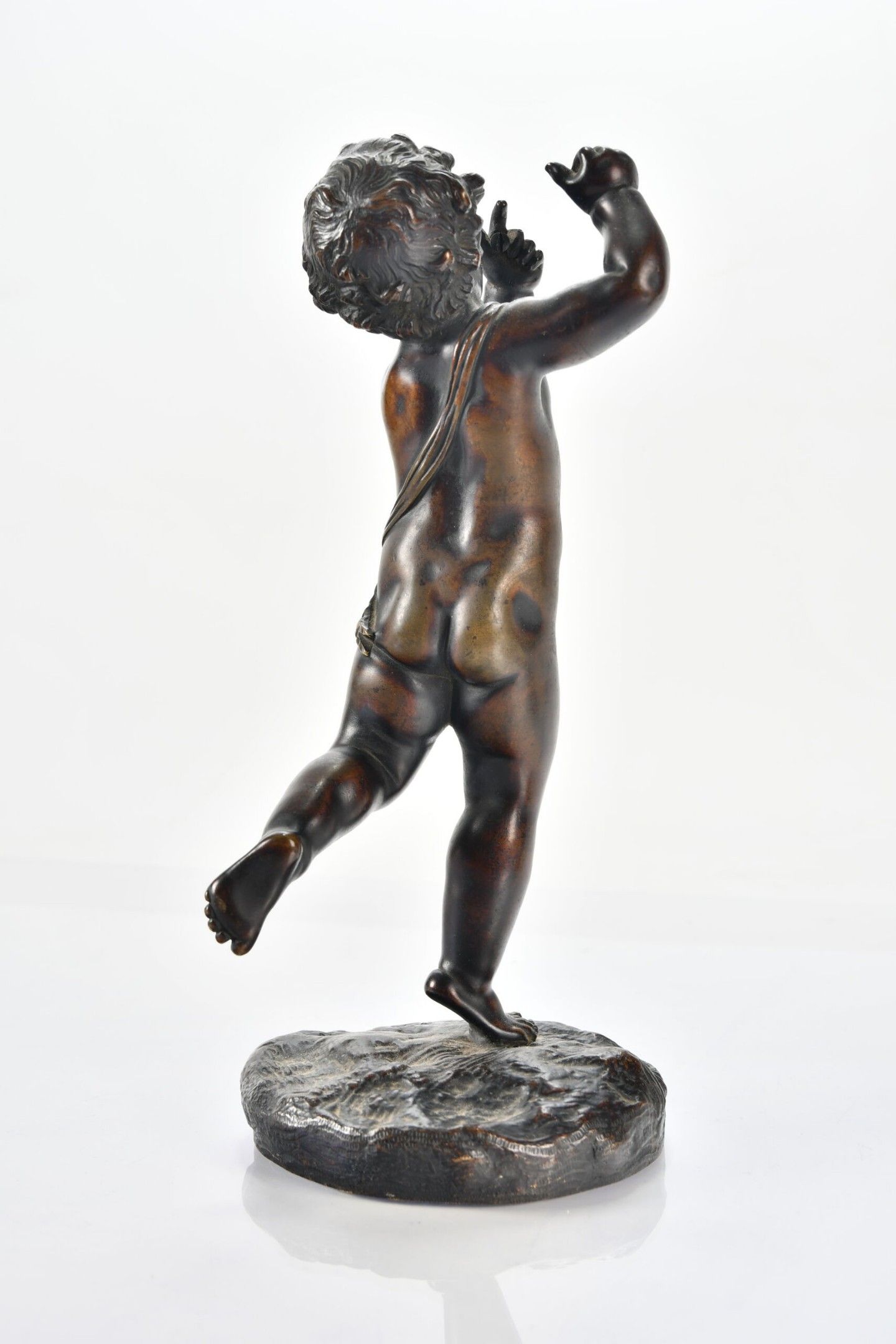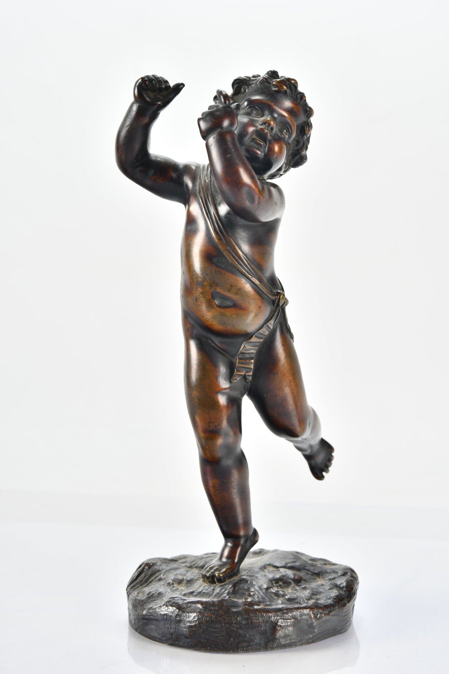 CLODION (in the taste of), 19th century. A pair of brown patina bronze statuettes of putti musicians. H. 22 cm (the instruments are missing)