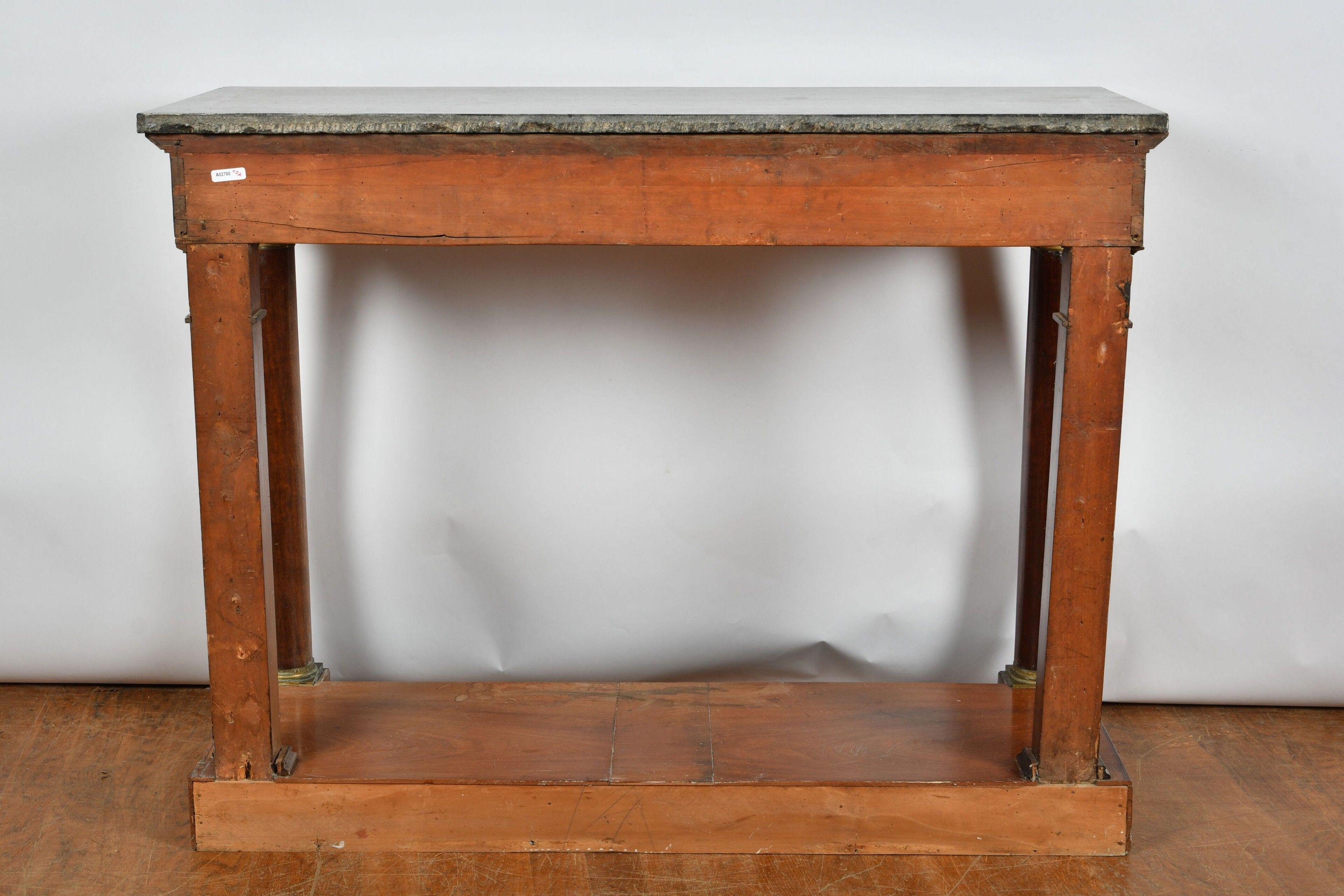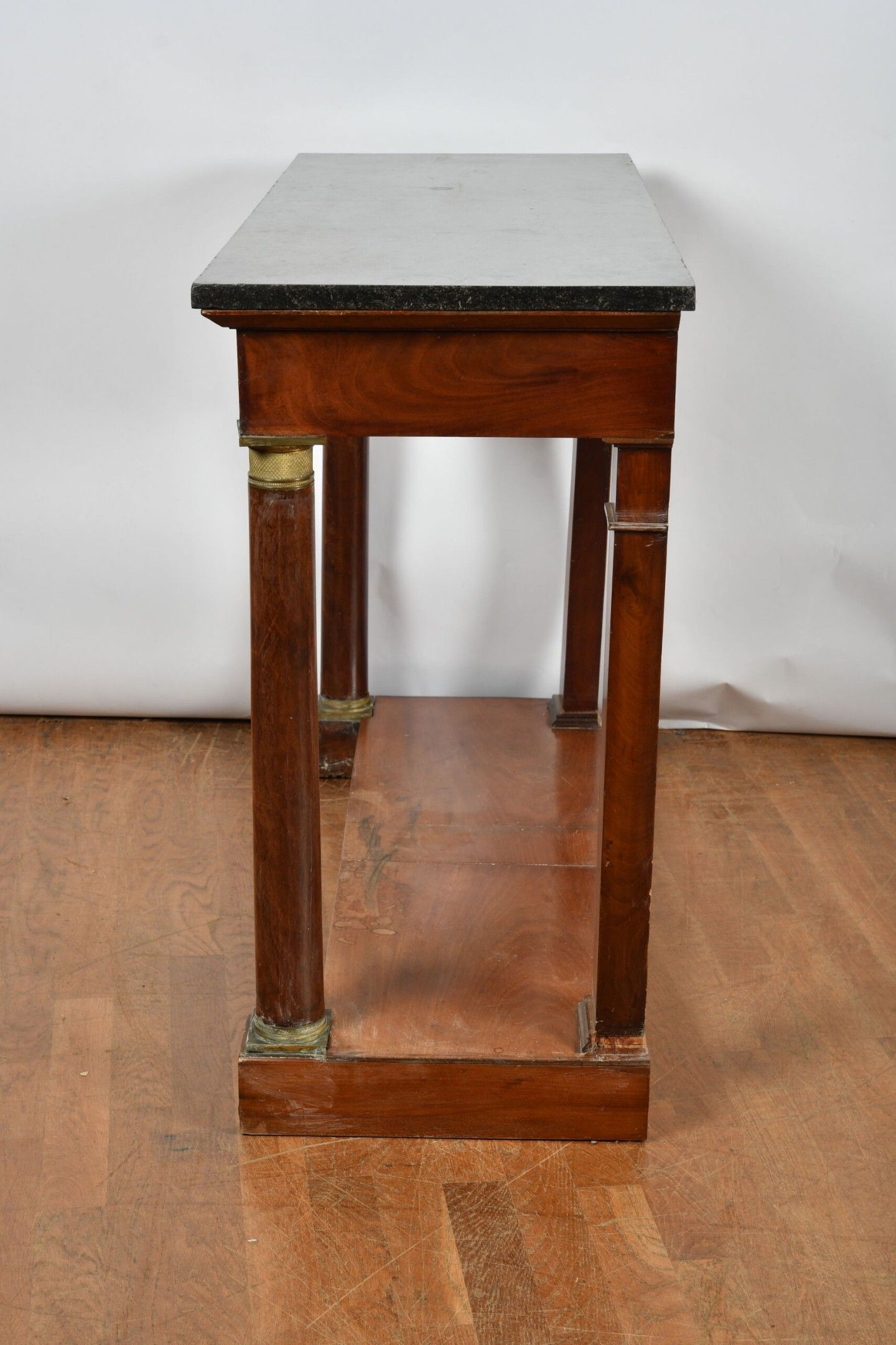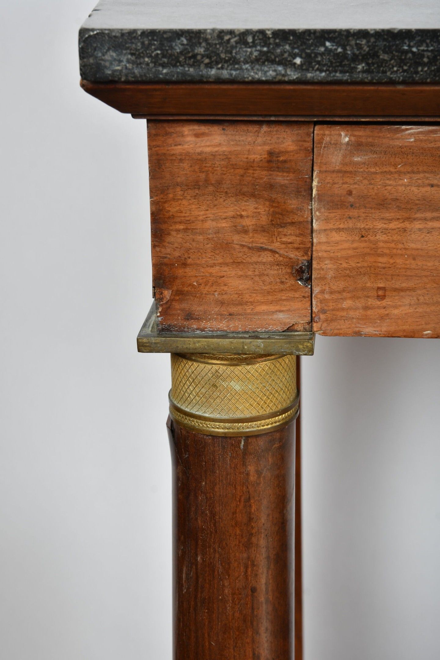 A mahogany and veneered CONSOLE with a Belgian granite top opening to a drawer in the waist and standing on four legs; the front legs are columnar and joined by a brace forming an entablature plinth. Bronze ornamentation for the keyhole and column capitals. H. 86 - W. 112.5 - D. 45 cm. Missing veneer and significant wear.