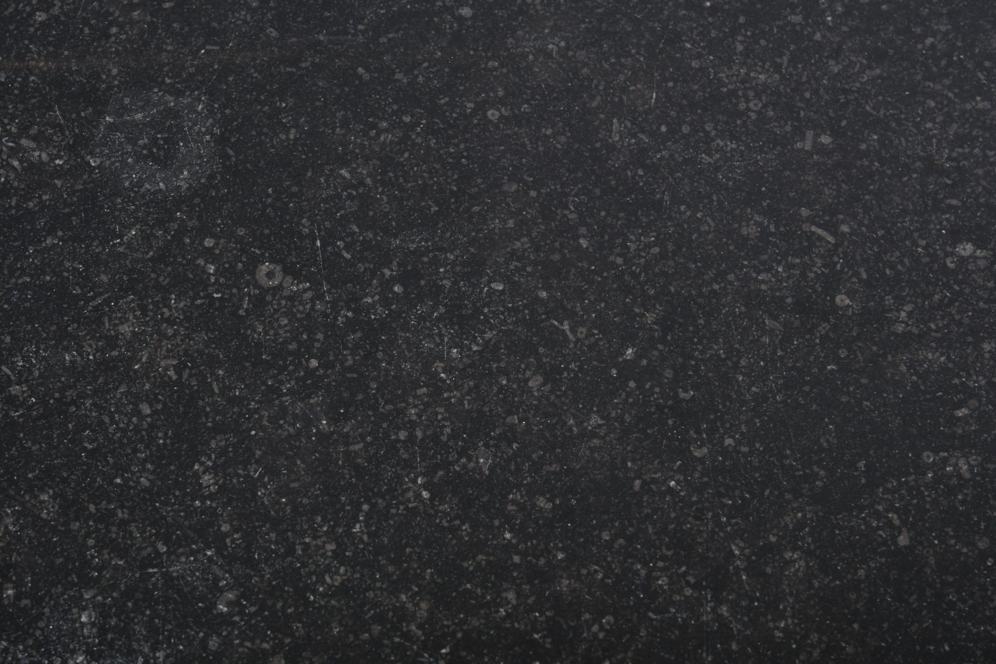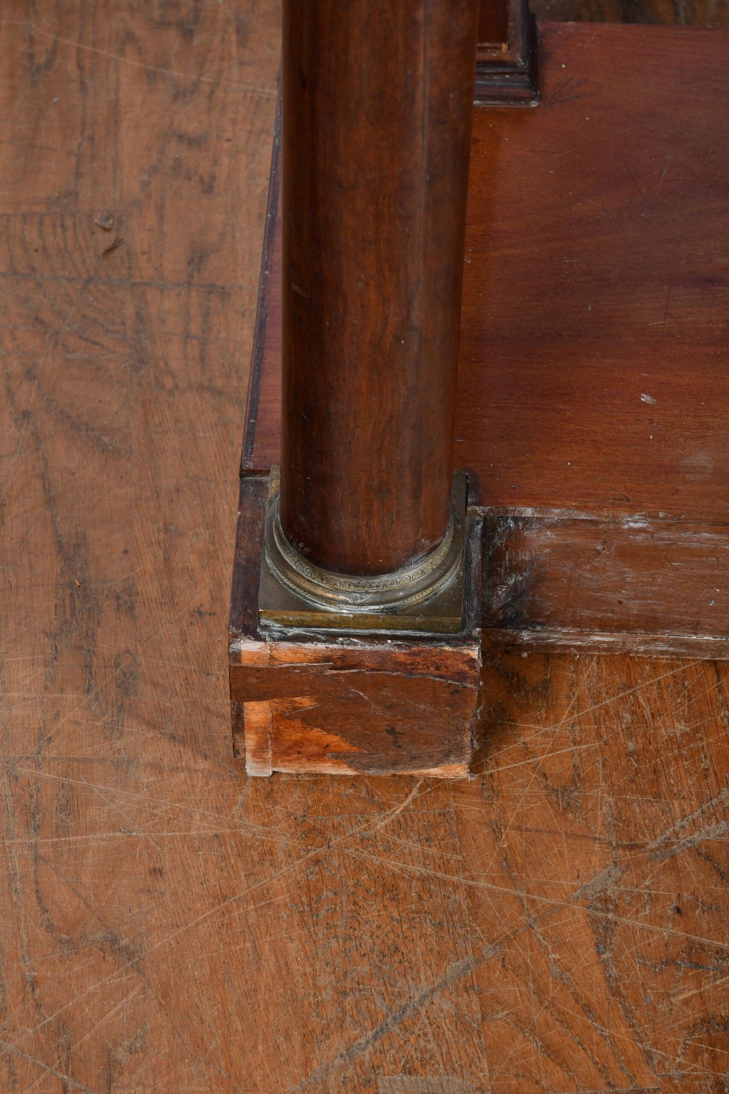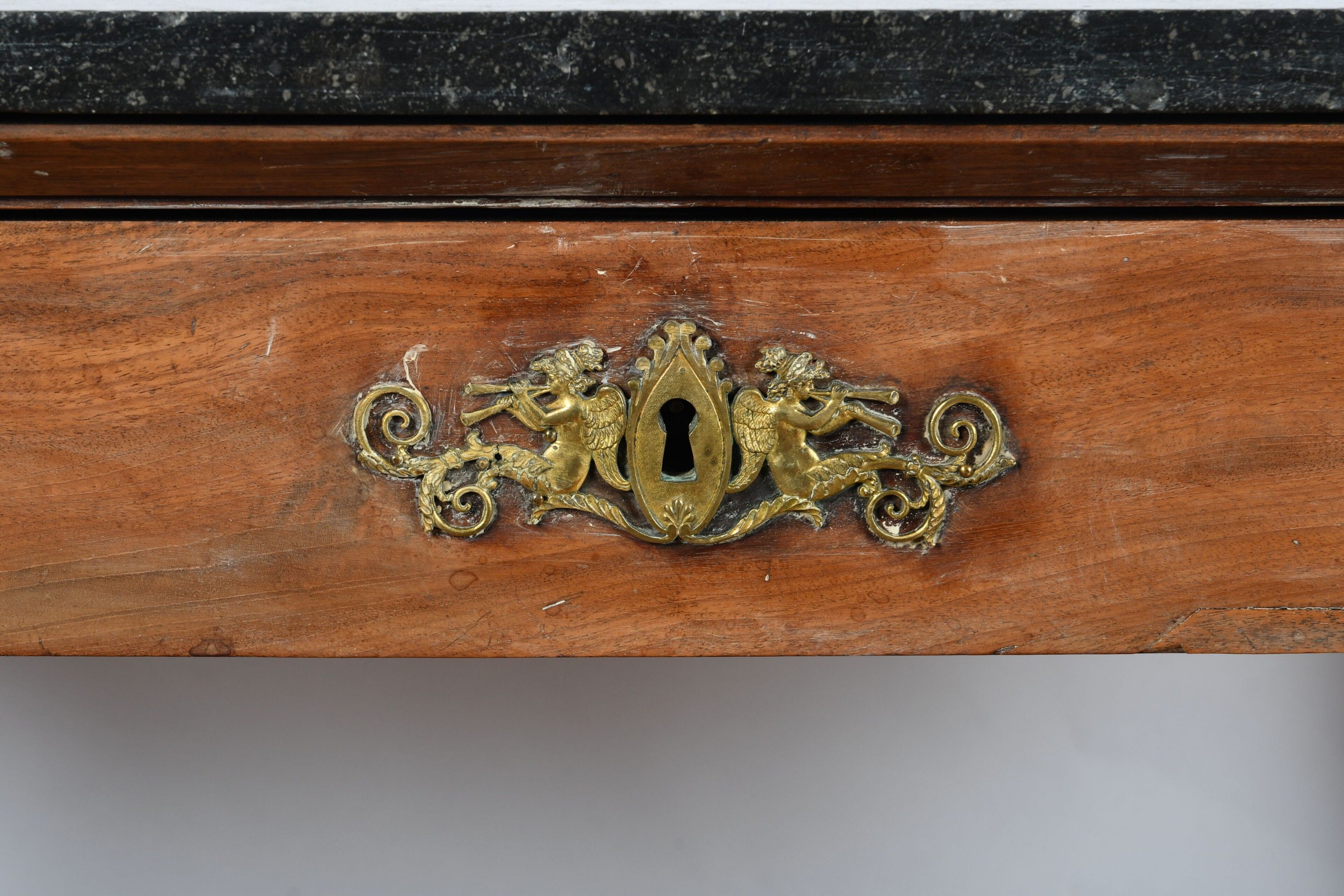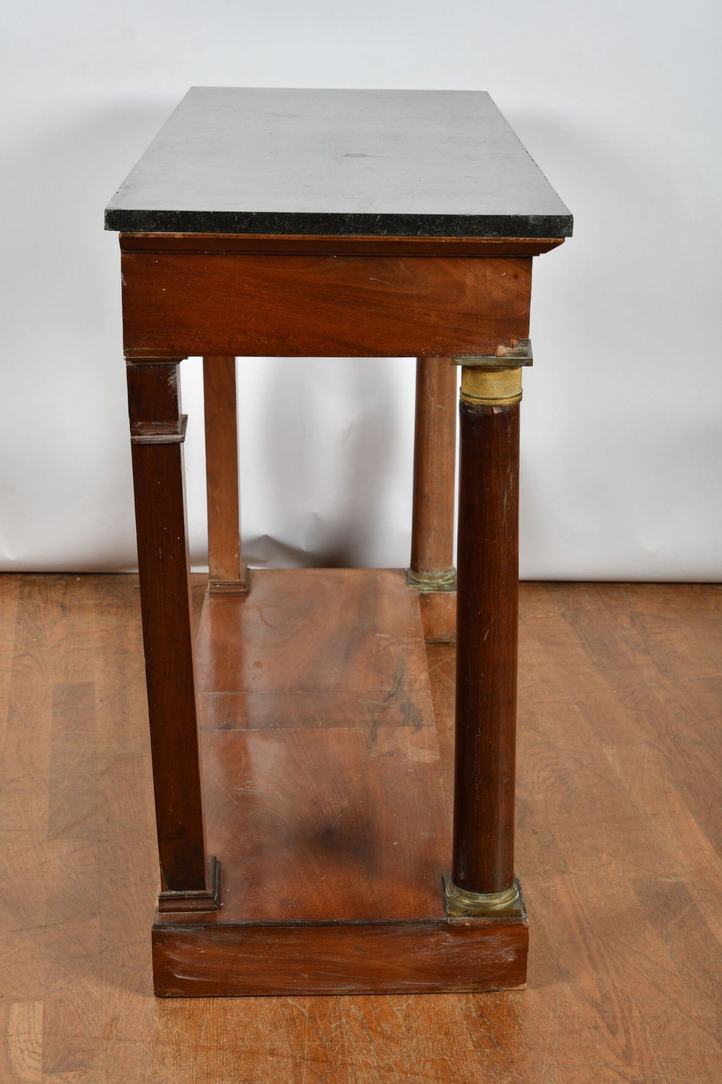 A mahogany and veneered CONSOLE with a Belgian granite top opening to a drawer in the waist and standing on four legs; the front legs are columnar and joined by a brace forming an entablature plinth. Bronze ornamentation for the keyhole and column capitals. H. 86 - W. 112.5 - D. 45 cm. Missing veneer and significant wear.