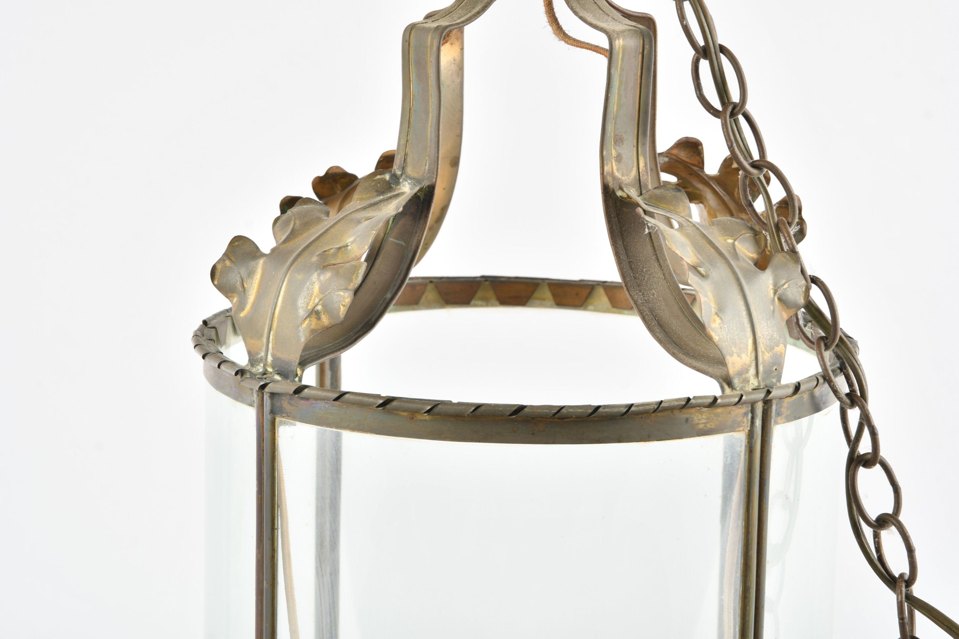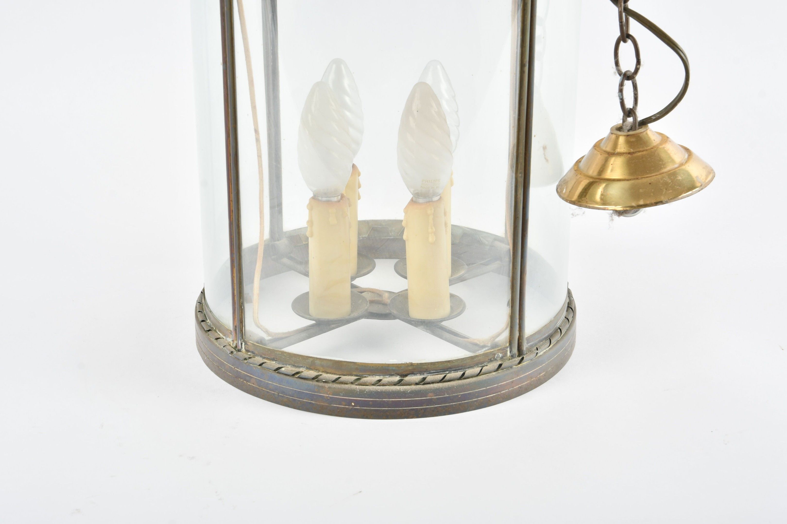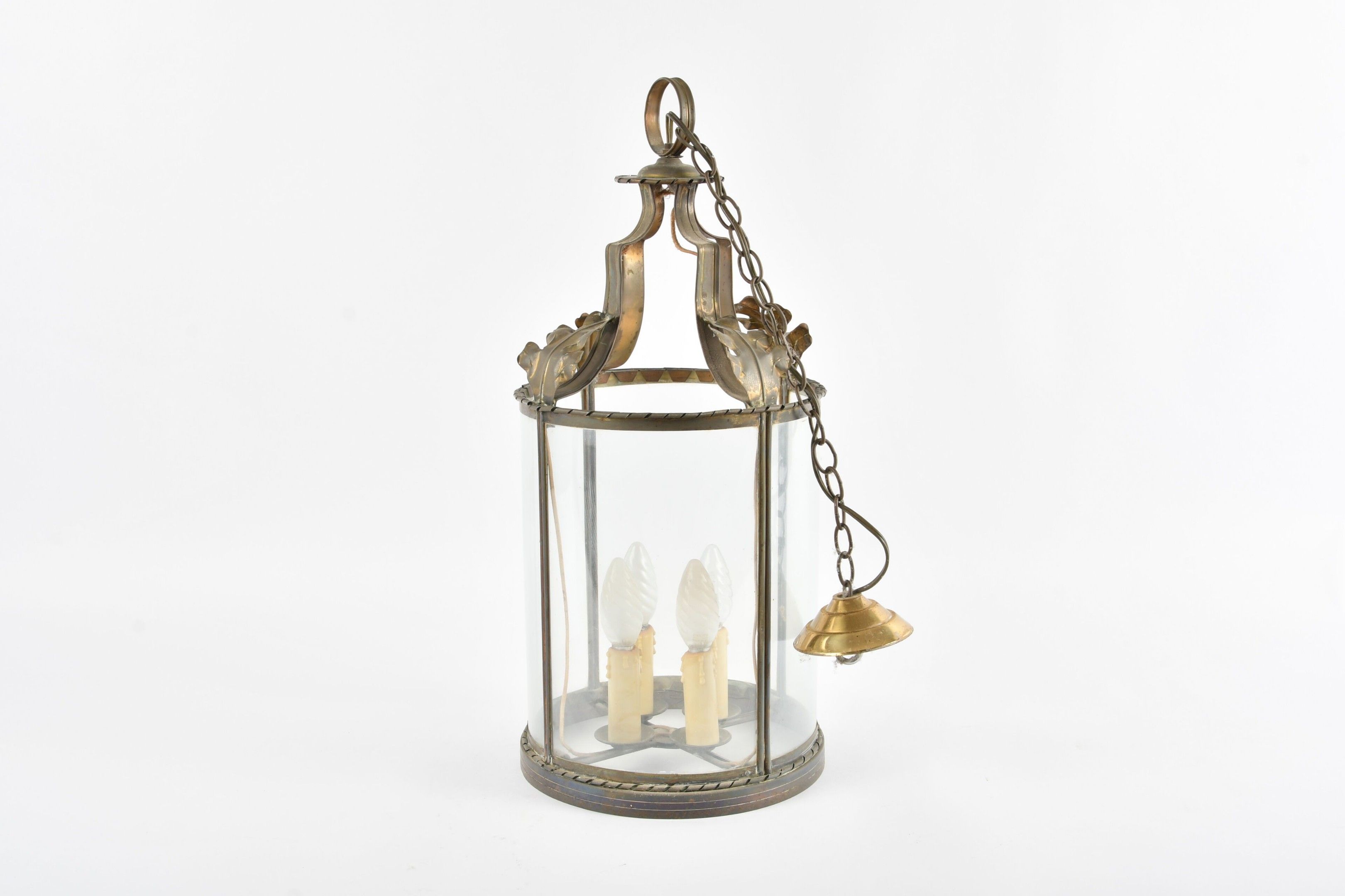 Cylindrical brass LANTERN with four lights. Decorated with a frieze of ribbons and foliage. H. 57 (without chain). Electrified.