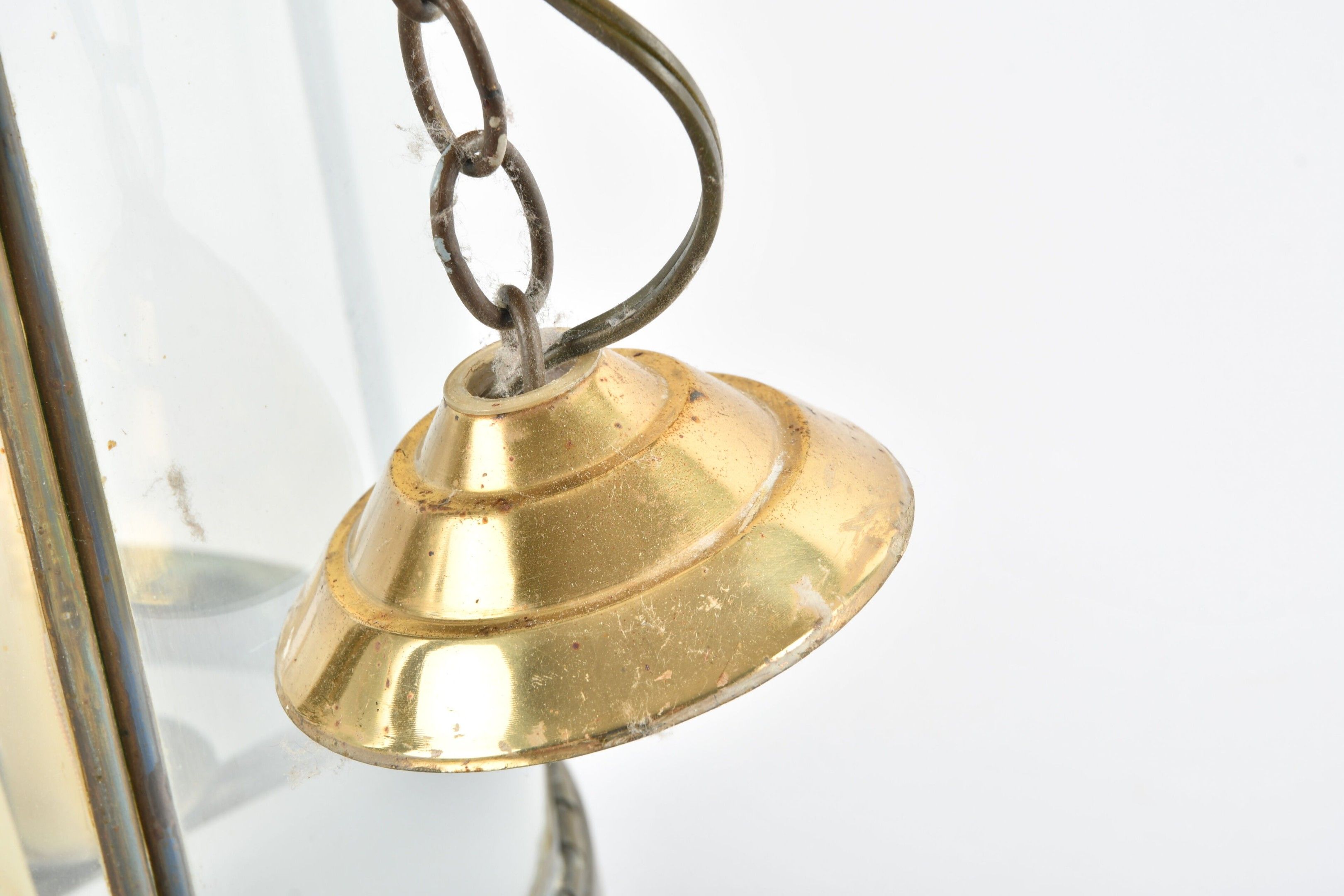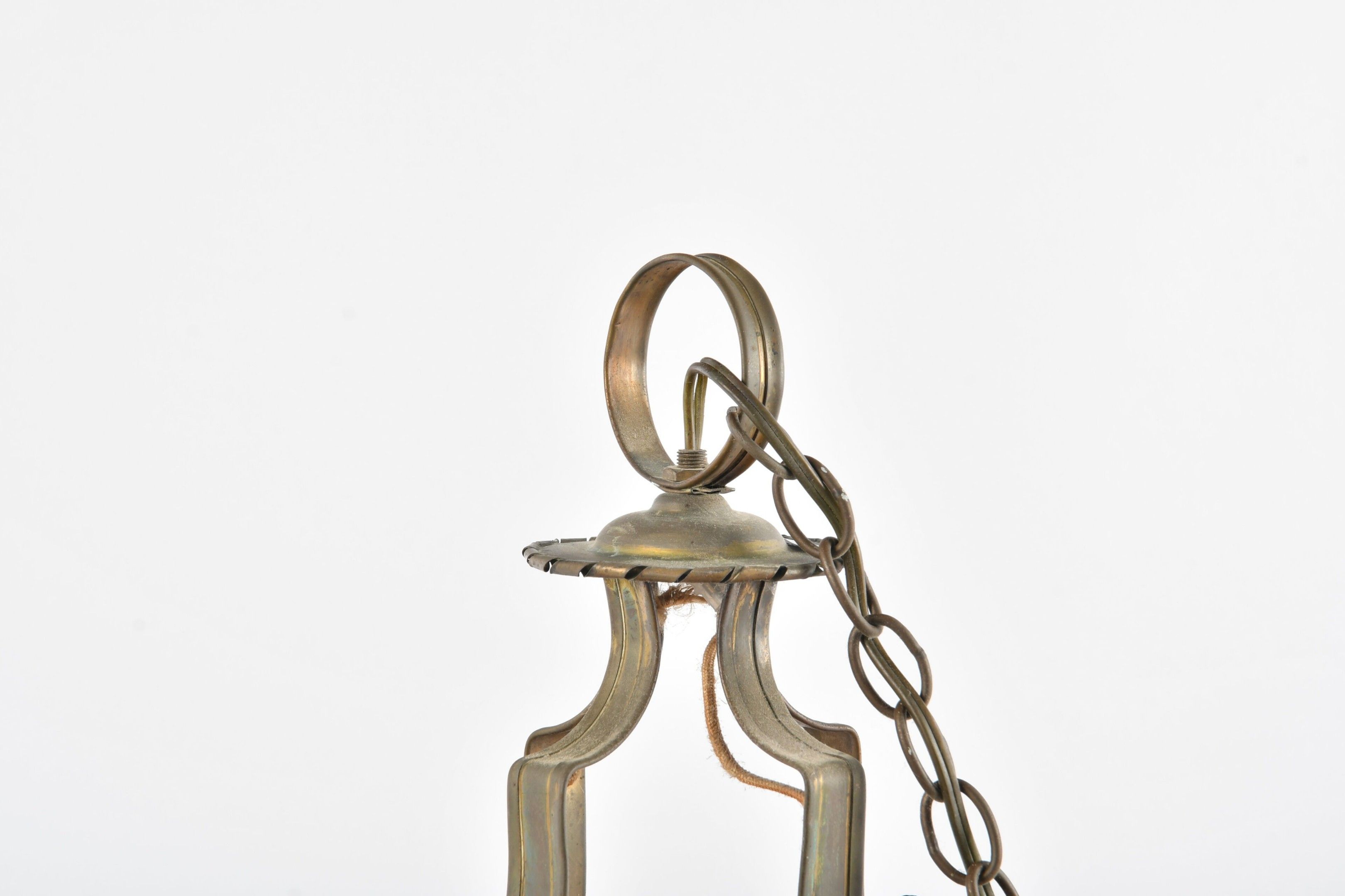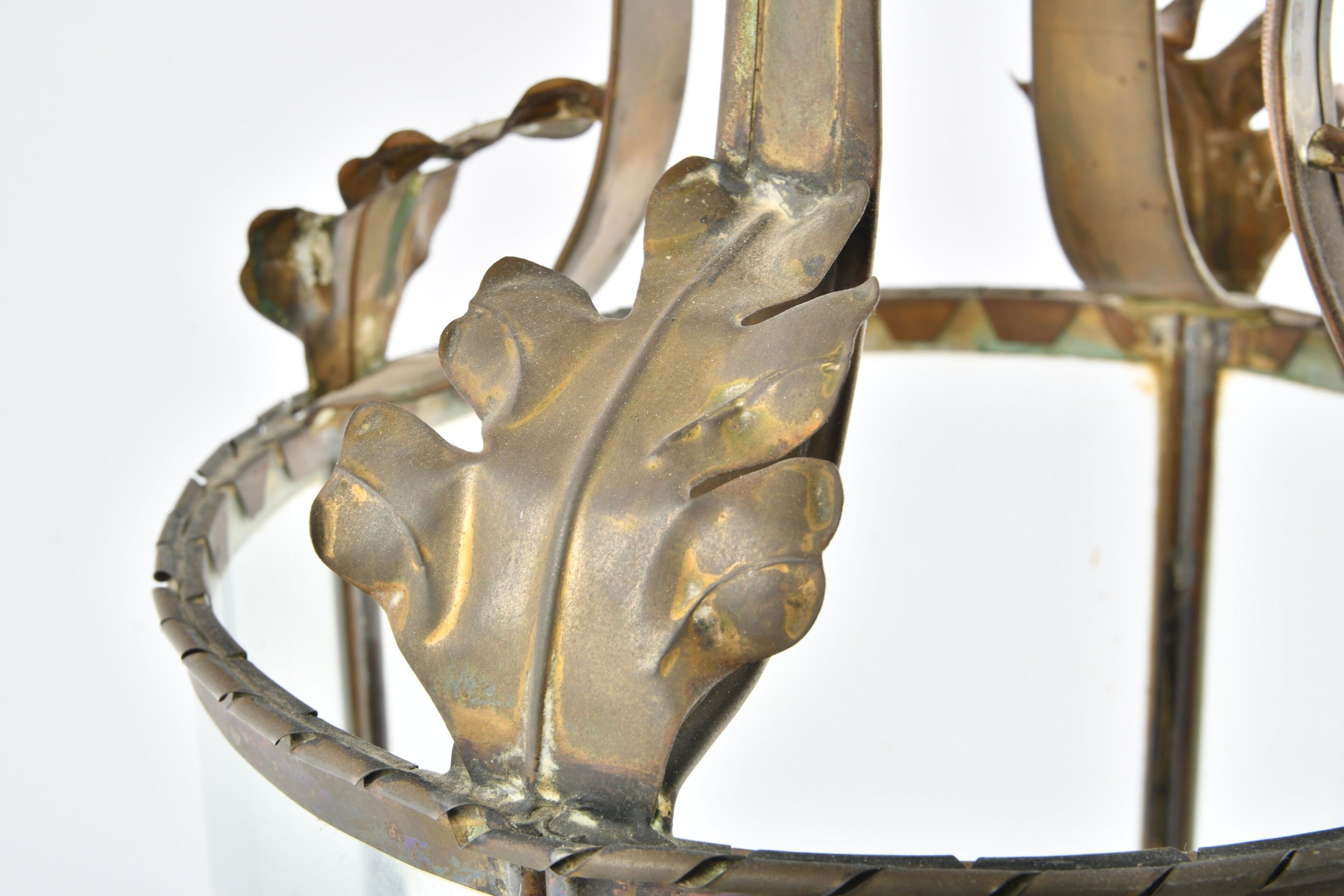 Cylindrical brass LANTERN with four lights. Decorated with a frieze of ribbons and foliage. H. 57 (without chain). Electrified.