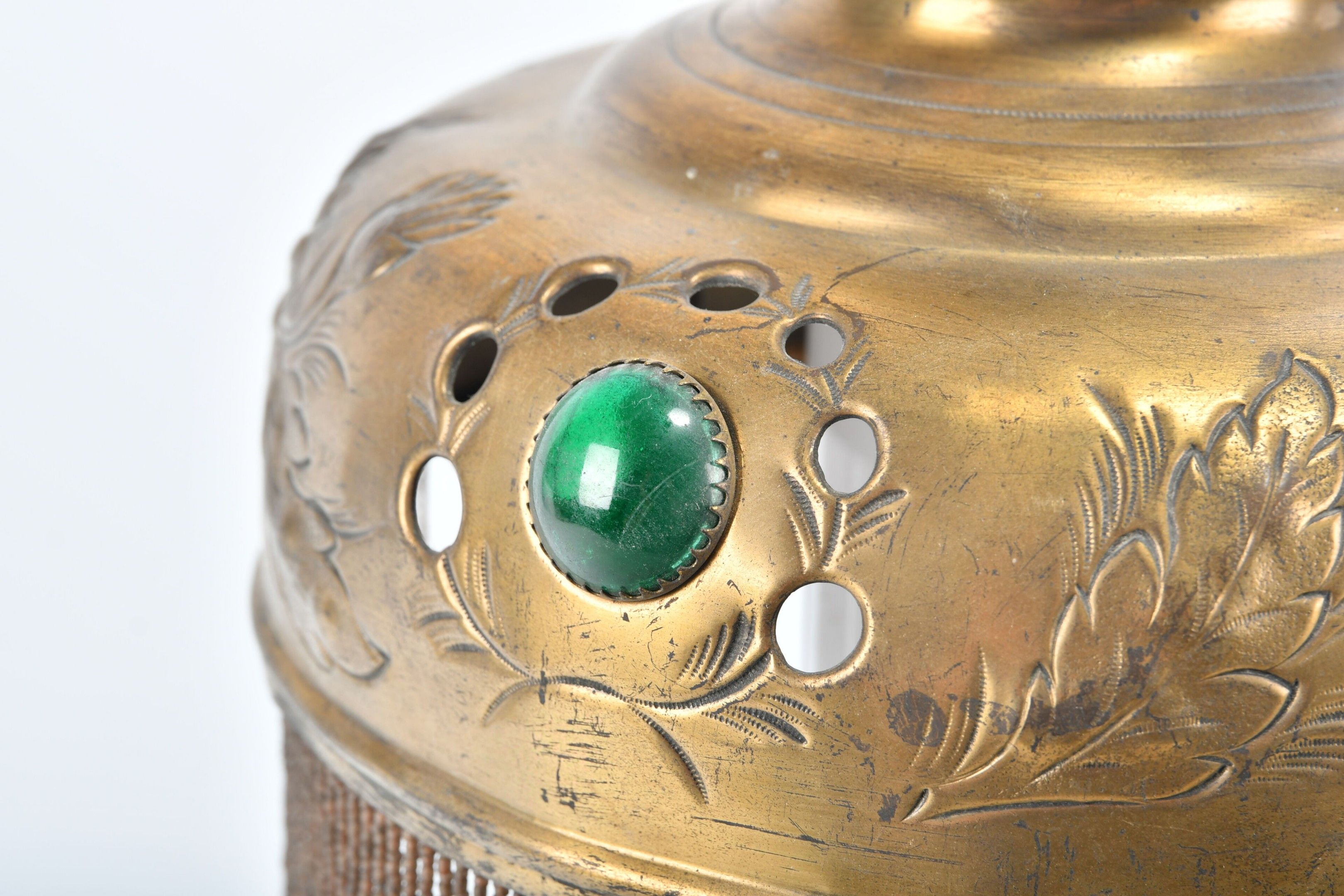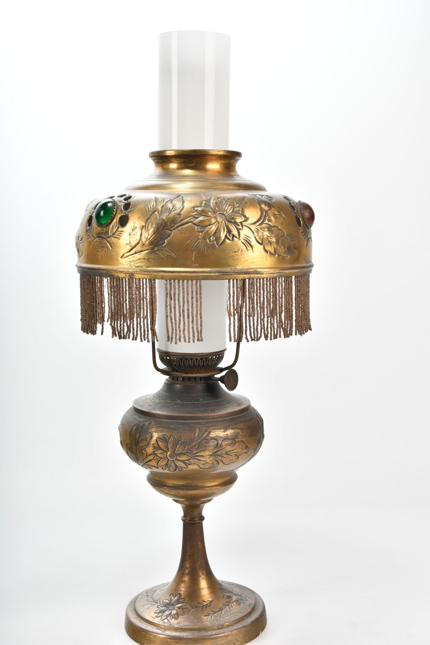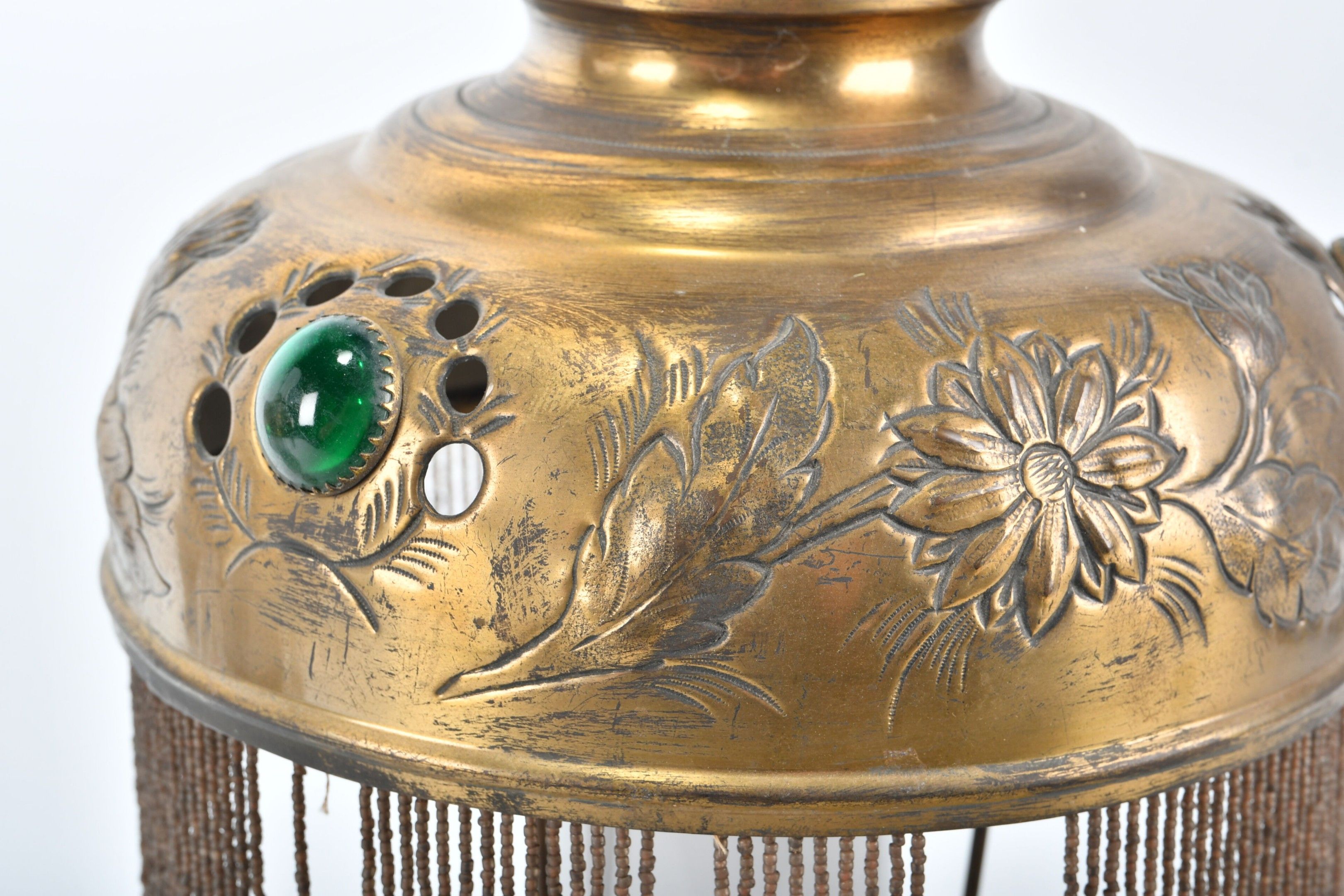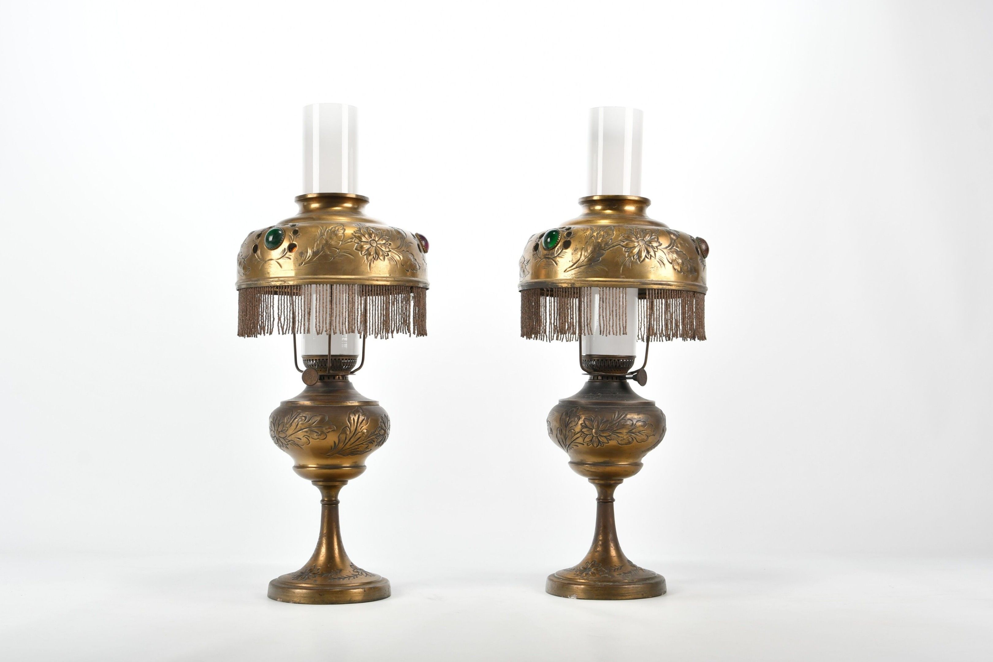 LAMPES (pair of) brass mushroom. Circa 1900. repoussé decoration of floral scrolls and coloured glass cabochons, pearl drops. Height 59 cm. Small chips and cracks to the white opaline glassware; missing pearl drops.