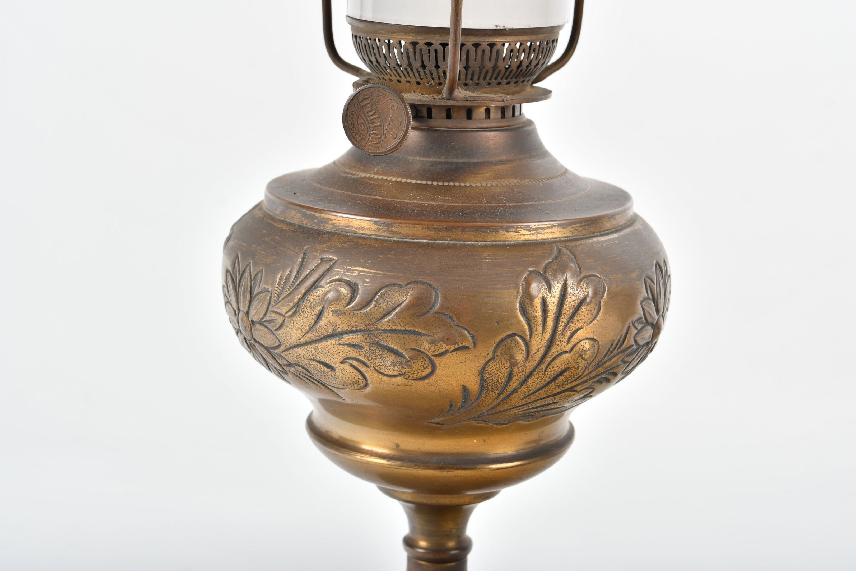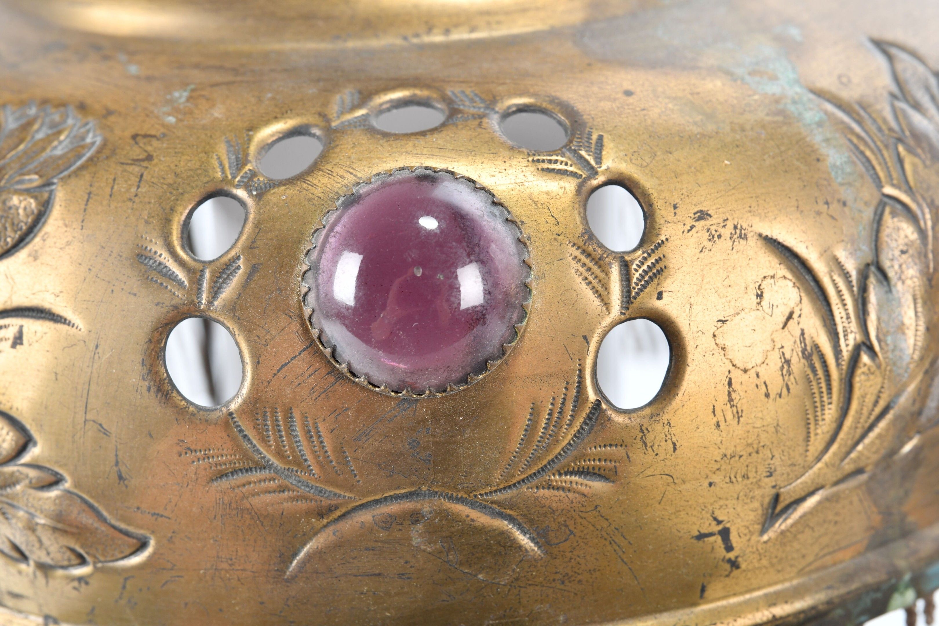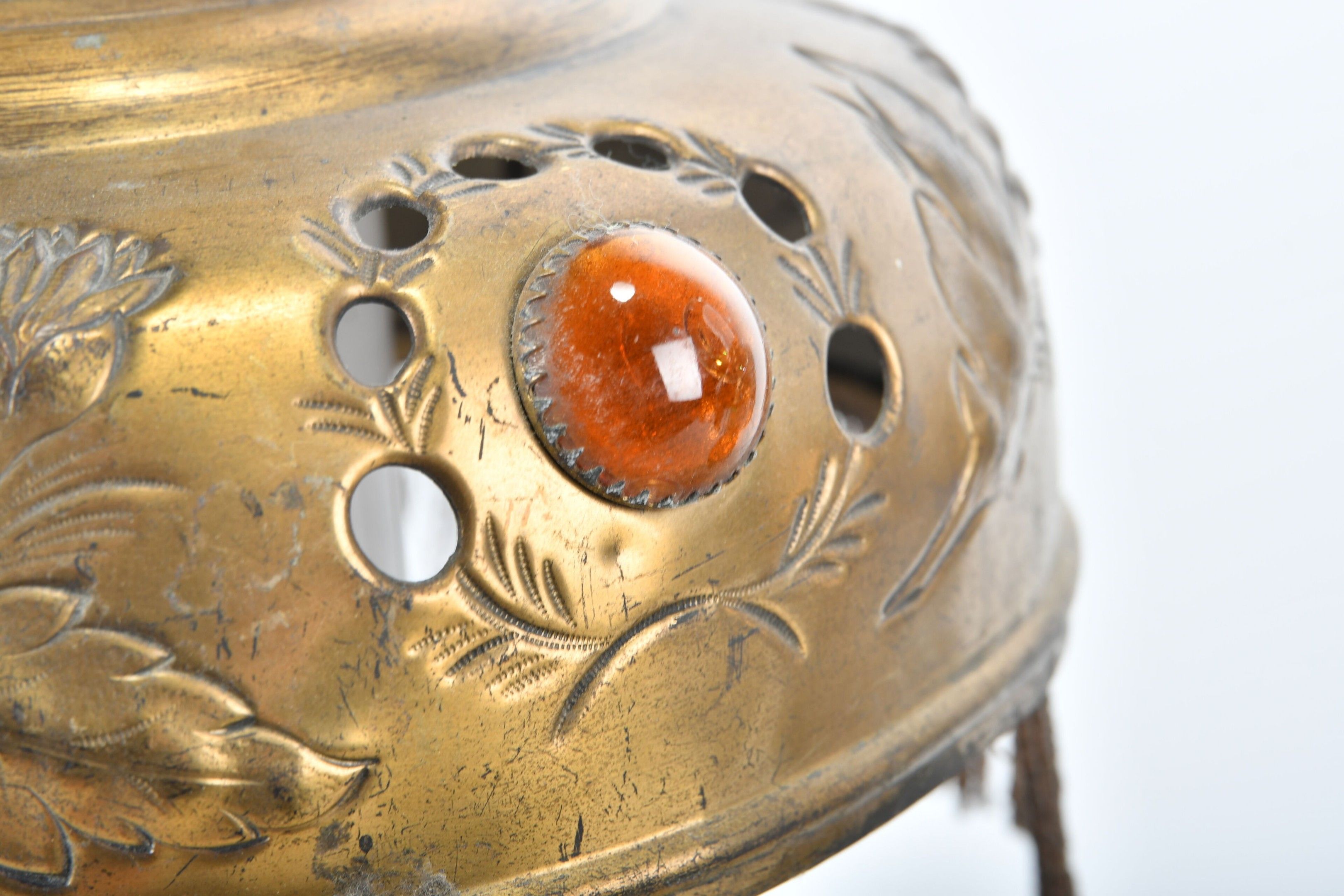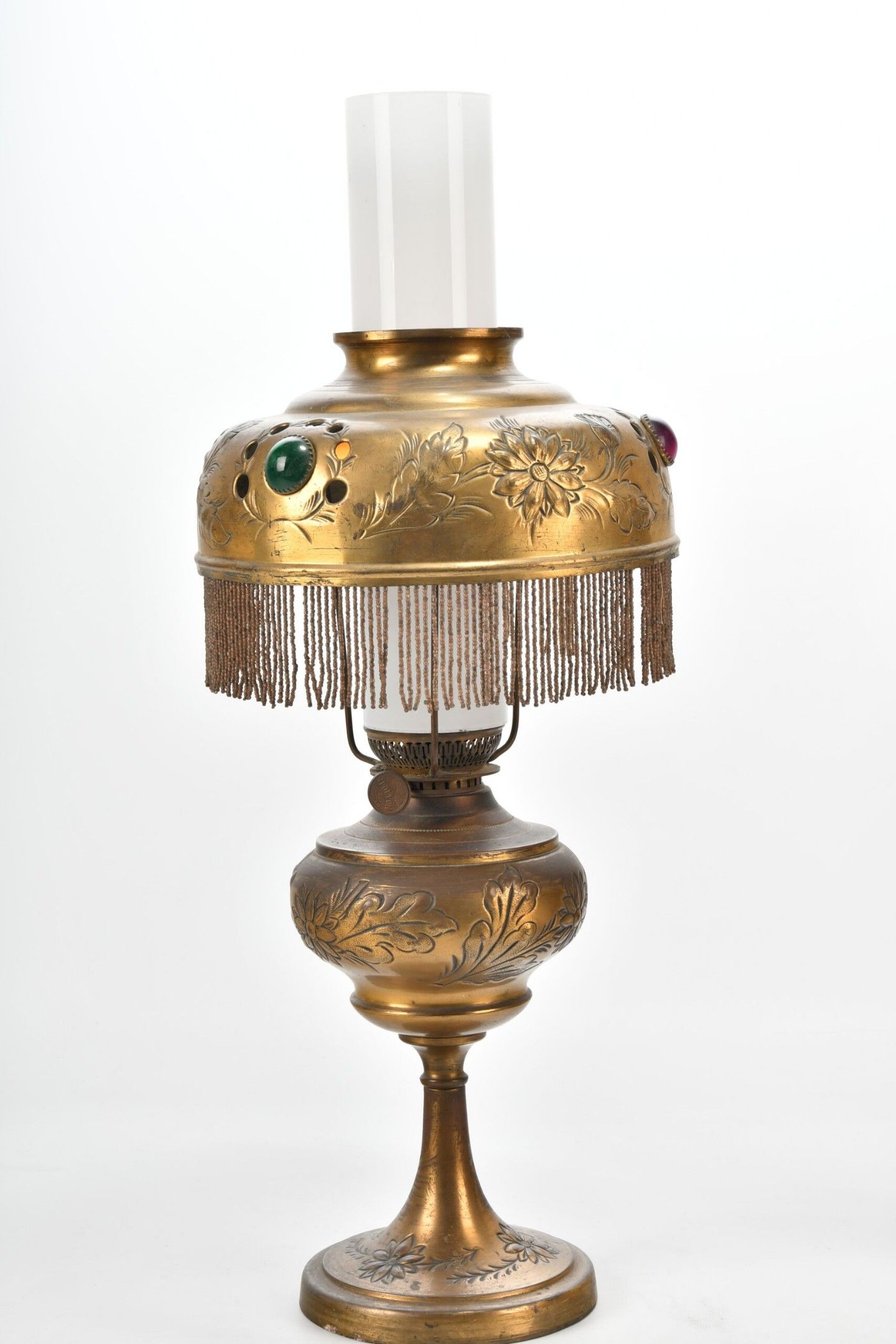 LAMPES (pair of) brass mushroom. Circa 1900. repoussé decoration of floral scrolls and coloured glass cabochons, pearl drops. Height 59 cm. Small chips and cracks to the white opaline glassware; missing pearl drops.