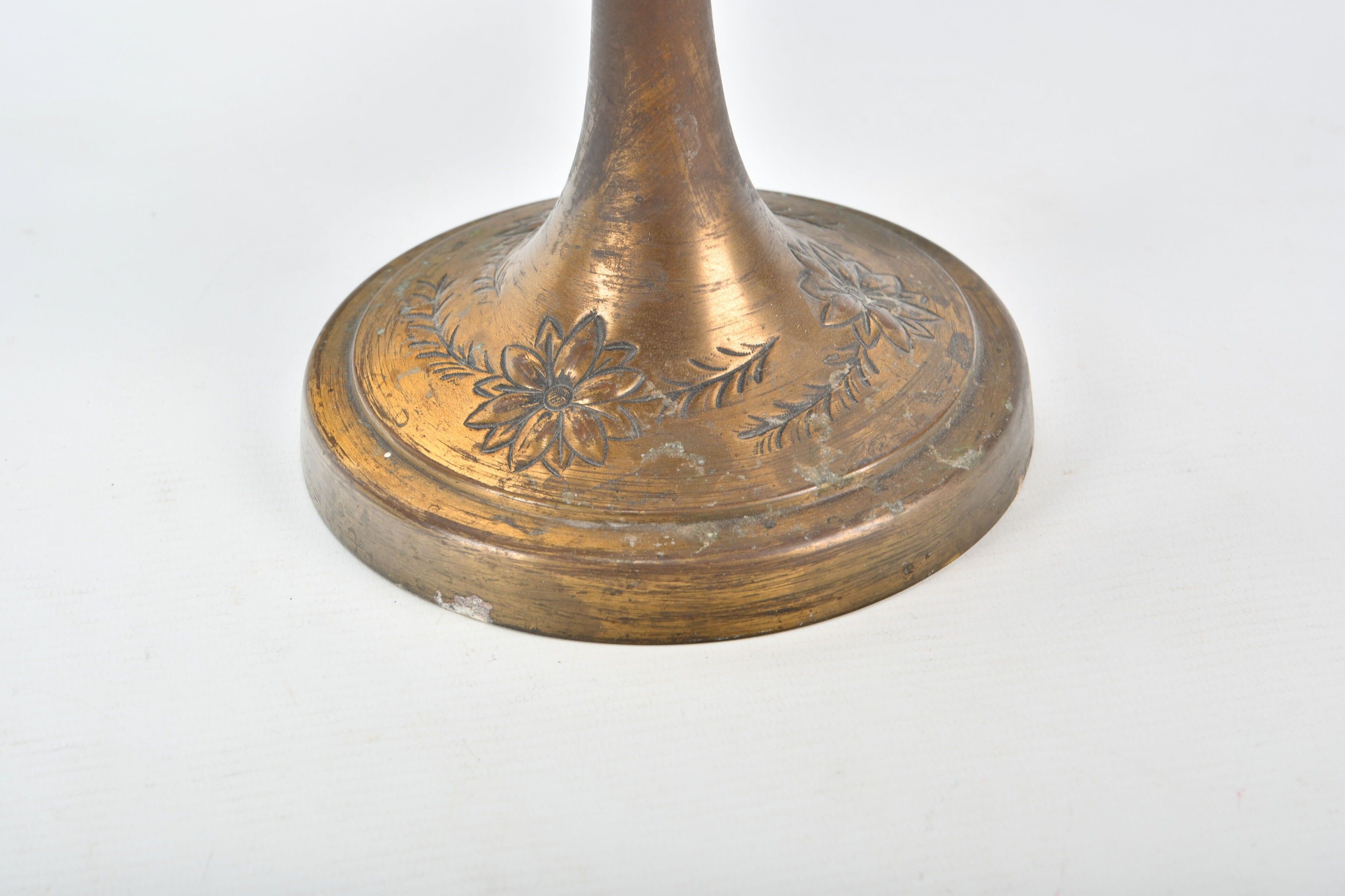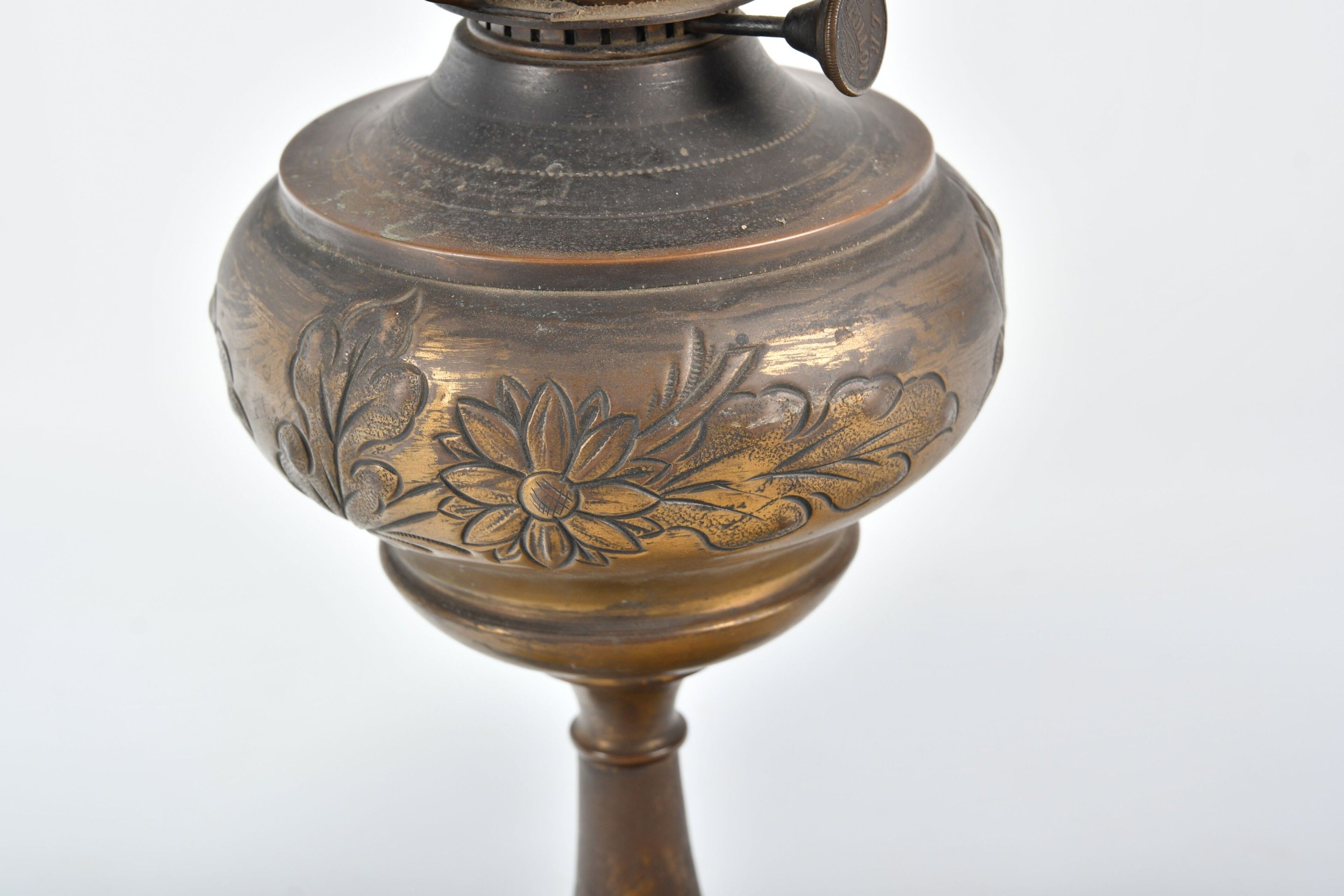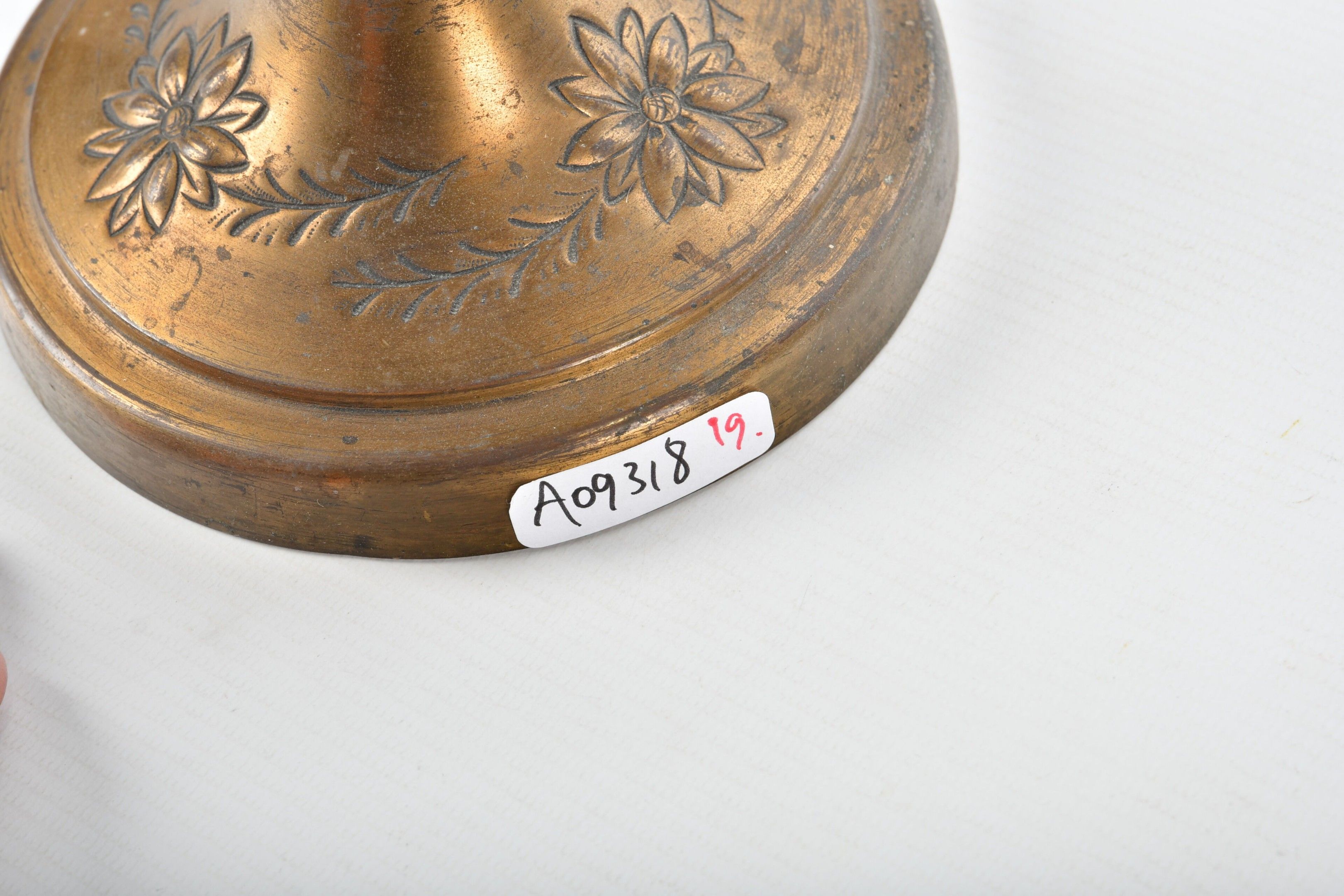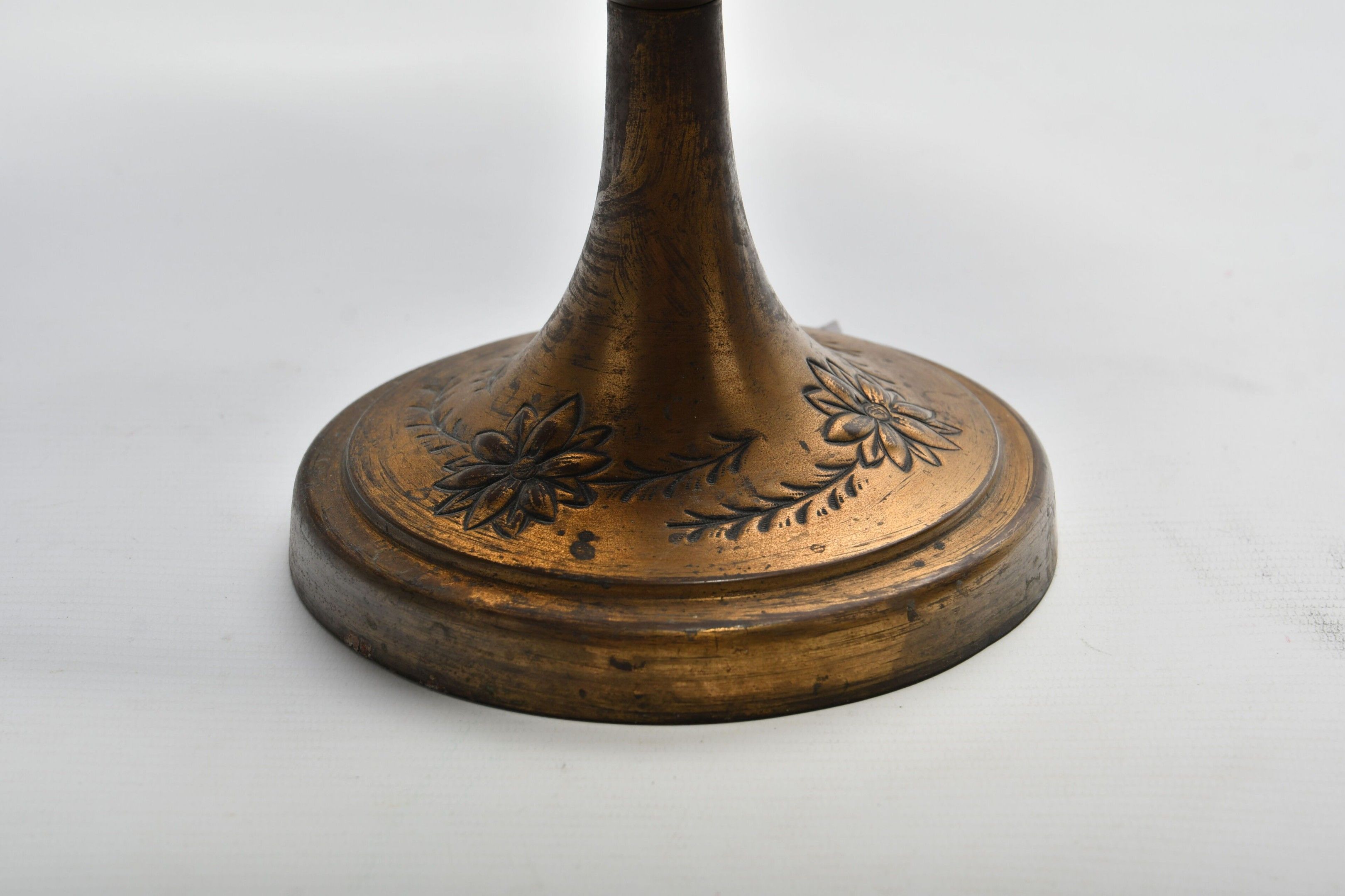 LAMPES (pair of) brass mushroom. Circa 1900. repoussé decoration of floral scrolls and coloured glass cabochons, pearl drops. Height 59 cm. Small chips and cracks to the white opaline glassware; missing pearl drops.