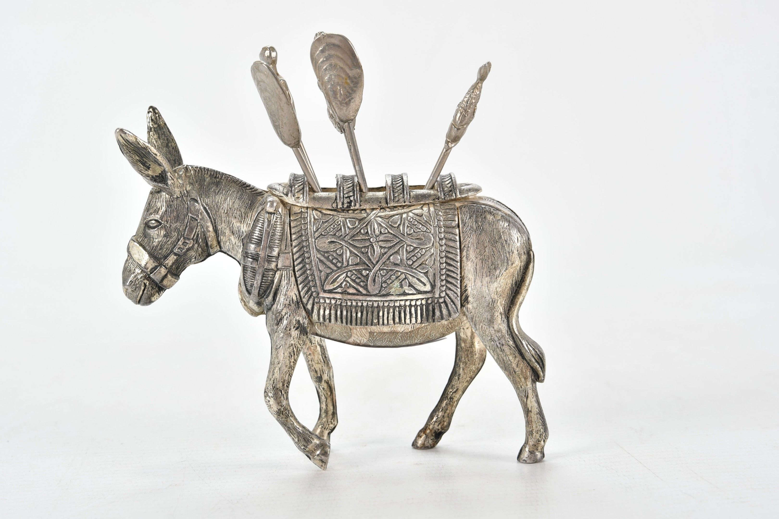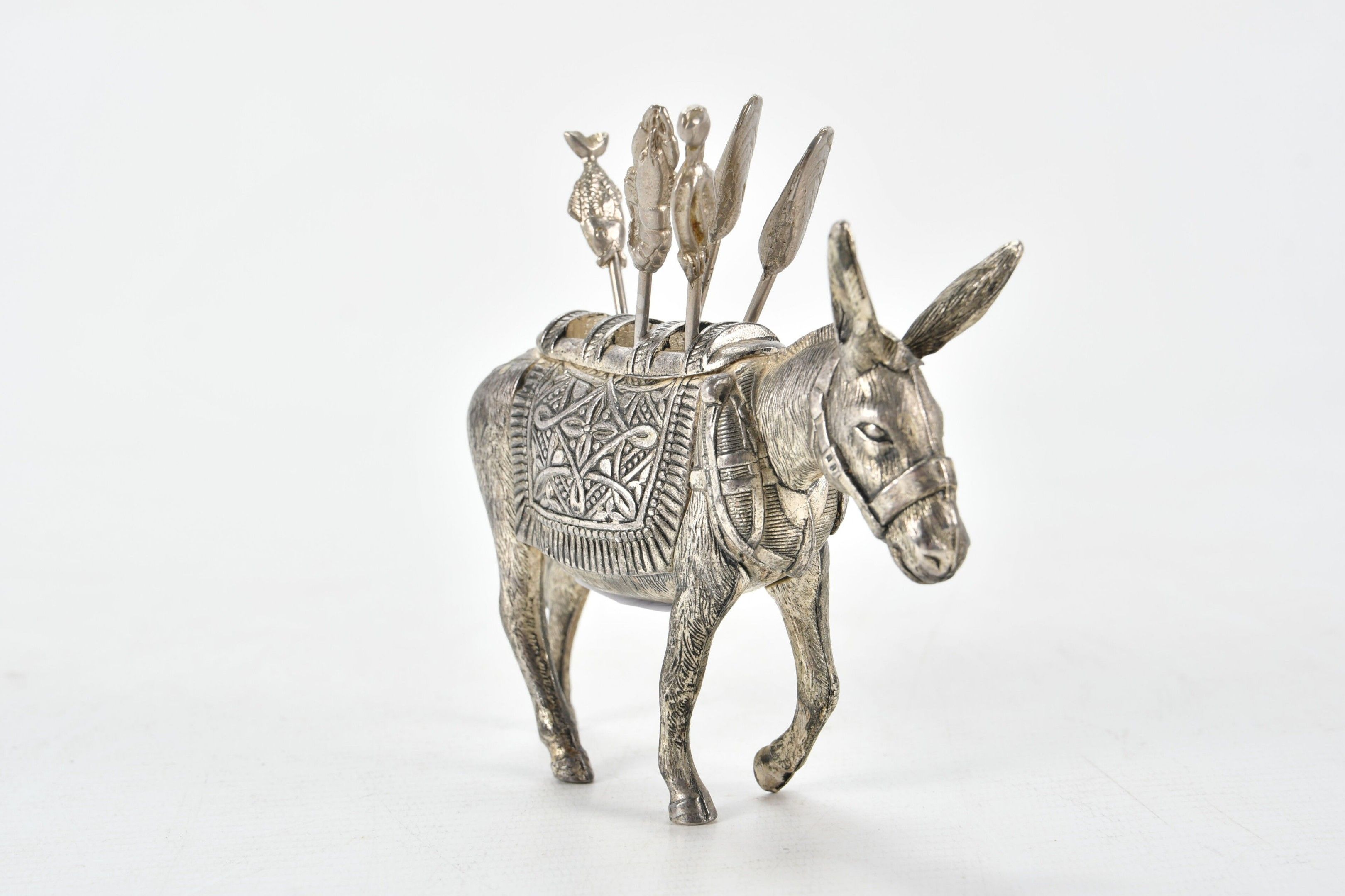 A silver-plated bronze snail or condiment or shellfish pick holder. H. 9.5 - W. 11.5 cm (one pick missing)