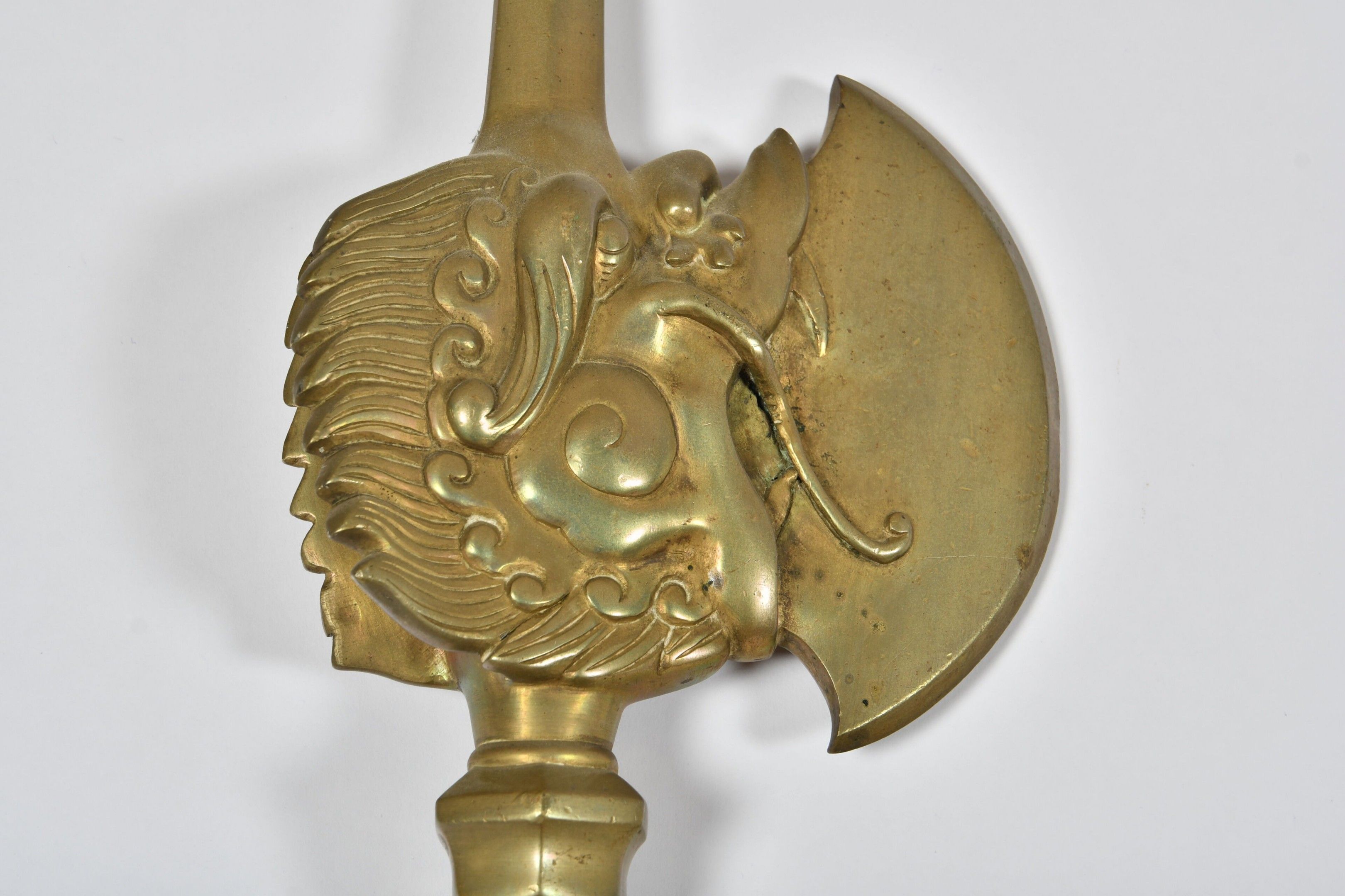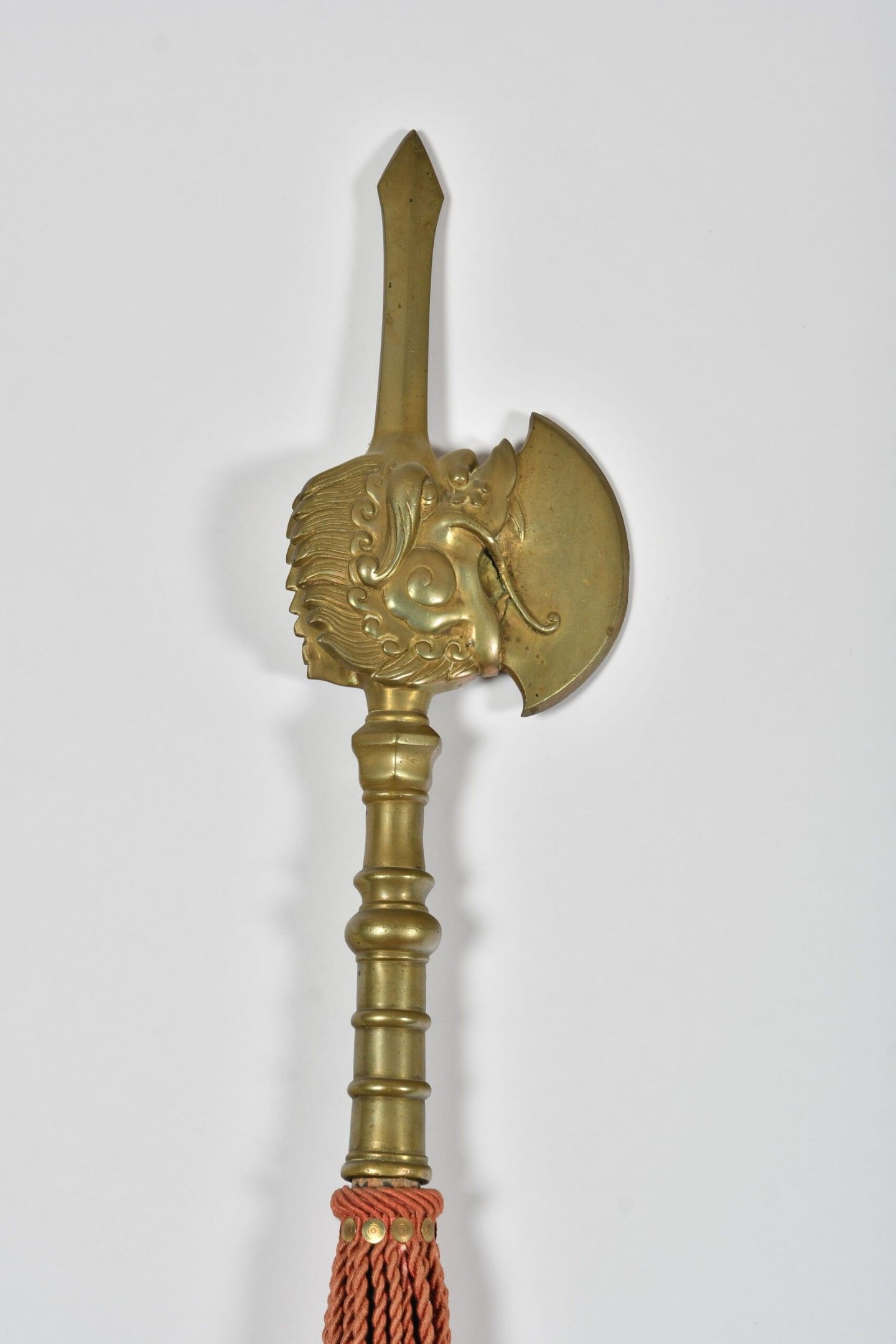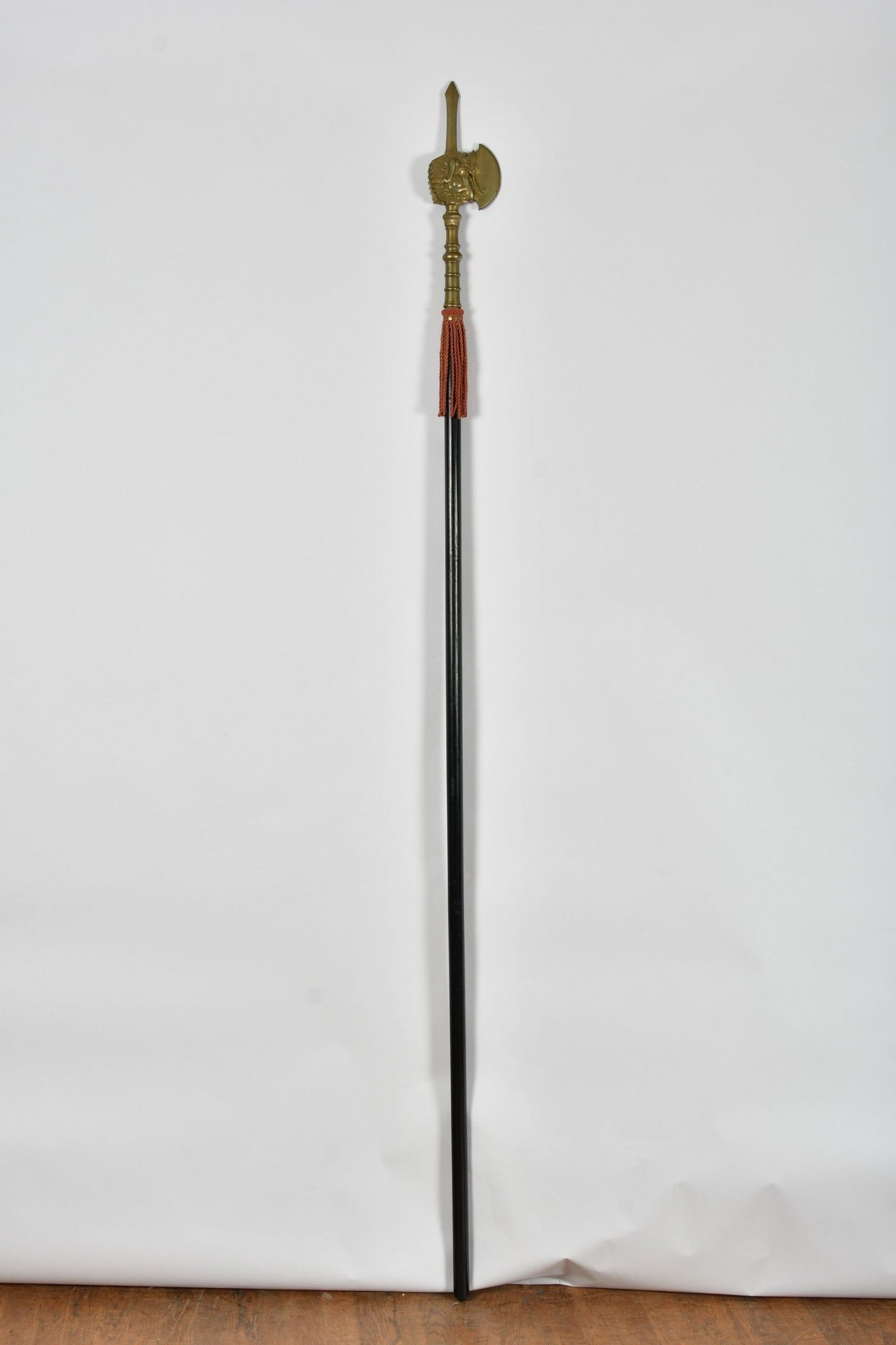 CHINA circa 1900. Halberd in blackened wood, the bronze head decorated with the head of a dragon with its mouth open. Height 244 cm