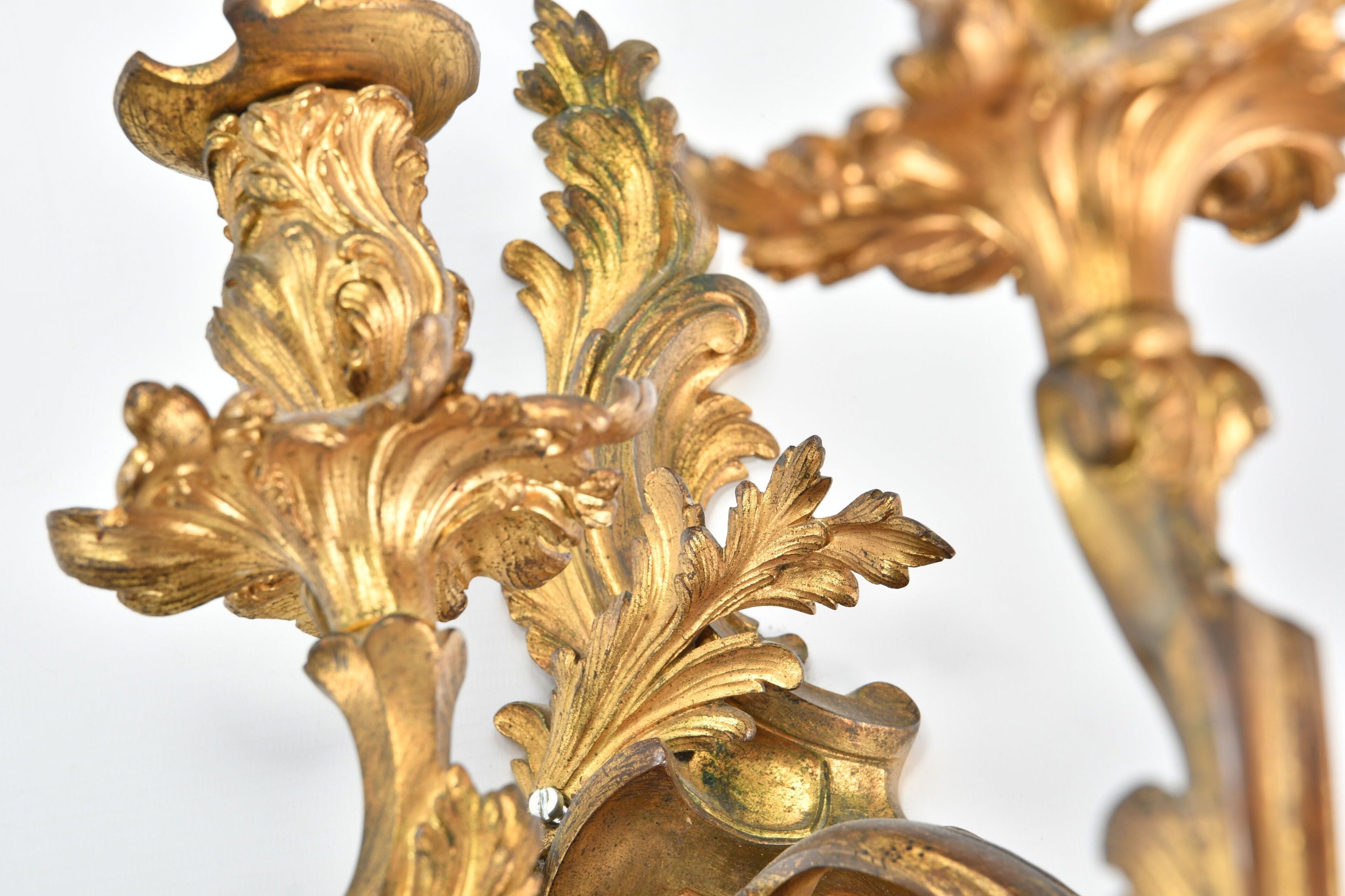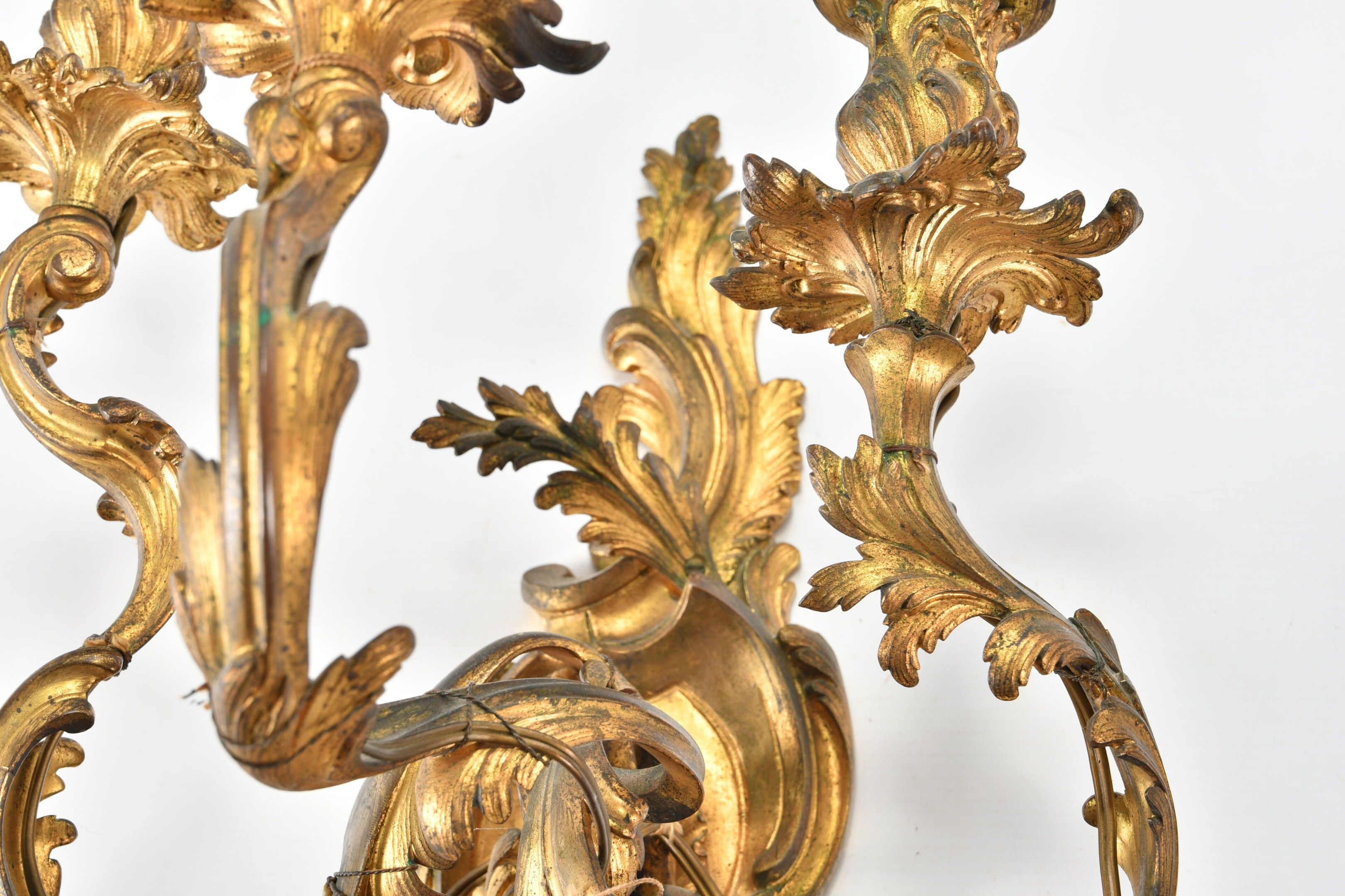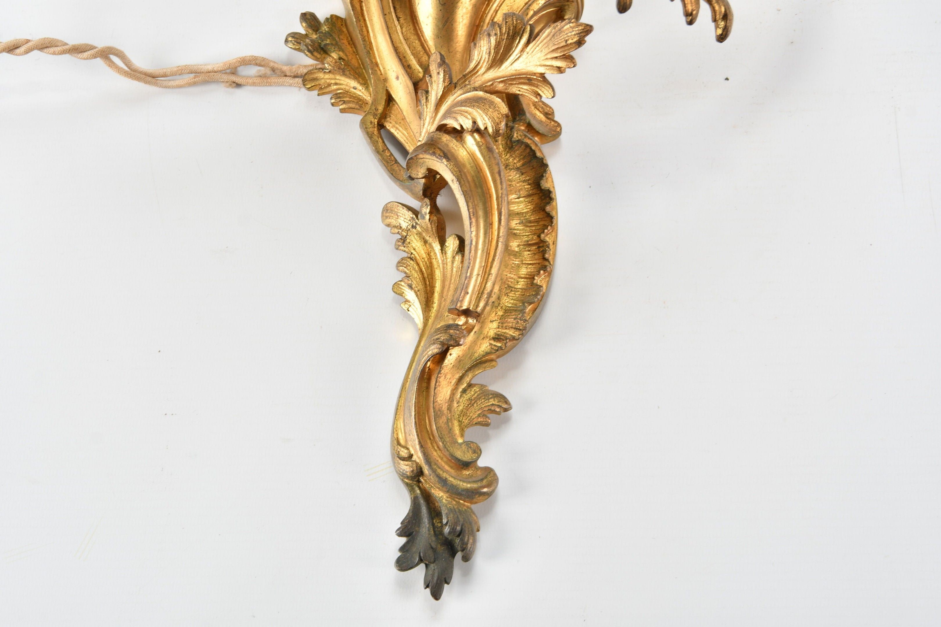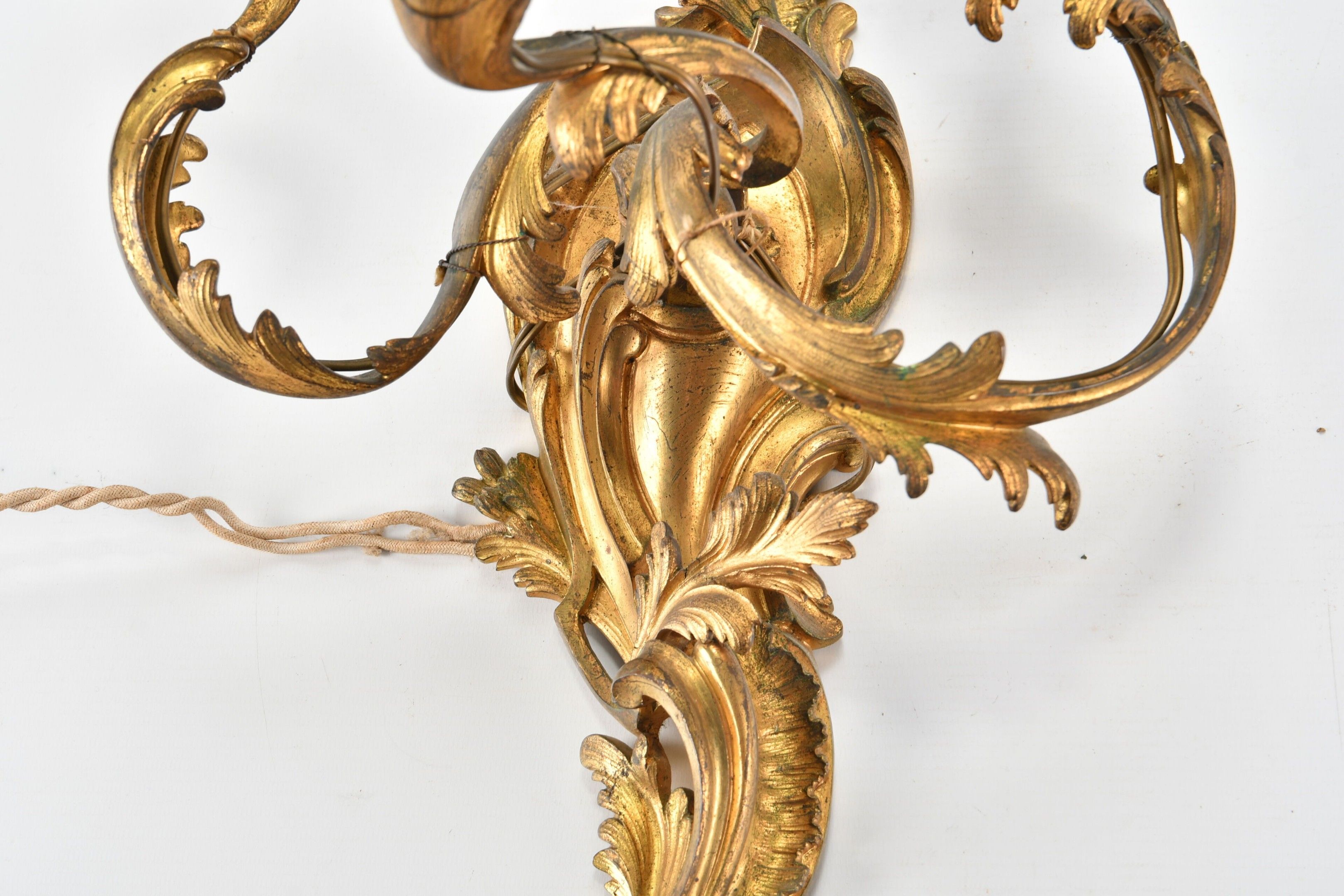 A gilt bronze wall light (large) with two arms of light and rocaille decoration of acanthus leaves and water leaves. Louis XV style, 19th century. H. 54.5 - D. 32 cm