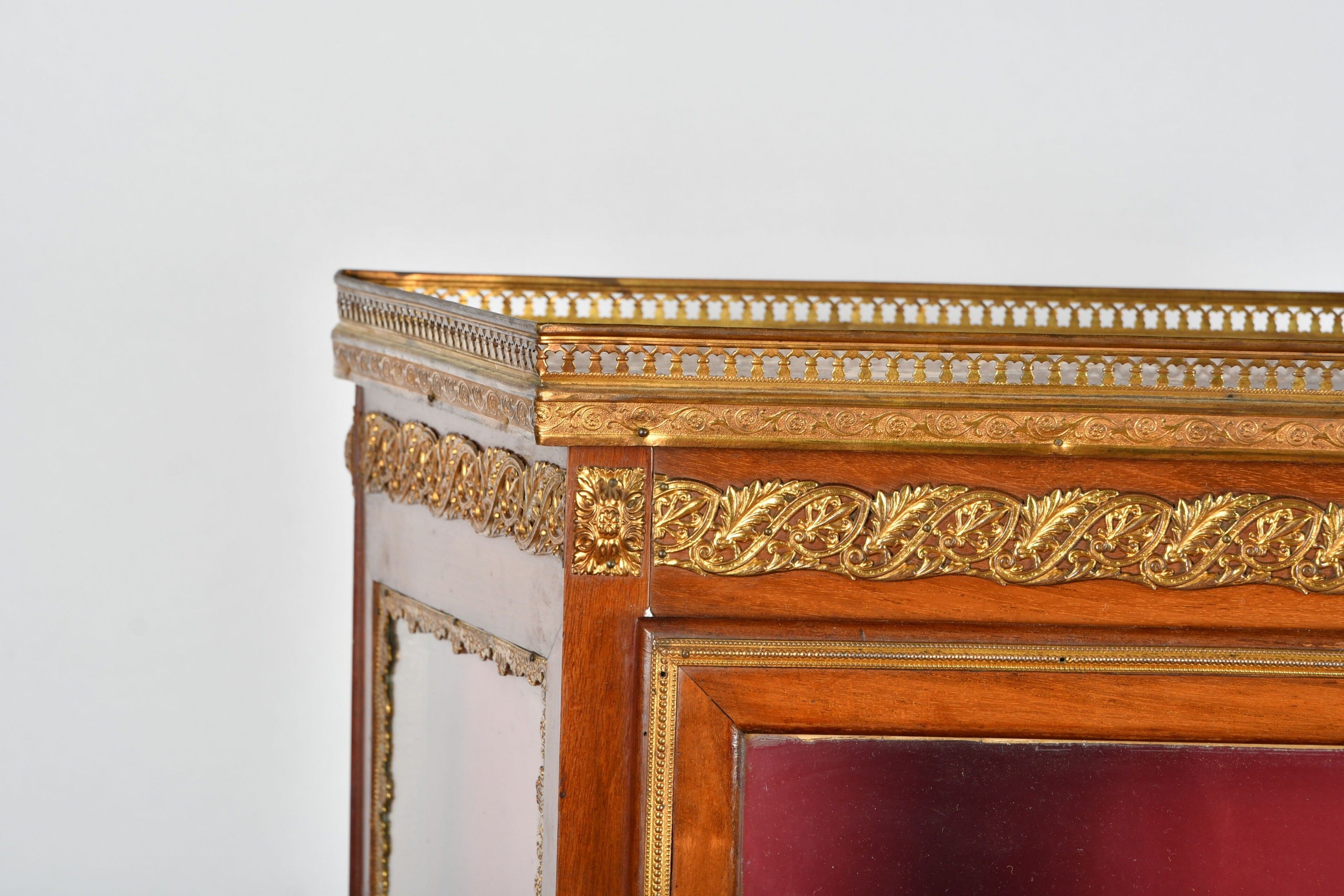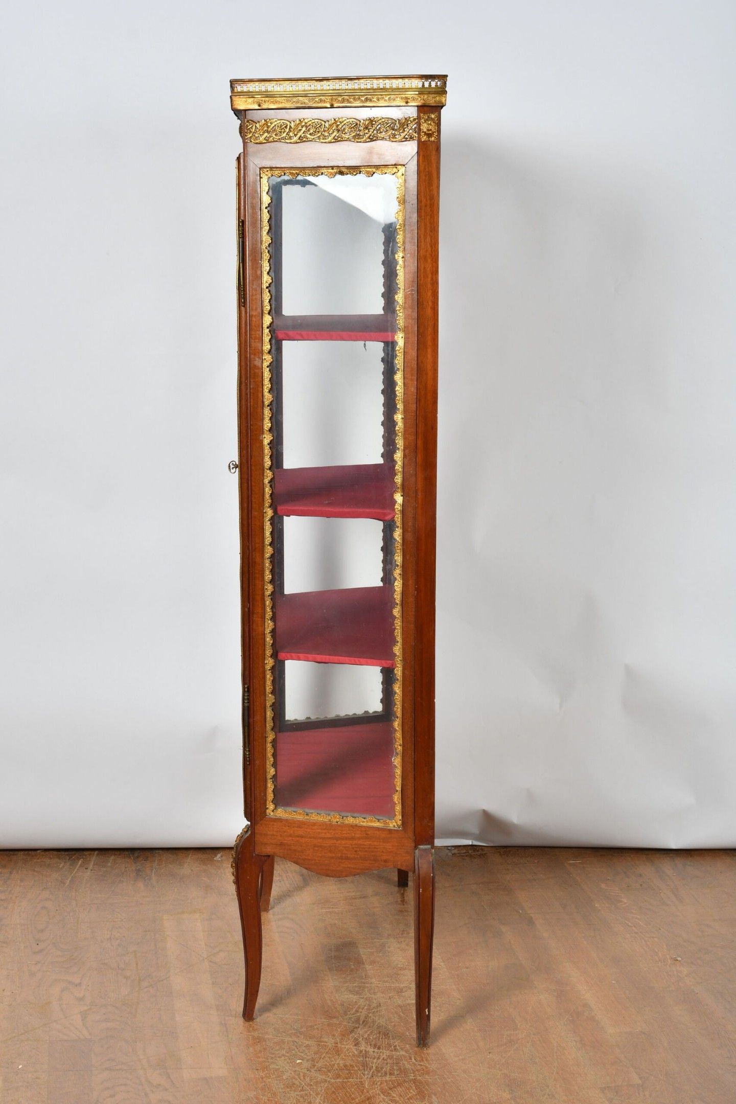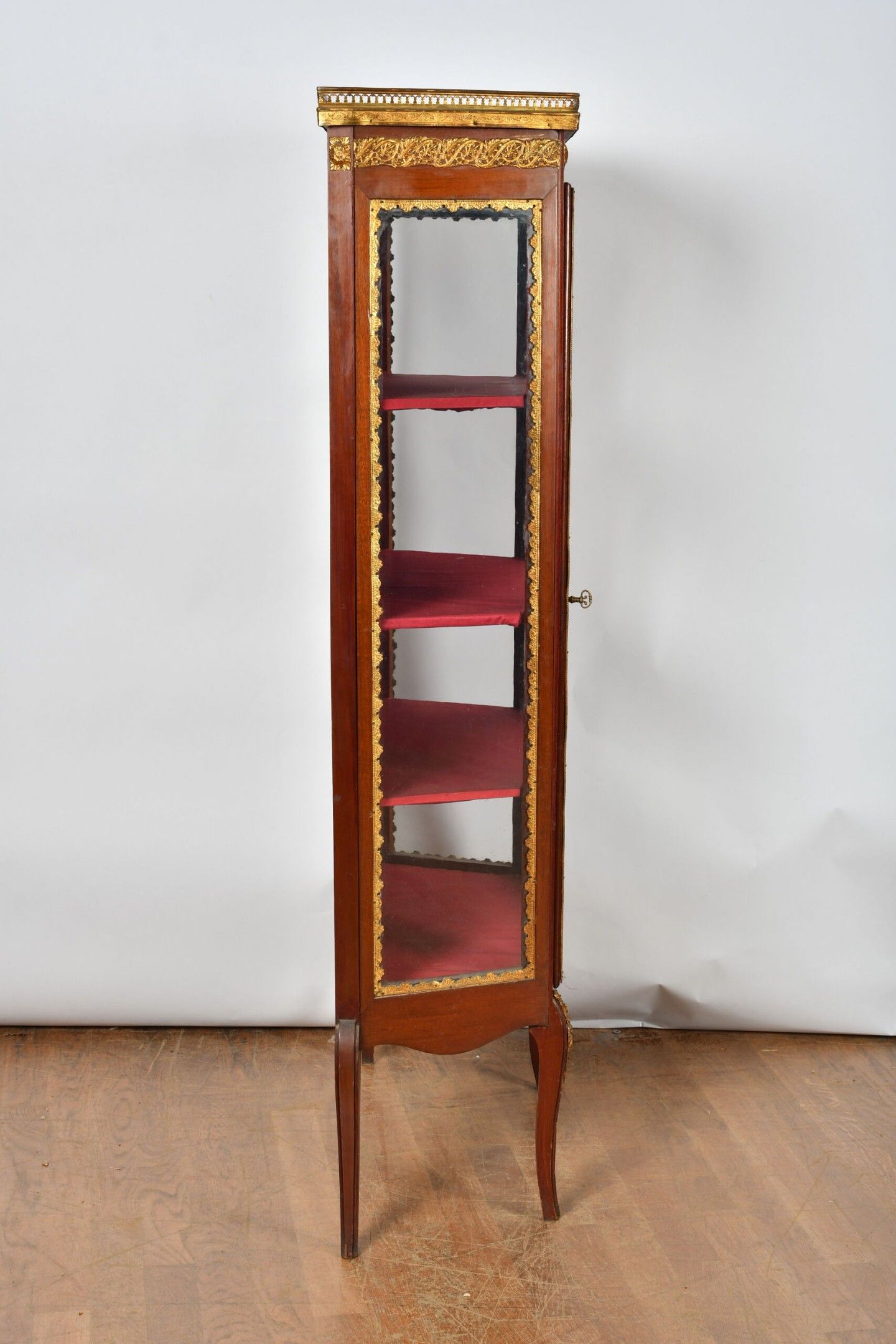 Mahogany and veneer VITRINE opening to a glass door. Red veined marble top surrounded by a brass gallery. The sides are also glazed and slightly flared. The top rests on curved legs. Gilt bronze ornamentation. Louis XVI style; 19th century. H. 142 - W. 69 - D. 30.5 cm