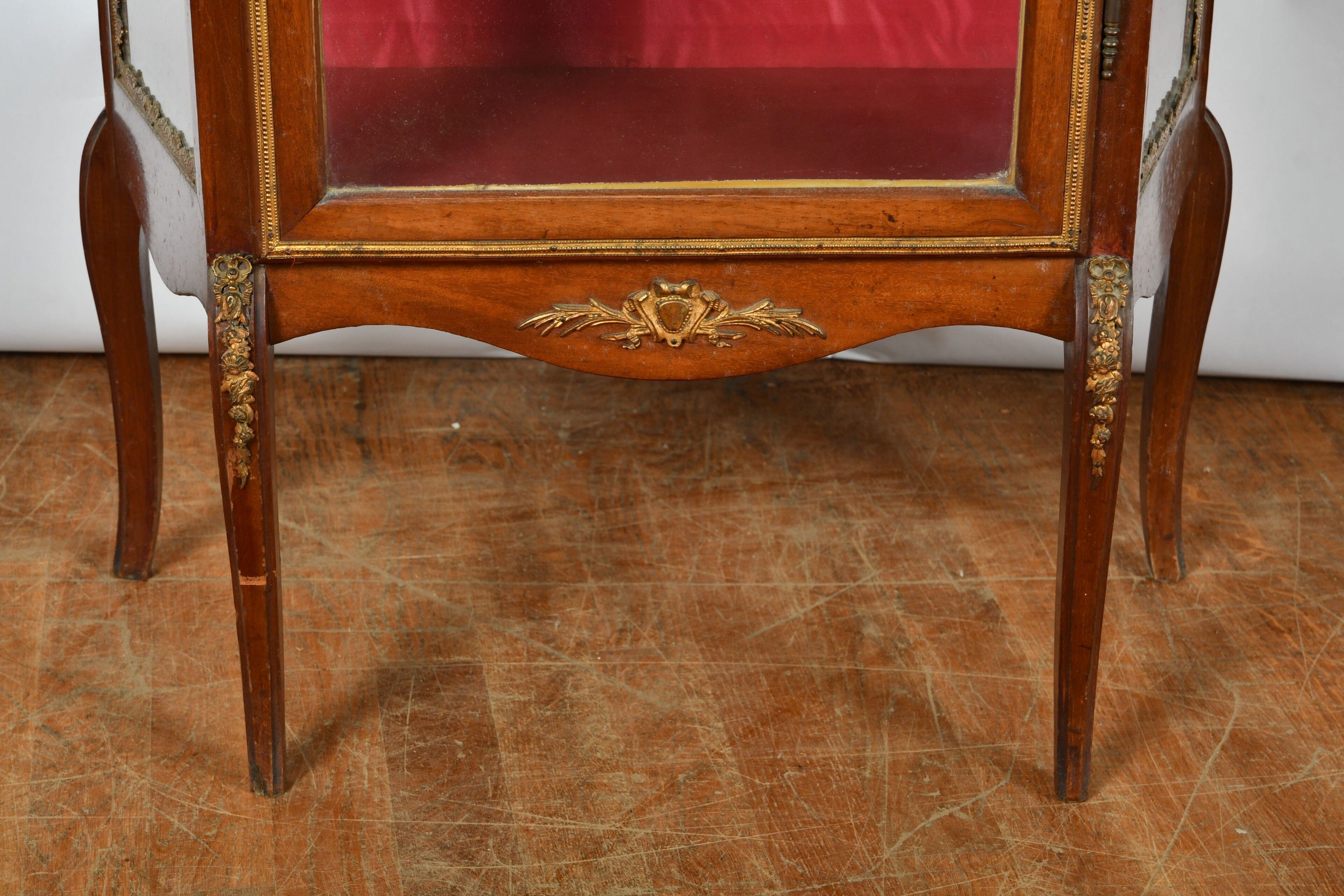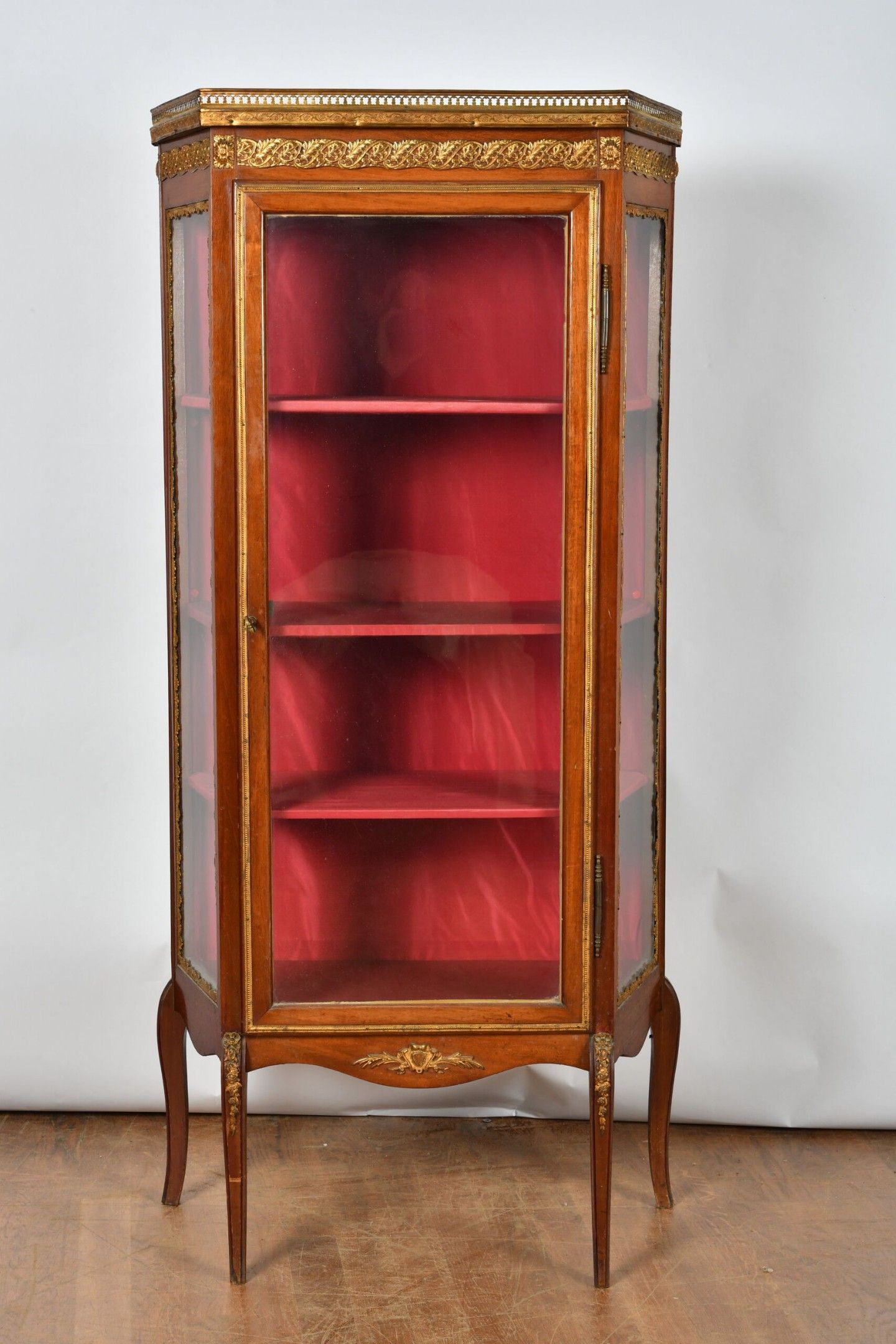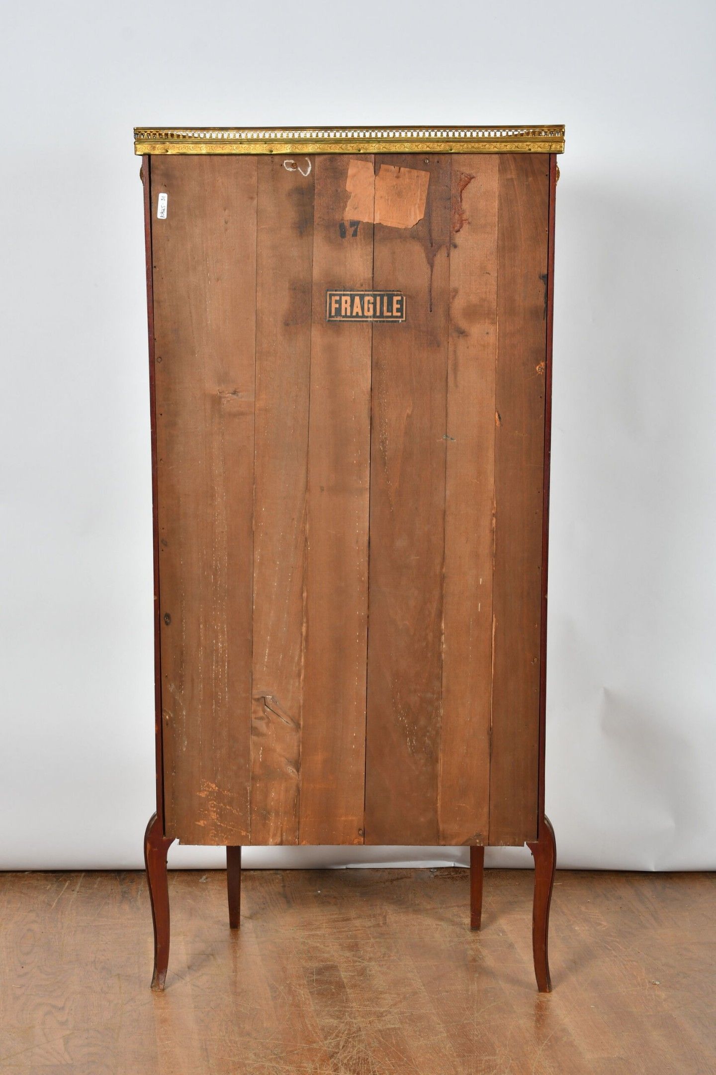 Mahogany and veneer VITRINE opening to a glass door. Red veined marble top surrounded by a brass gallery. The sides are also glazed and slightly flared. The top rests on curved legs. Gilt bronze ornamentation. Louis XVI style; 19th century. H. 142 - W. 69 - D. 30.5 cm