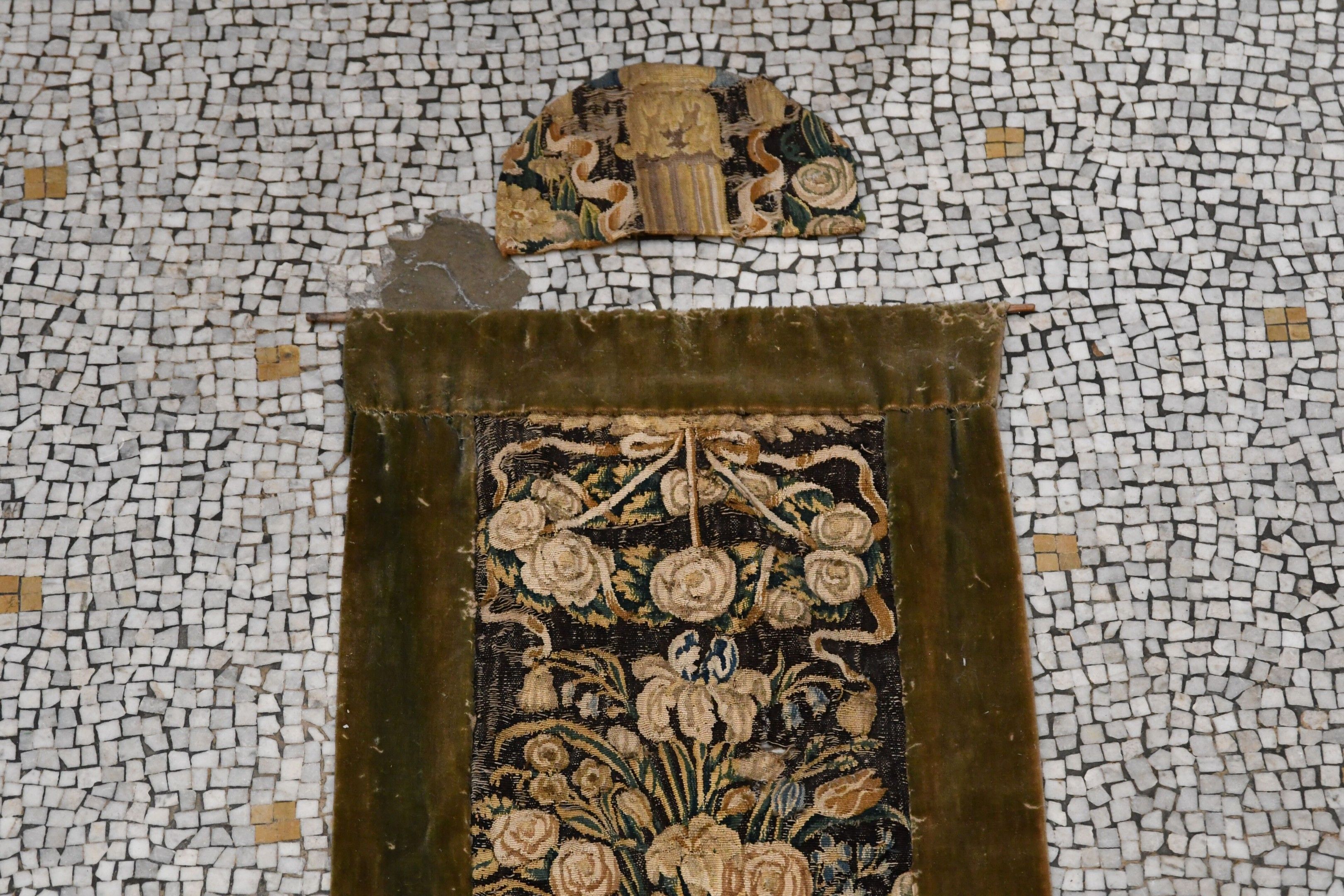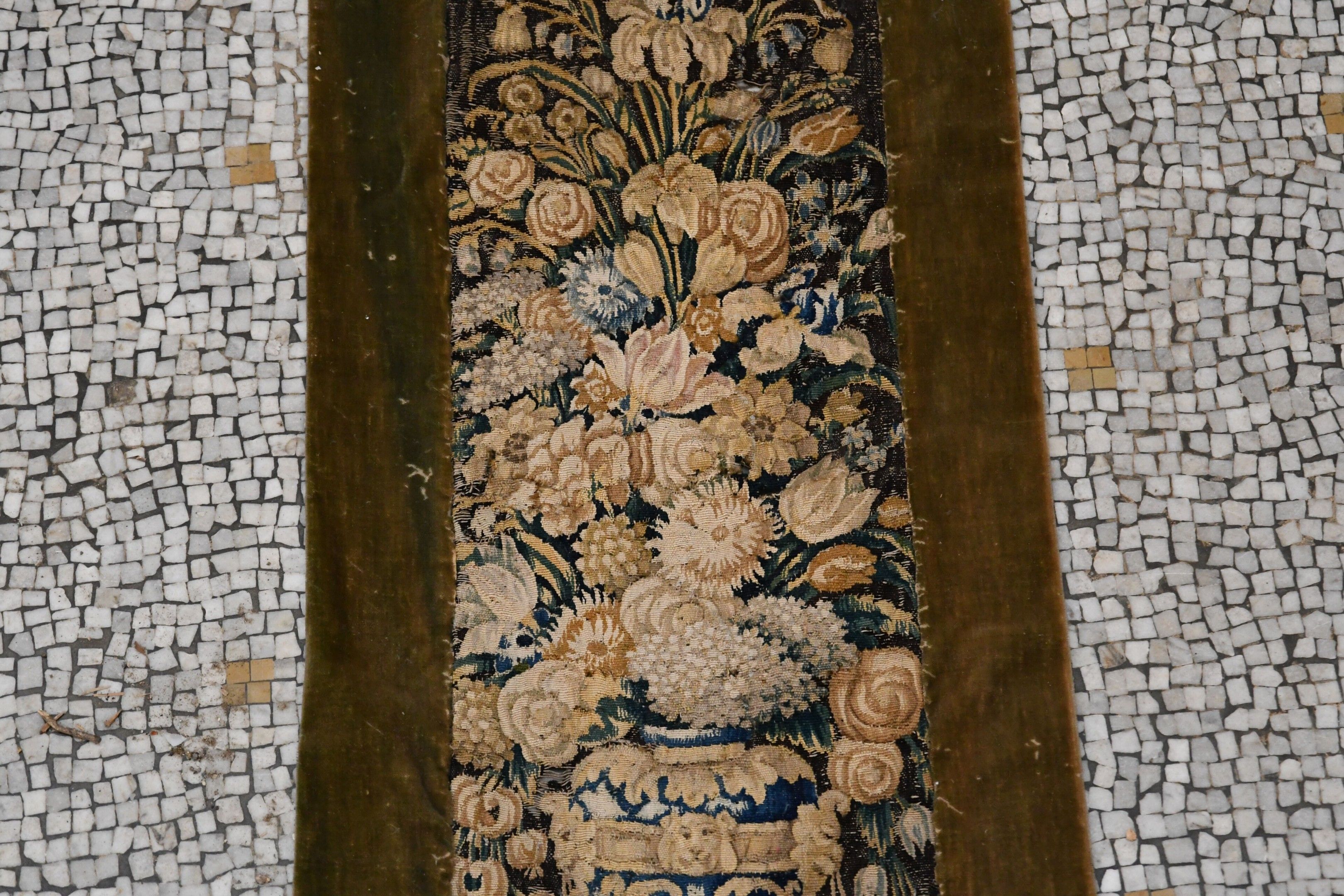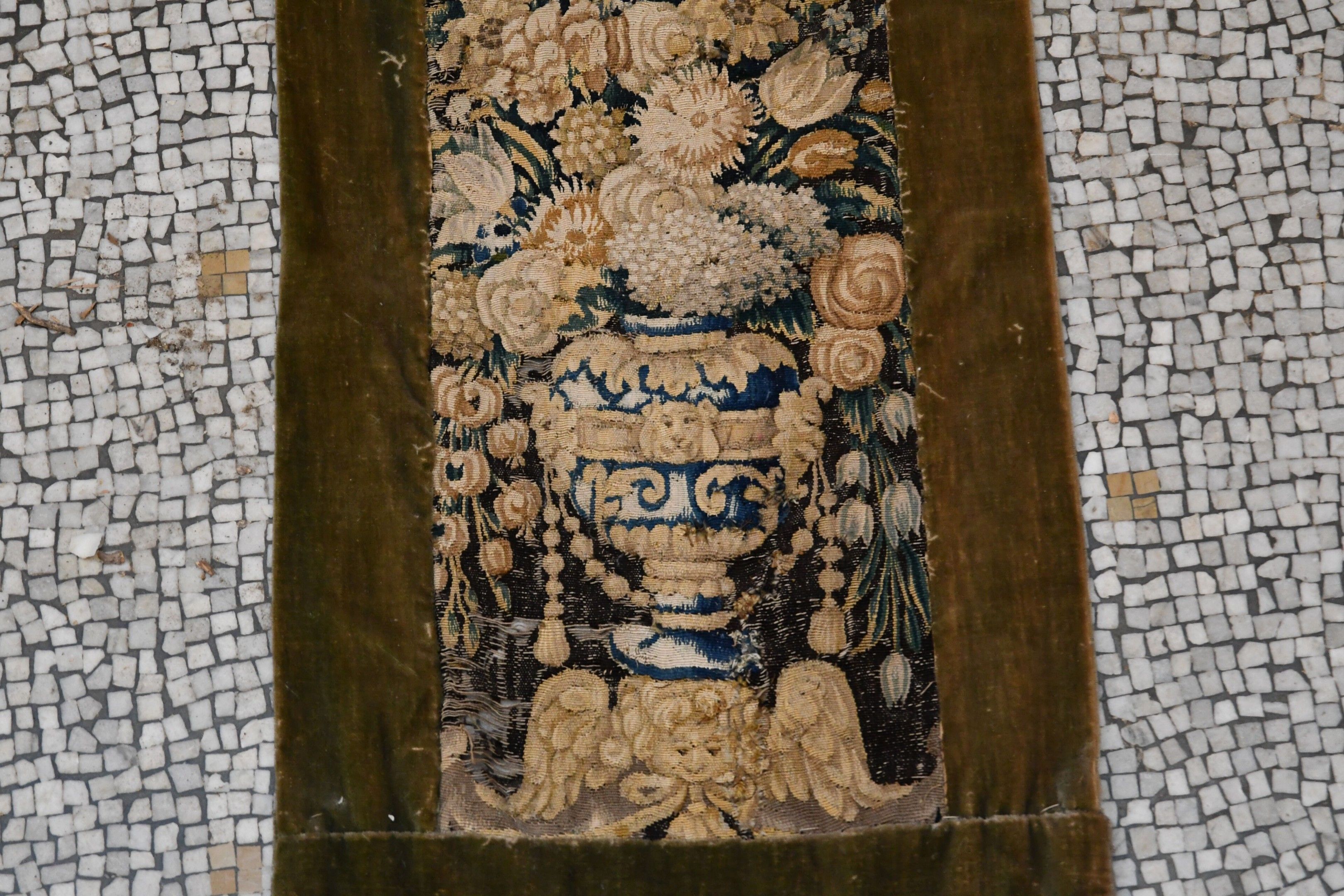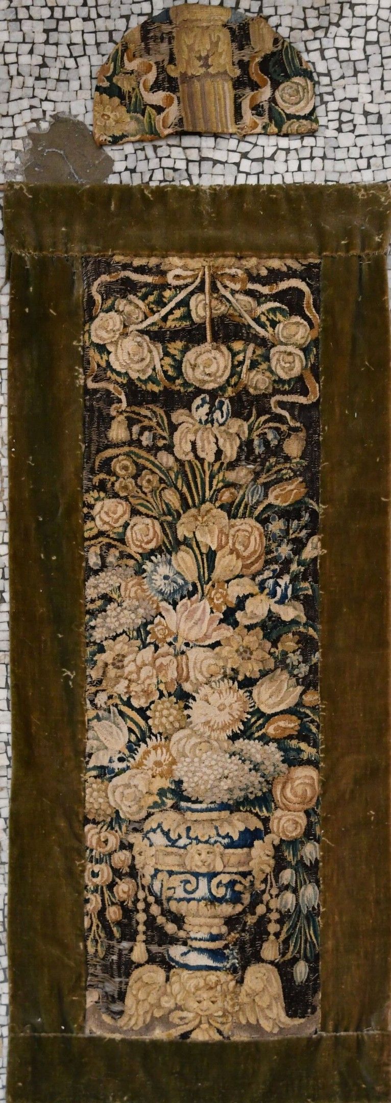 18th century tapestry. Element of border presenting a flowered urn. Velvet border. Holes, wear and old restorations. 140 x 53 cm. A matching fragment is ATTACHED.