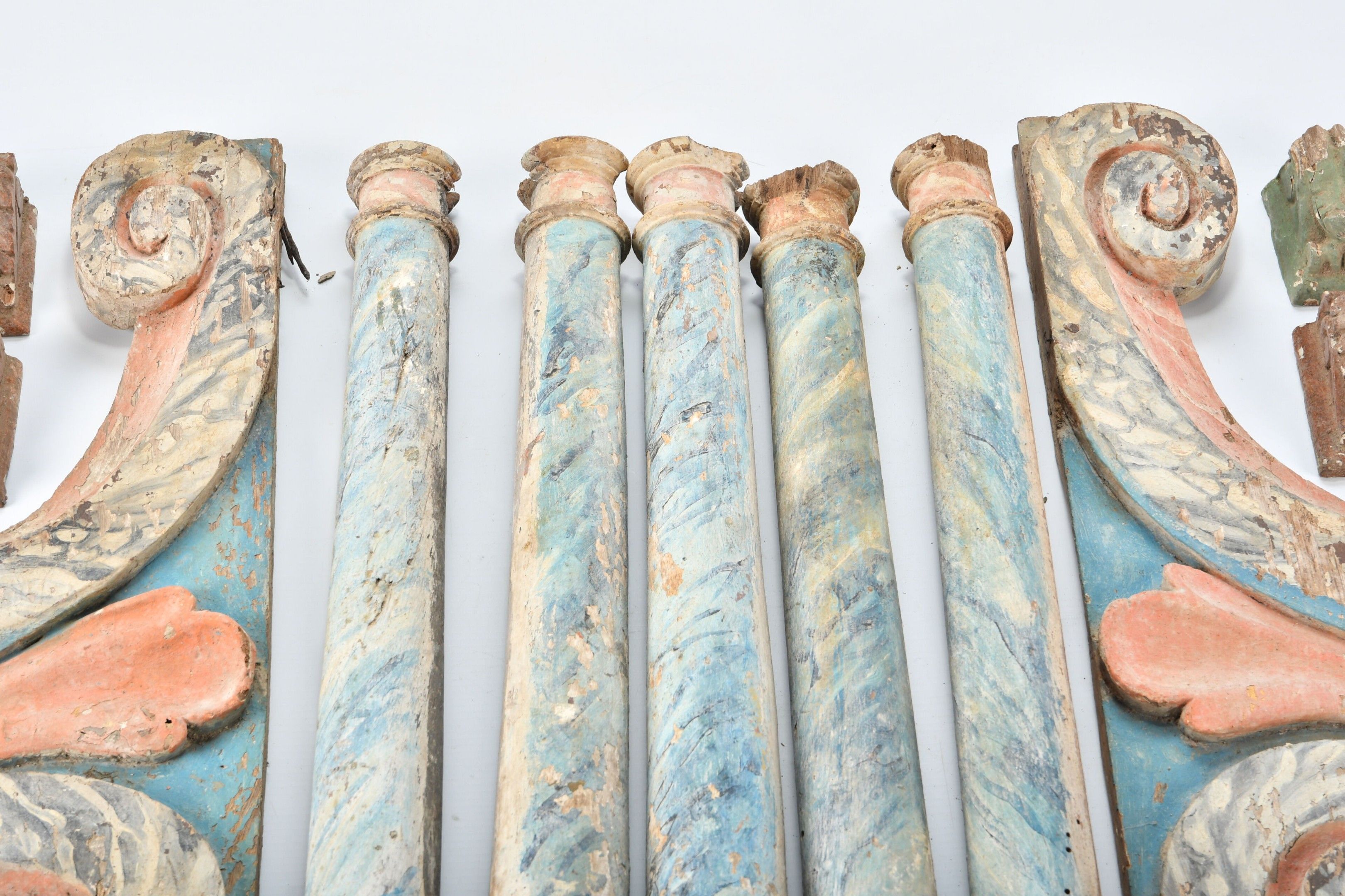 ELEMENTS of a polychrome carved wooden altarpiece comprising: two volutes; five columns and numerous dentils. French work from the 17th century