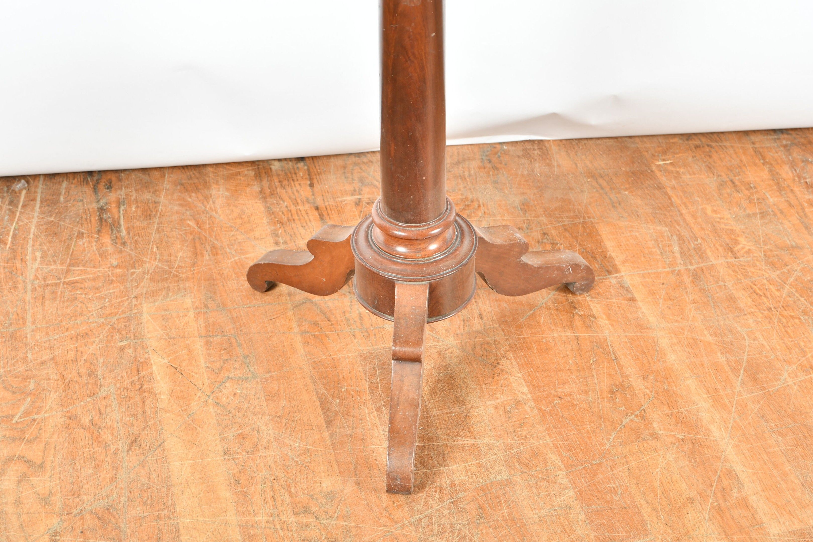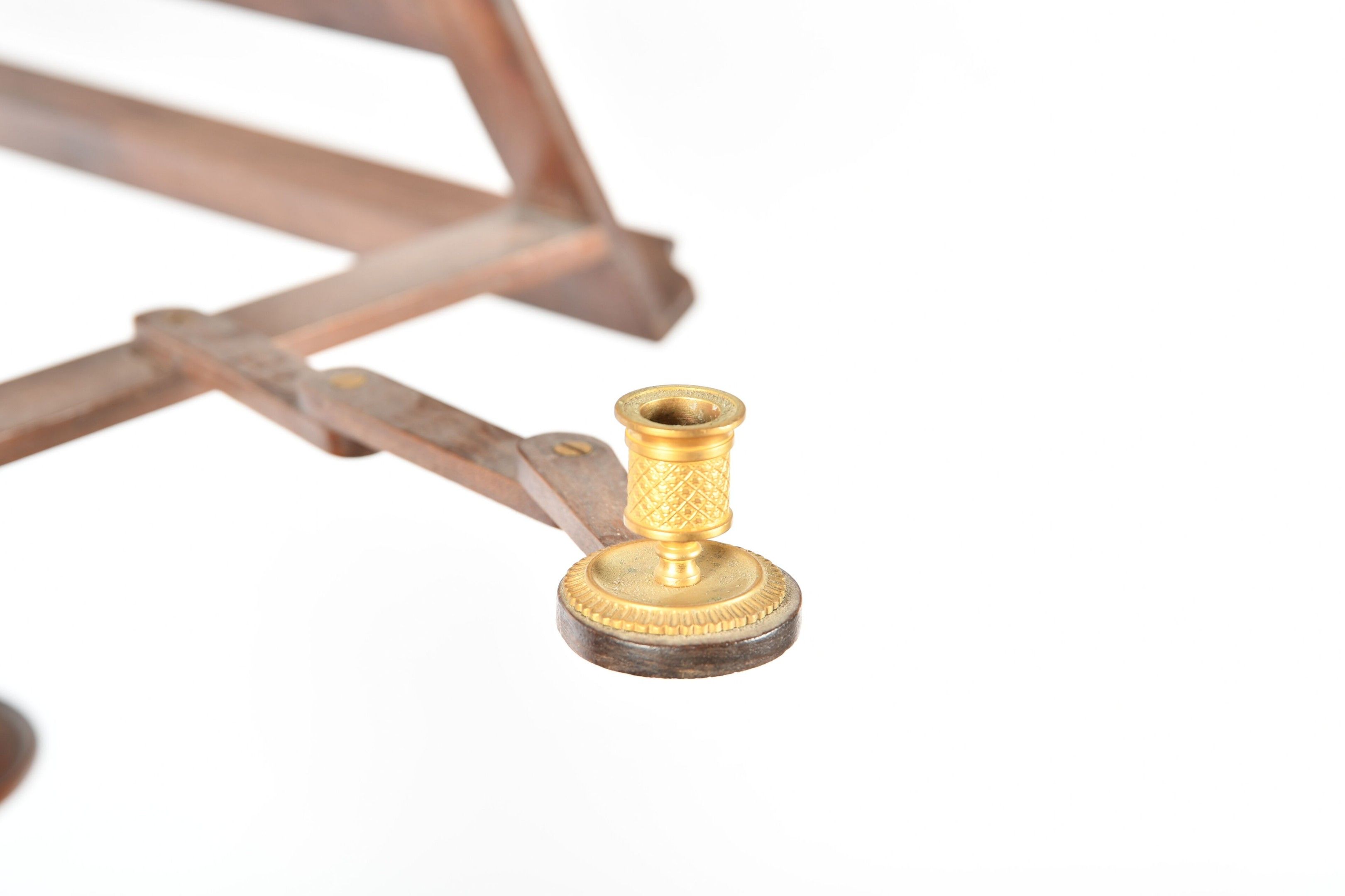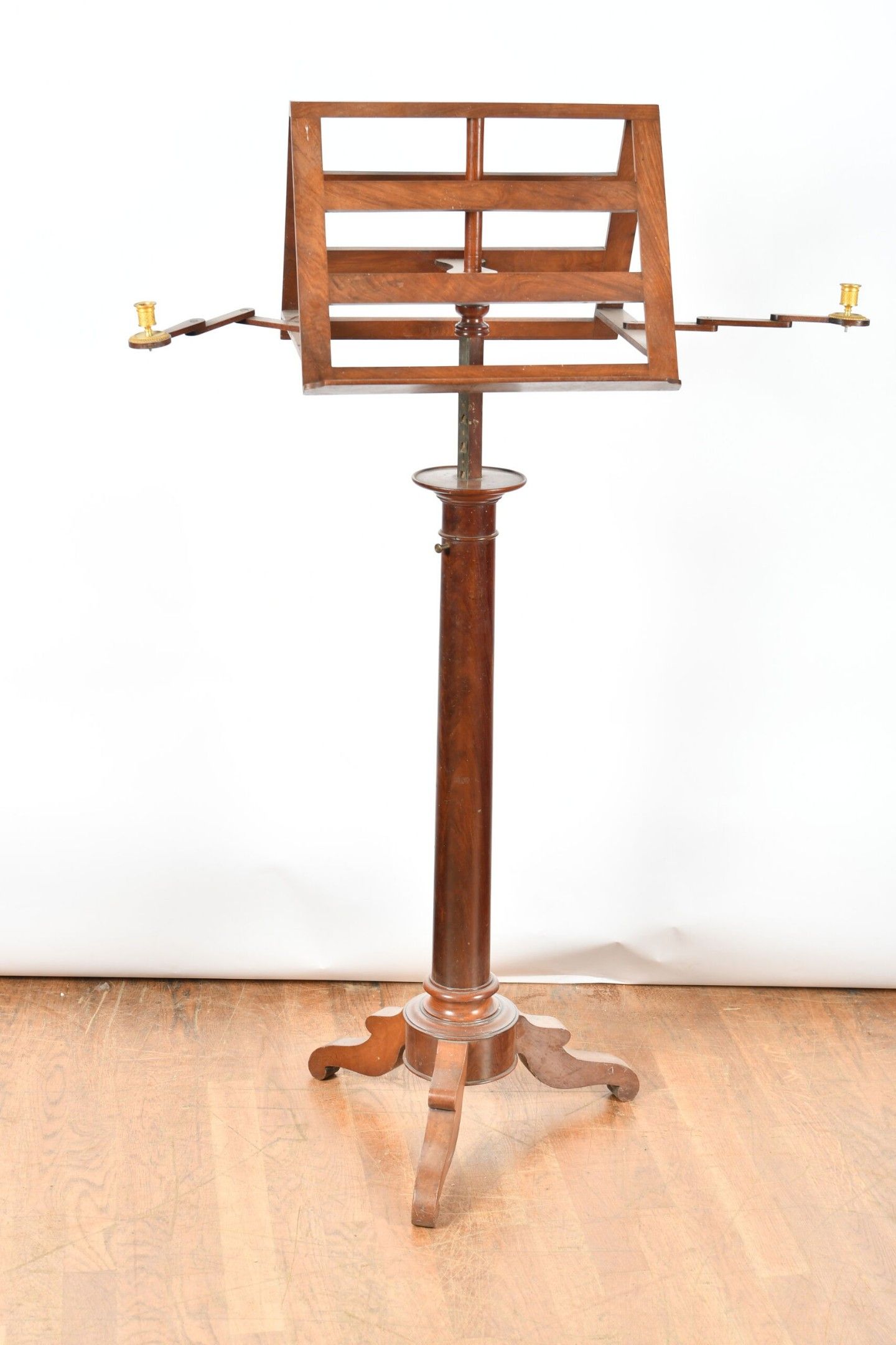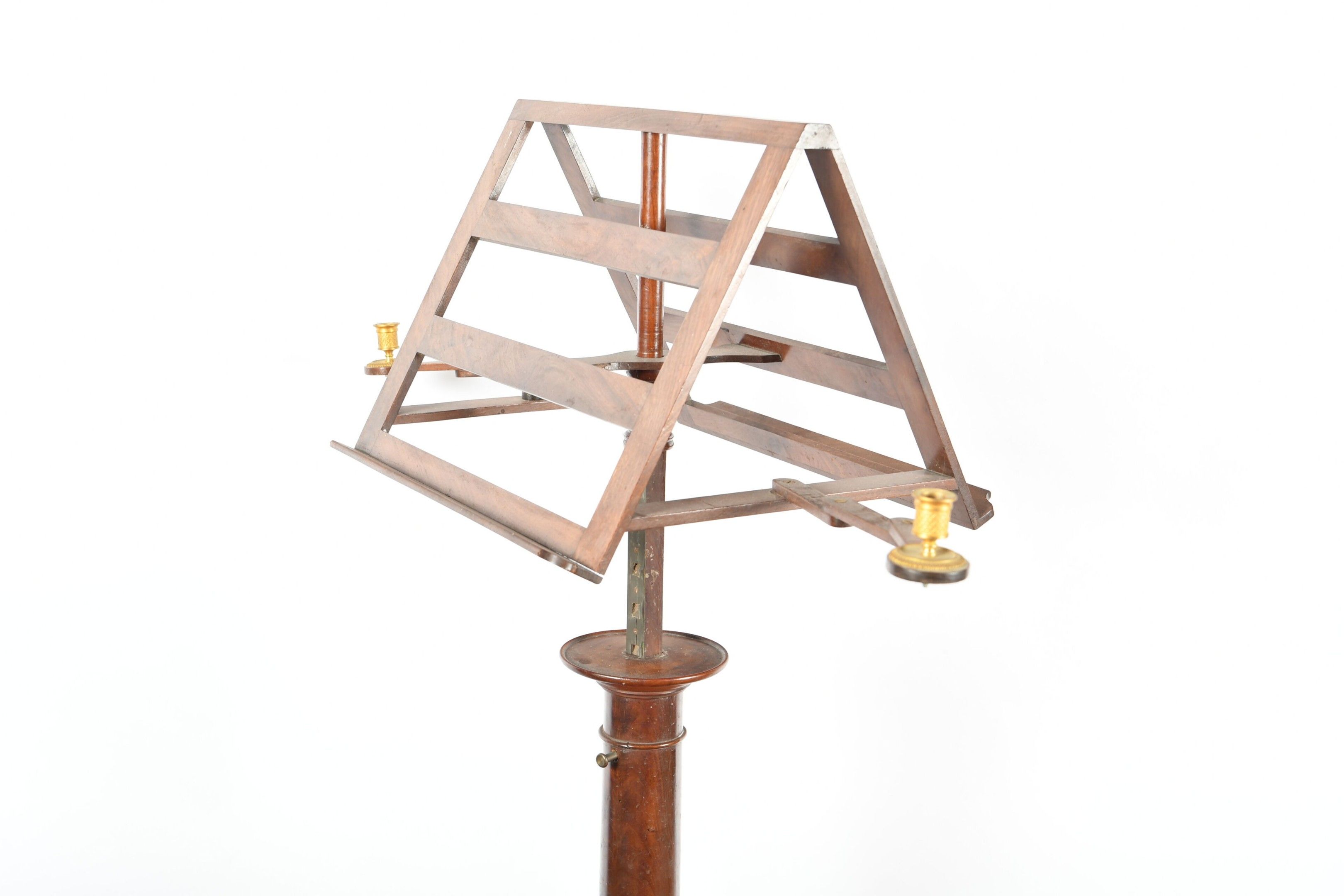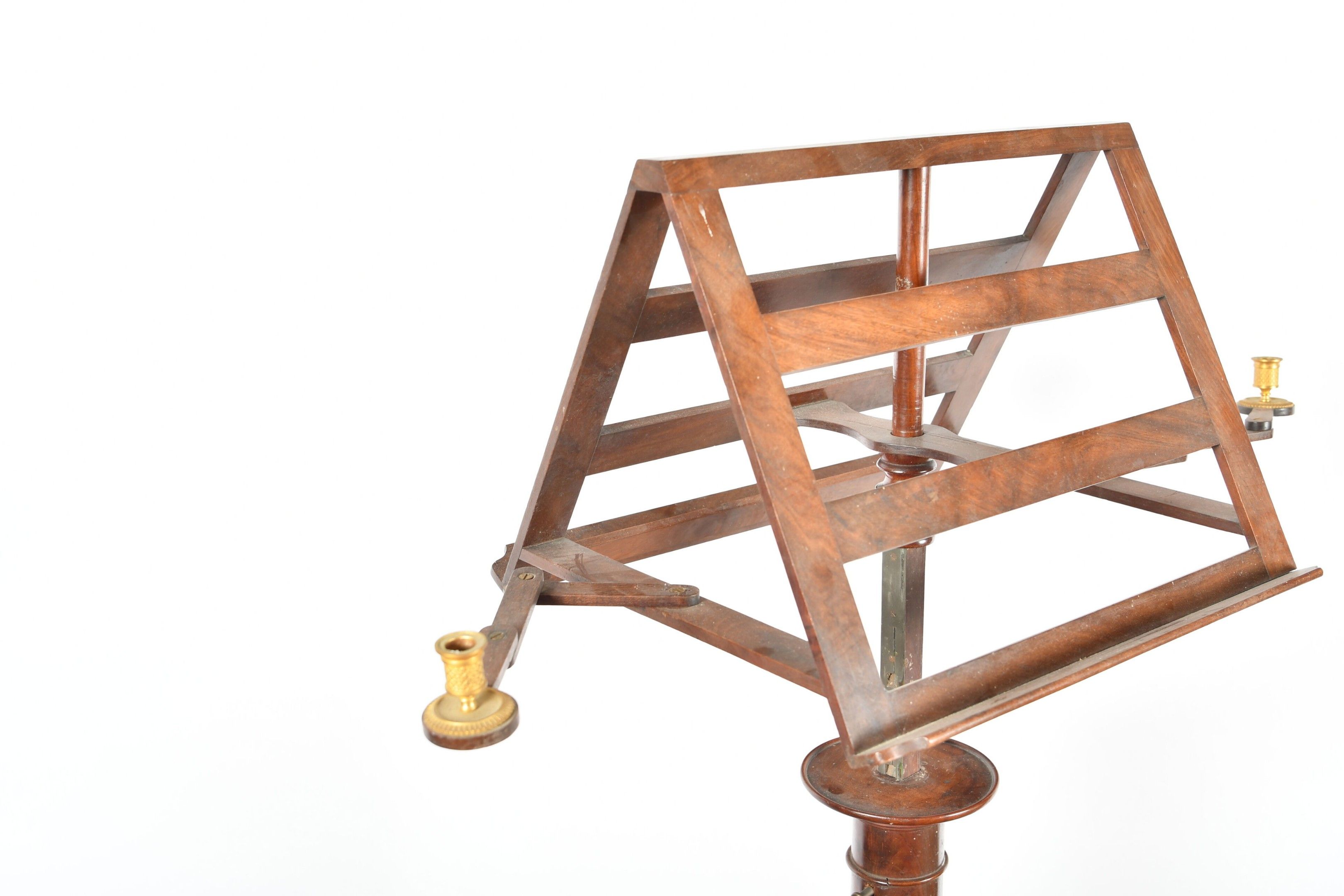 A mahogany and mahogany veneer LUTRIN resting on a column shaft with a curved tripod base. The reading table is lit by two folding wooden lights with bronze bobèches. Empire period. Height 137.5 cm