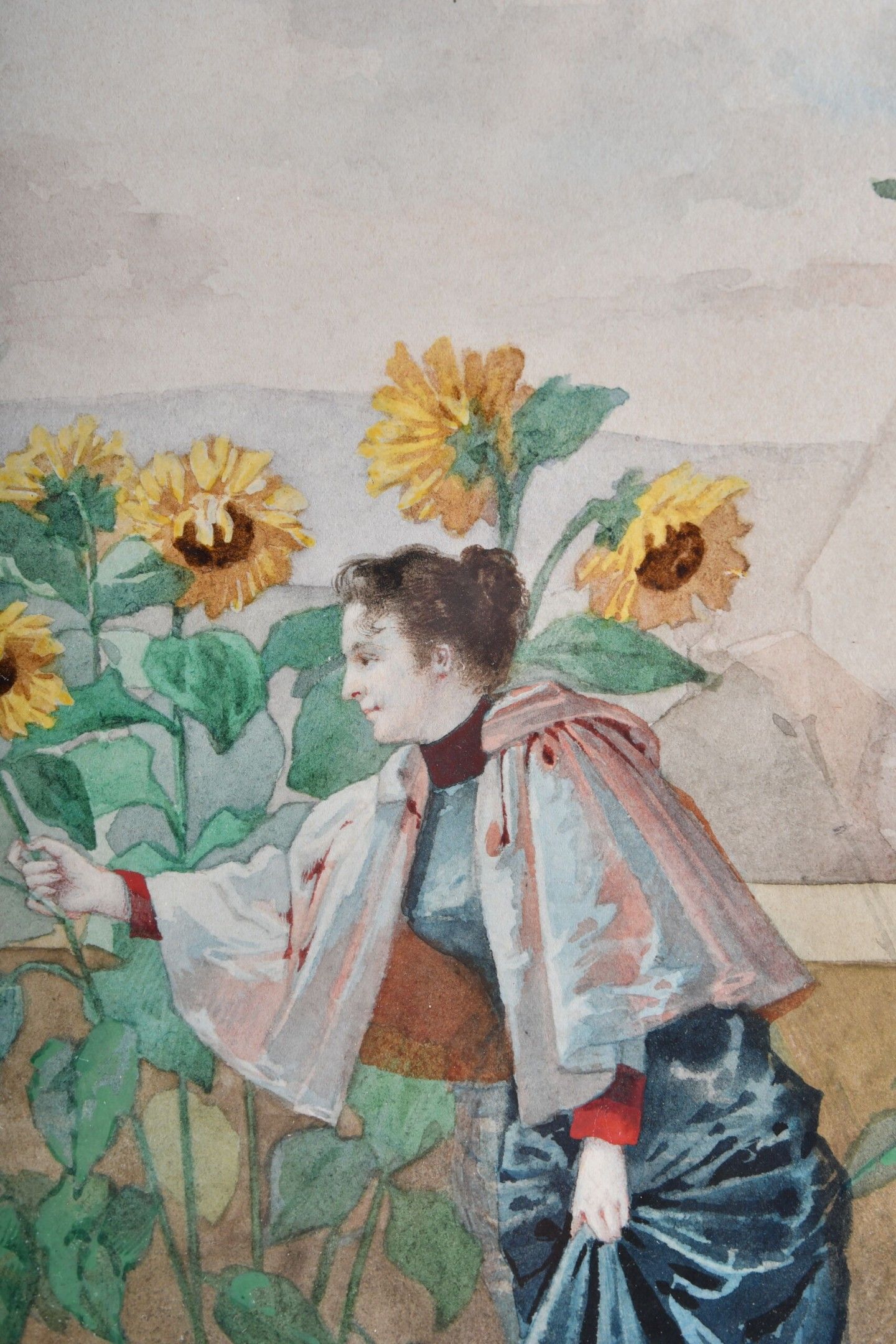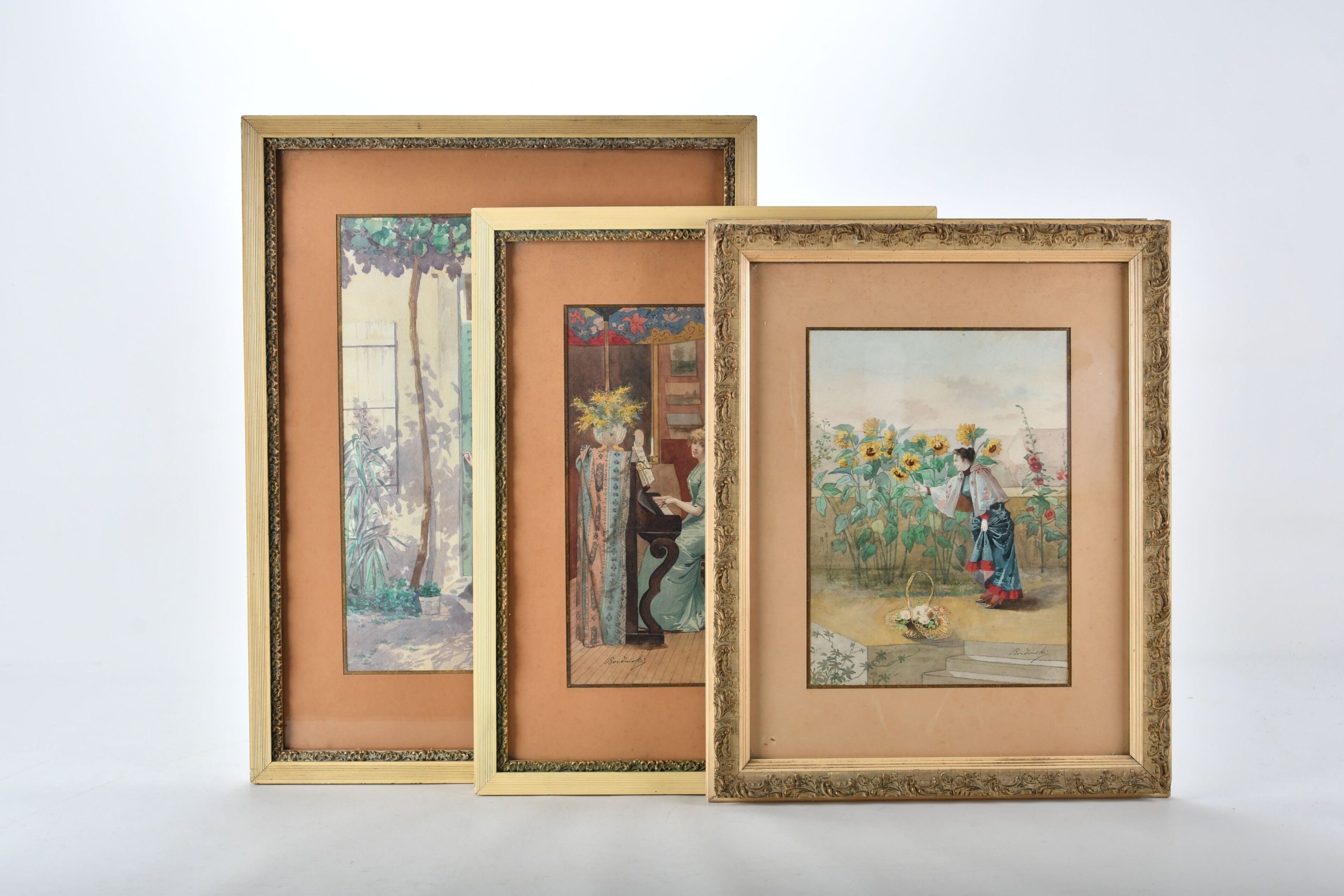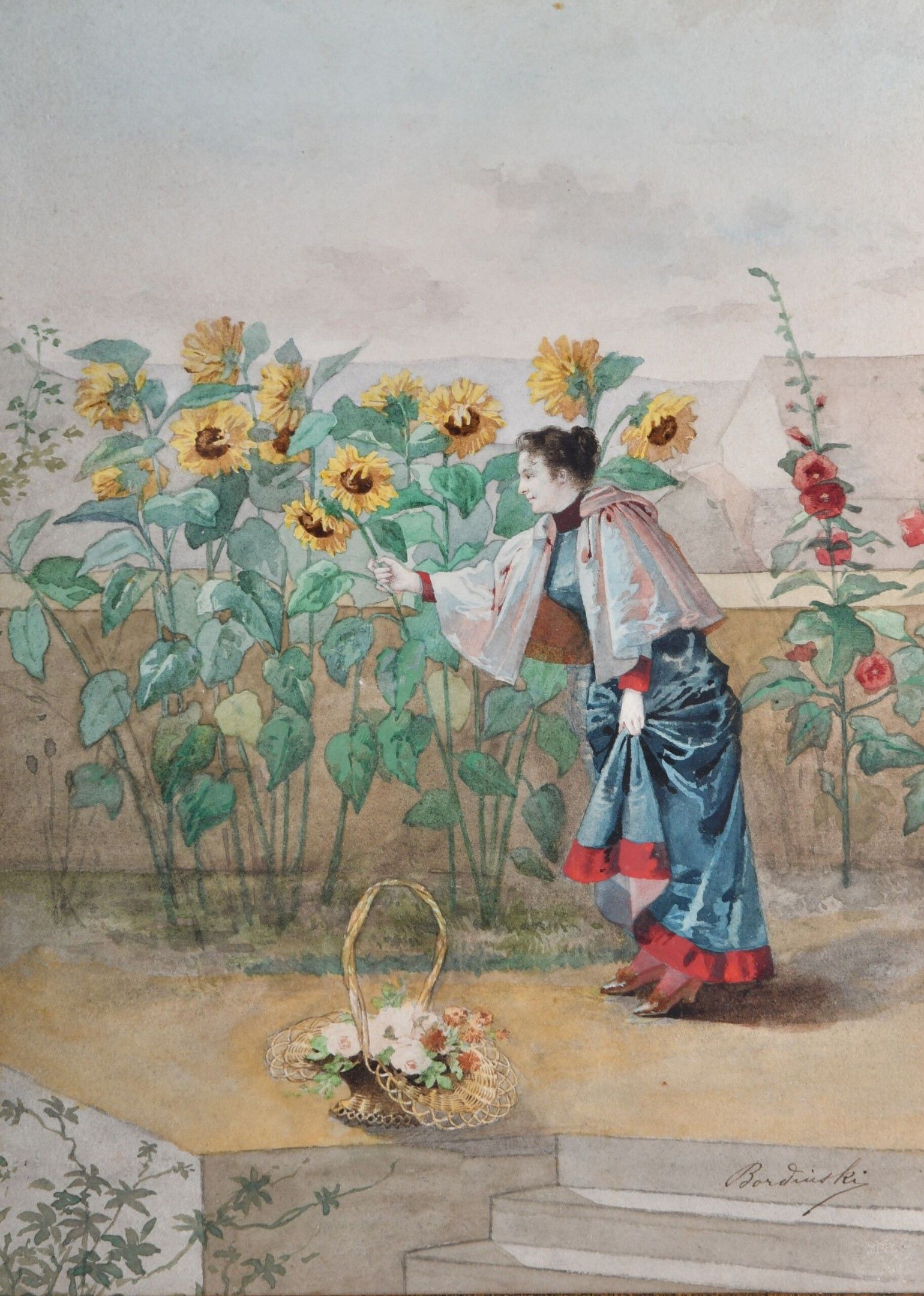 BORDINSKI, late 19th century. Young women at the piano; young woman with a basket of flowers and young woman in japanese dress with sunflowers. Suite of three watercolours on paper, signed, one stamped "J. Borde Eiyen (?)". Views: 34 x 24 cm / 41 x 29 cm / 31 x 23 cm (Small stain on one woman's face)