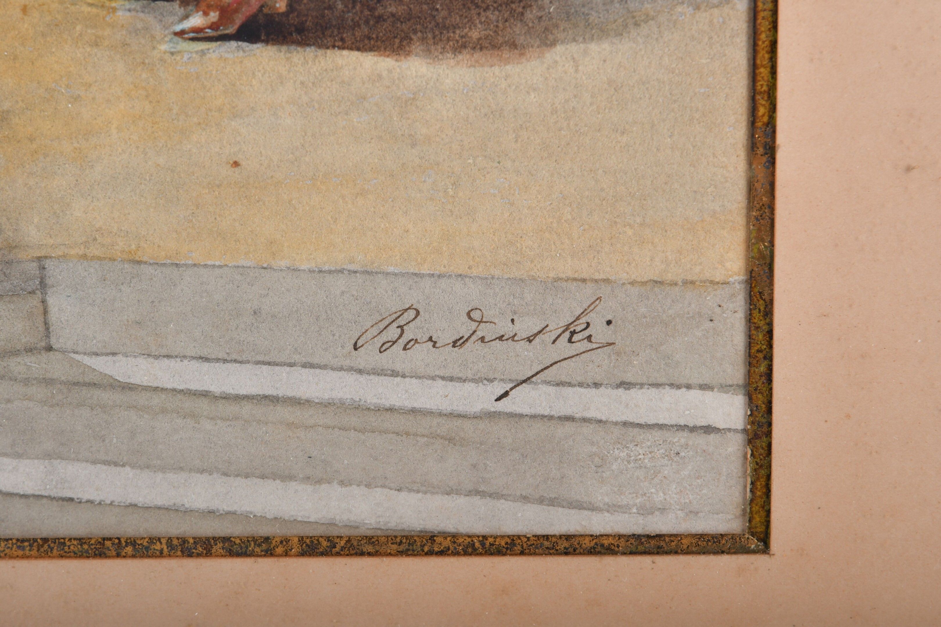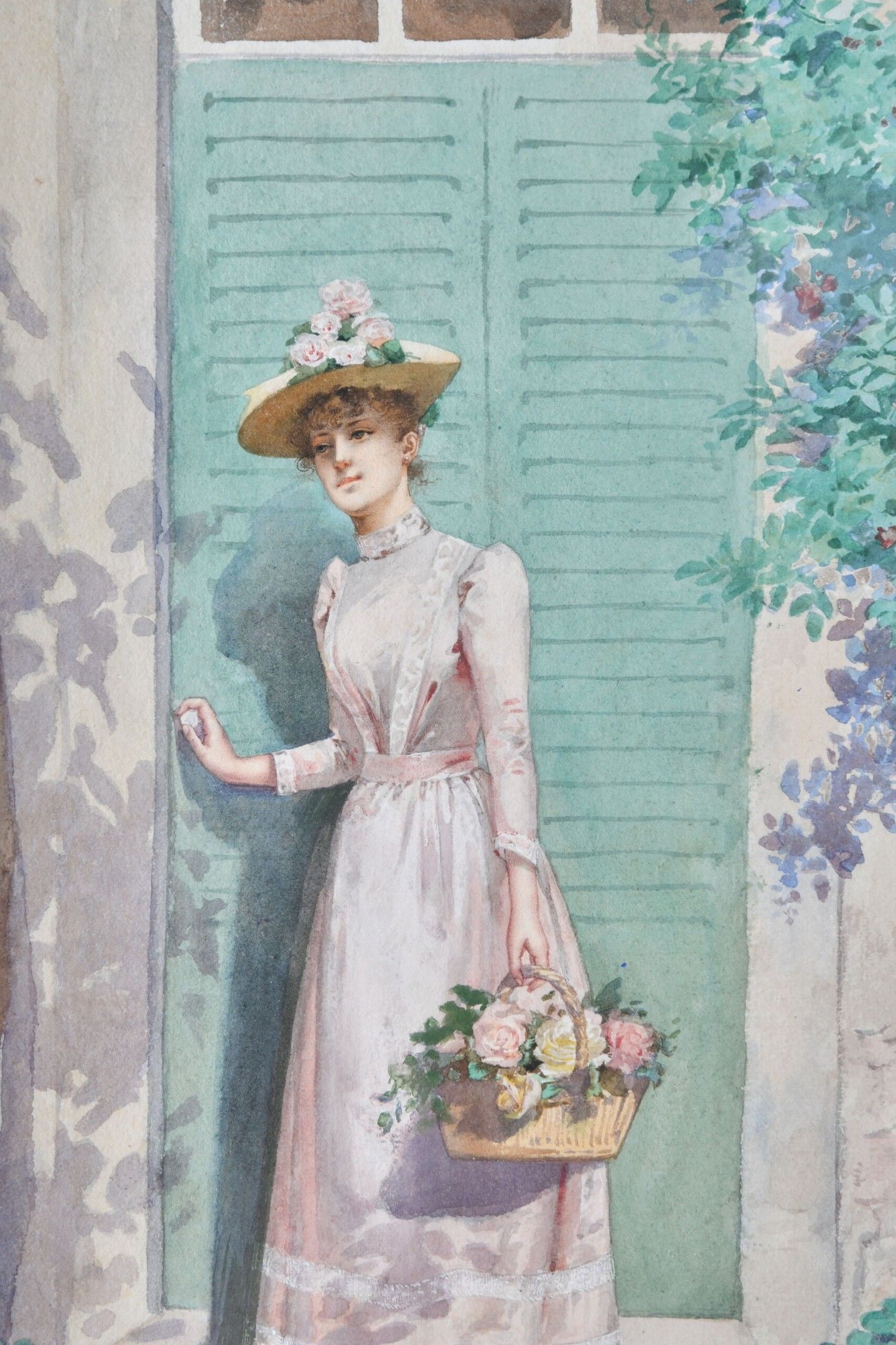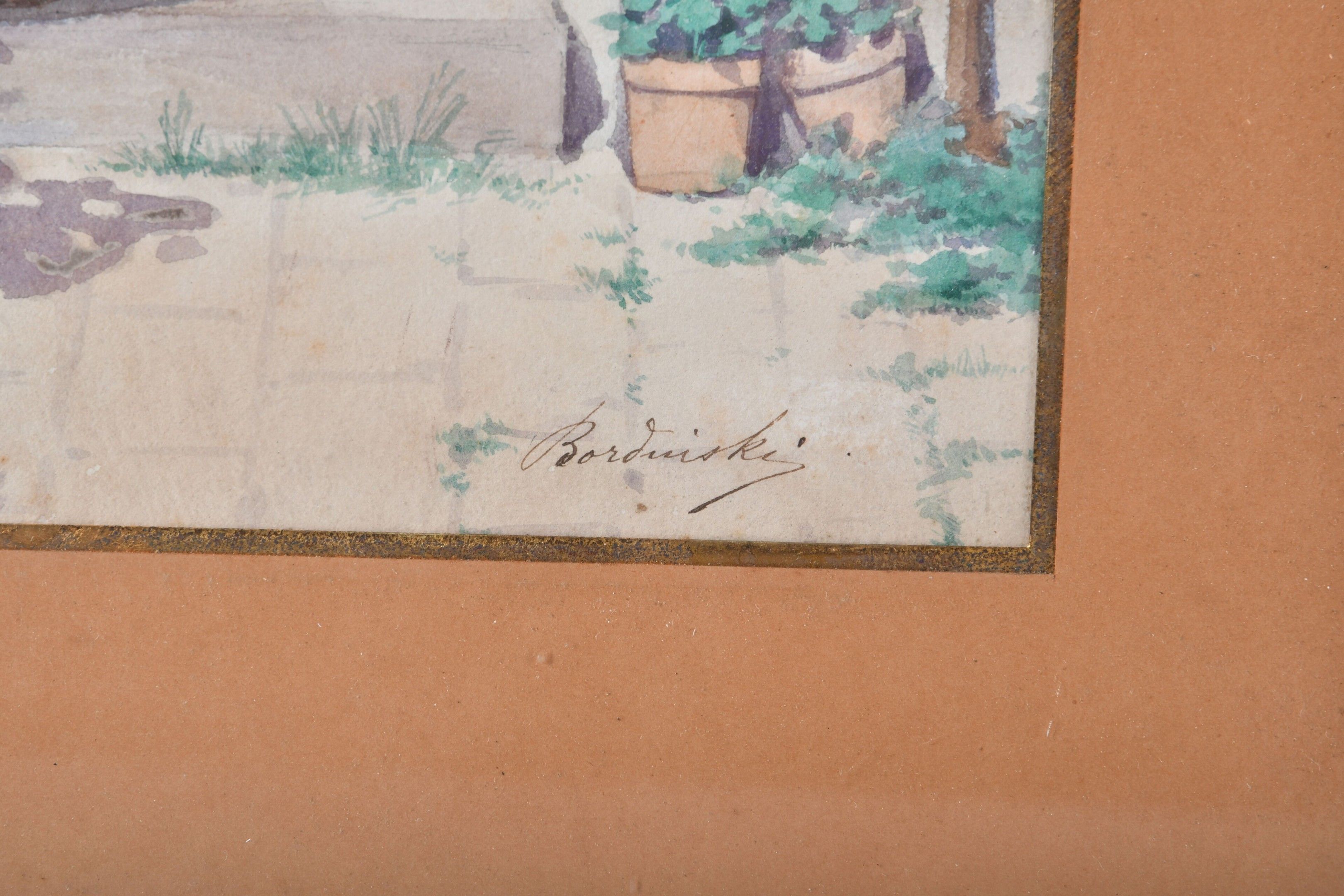 BORDINSKI, late 19th century. Young women at the piano; young woman with a basket of flowers and young woman in japanese dress with sunflowers. Suite of three watercolours on paper, signed, one stamped "J. Borde Eiyen (?)". Views: 34 x 24 cm / 41 x 29 cm / 31 x 23 cm (Small stain on one woman's face)
