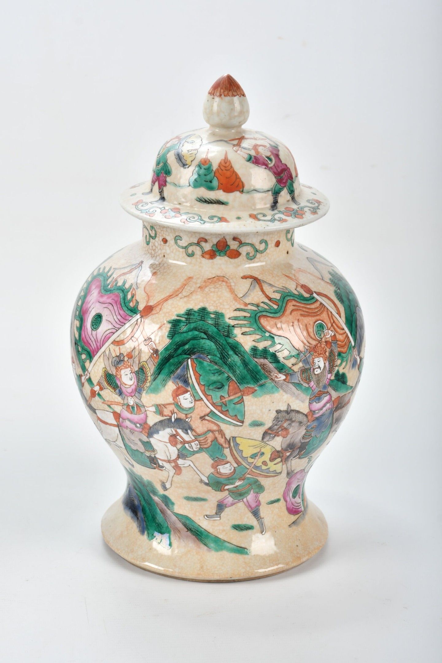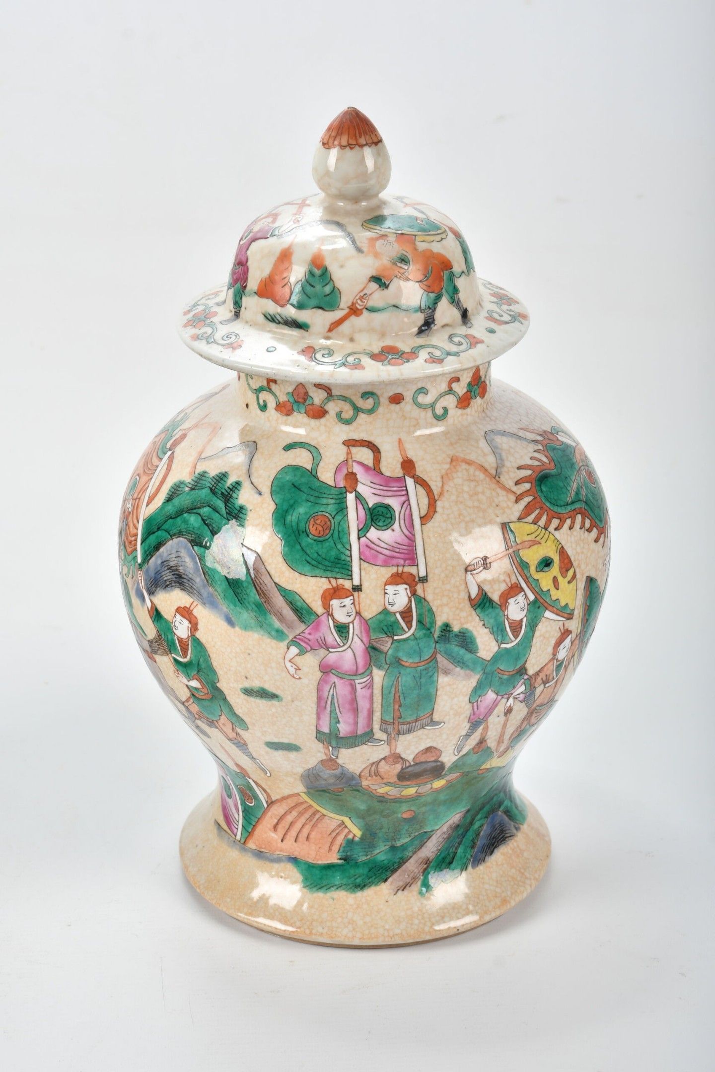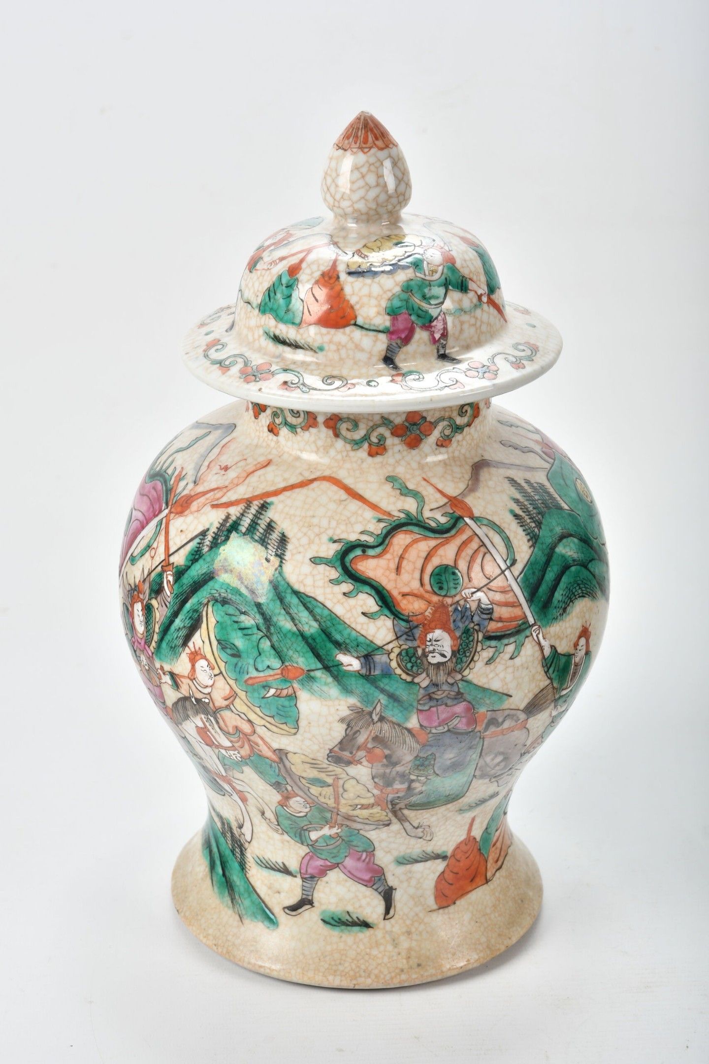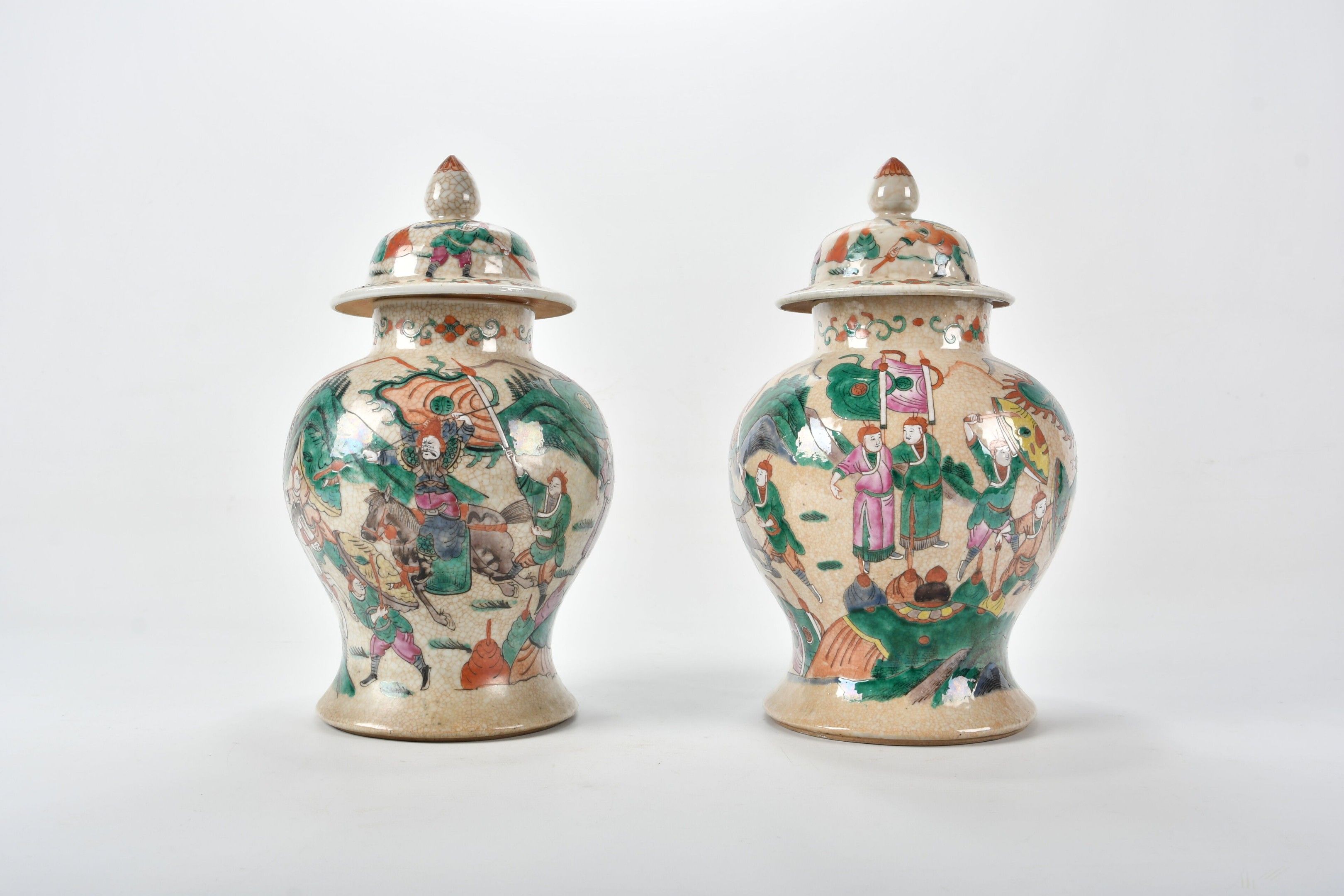 CHINA, NANKIN circa 1900. A pair of covered vases in crackle-glazed earthenware with polychrome decoration of battle scenes. Baluster shape. 35 cm high