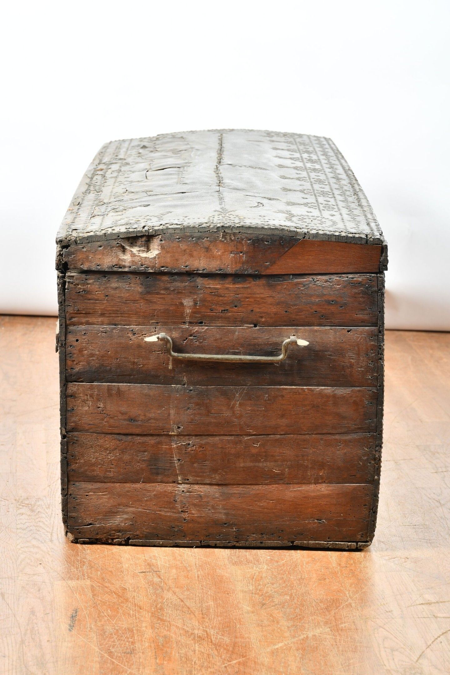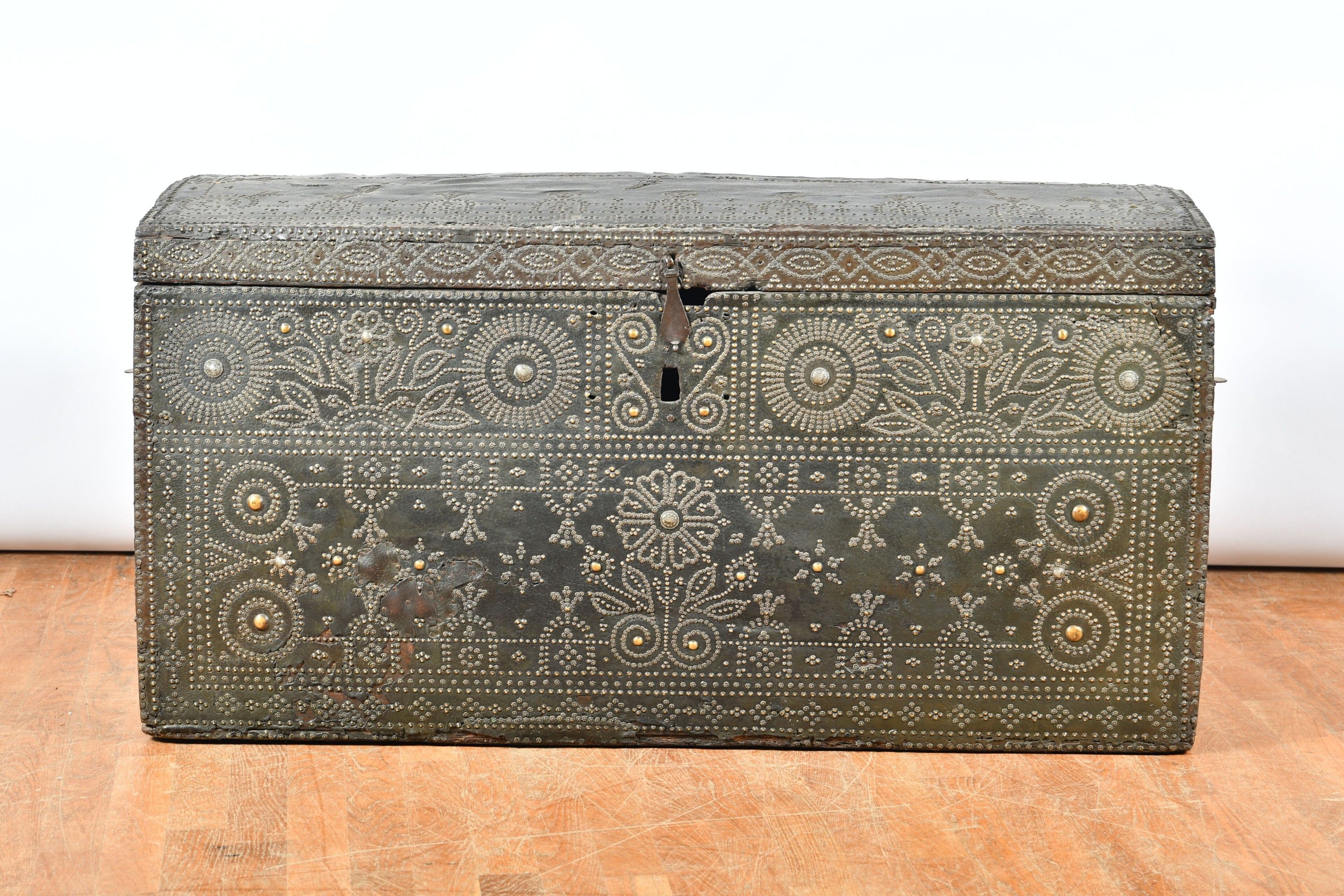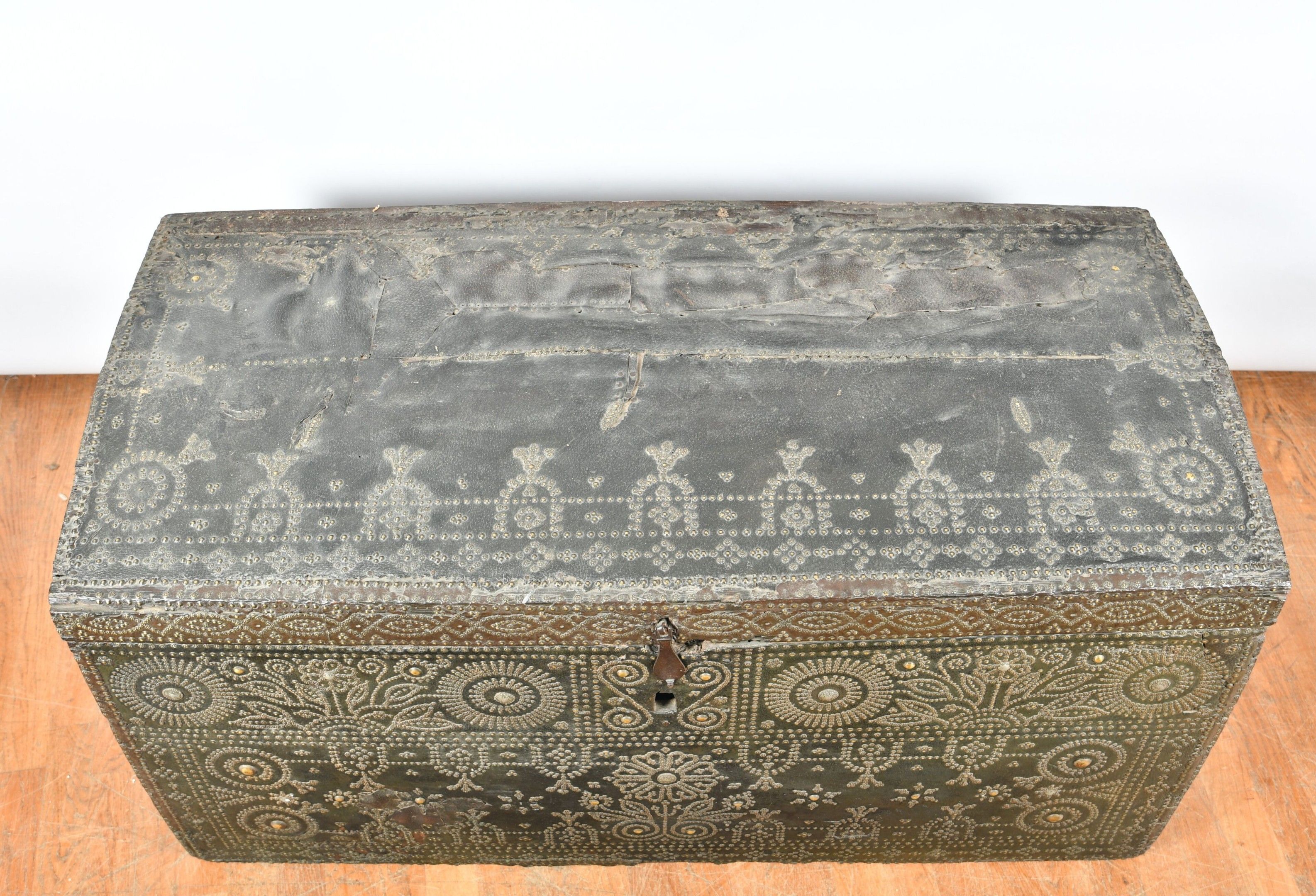 A large chest with a slightly domed lid, wood trimmed with studded leather and decorated with geometric and floral friezes. Wrought iron lock bolt and side grips. 17th century period. H. 63 - W. 124 - D. 60 cm. Restorations and chips to the leather, wear to the sides, minor chips and worm damage.