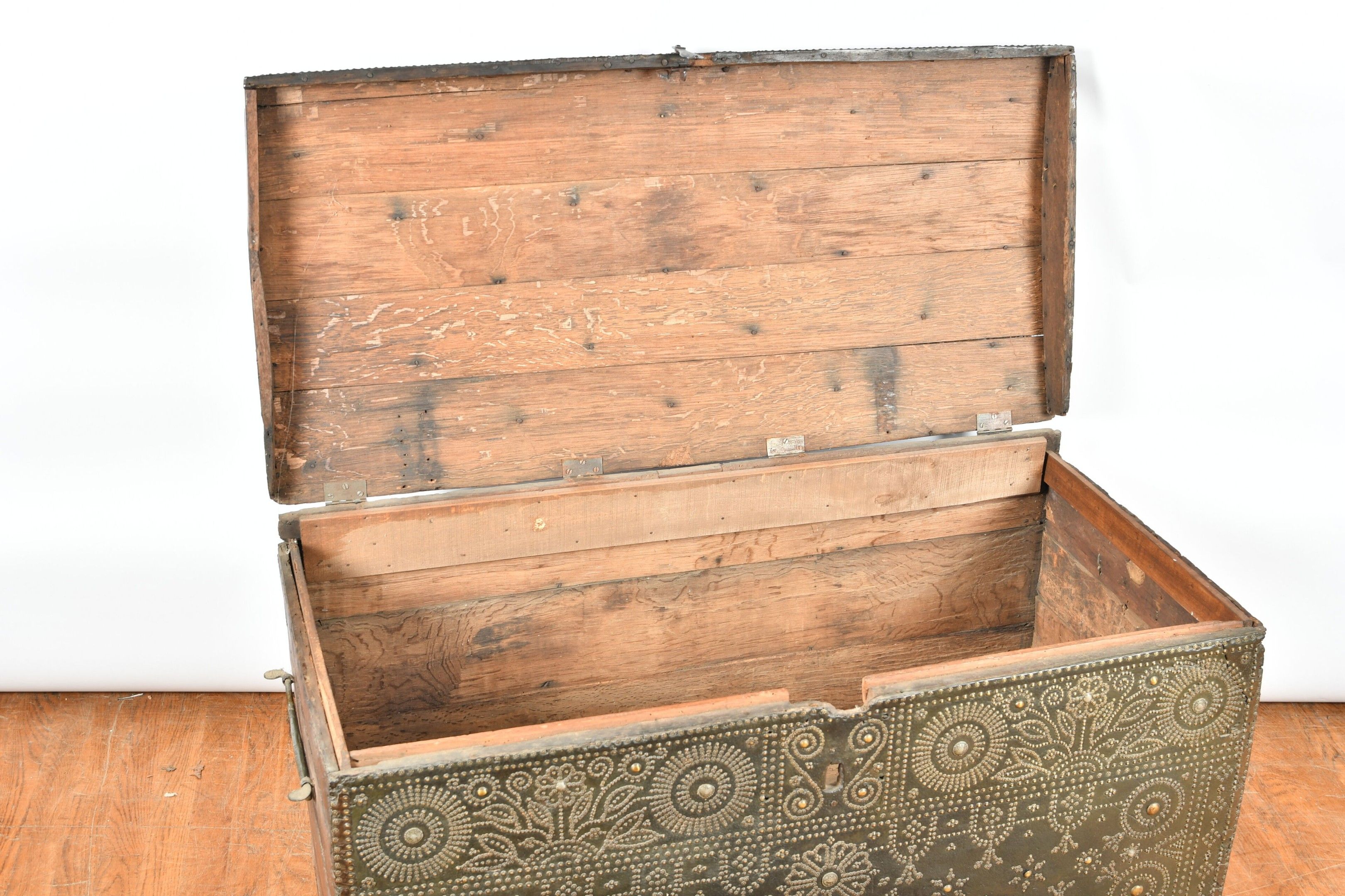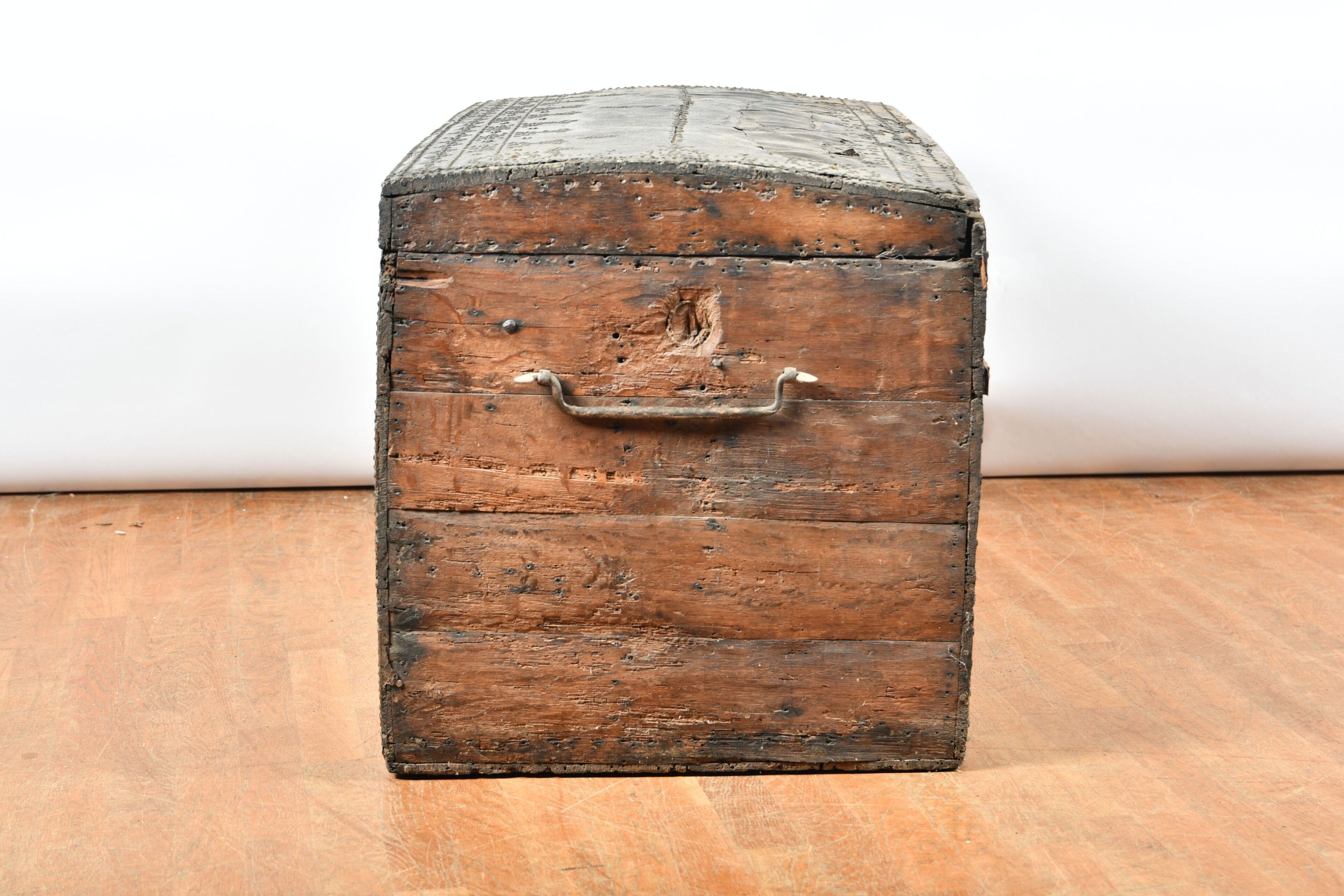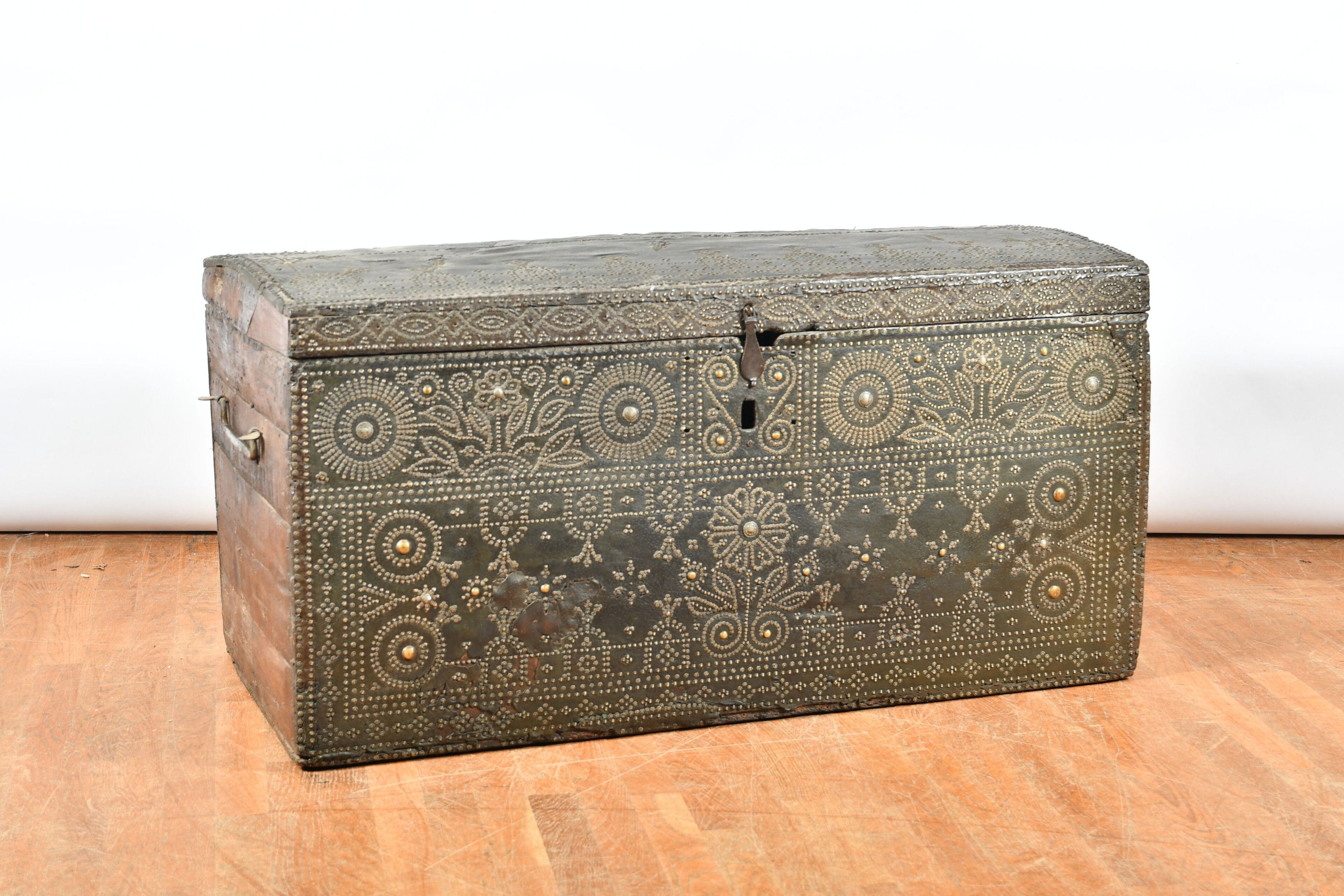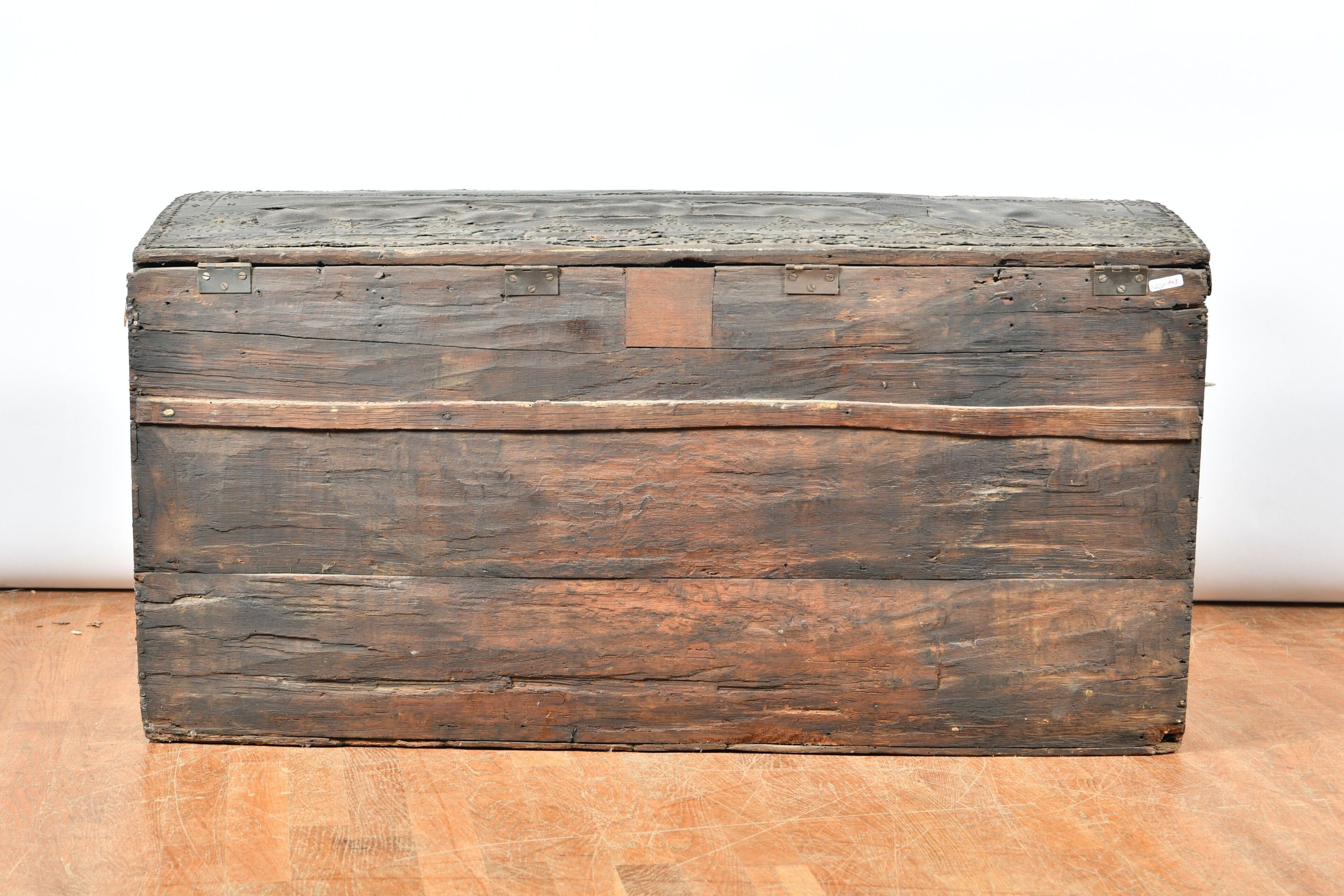 A large chest with a slightly domed lid, wood trimmed with studded leather and decorated with geometric and floral friezes. Wrought iron lock bolt and side grips. 17th century period. H. 63 - W. 124 - D. 60 cm. Restorations and chips to the leather, wear to the sides, minor chips and worm damage.