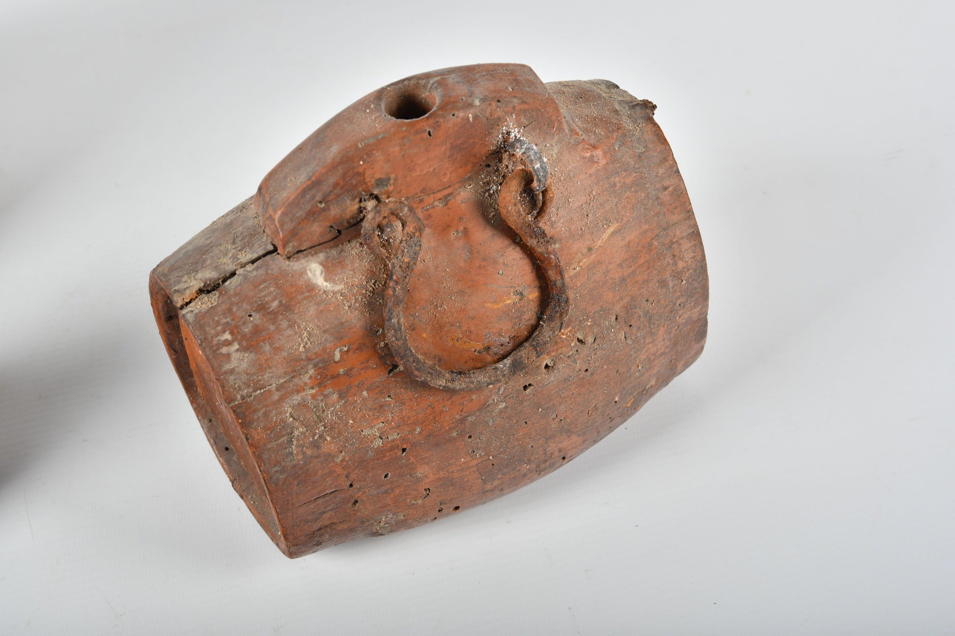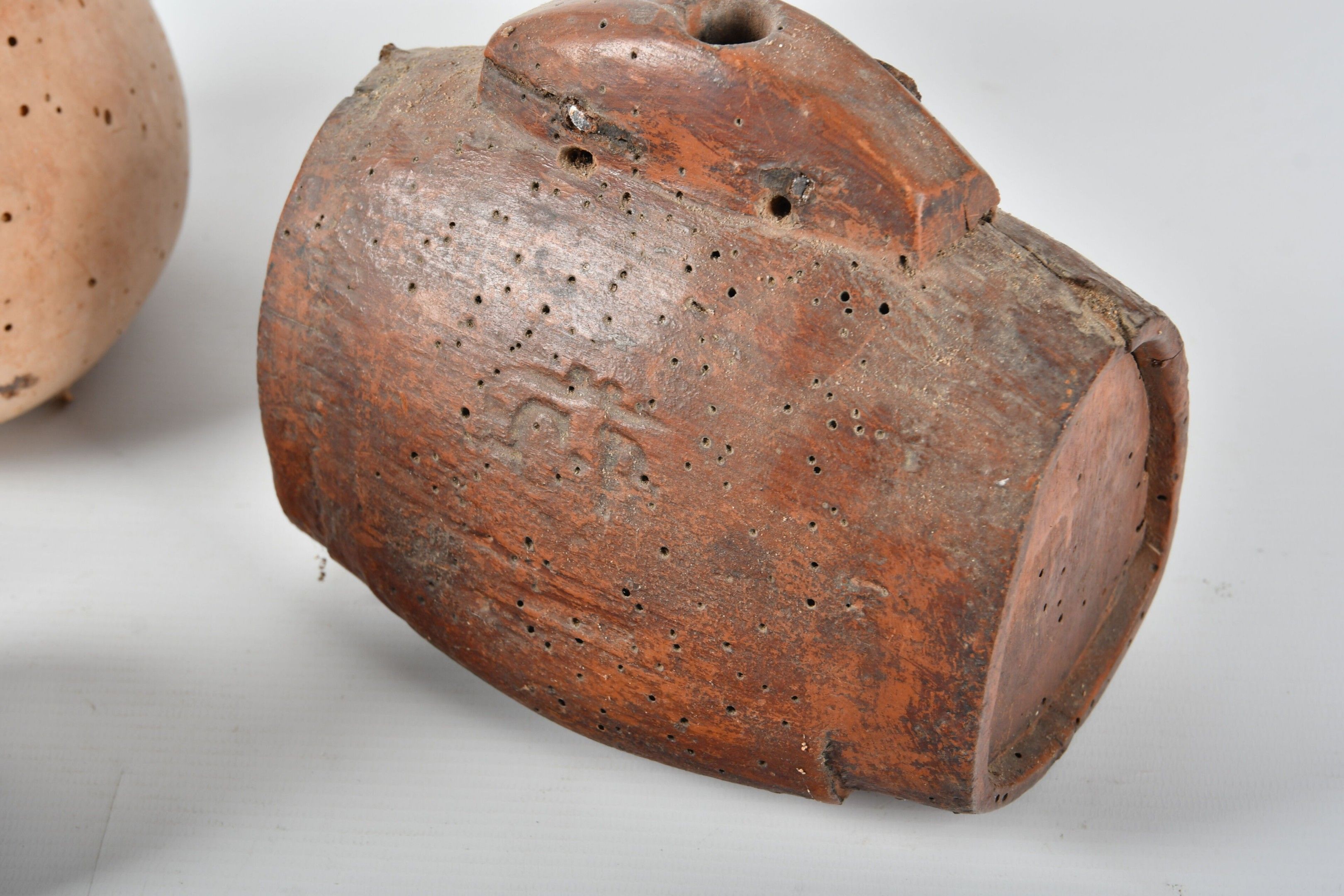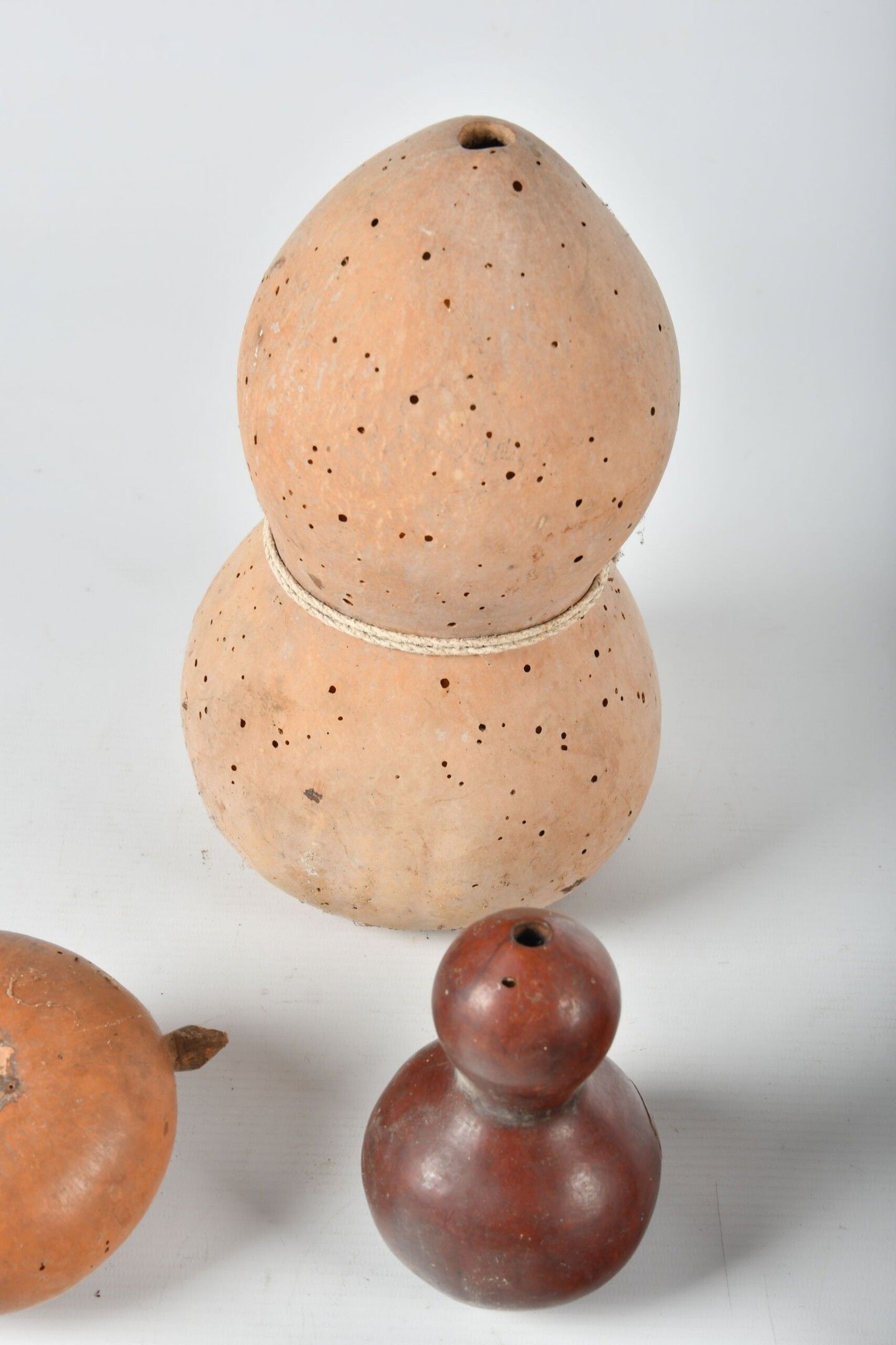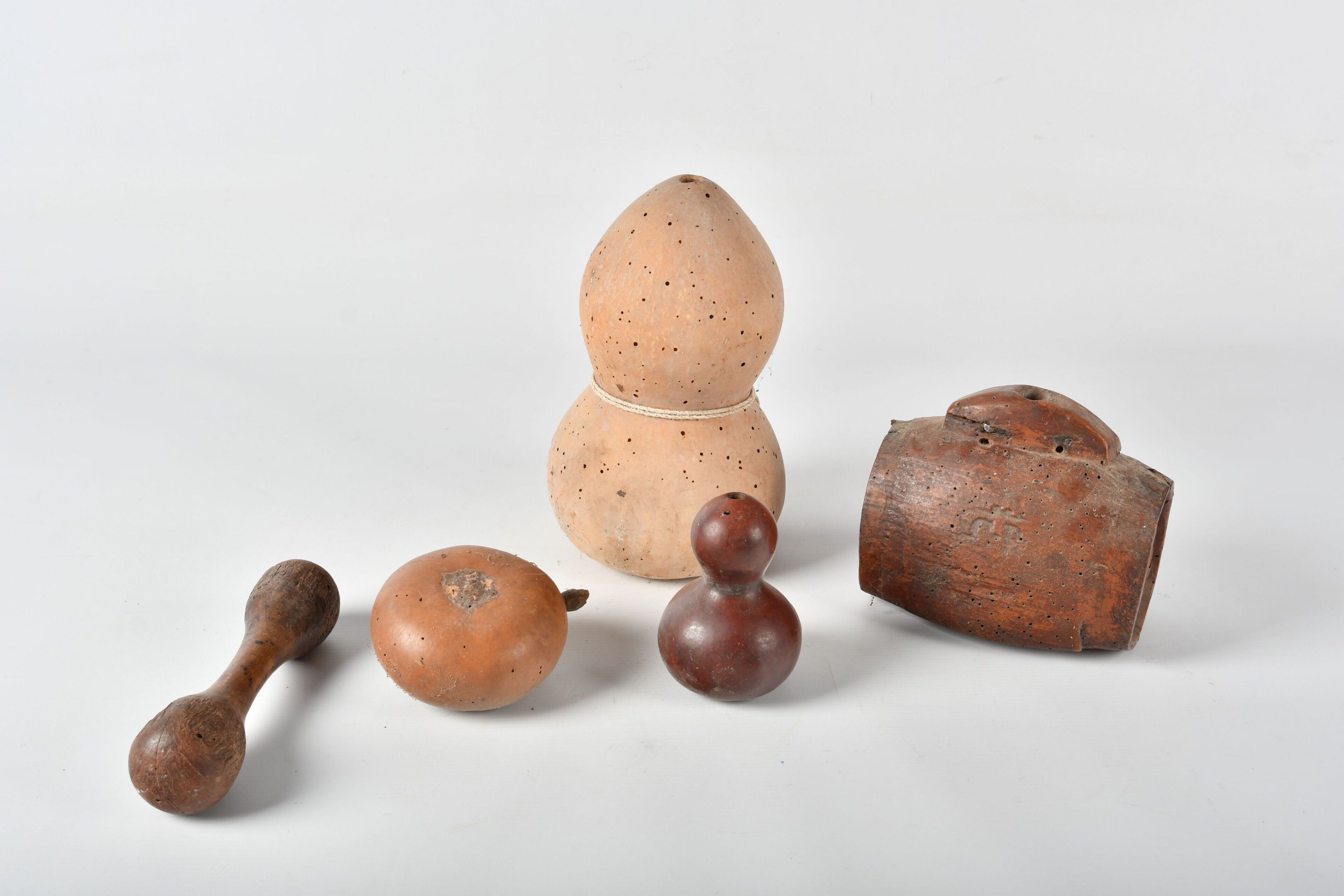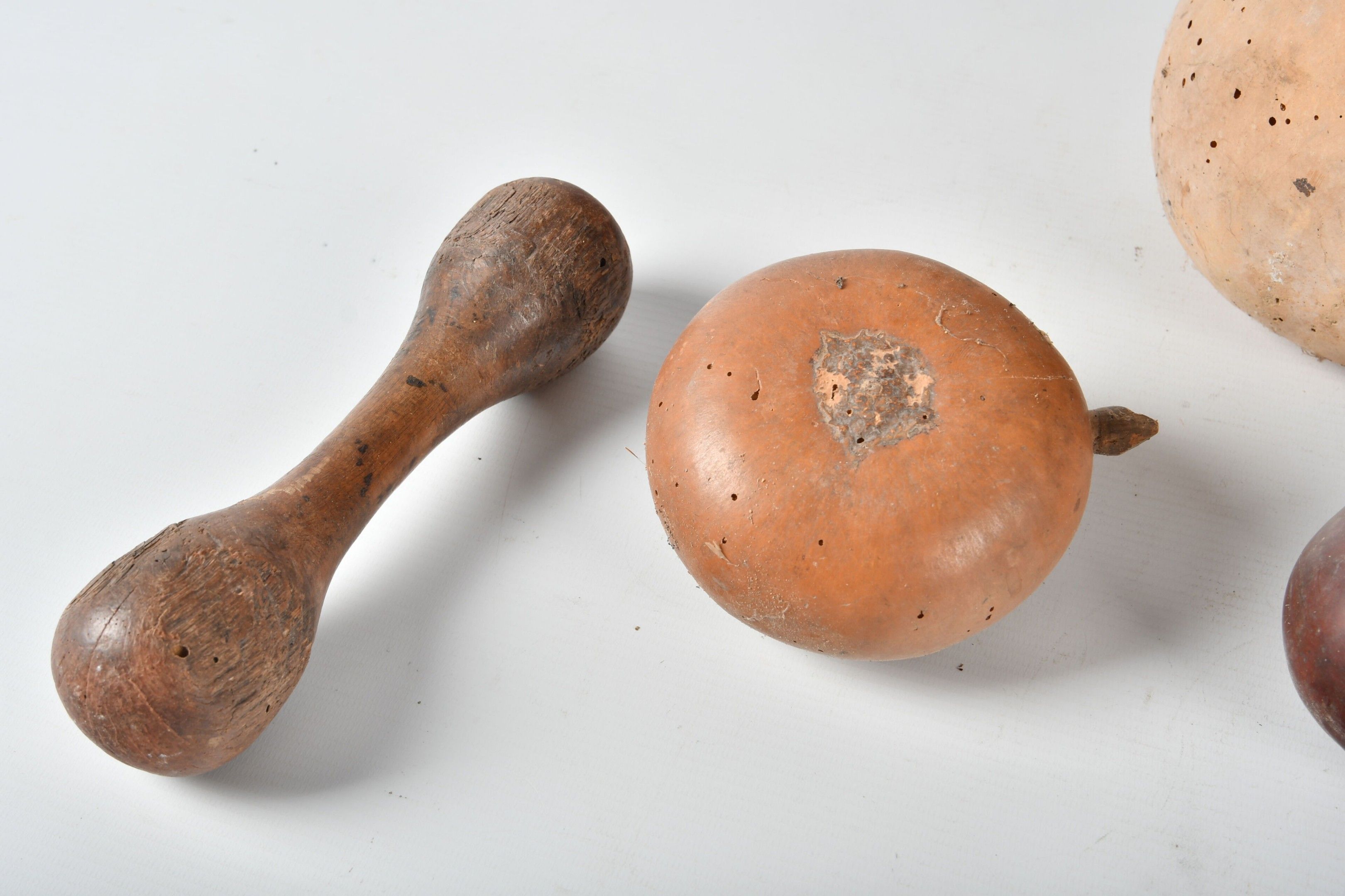 Wooden brandy or powder keg with wrought iron handle; monogrammed CB. H. 17 - W. 16 - D. 10 cm. Glass holes. Three pierced coloquintes forming bottles. One damaged; glass holes throughout. AND a wooden pestle.