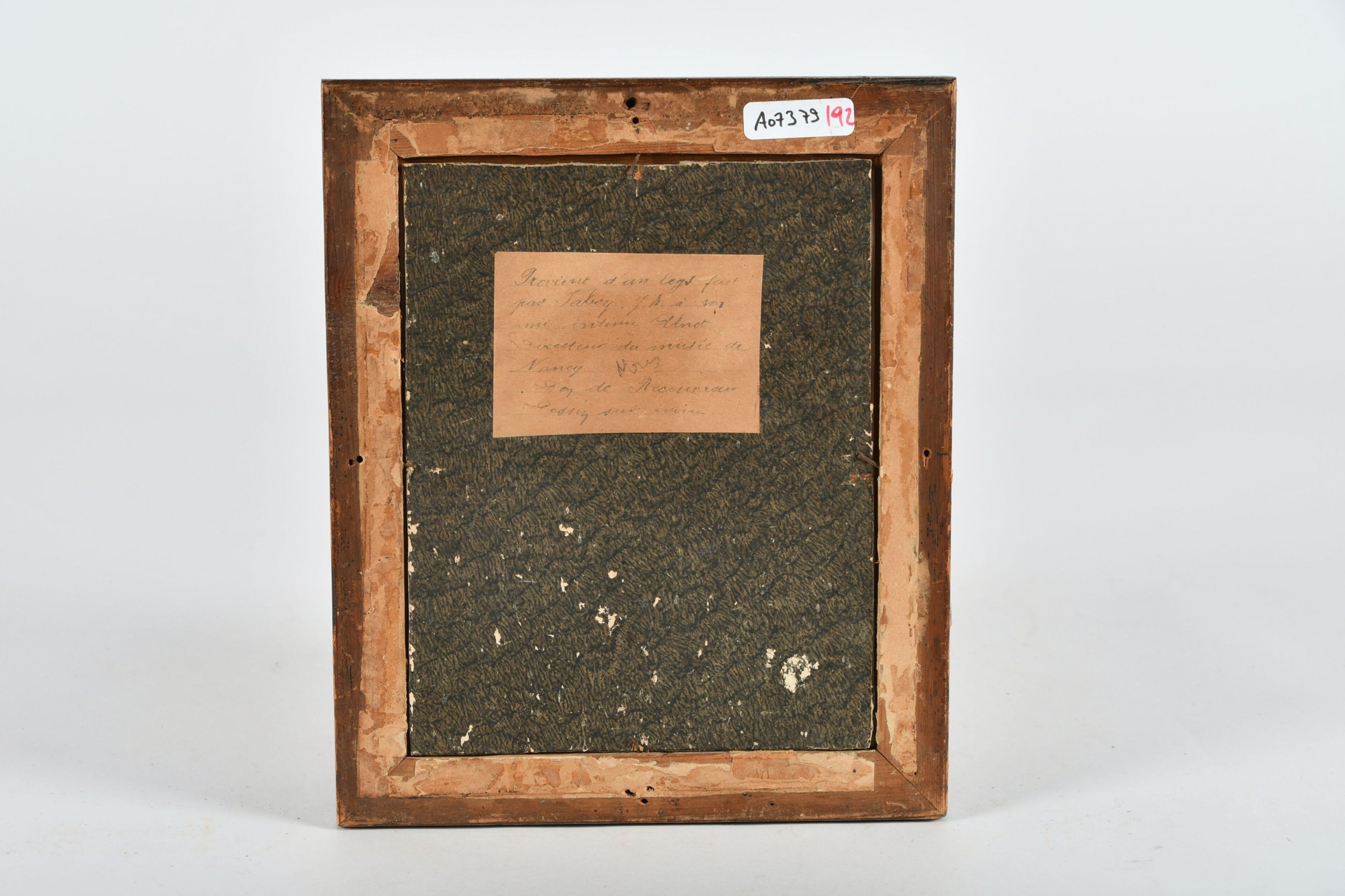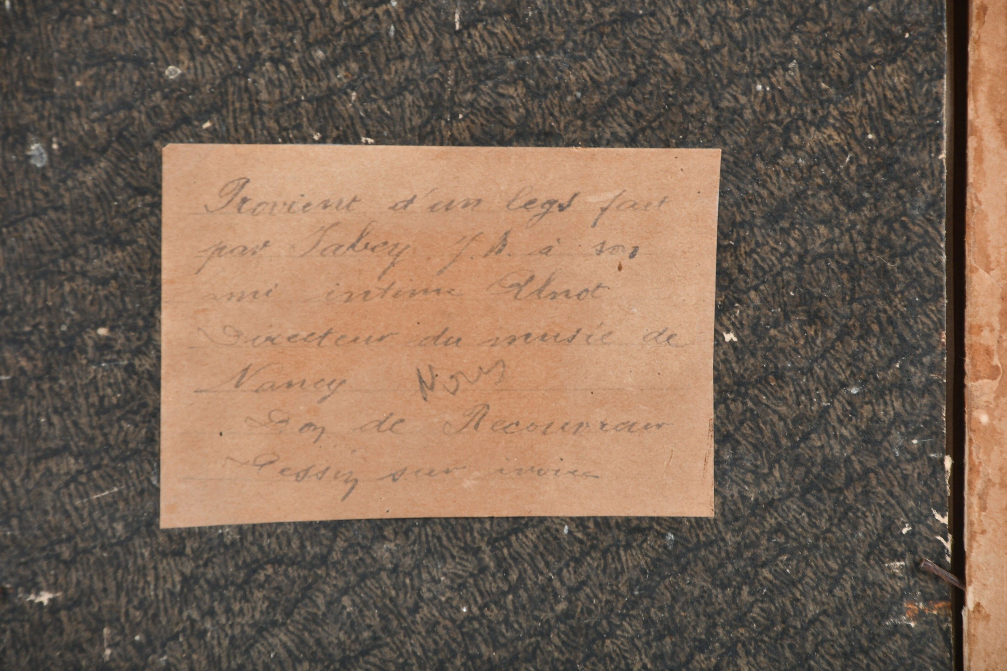 Old label on the reverse of the frame: "Provient d'un legs par Isabey, JB à son ami intime Alnot, directeur du musée de Nancy, don de Recouvran-Tessin, sur ivoire" (From a bequest by Isabey, JB to his close friend Alnot, director of the Musée de Nancy, a gift from Recouvran-Tessin, on ivory).
